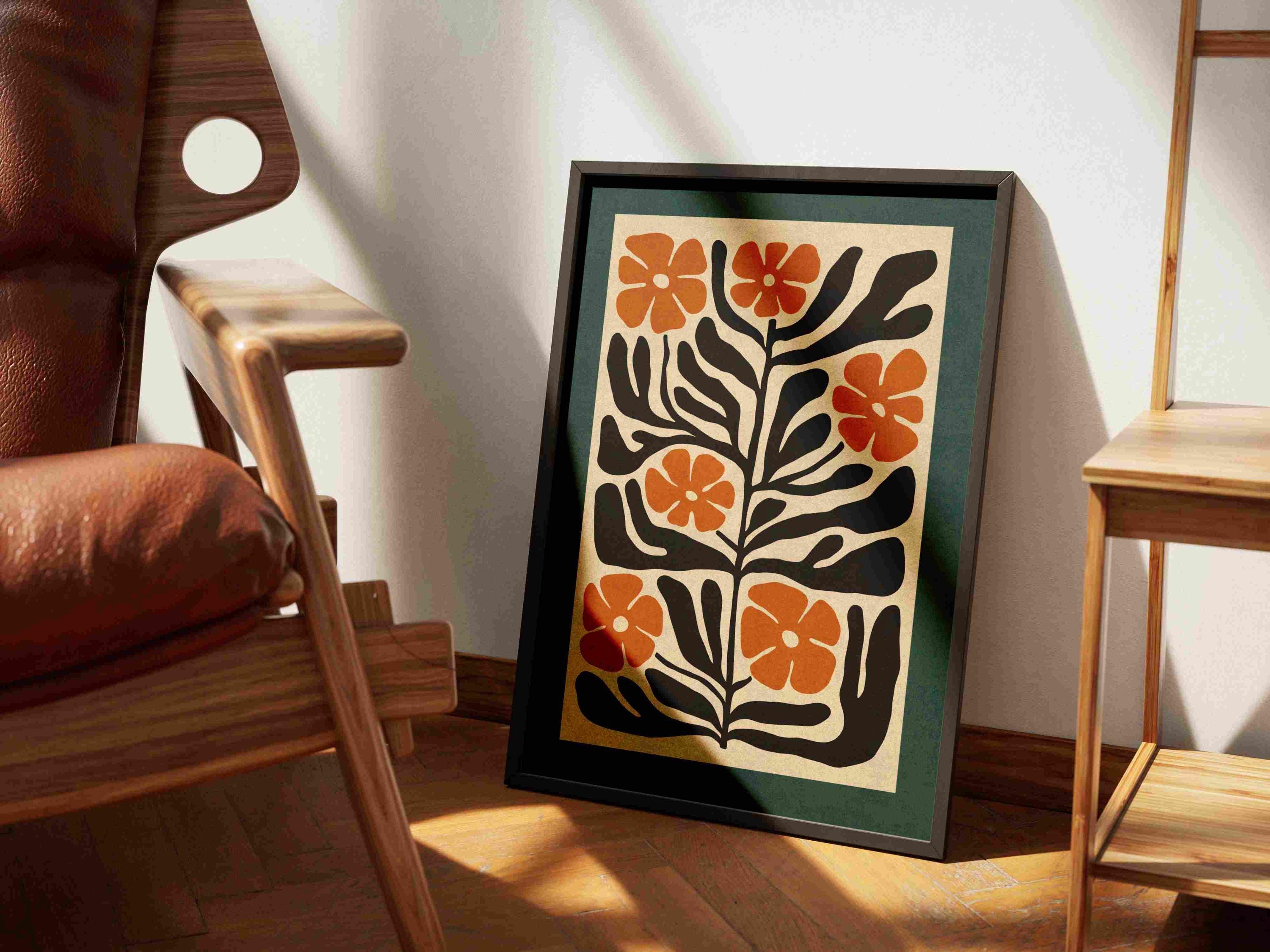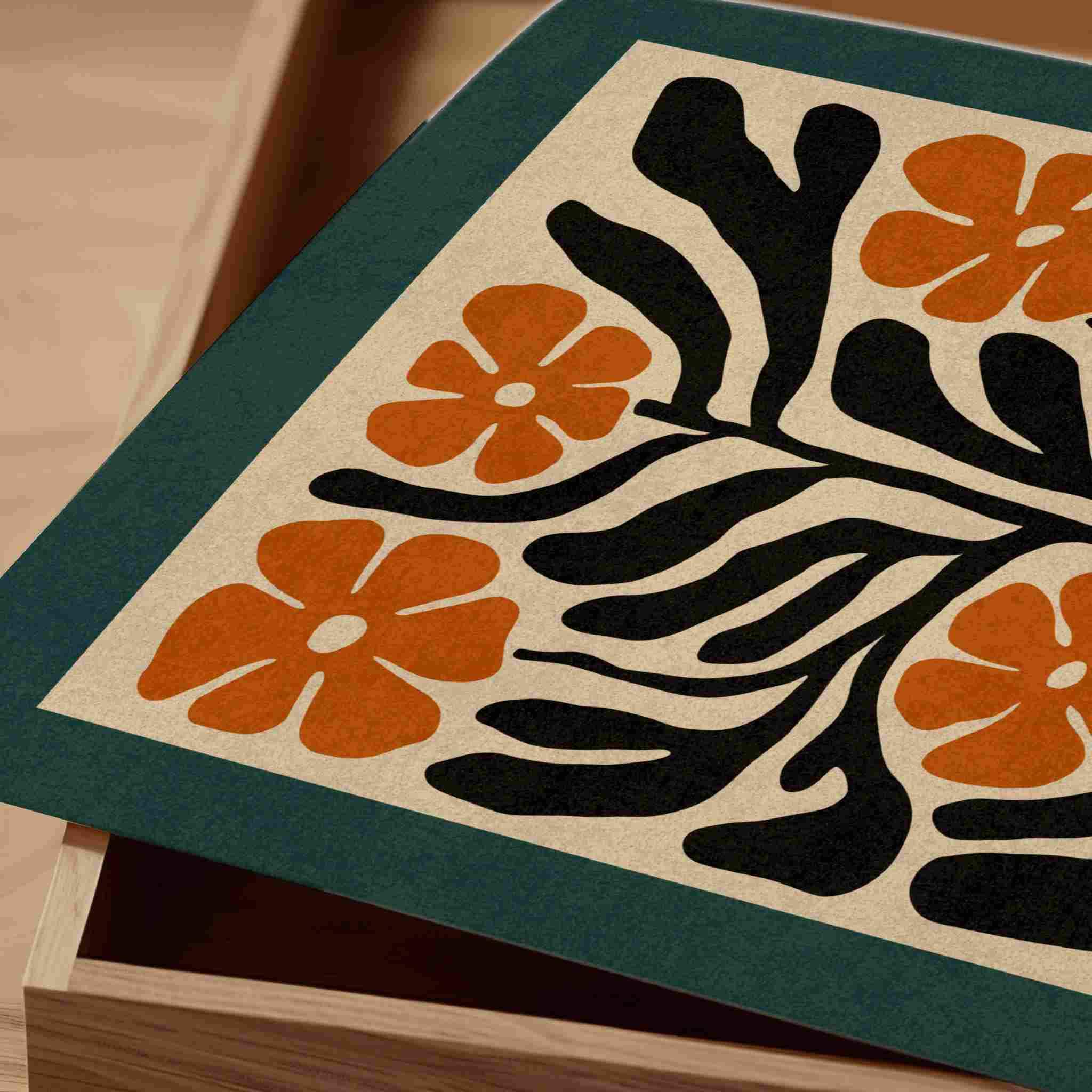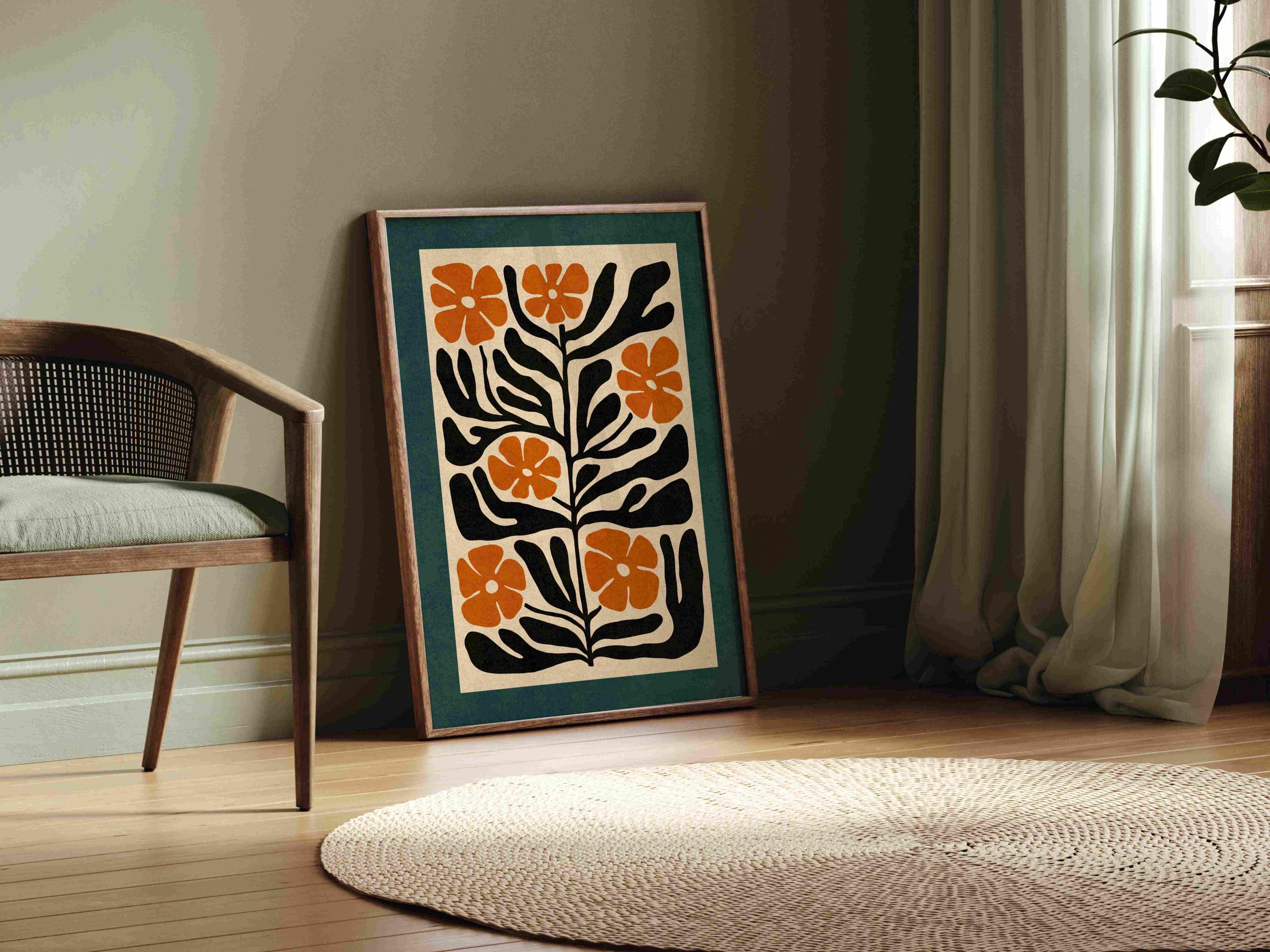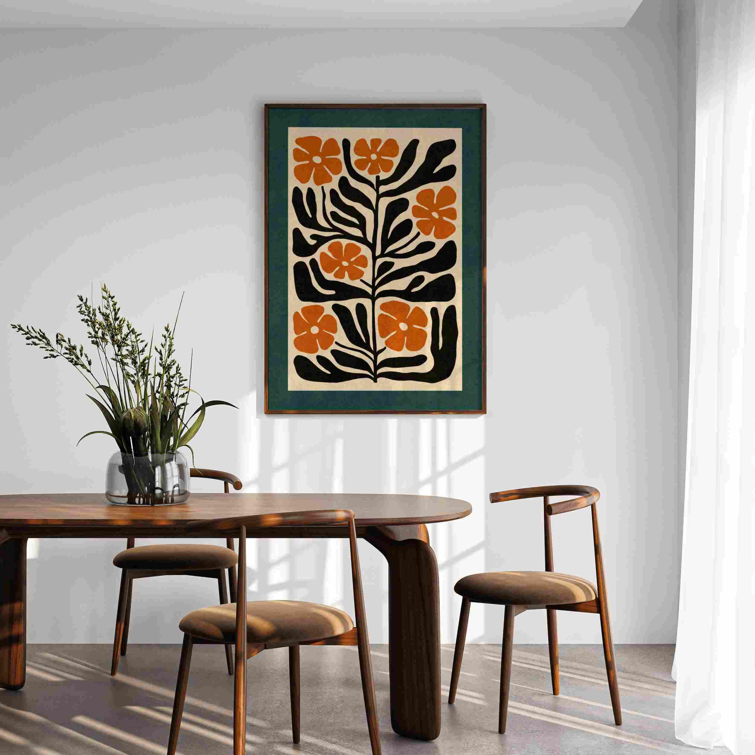 Retro floral wall art featuring an abstract Matisse-style botanical design in rich burnt orange, deep teal, warm cream and charcoal black.