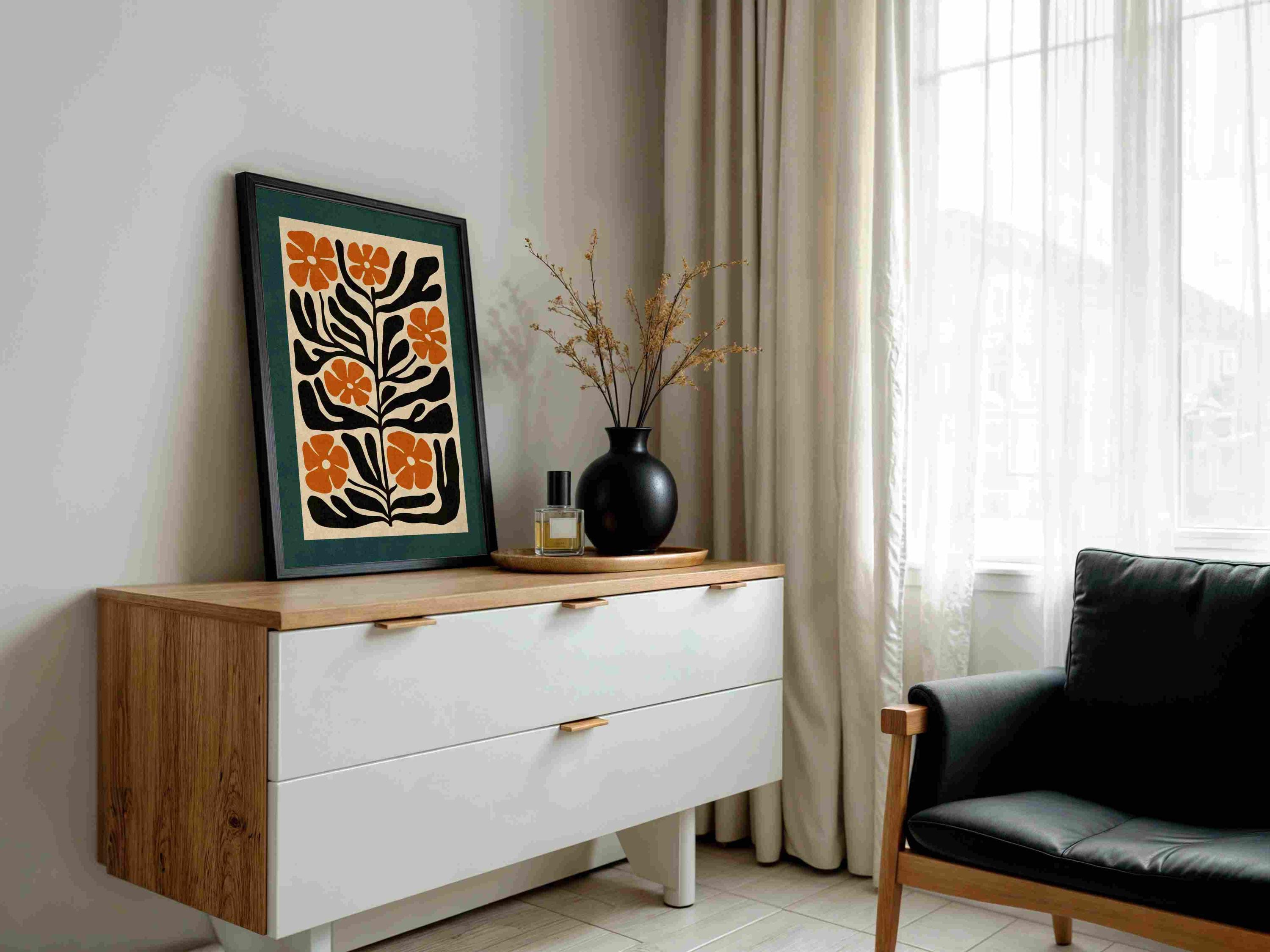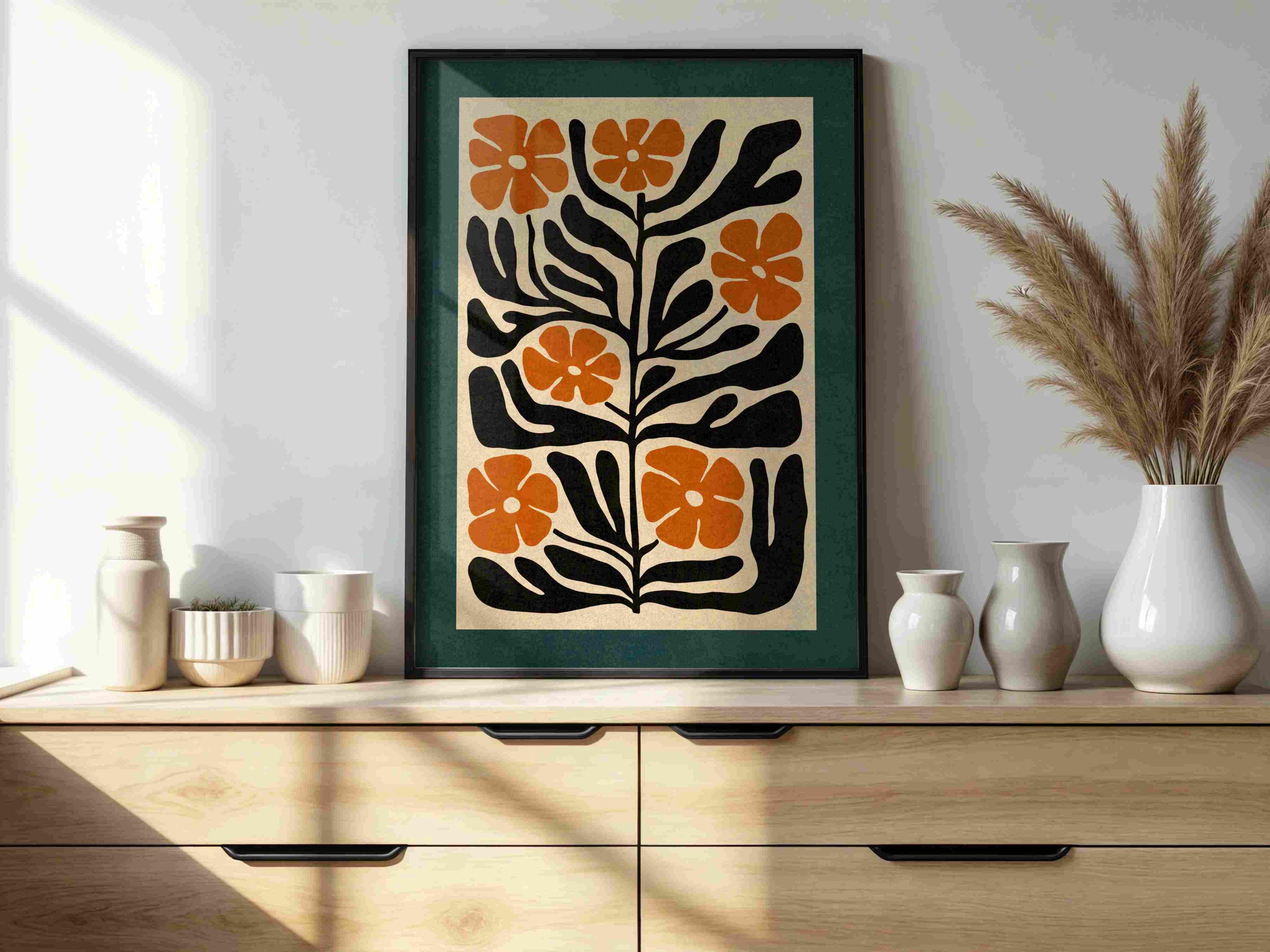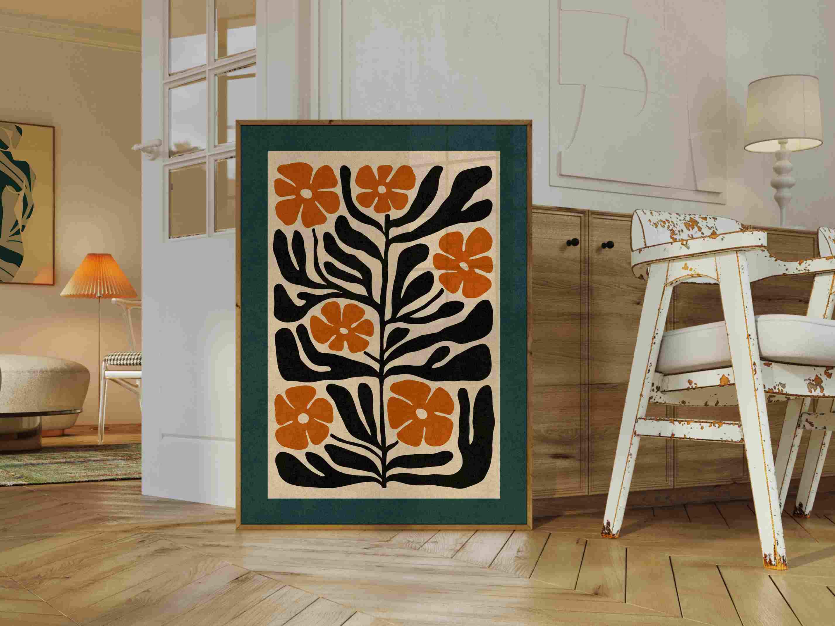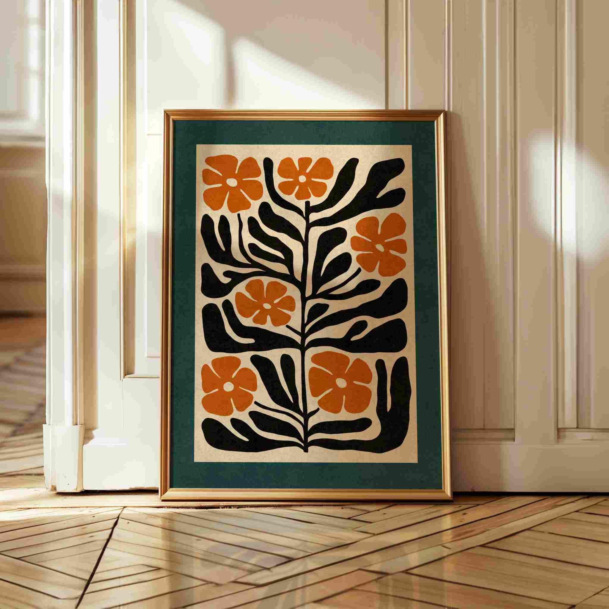 Retro floral wall art featuring an abstract Matisse-style botanical design in rich burnt orange, deep teal, warm cream and charcoal black.
