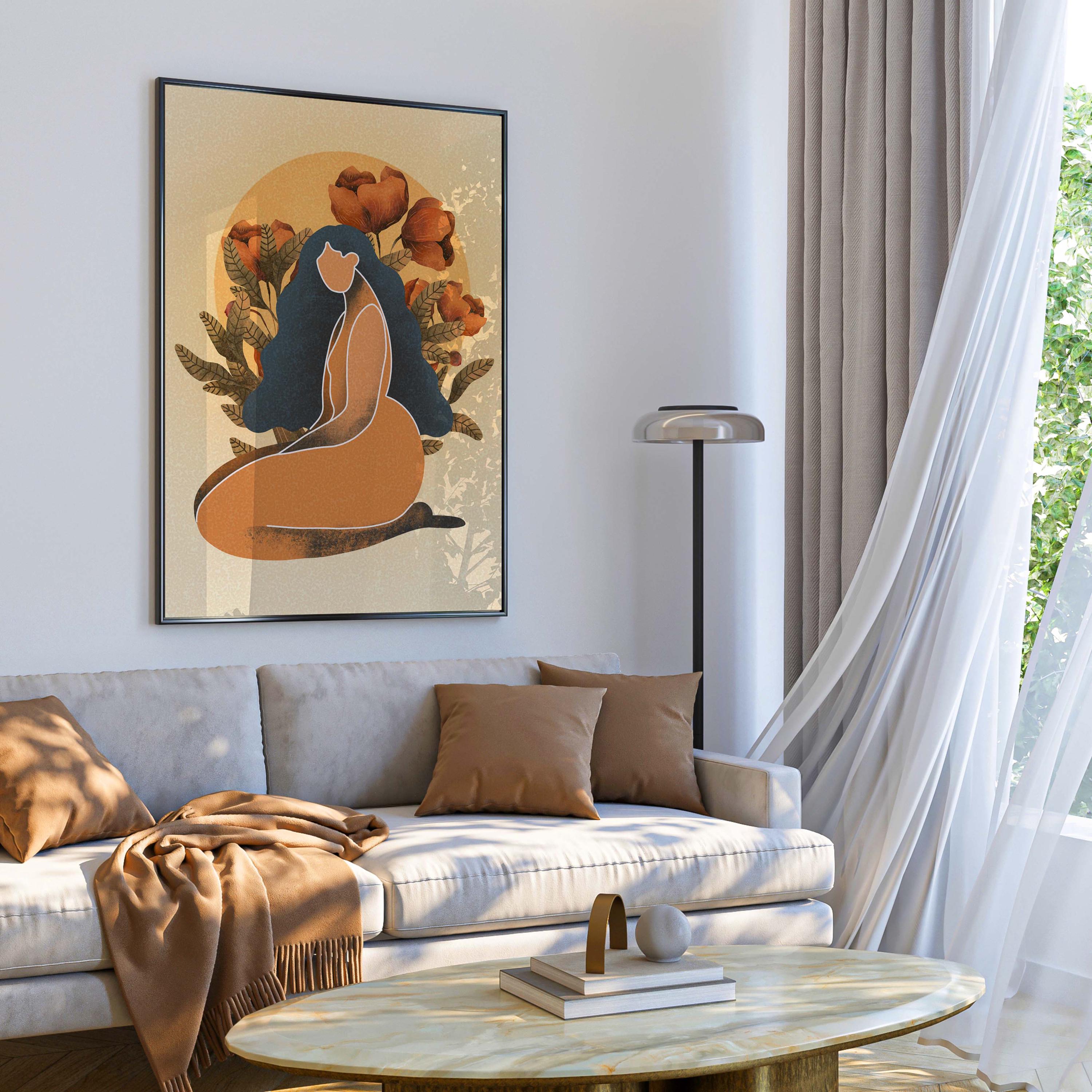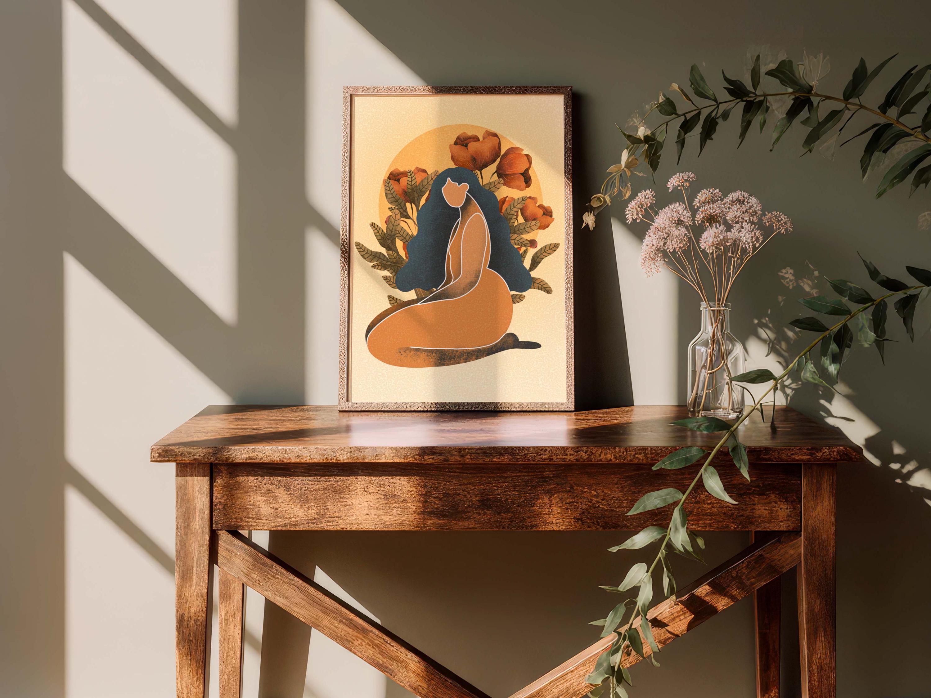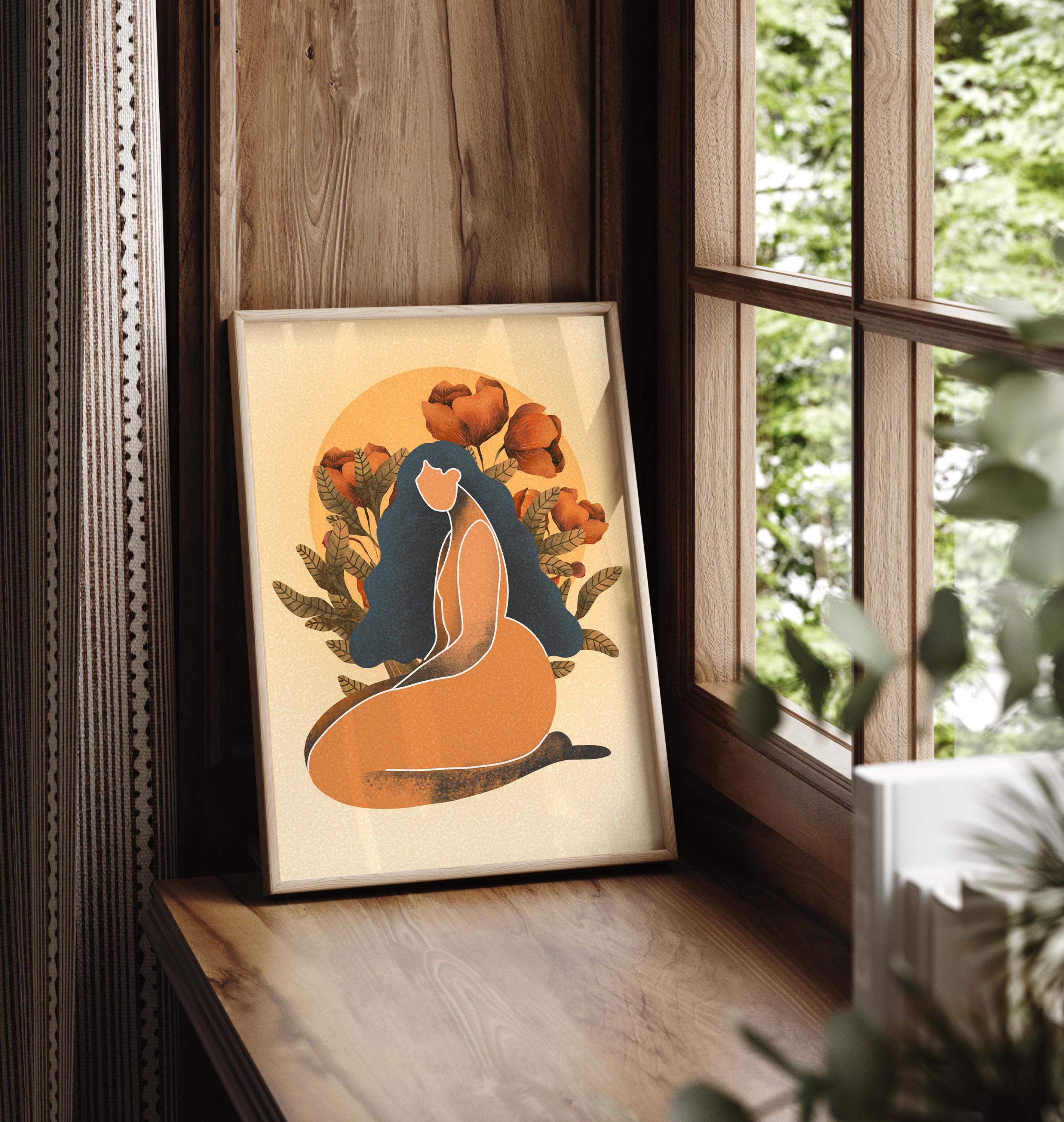 Black woman art print featuring a confident, curvy figure surrounded by blooming florals and warm retro tones, this piece blends femininity, body positivity, and modern boho style.