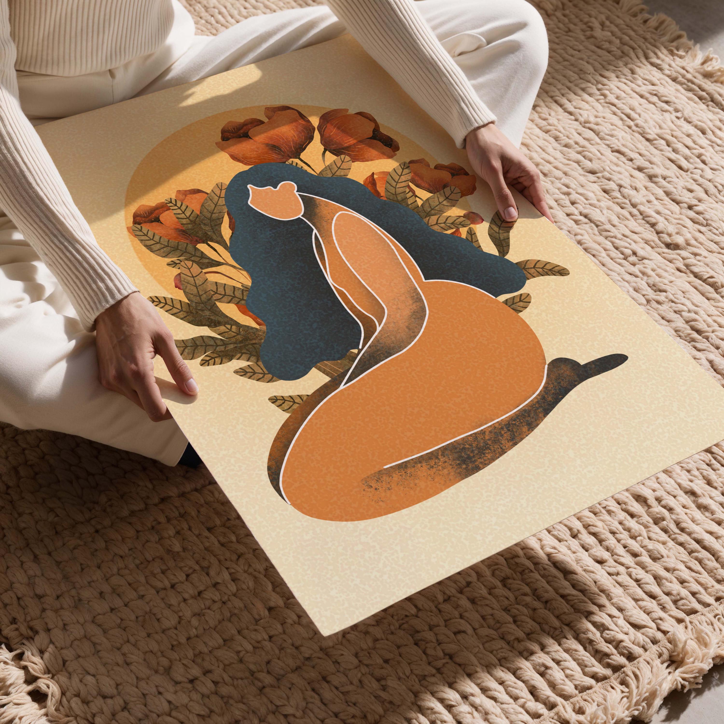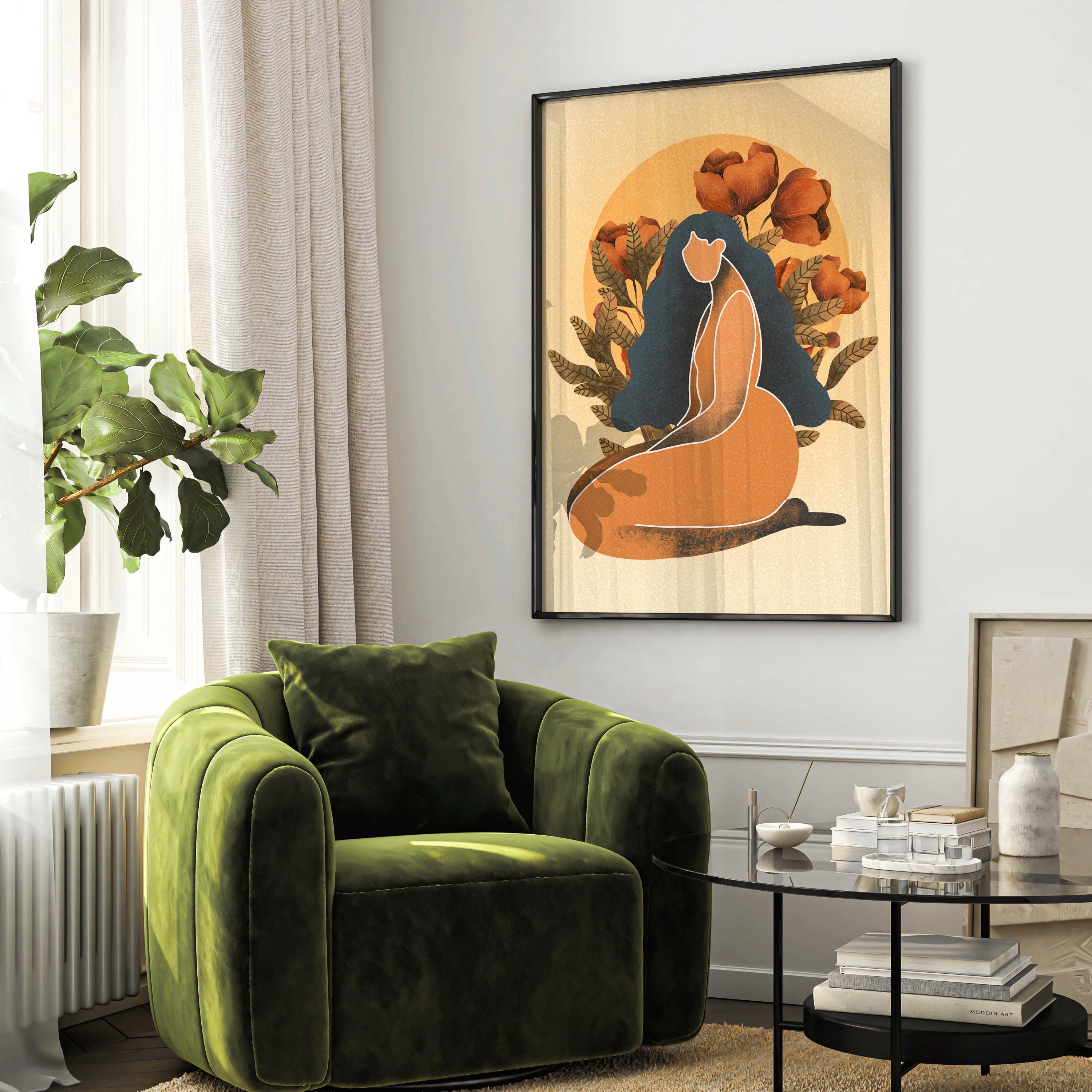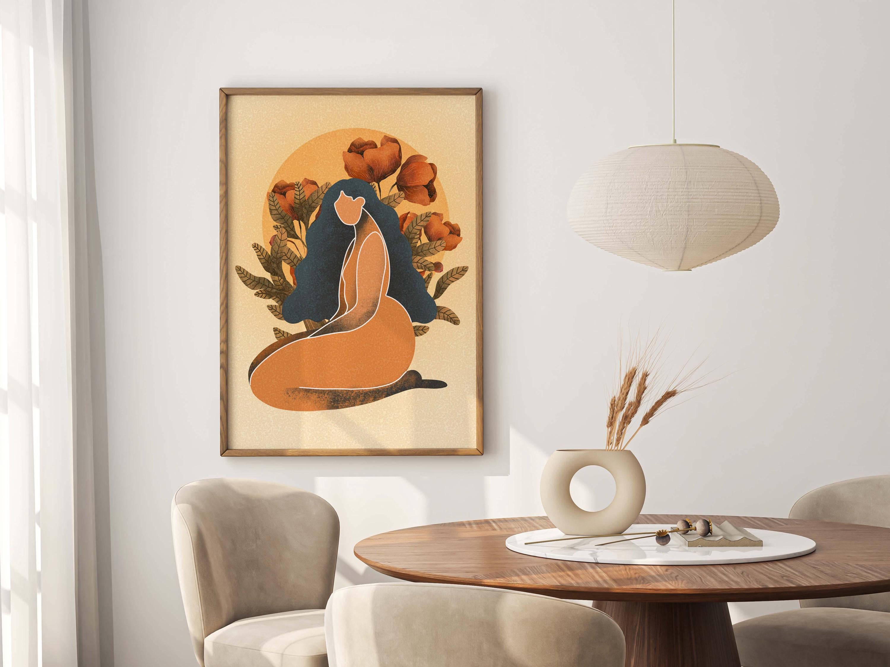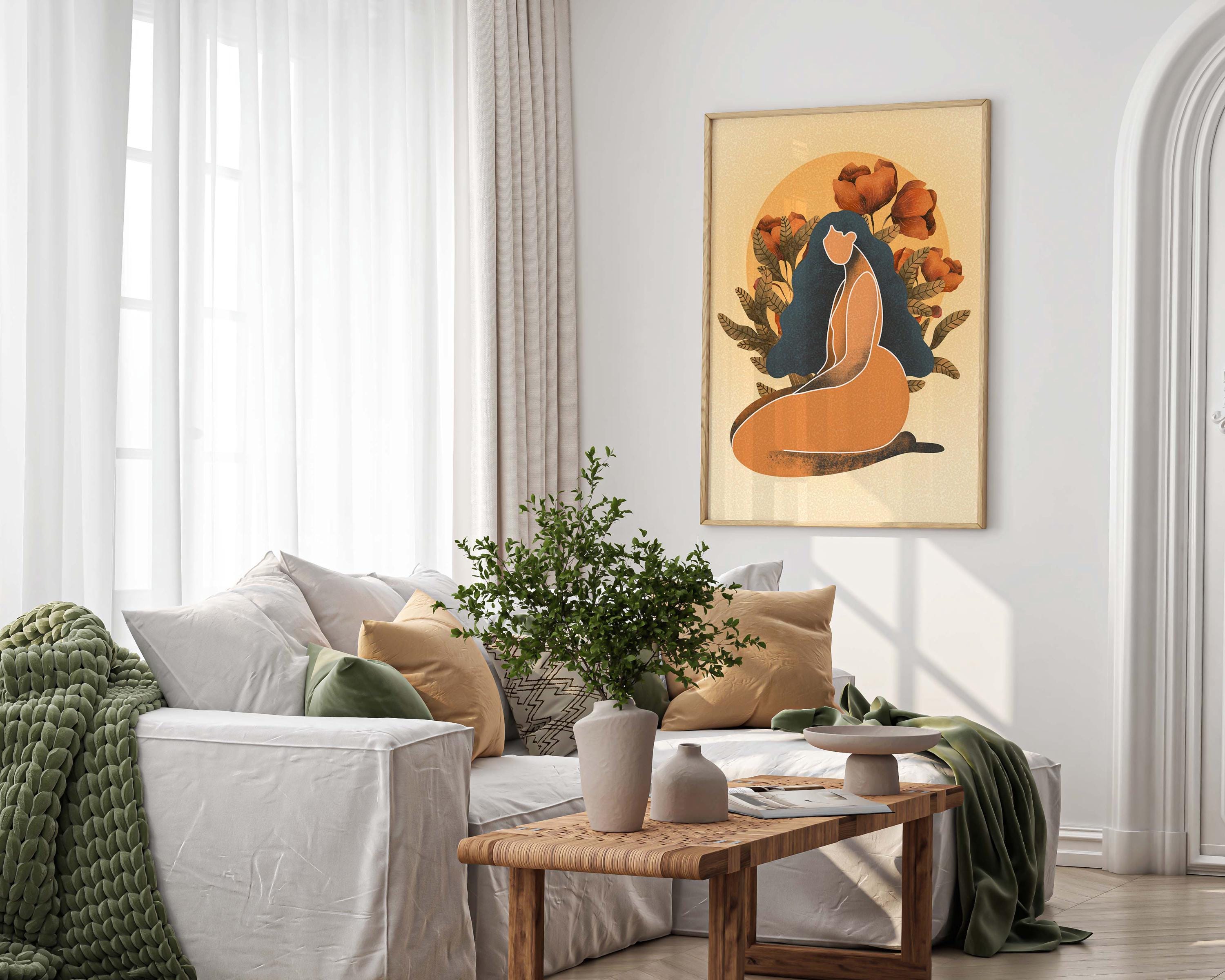 Black woman art print featuring a confident, curvy figure surrounded by blooming florals and warm retro tones, this piece blends femininity, body positivity, and modern boho style.