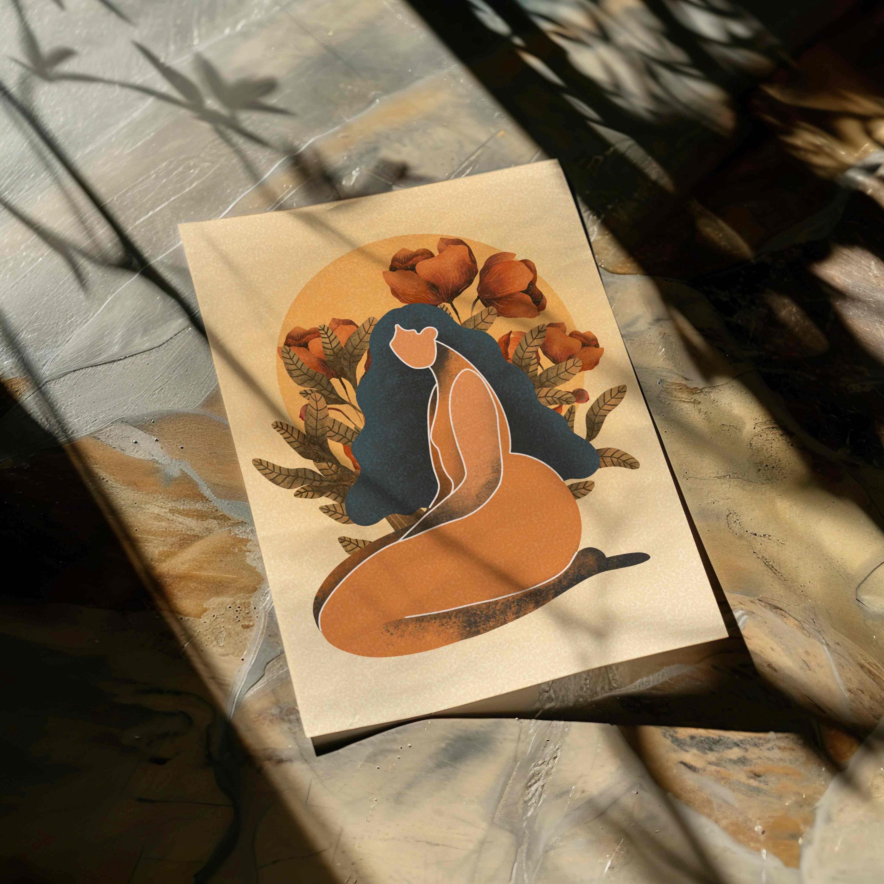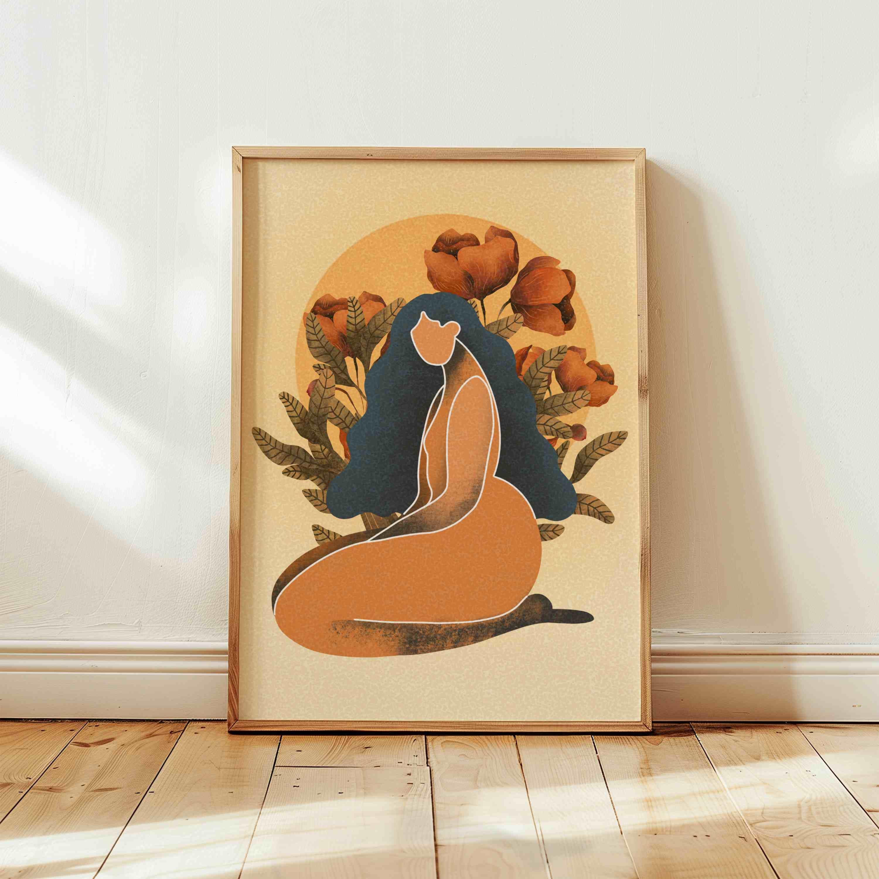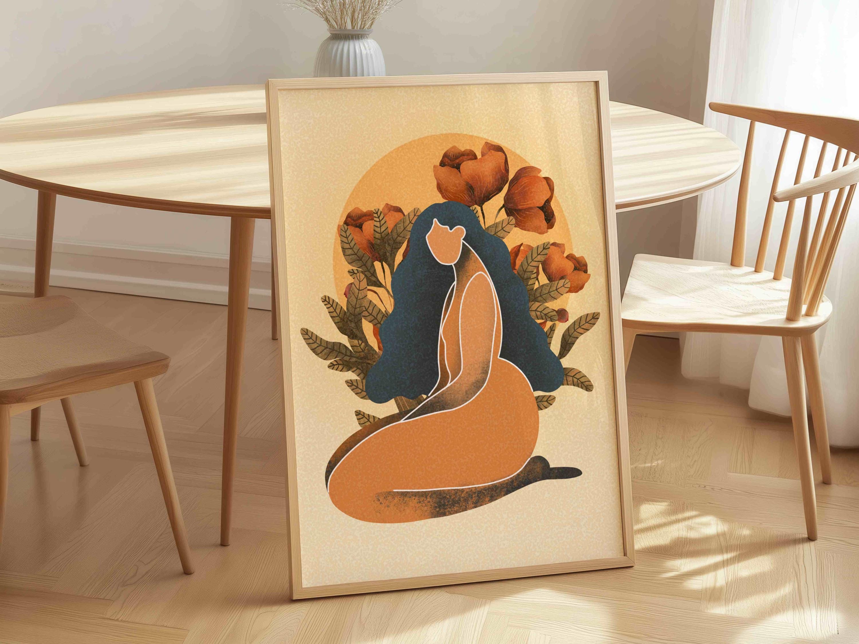 Celebrate the beauty and power of the black woman with this self love art print. Featuring a confident, curvy figure surrounded by blooming florals and warm retro tones, this piece blends femininity, body positivity, and modern boho style.