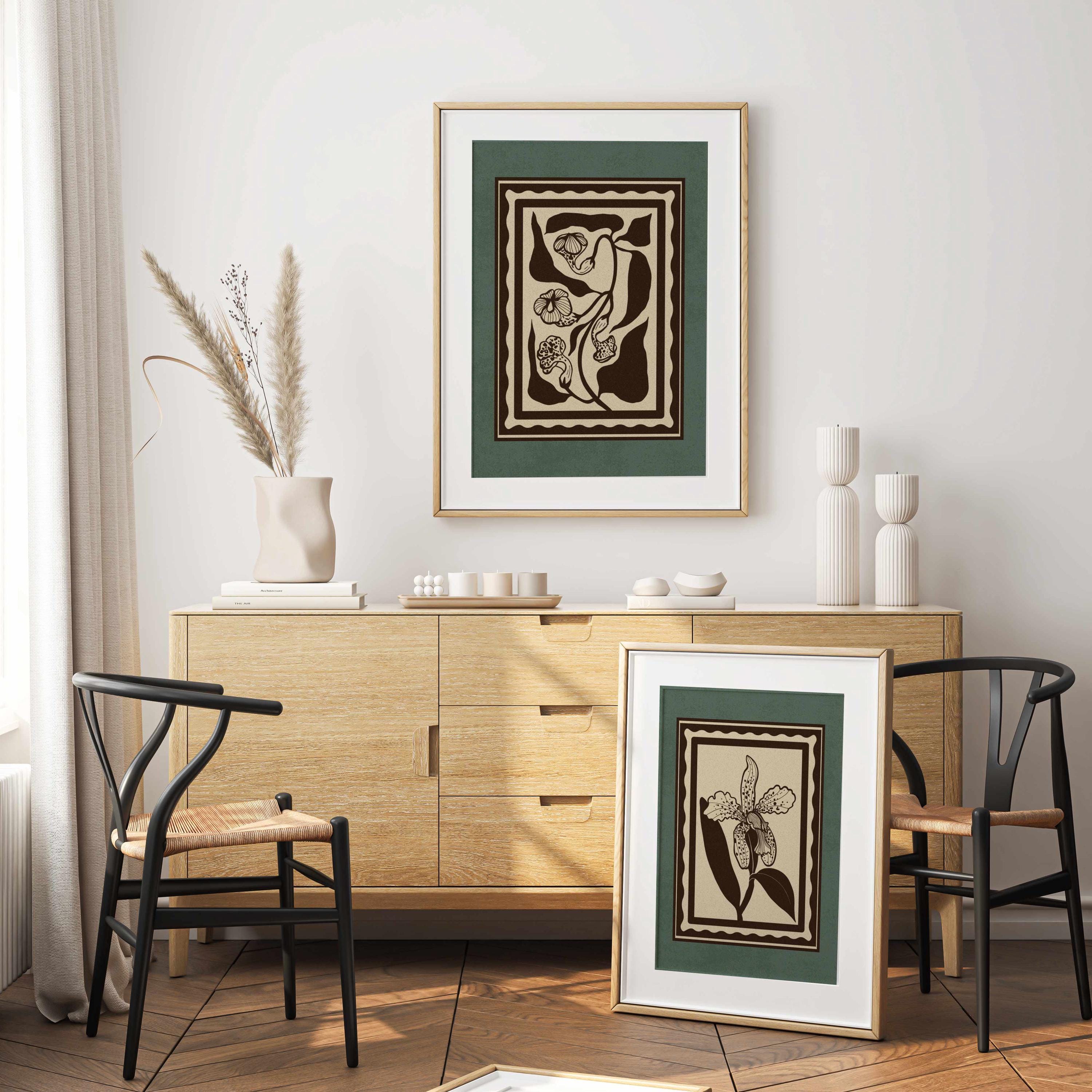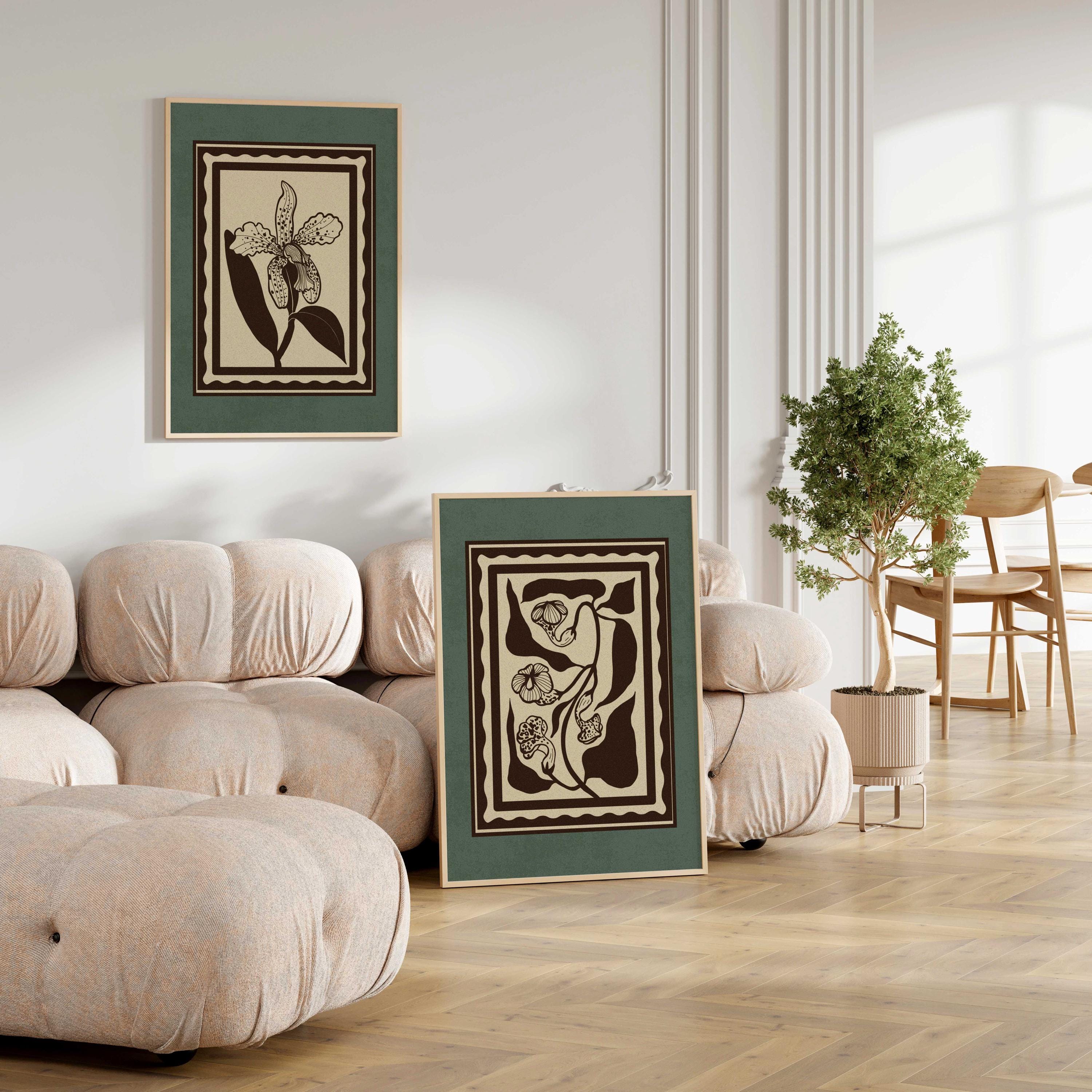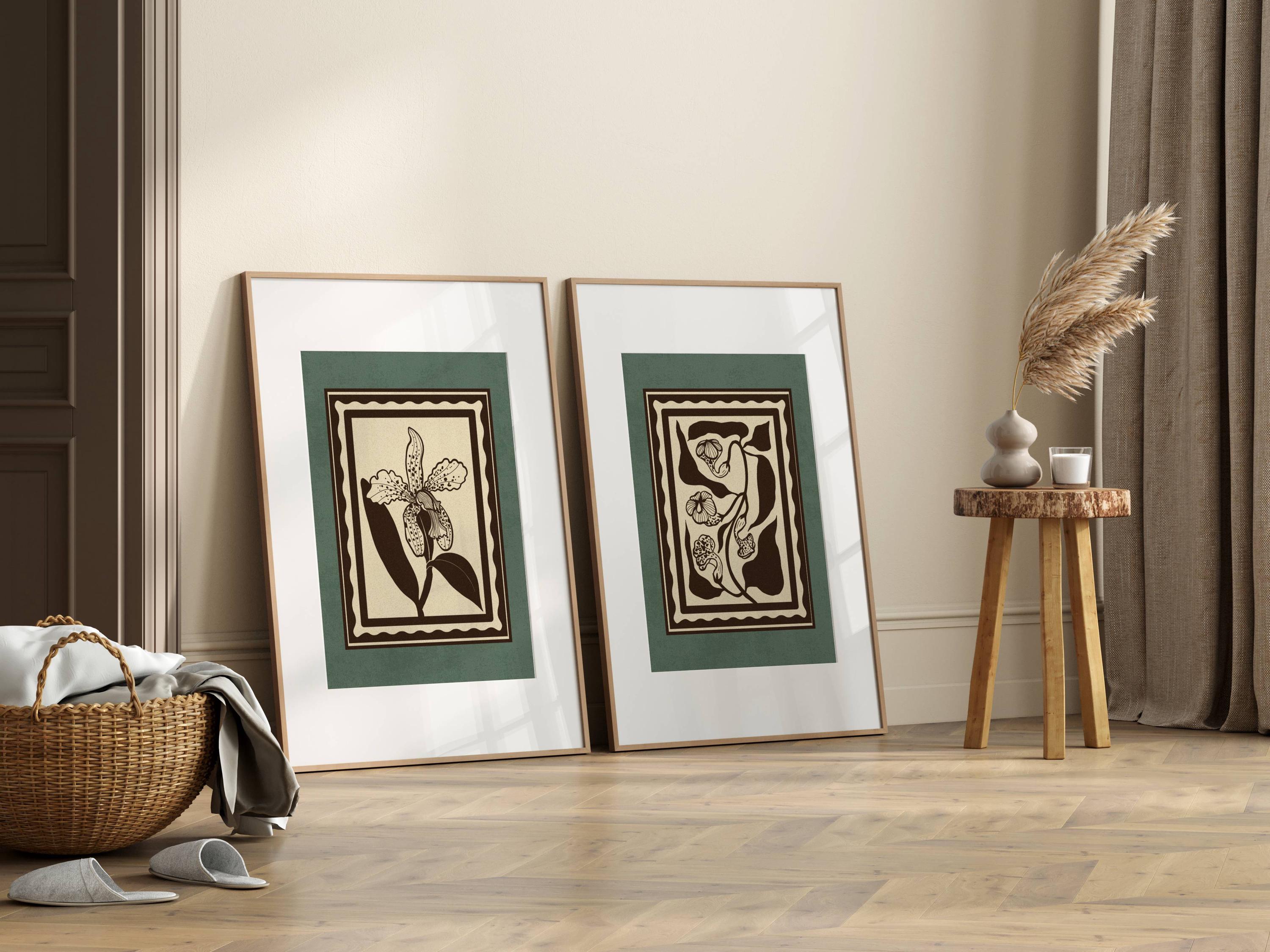 Set of two vintage botanical prints, featuring delicate wildflowers inspired by retro design and nature’s quiet beauty. Designed in a stamp-style layout with muted tones of warm beige, rich brown, and dusty teal, this set blends mid-century design, retro florals, and cottagecore aesthetics — making it the perfect addition to a gallery wall, reading nook, bedroom, or cozy kitchen.