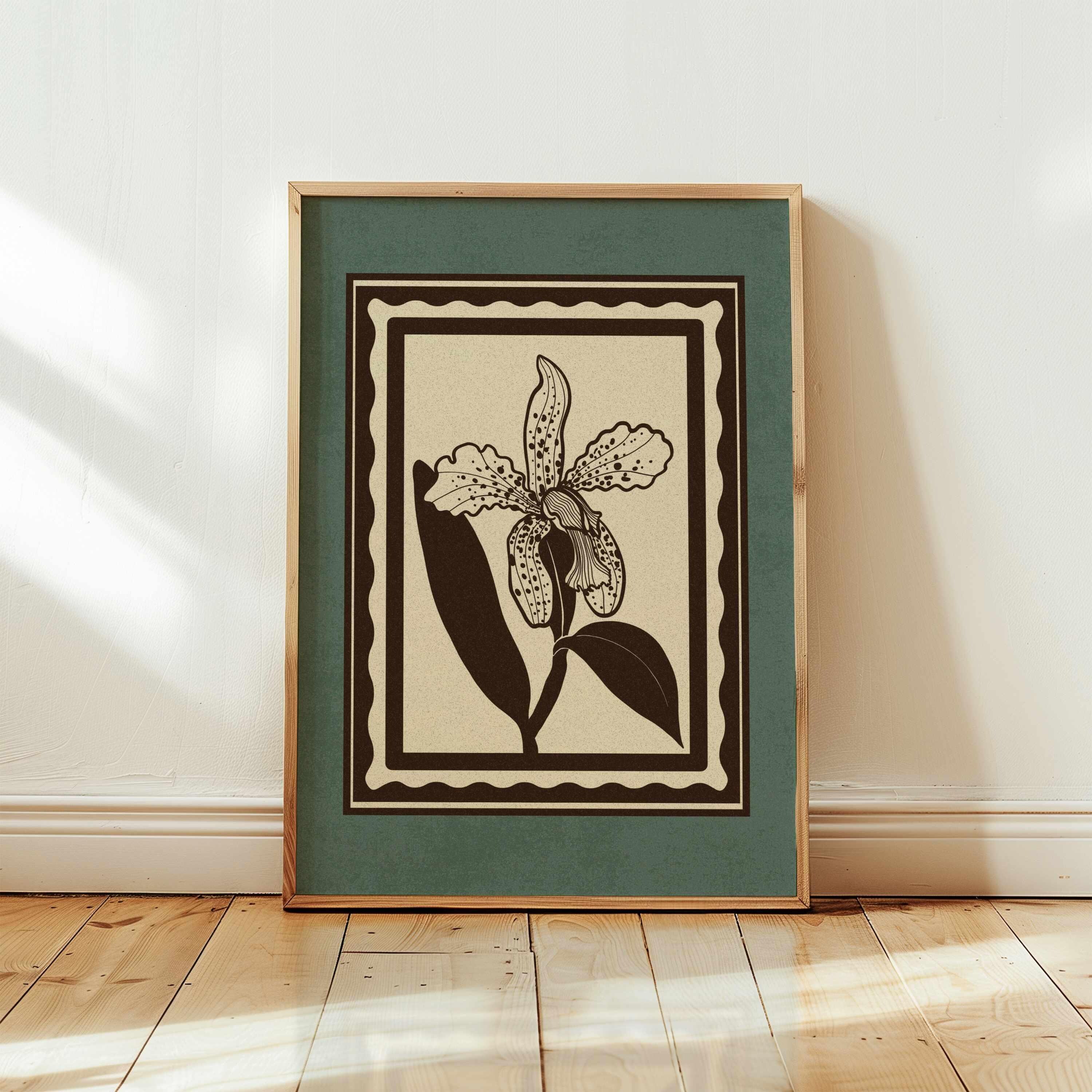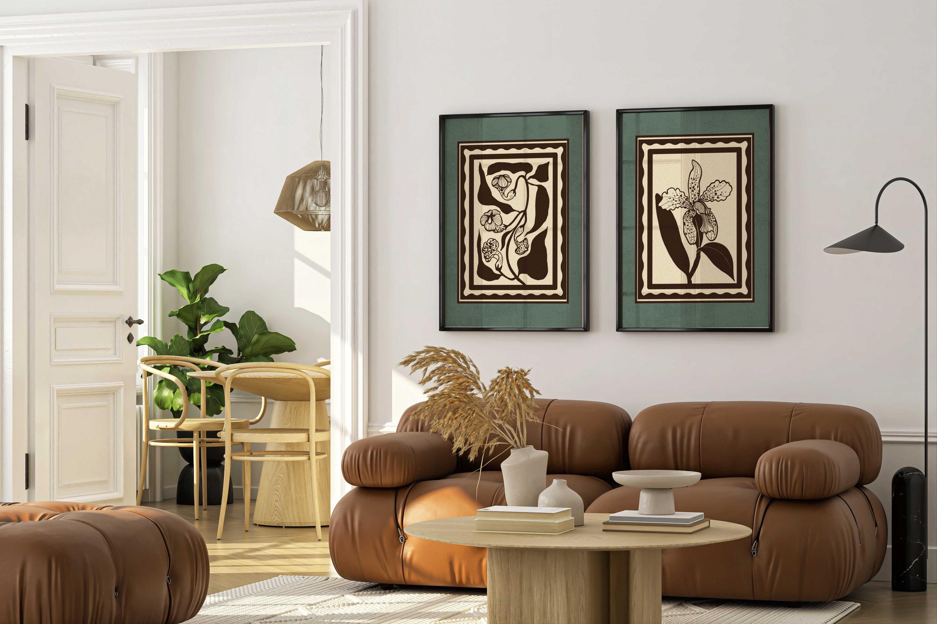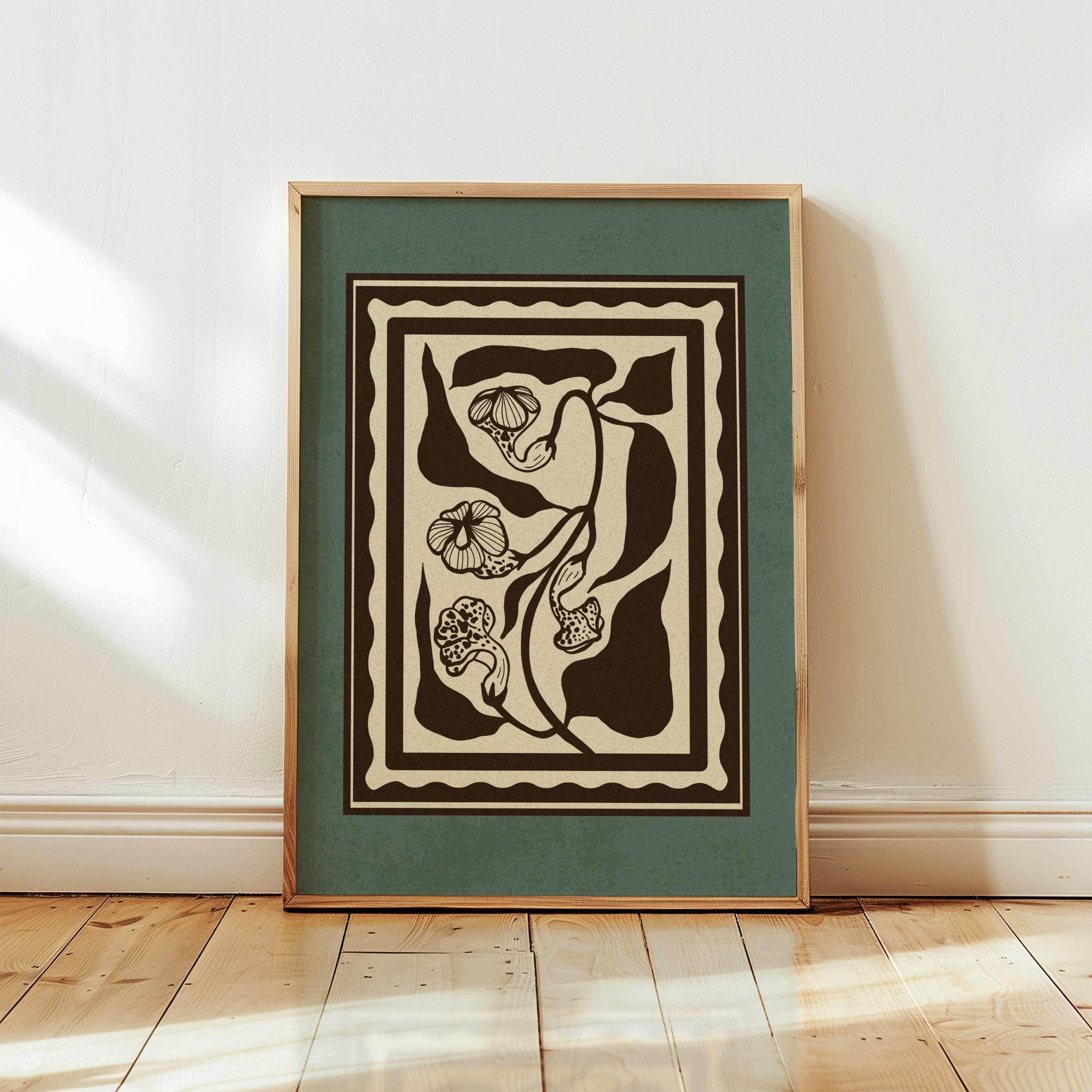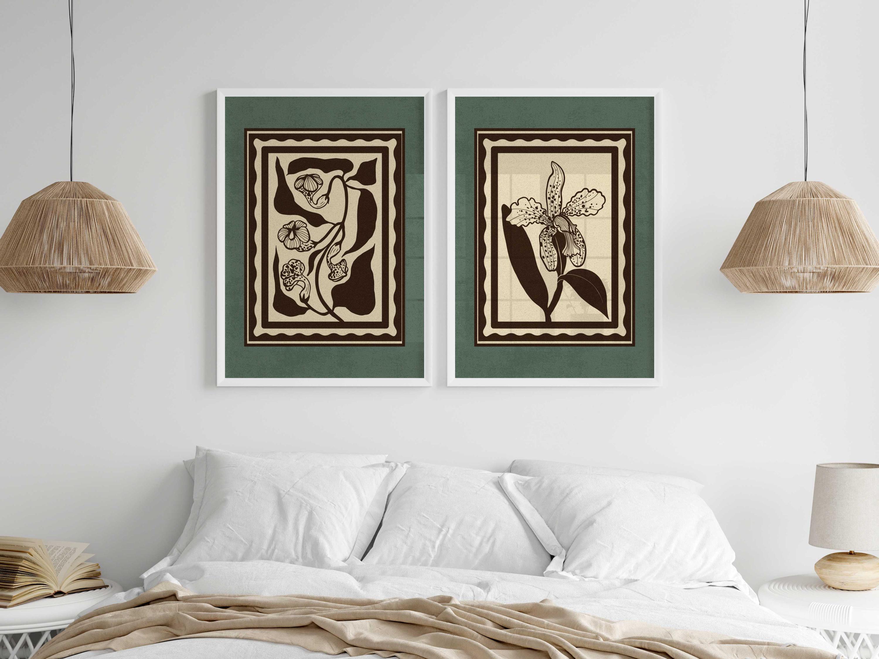 Set of two vintage botanical prints, featuring delicate wildflowers inspired by retro design and nature’s quiet beauty. Designed in a stamp-style layout with muted tones of warm beige, rich brown, and dusty teal, this set blends mid-century design, retro florals, and cottagecore aesthetics — making it the perfect addition to a gallery wall, reading nook, bedroom, or cozy kitchen.