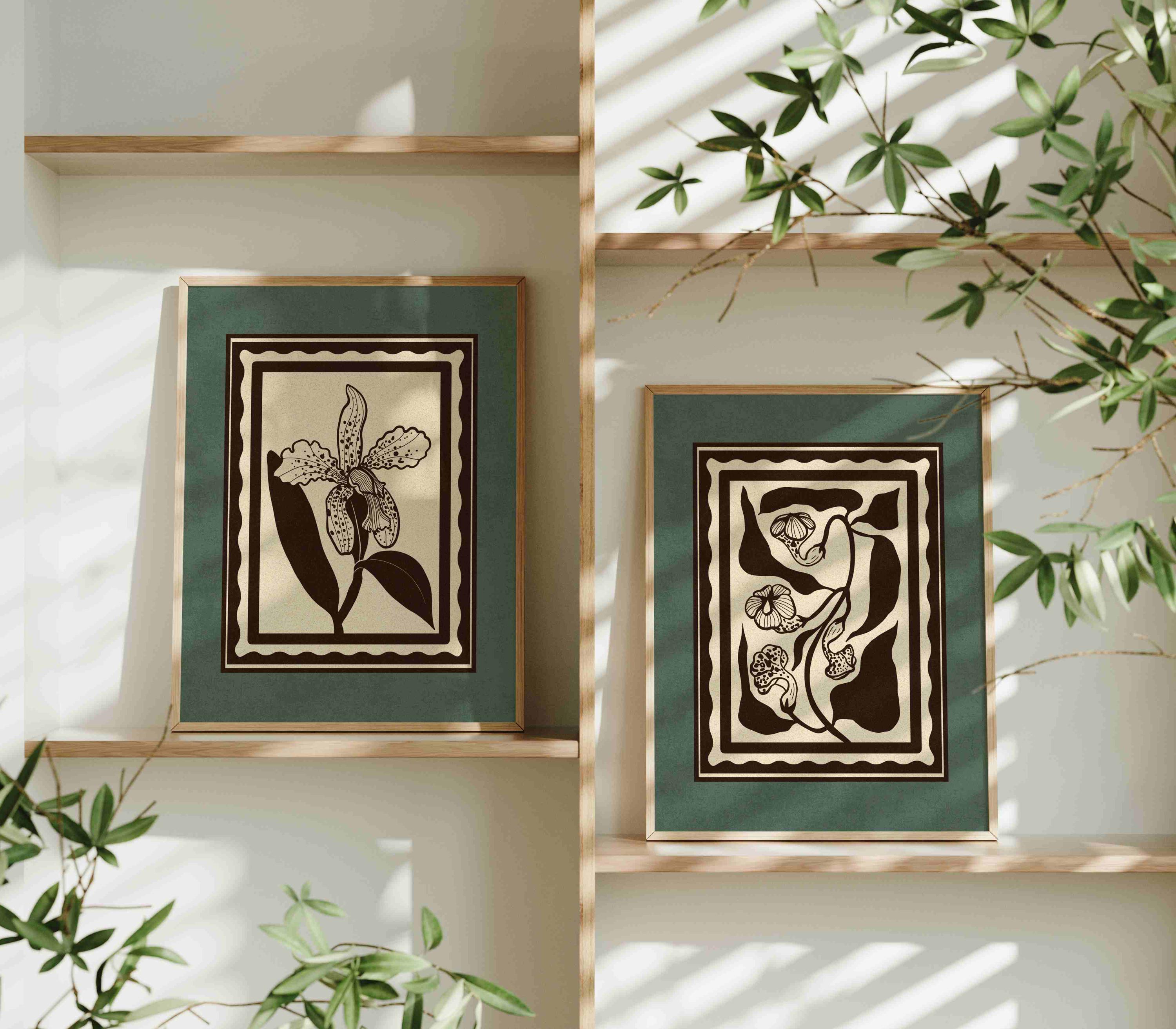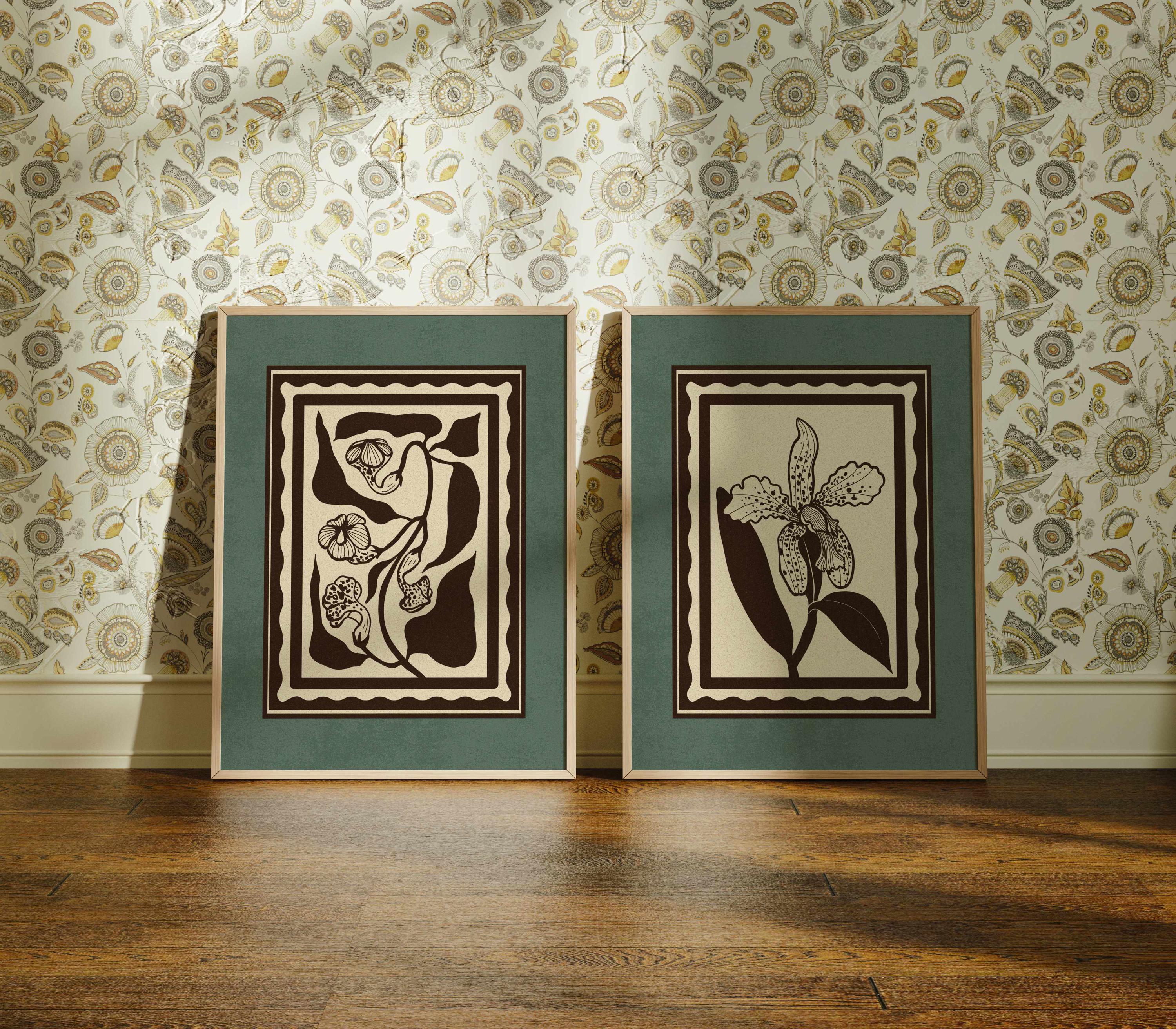 Set of two vintage botanical prints featuring delicate wildflowers inspired by retro design and nature’s quiet beauty. Designed in a stamp-style layout with muted tones of warm beige, rich brown, and dusty teal, this set blends mid-century design, retro florals, and cottagecore aesthetics — making it the perfect addition to a gallery wall, reading nook, bedroom, or cozy kitchen.