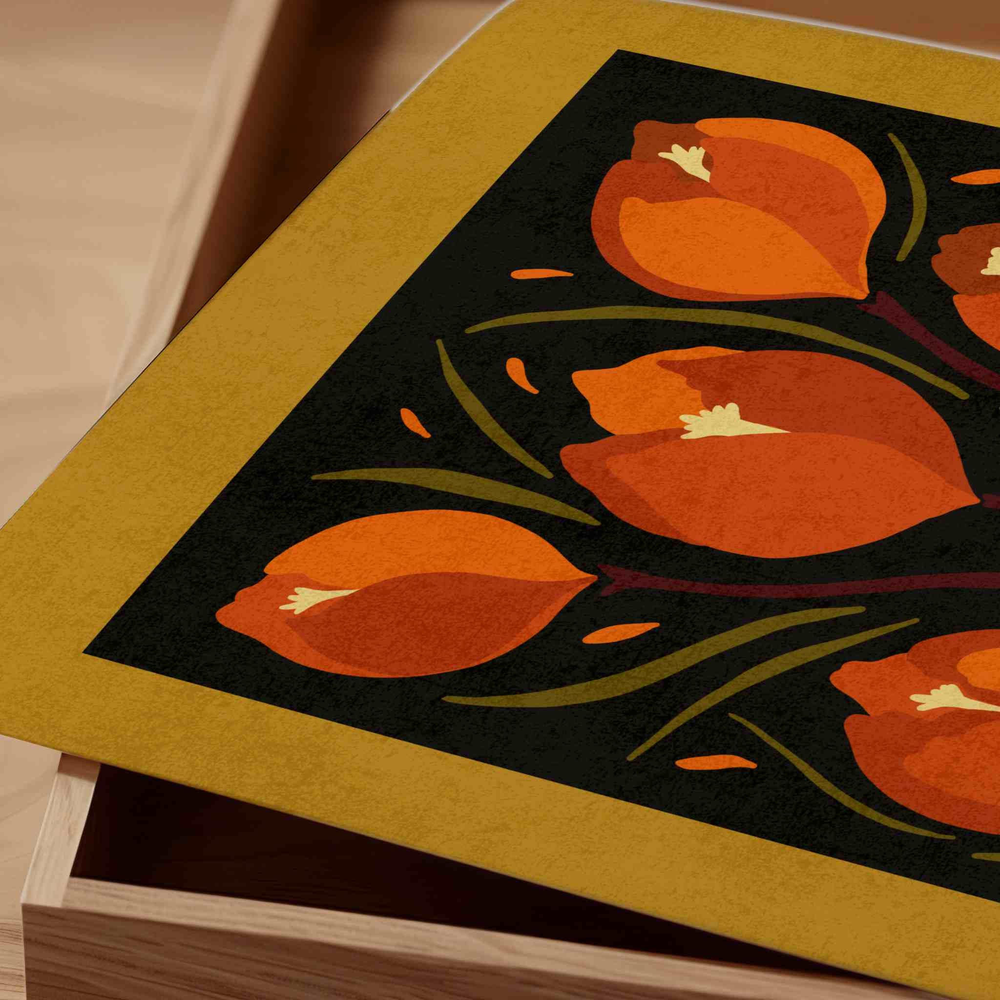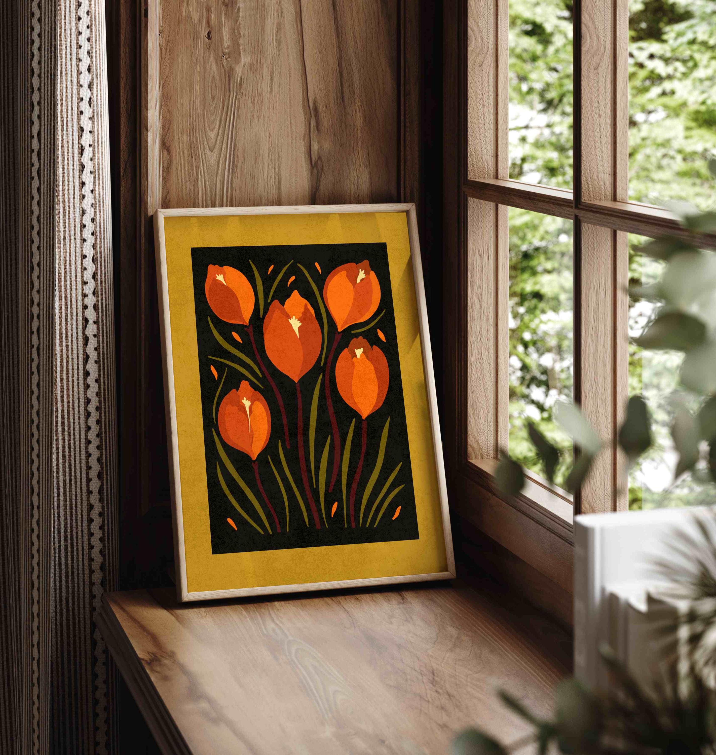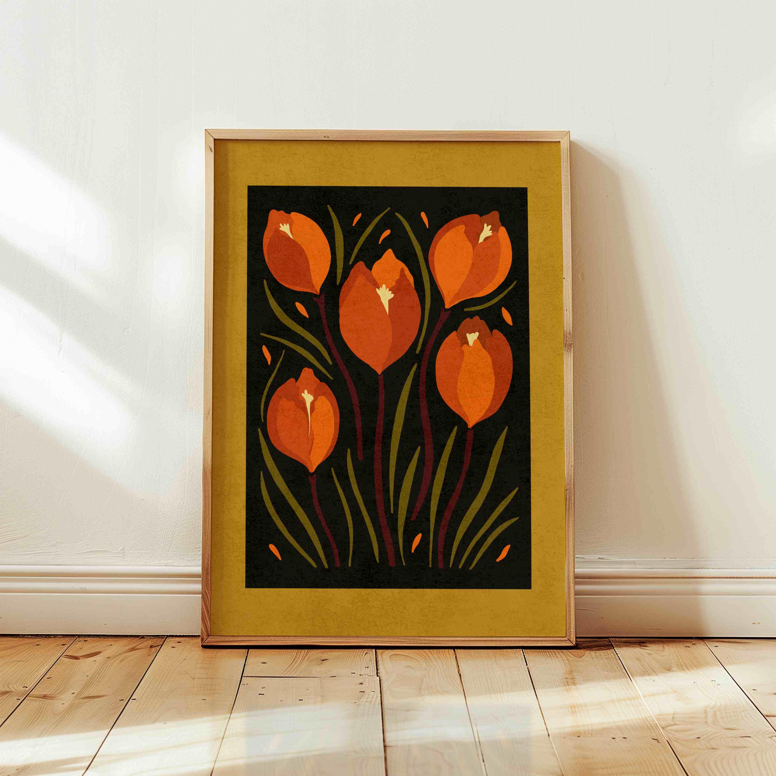 Retro tulip floral print featuring orange blooms, olive green leaves and burgundy-toned stems set on a deep background, and finished off with a golden ochre border. This moody flower print is ideal for earth-toned homes, cozy interiors, or vintage gallery walls.