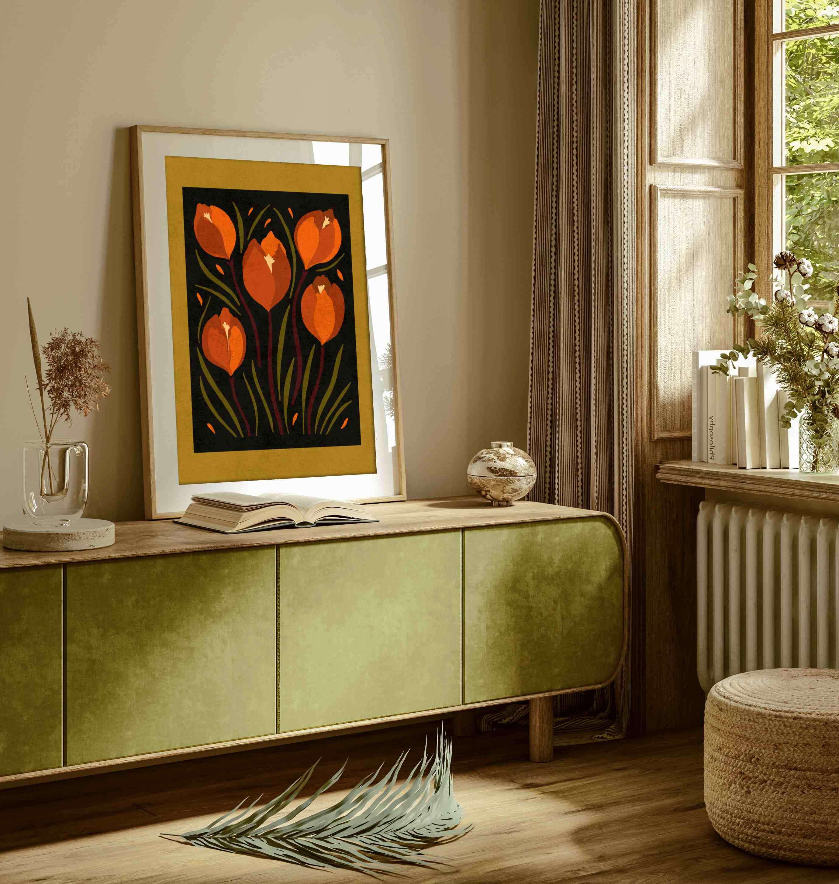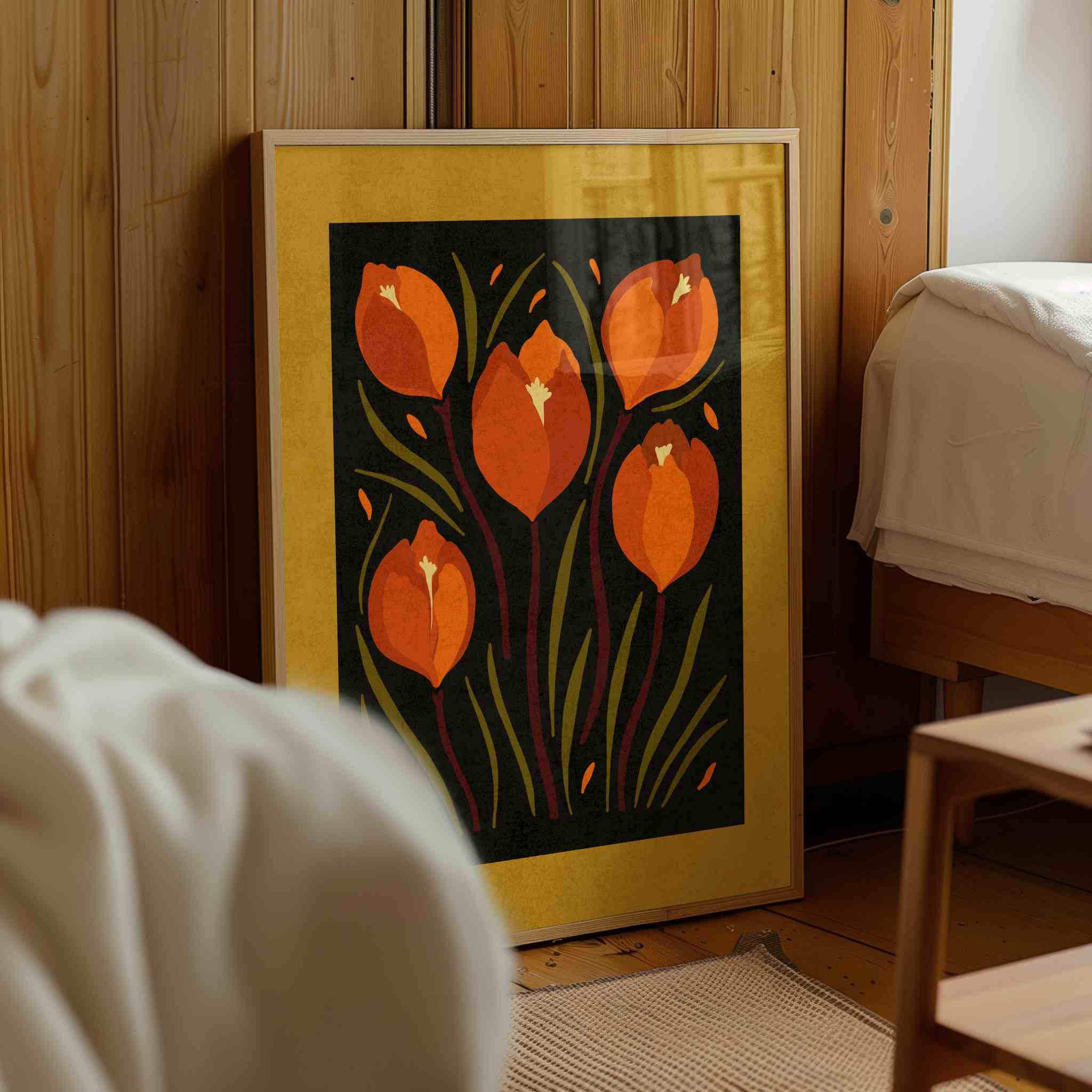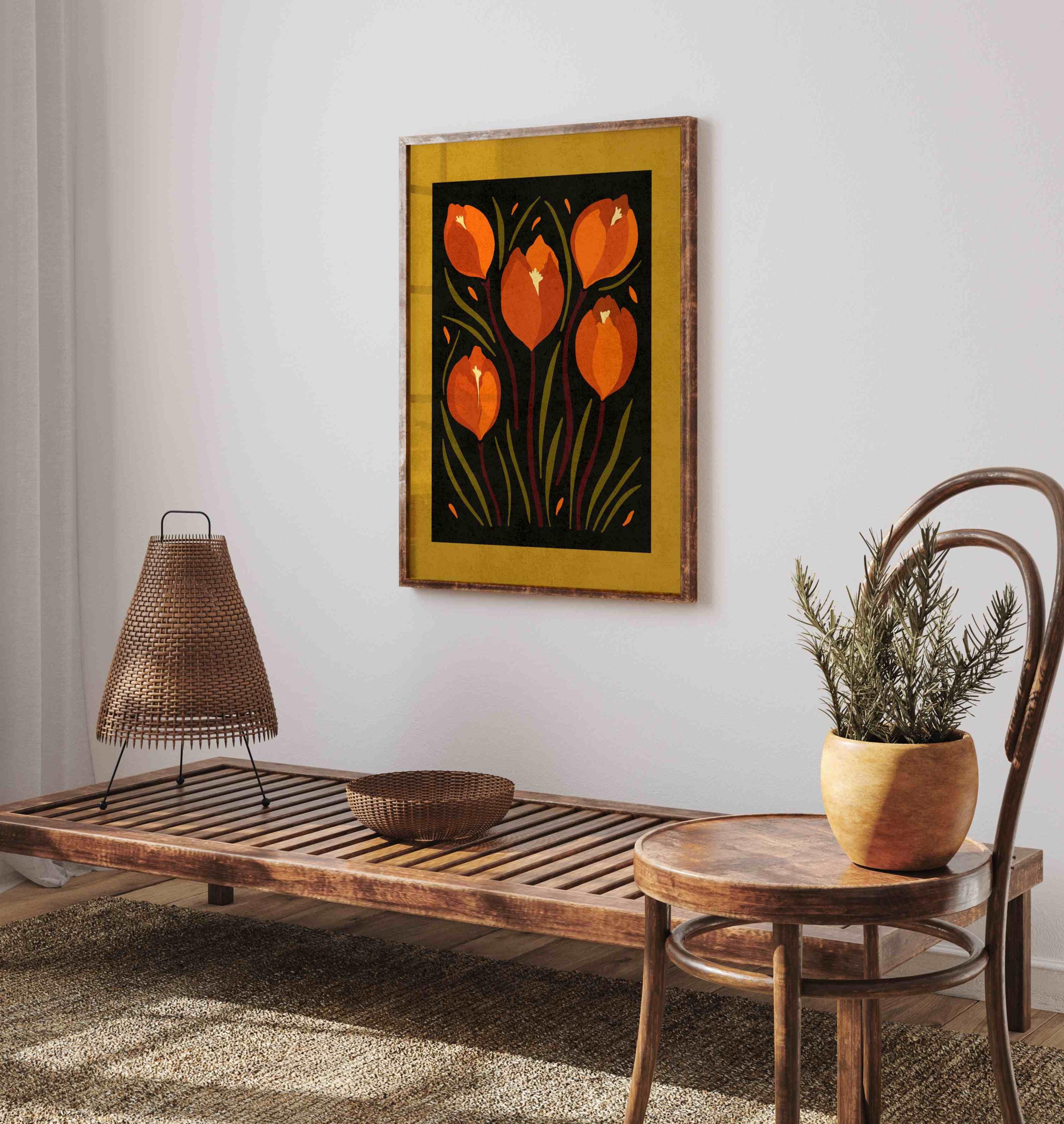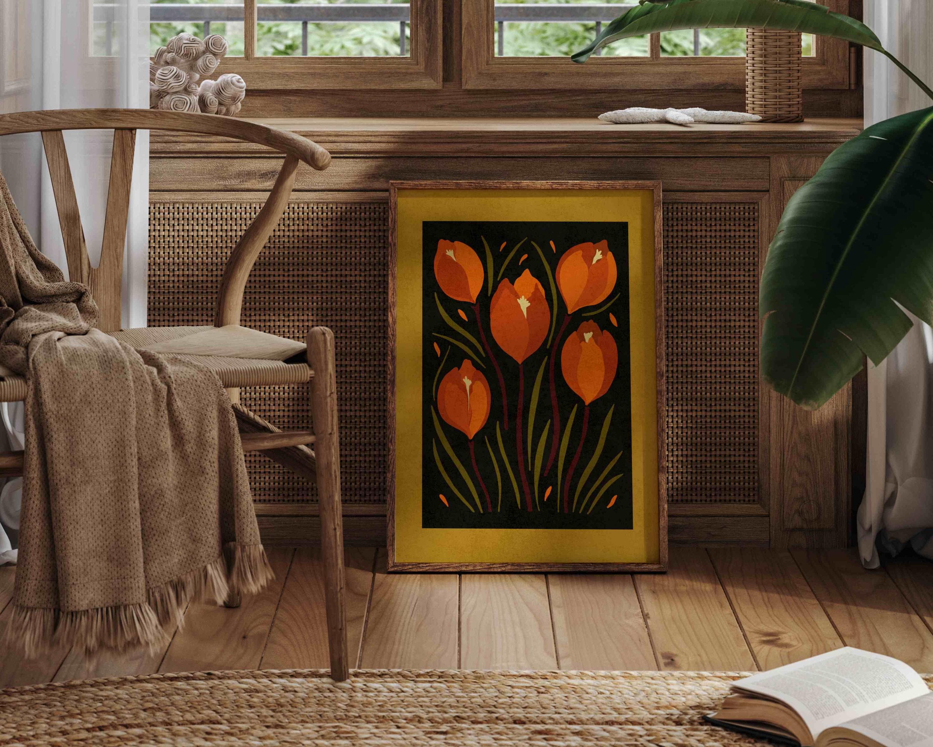 Retro tulip floral print featuring orange blooms, olive green leaves and burgundy-toned stems set on a deep background, and finished off with a golden ochre border. This moody flower print is ideal for earth-toned homes, cozy interiors, or vintage gallery walls.