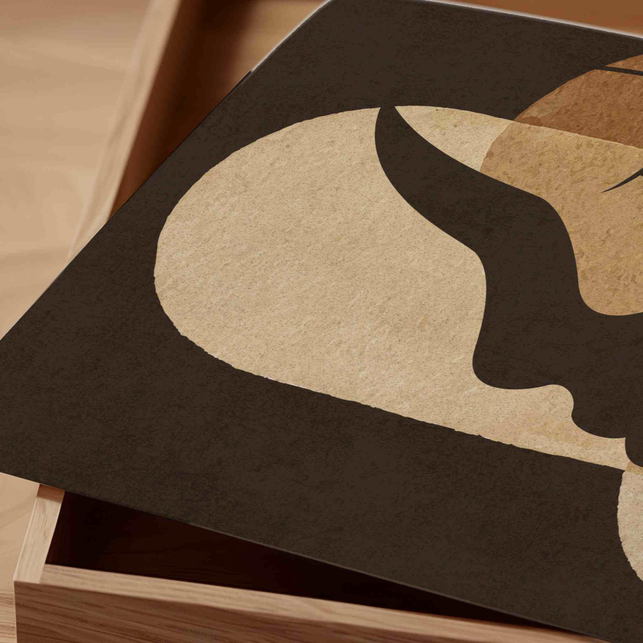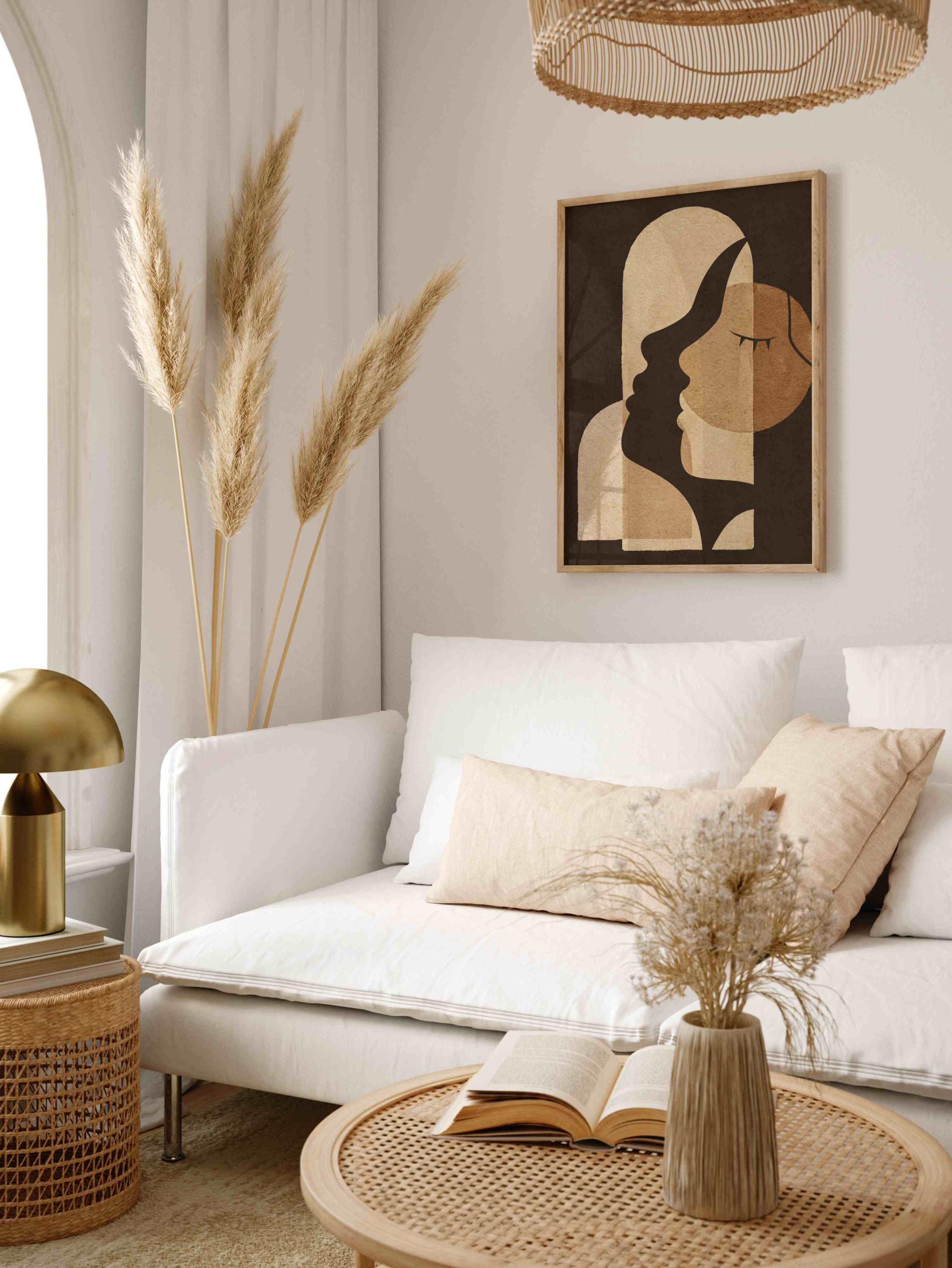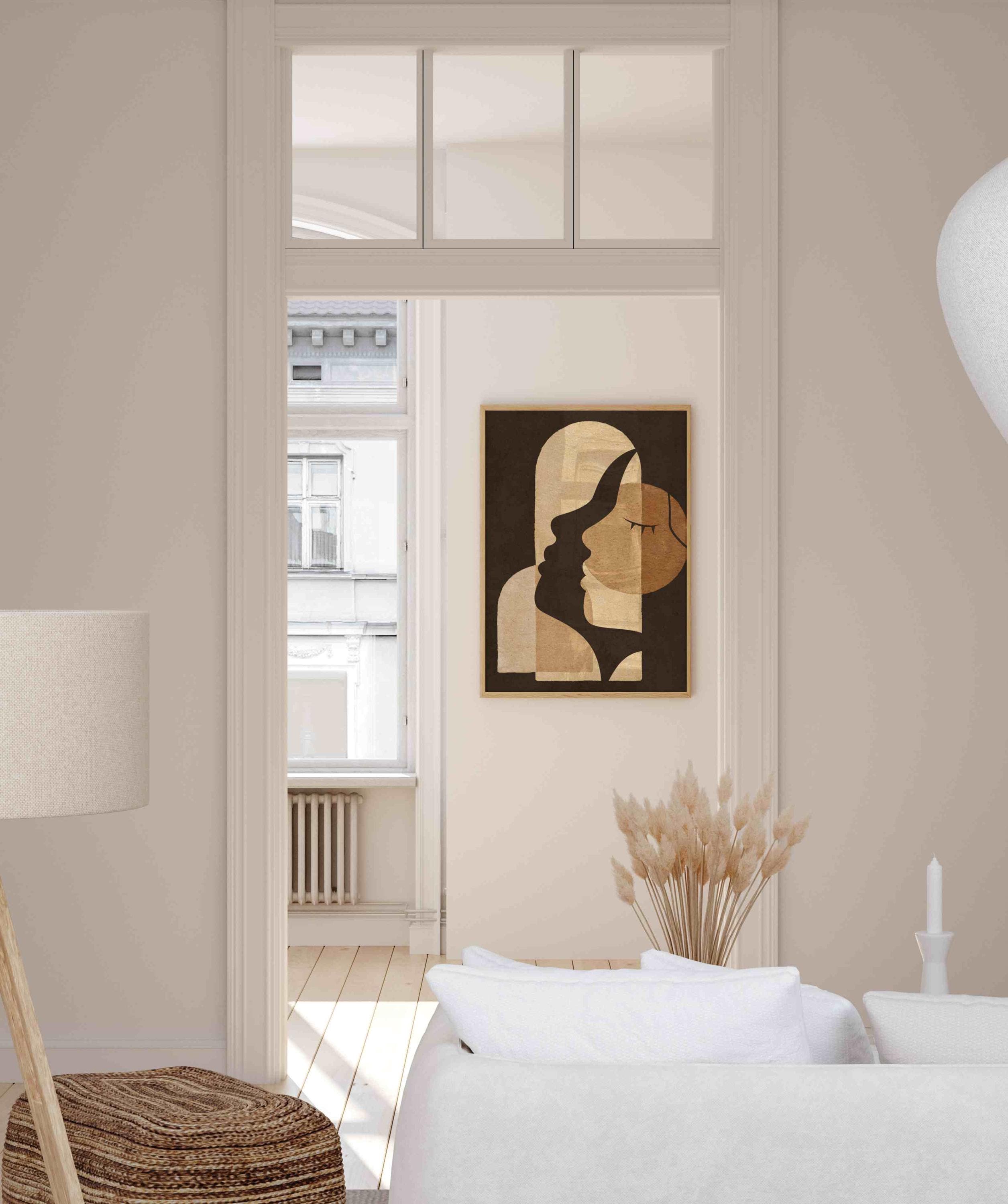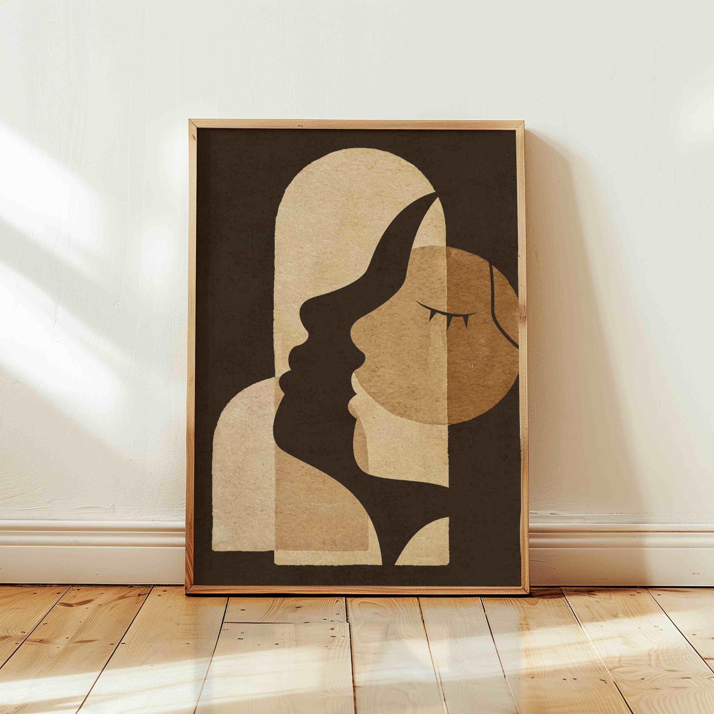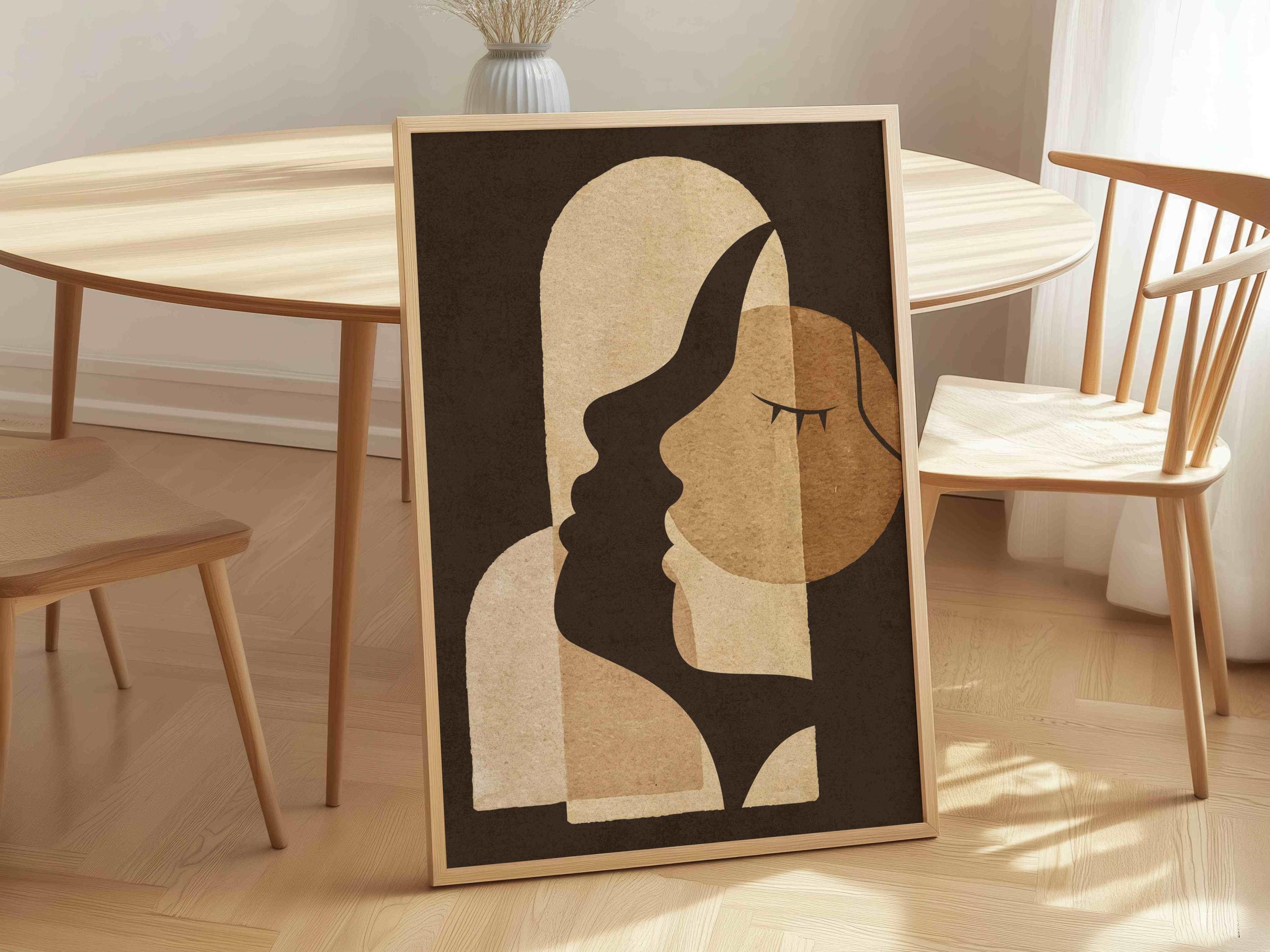 Minimalist portrait art print featuring abstract faces designed in Scandinavian mid-century style. The neutral, earthy tones are perfect for a calm and cohesive color palette.