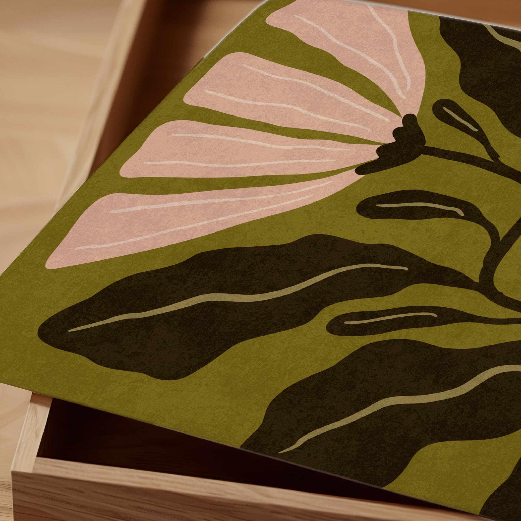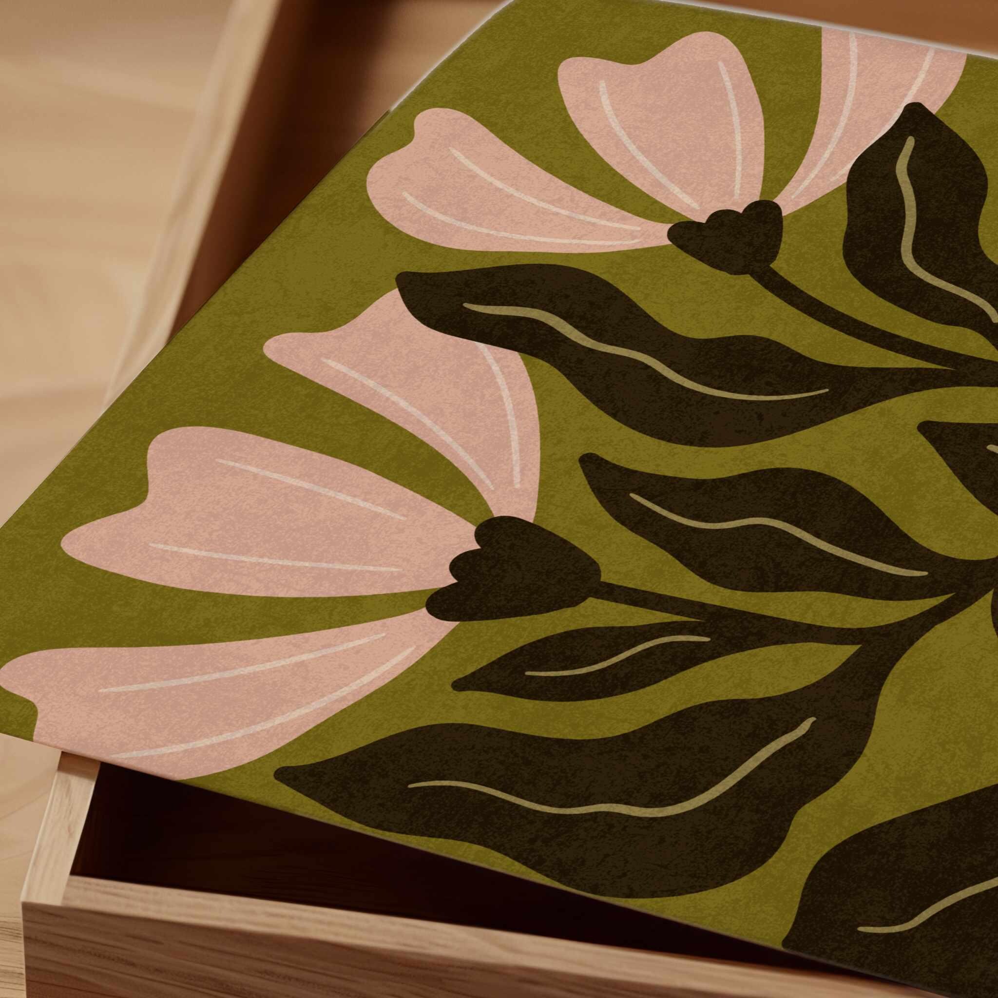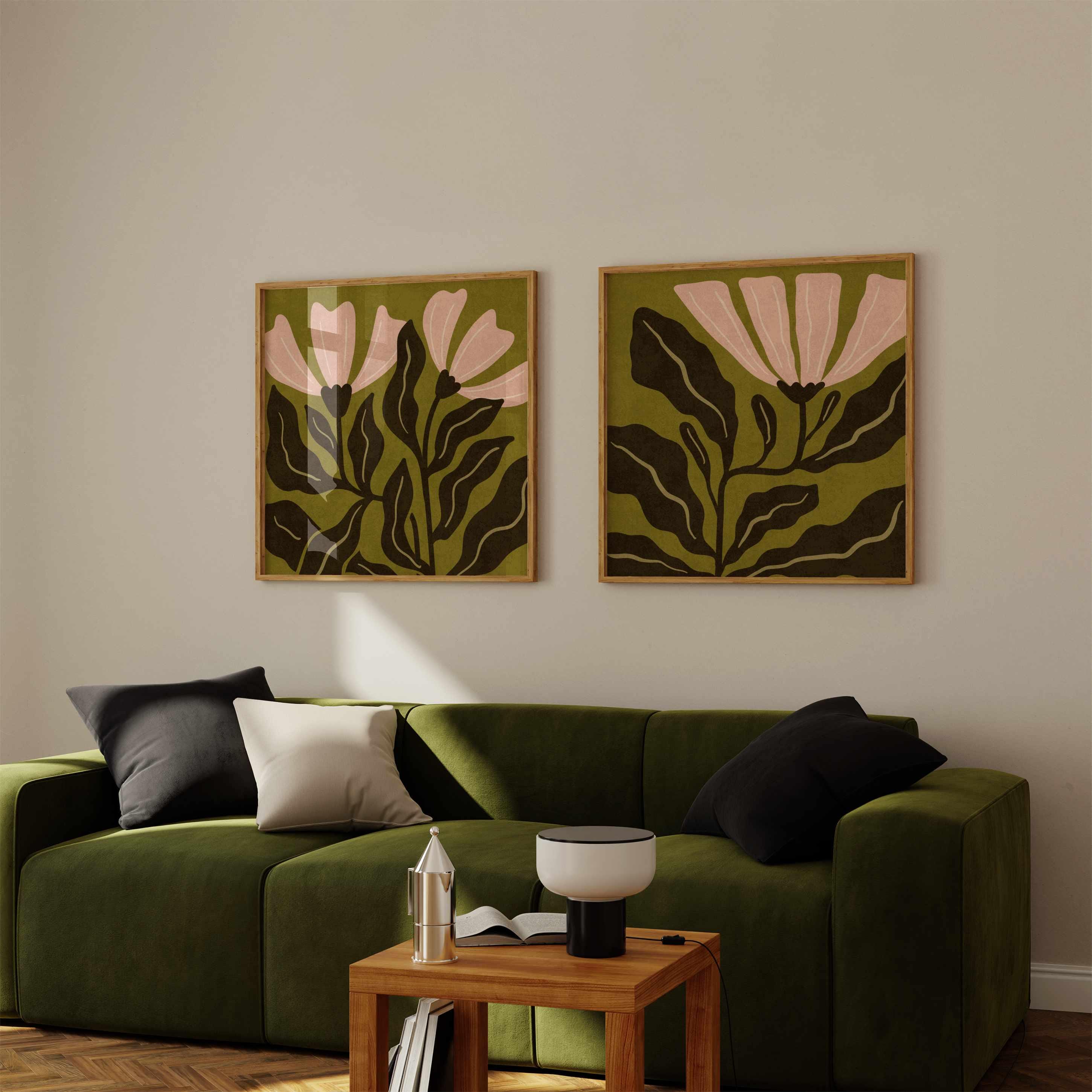 Retro floral wall art set of two prints, featuring abstract botanical forms in earthy muted green and soft blush pink. Inspired by Matisse cutouts and 70s floral motifs, this set blends vintage style with modern minimalism. The square format makes them easy to pair or stack, and the gentle color palette works beautifully in boho, cozy, vintage-inspired or minimalist interiors.