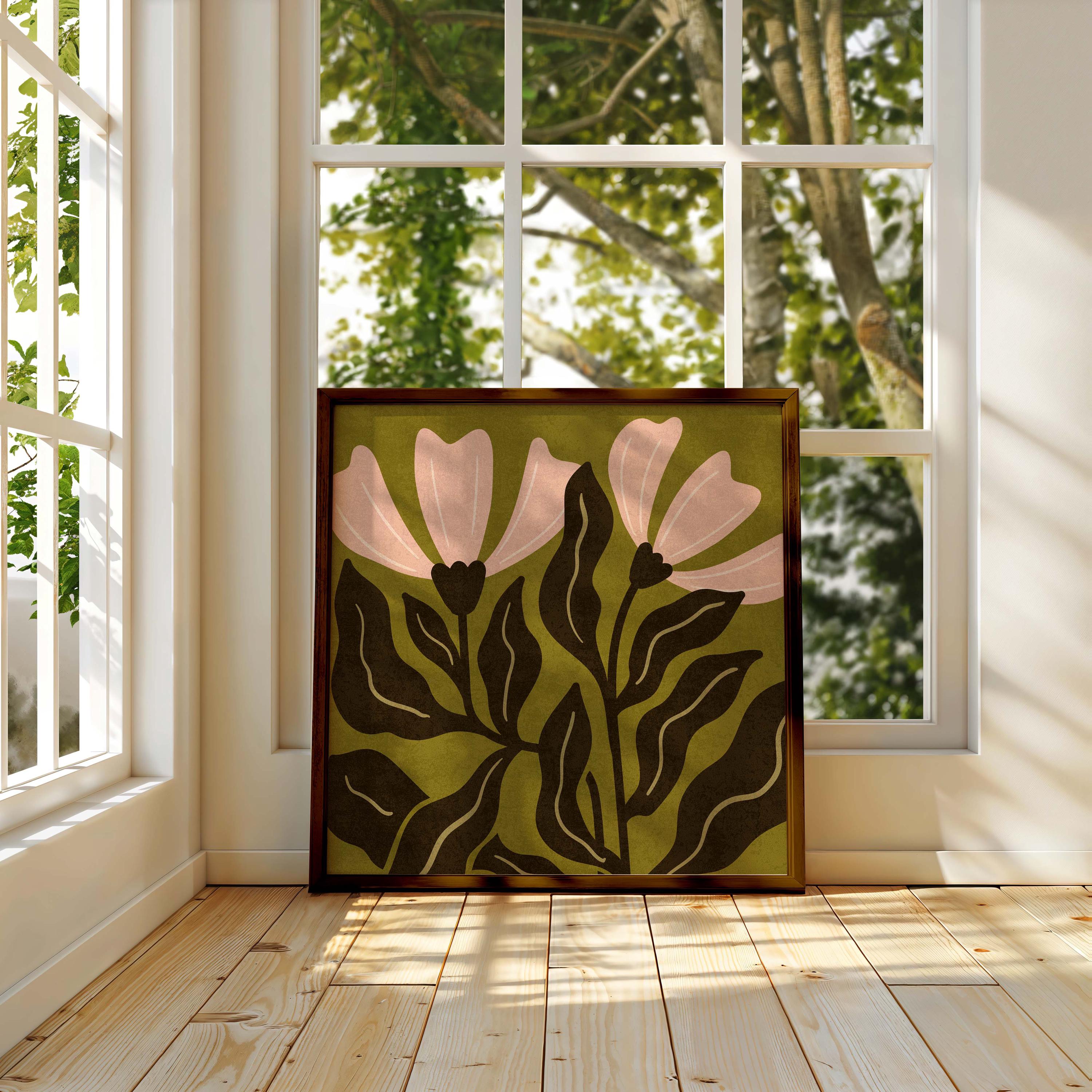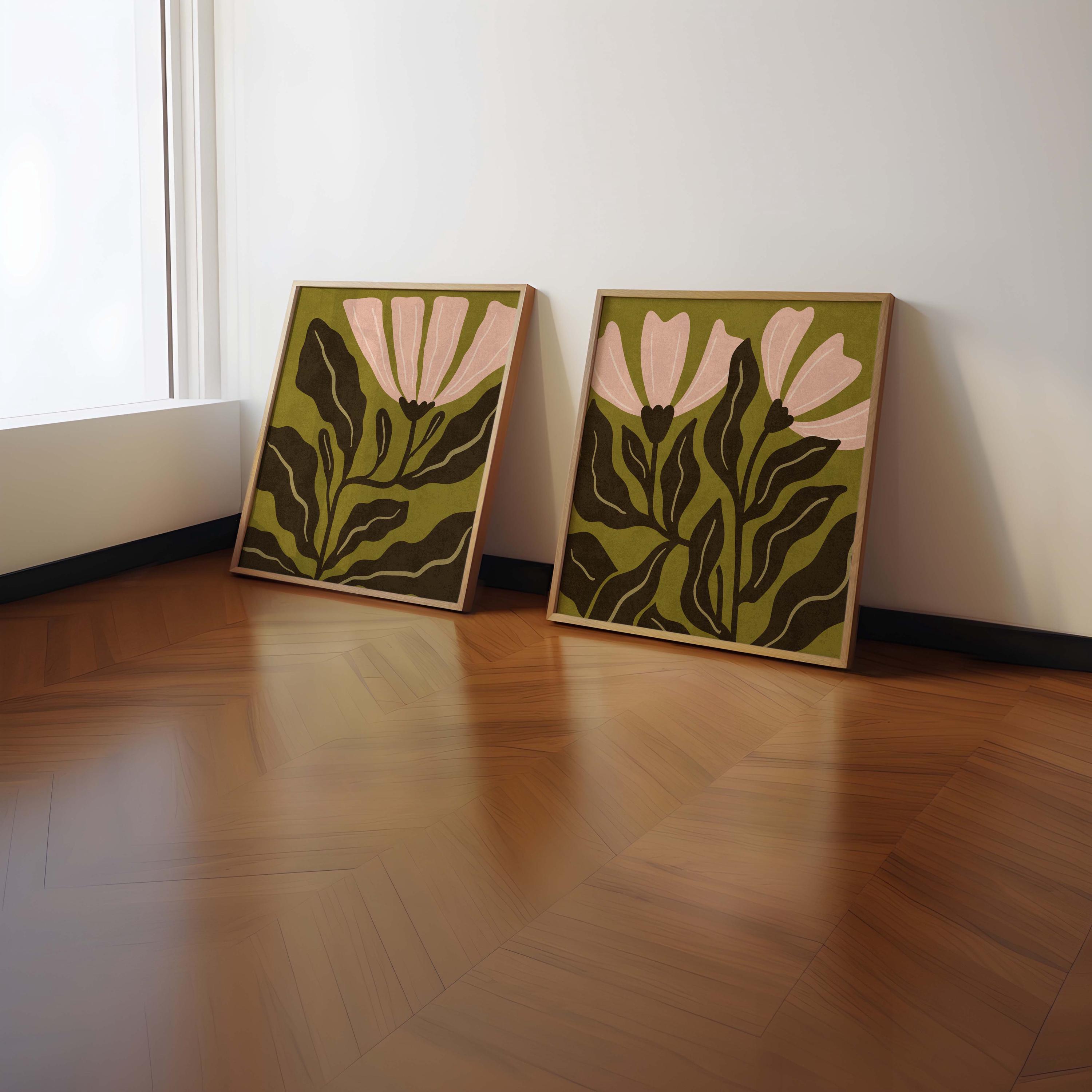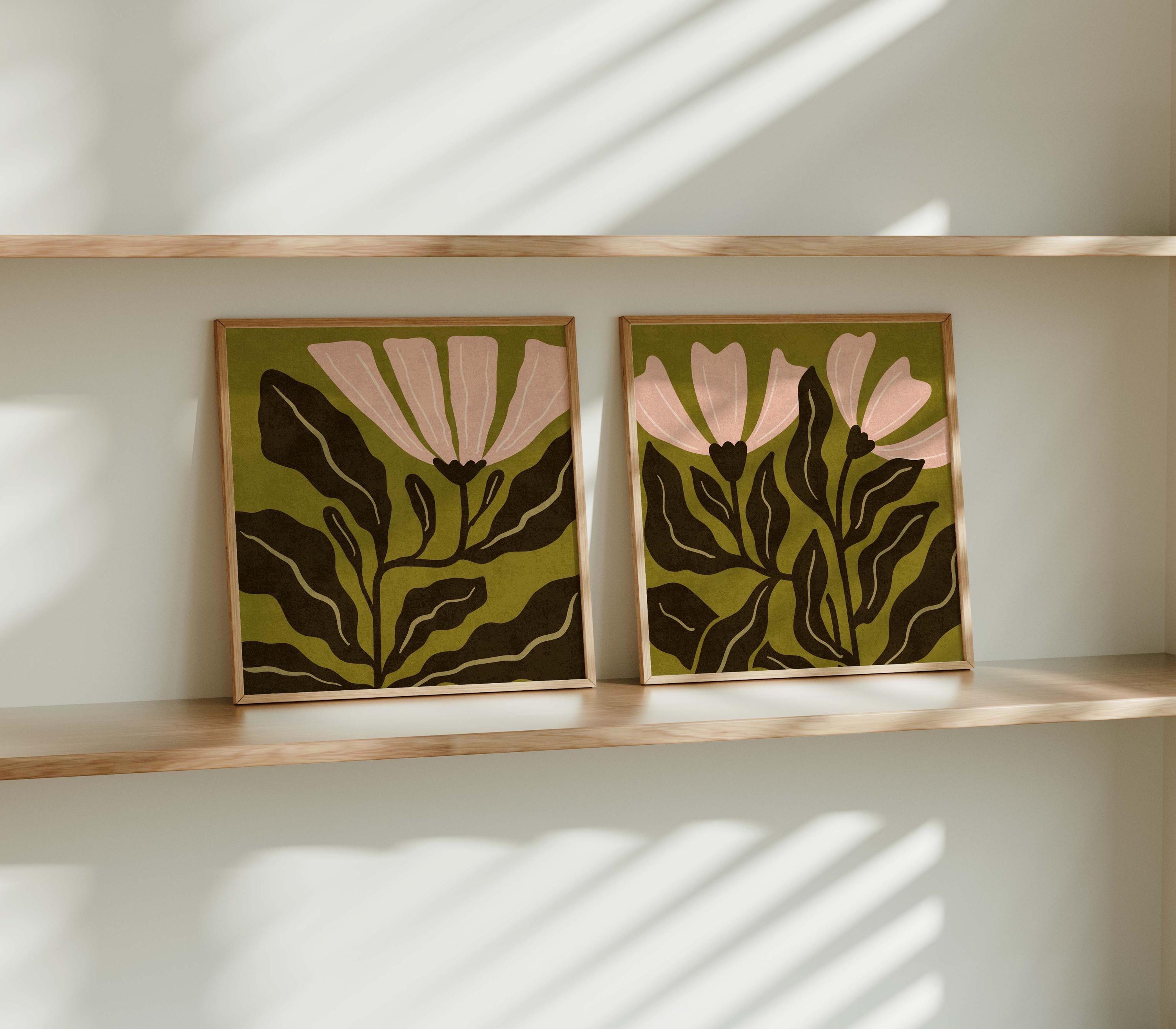 Retro floral print set of two featuring abstract botanical forms in earthy muted green and soft blush pink. Inspired by Matisse cutouts and 70s floral motifs, this set blends vintage style with modern minimalism.