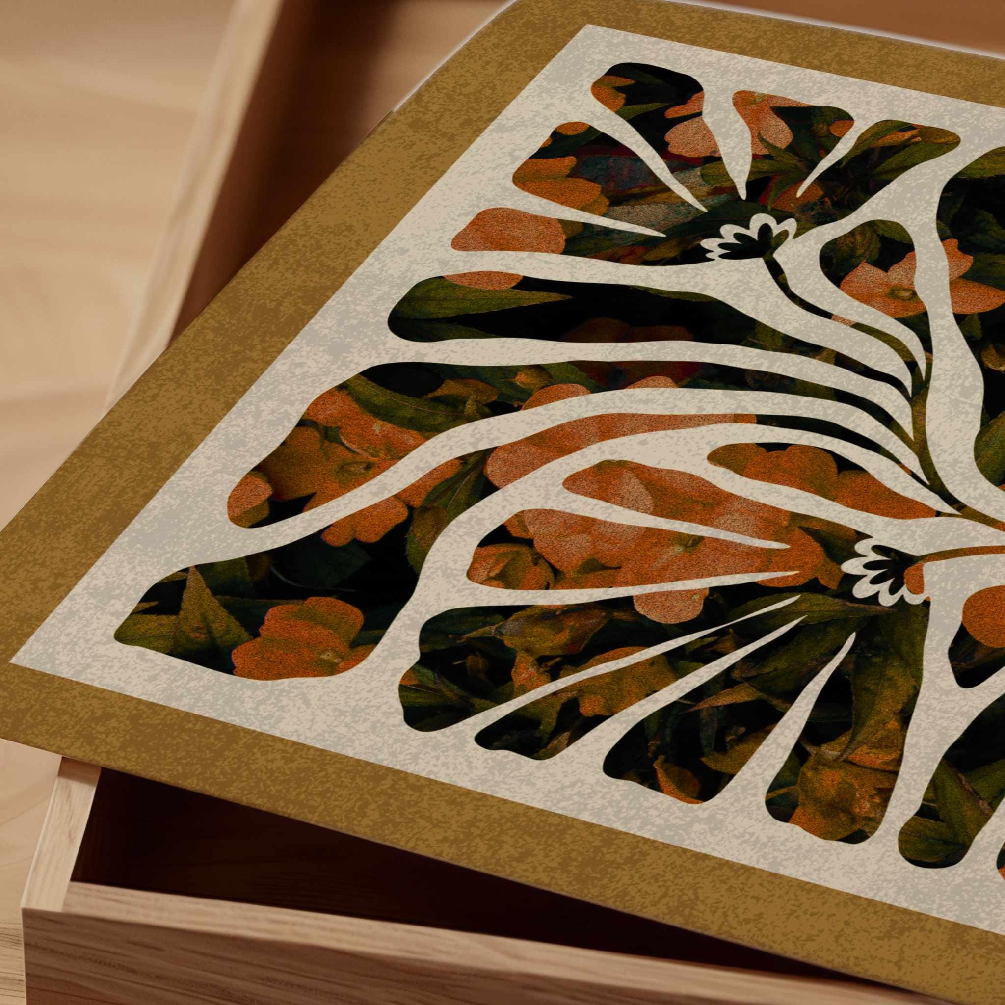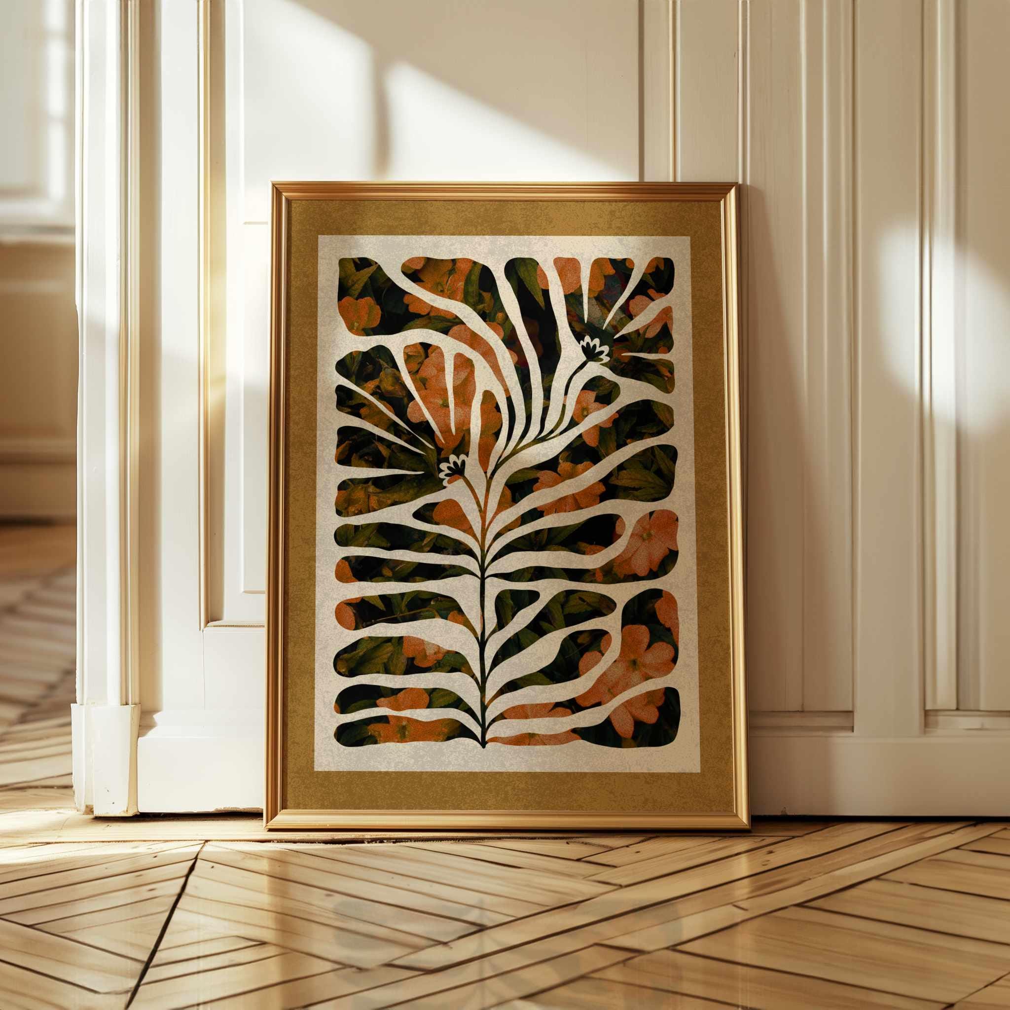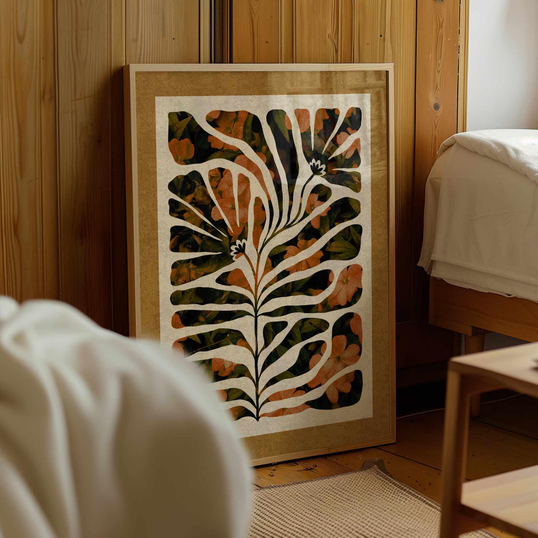 Abstract botanical print featuring soft organic plant shapes and a neutral retro floral design bordered with a warm brown mat. This artwork blends vintage-inspired aesthetics with a modern, boho home vibe, making it perfect for living rooms, bedrooms, offices, or gallery walls.