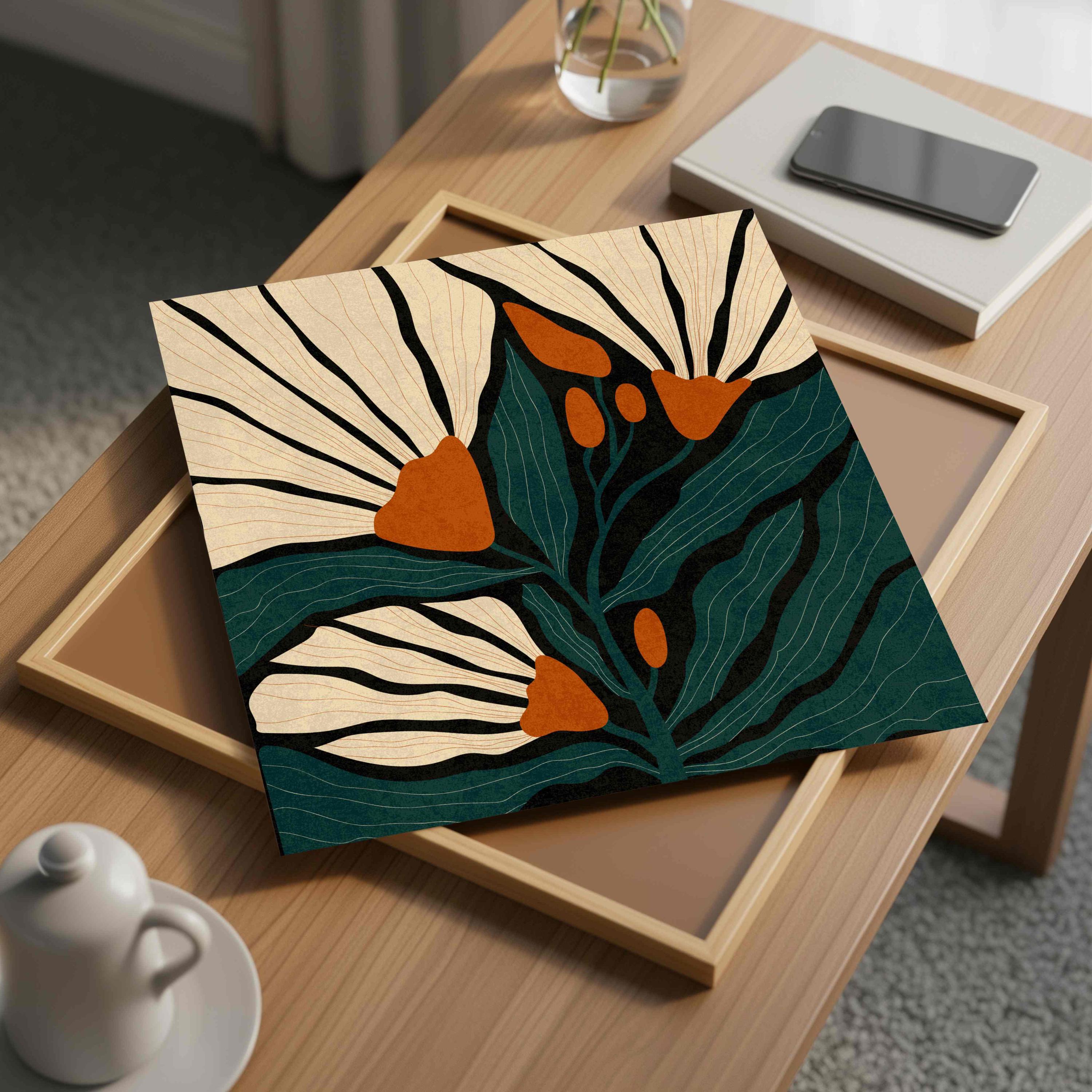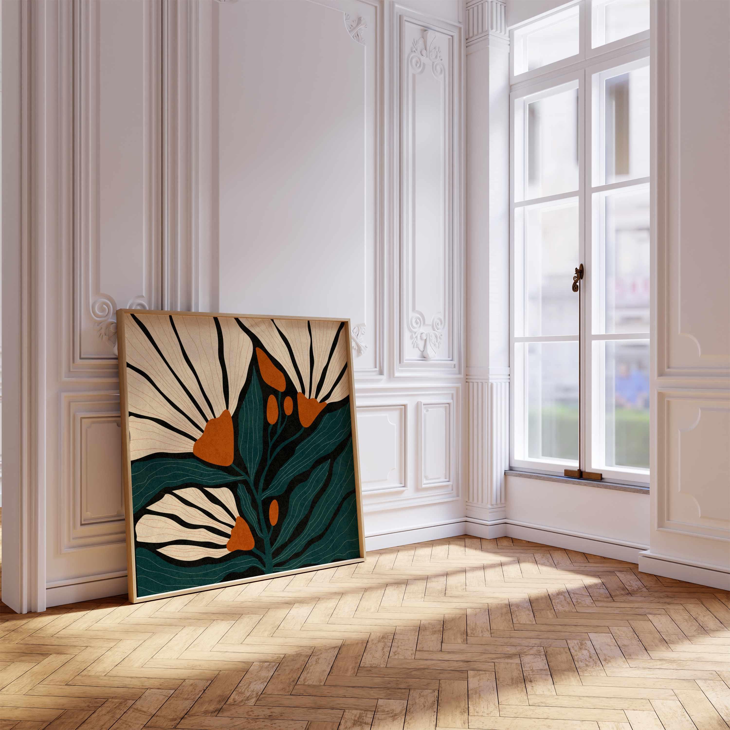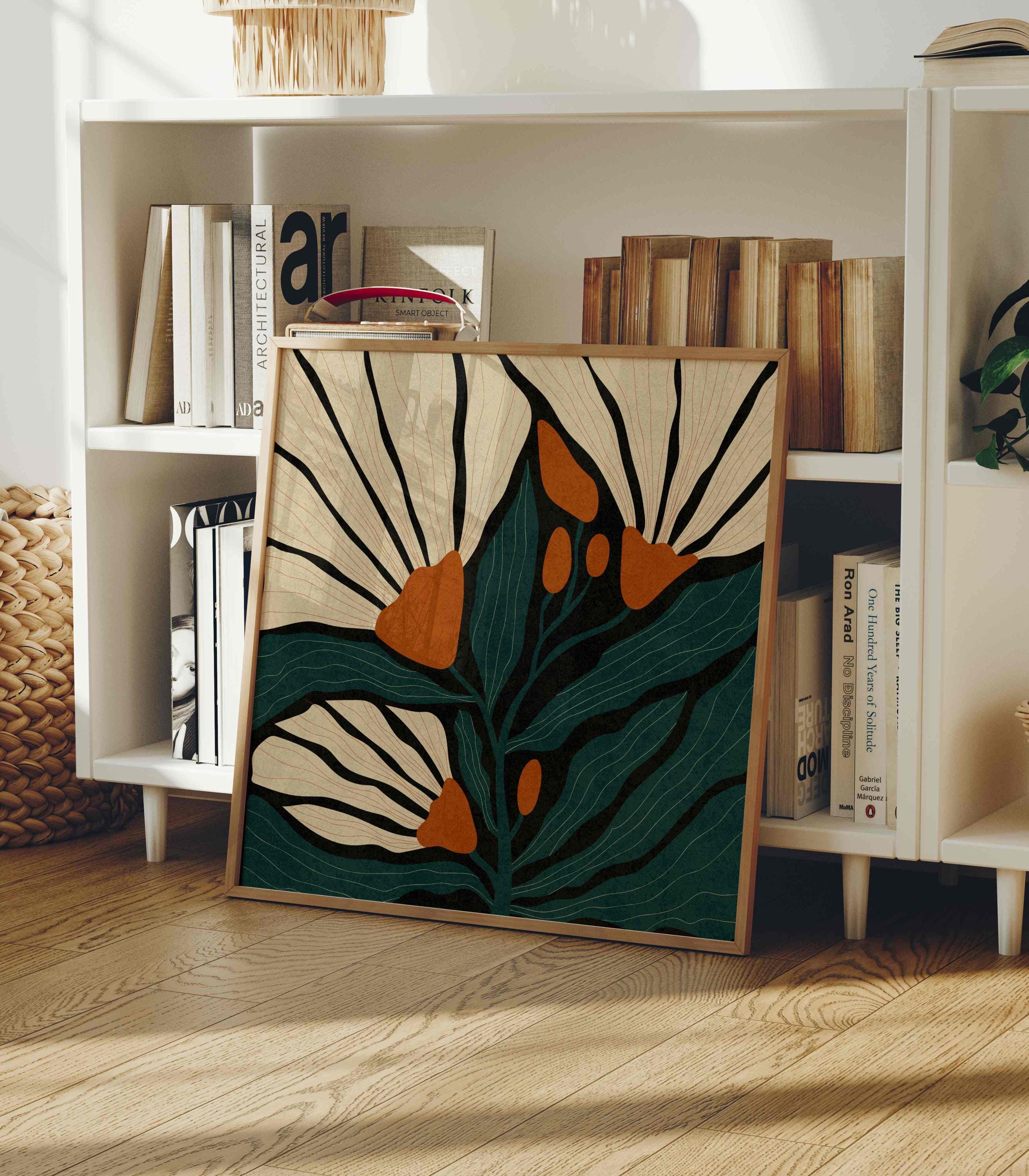 Abstract retro floral print in atmospheric colors: dark teal, light beige and orange. Mid century inspired flower poster that's perfect for enhancing up any space, be it your living room, bedroom, office, or anywhere else. This print also makes a thoughtful and unique gift for your friend for a special event like Christmas, birthday, or housewarming.