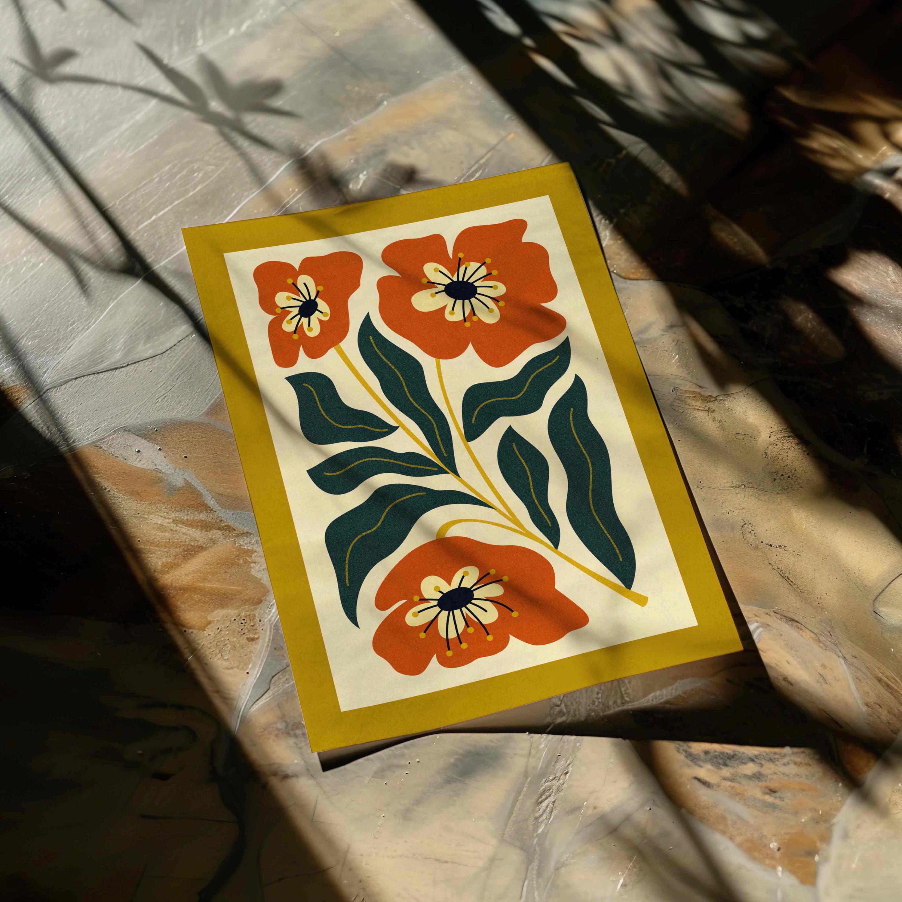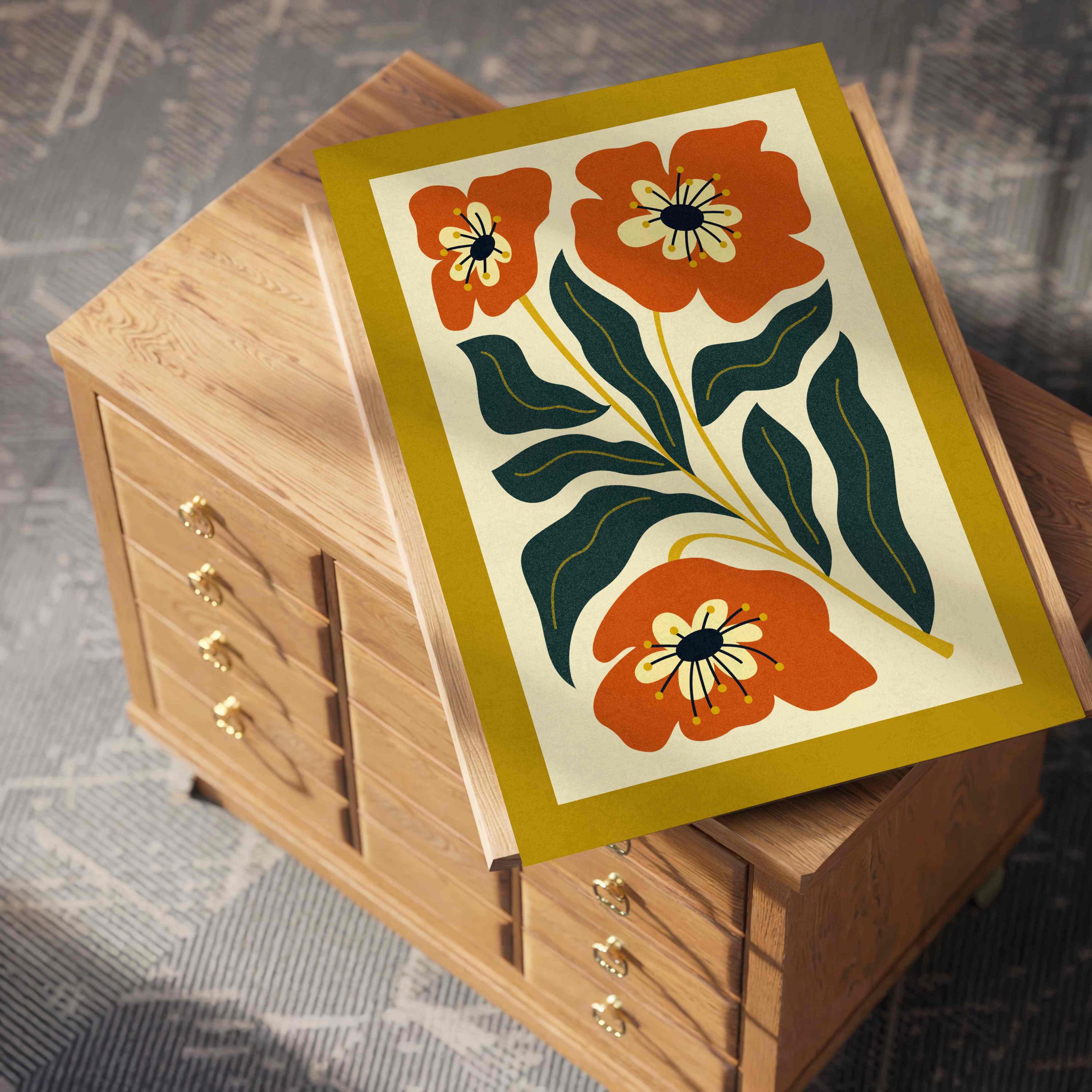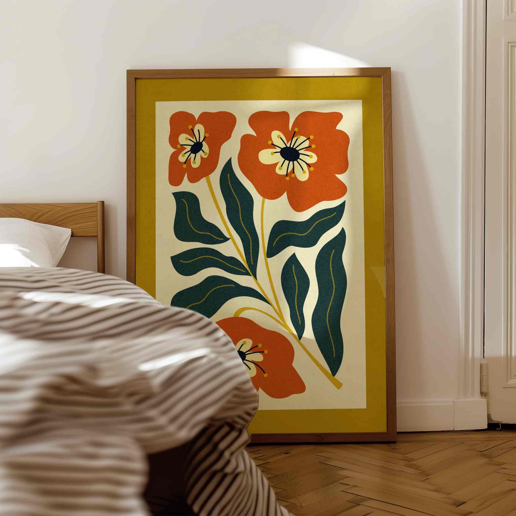 Retro floral wall art inspired by 70s design, Matisse-style shapes, and mid century modern aesthetics. This abstract botanical print is perfect for boho, eclectic, and mid century spaces and brings energy and a pop of color to any room — whether you're styling a gallery wall, office nook, bedroom, or kitchen.
