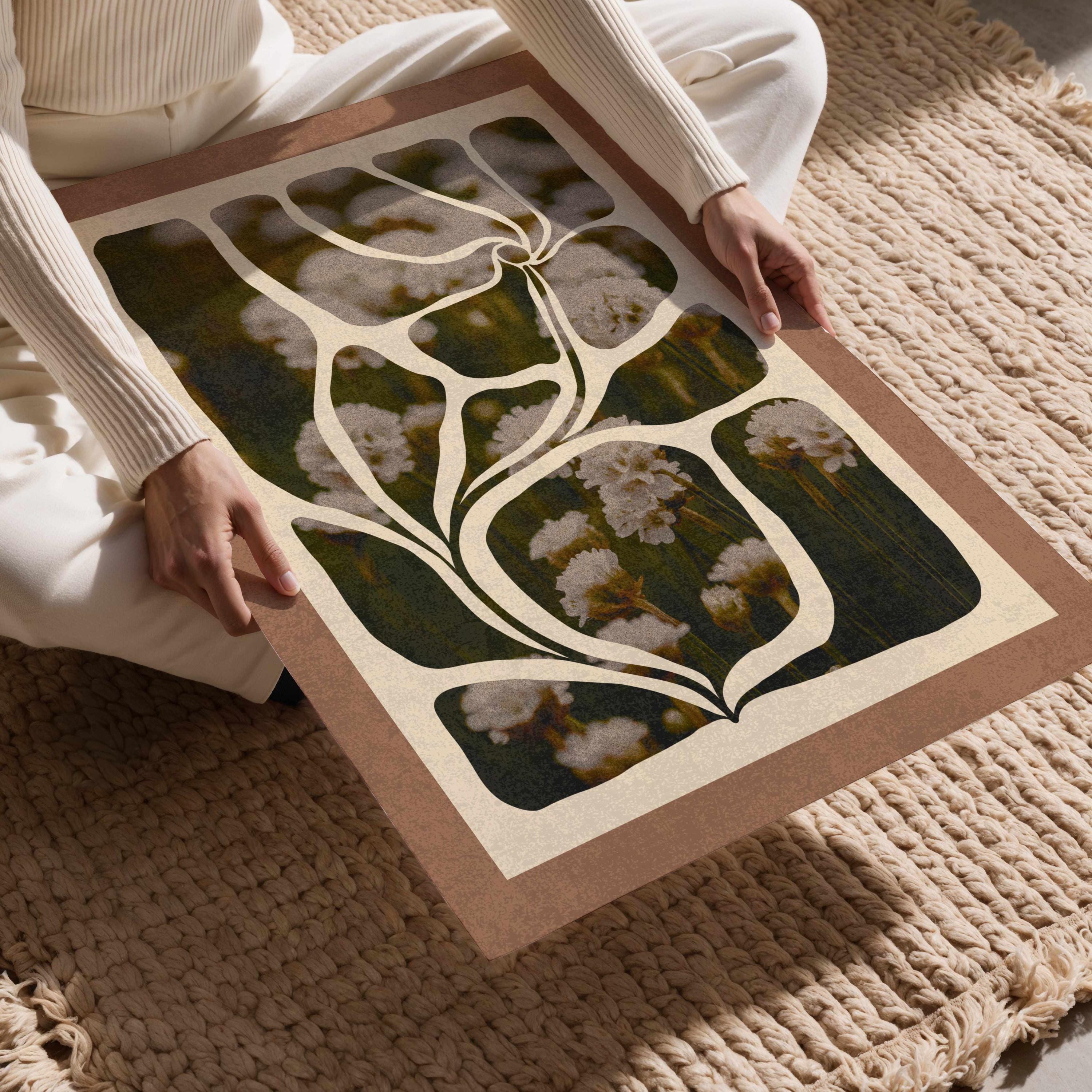 Abstract floral wall art featuring delicate white wildflowers revealed through flowing organic cutout shapes and finished with a dusty pink mat. Inspired by nature’s calm and the nostalgic warmth of long summer nights, this artwork brings together mid century shapes, retro design, and modern abstraction. Ideal for boho, cozy cottagecore, vintage-inspired or nature-themed interiors.