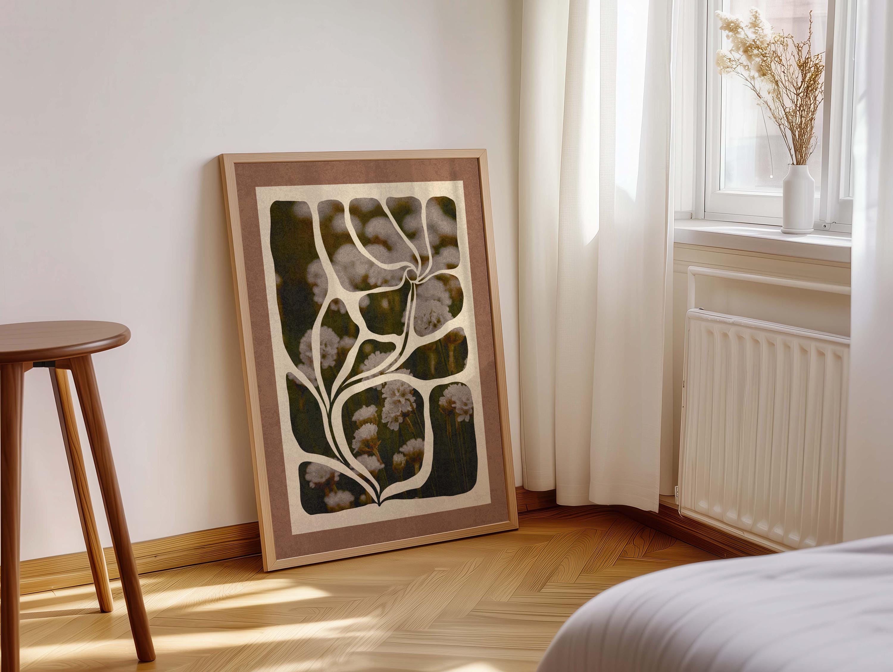 Abstract floral wall art featuring delicate white wildflowers revealed through flowing organic cutout shapes and finished with a dusty pink mat. Ideal for boho, cozy cottagecore, vintage-inspired or nature-themed interiors.