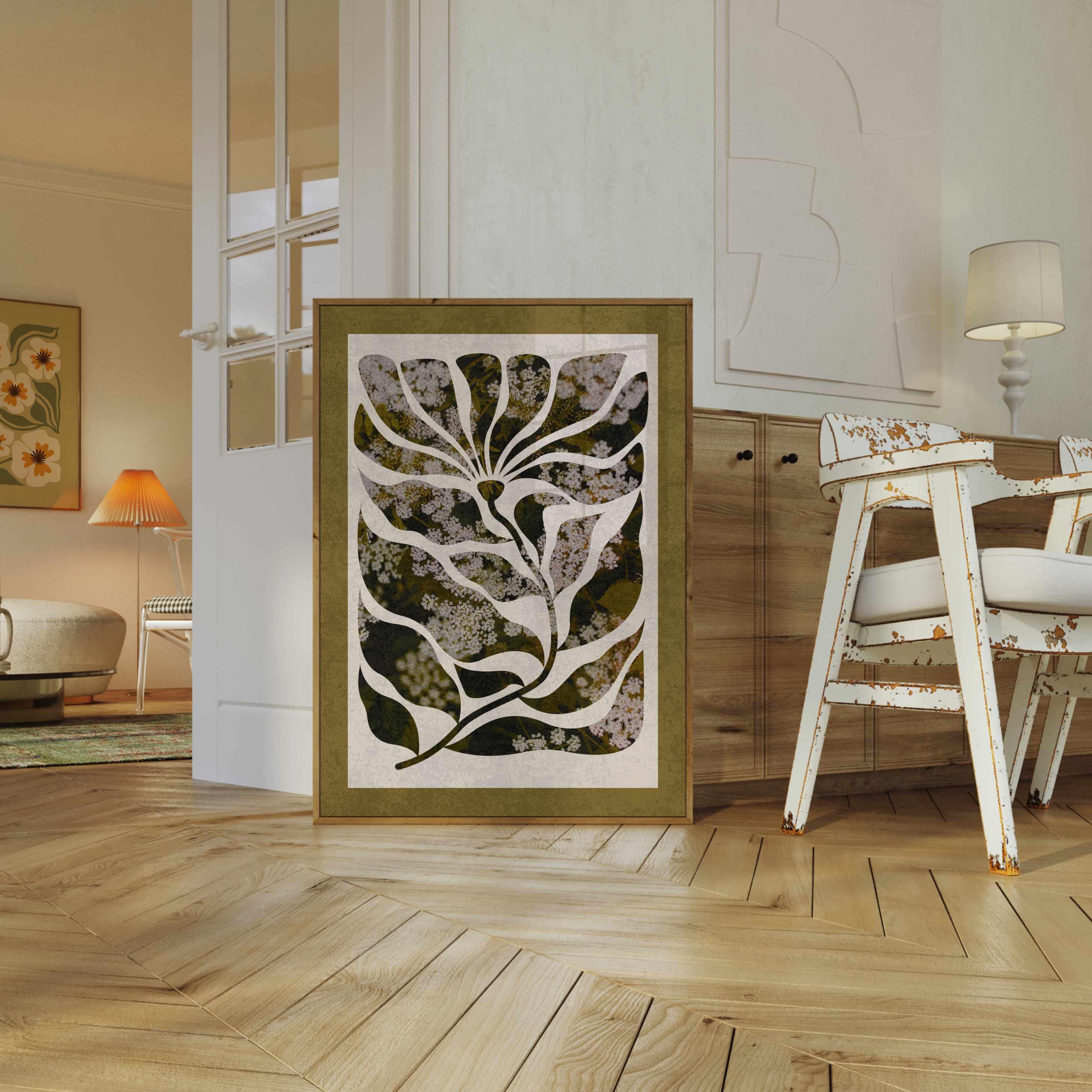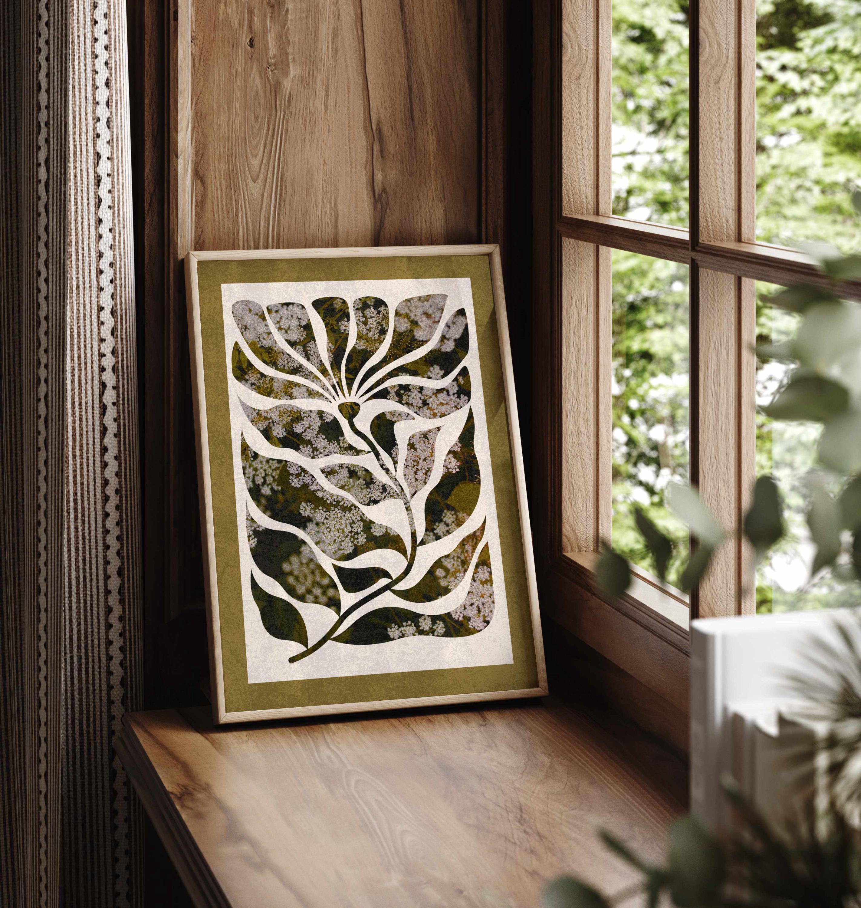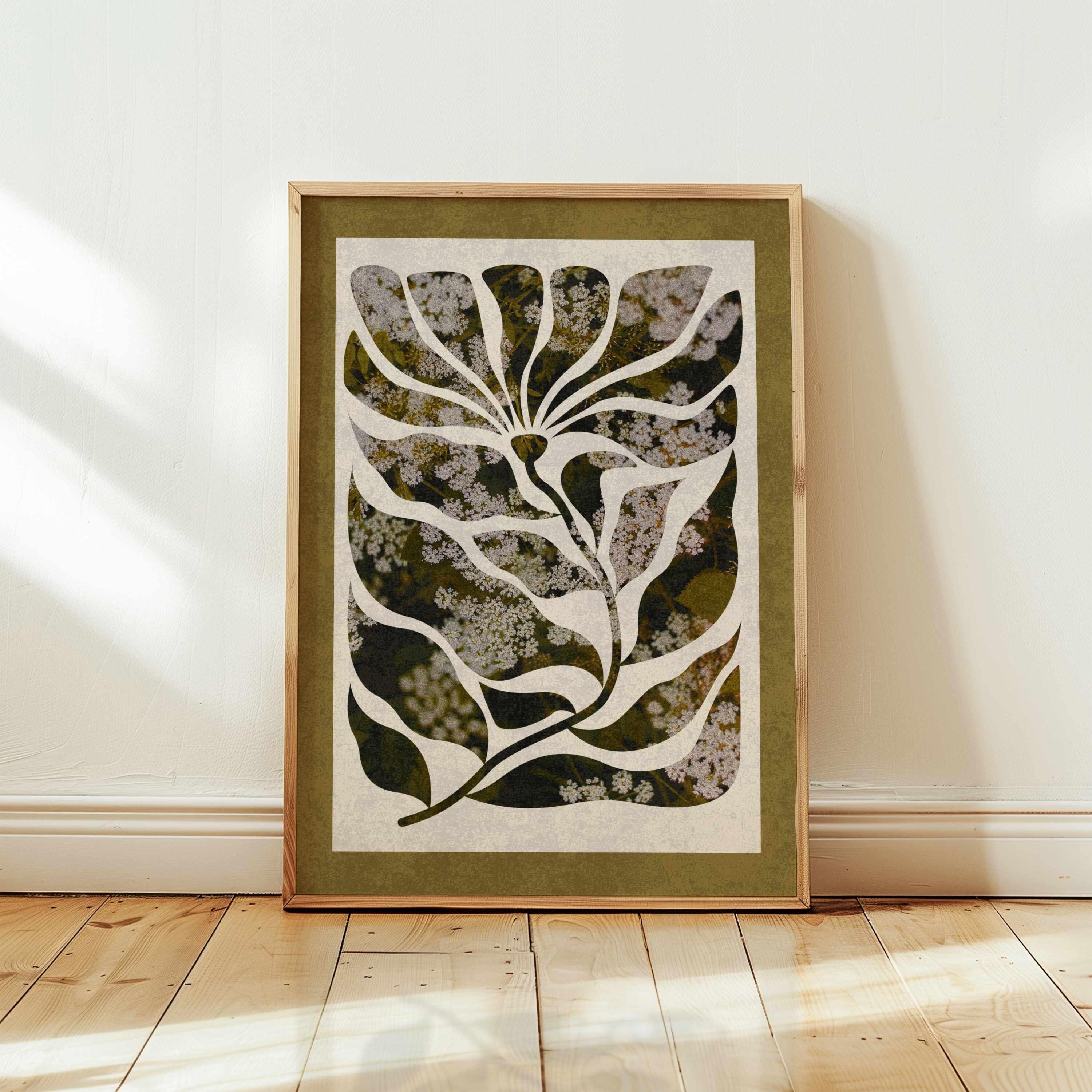 Abstract botanical print that captures the organic beauty of wildflowers through a unique, Matisse-inspired lens. The bold, cutout-style silhouette of the flower and leaves is filled with a delicate wildflower pattern, creating a contrast between graphic shapes and natural textures.