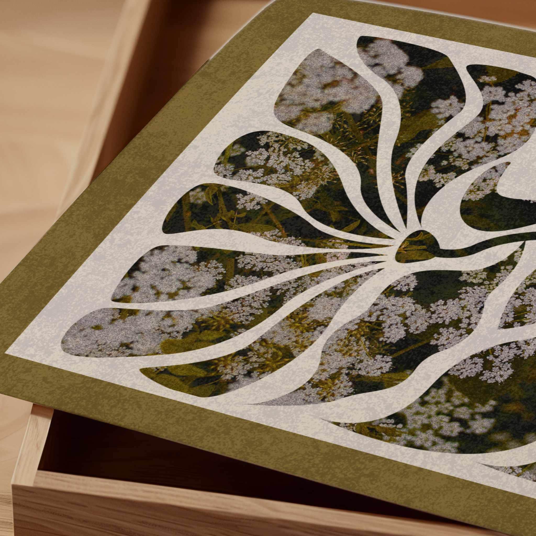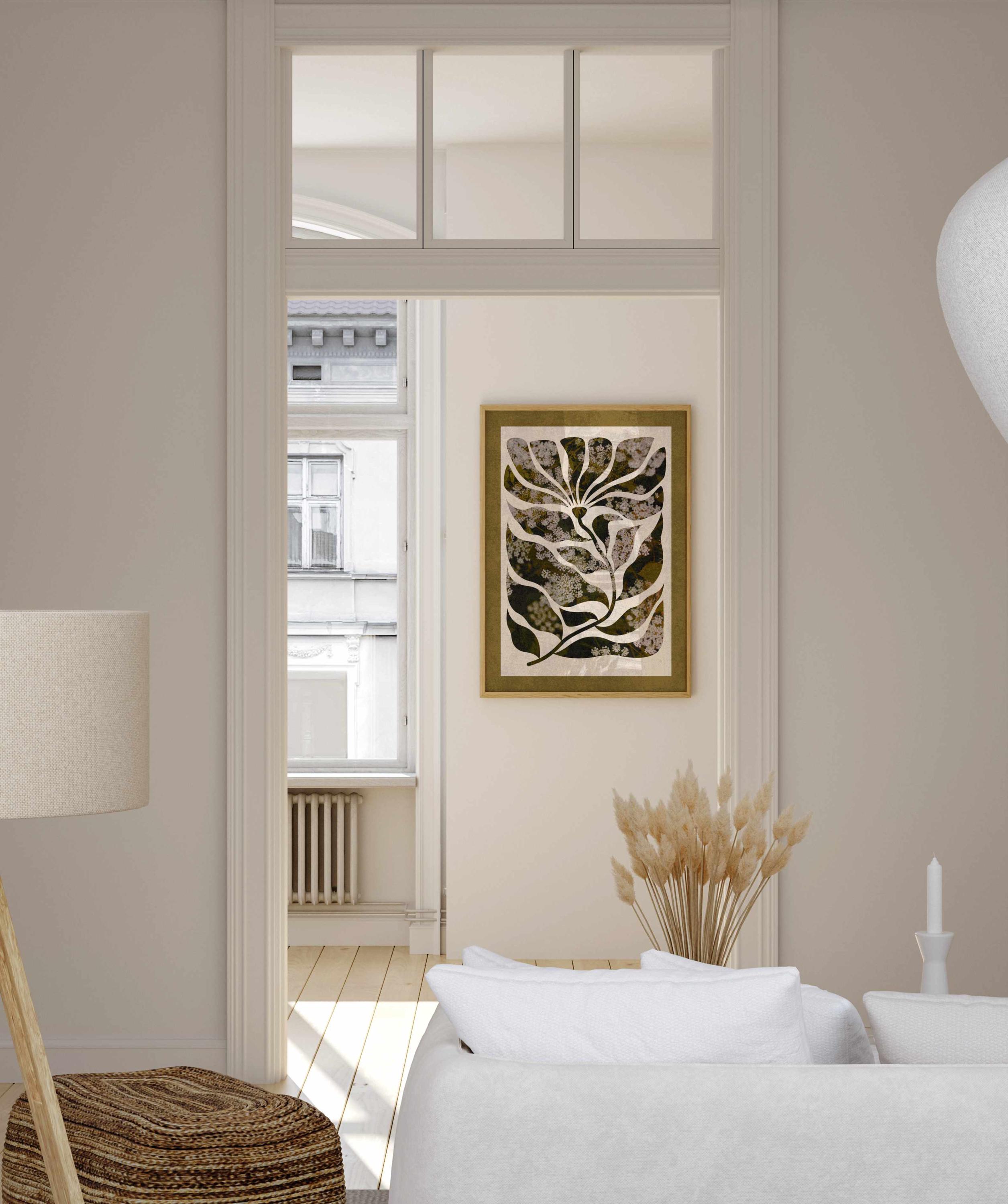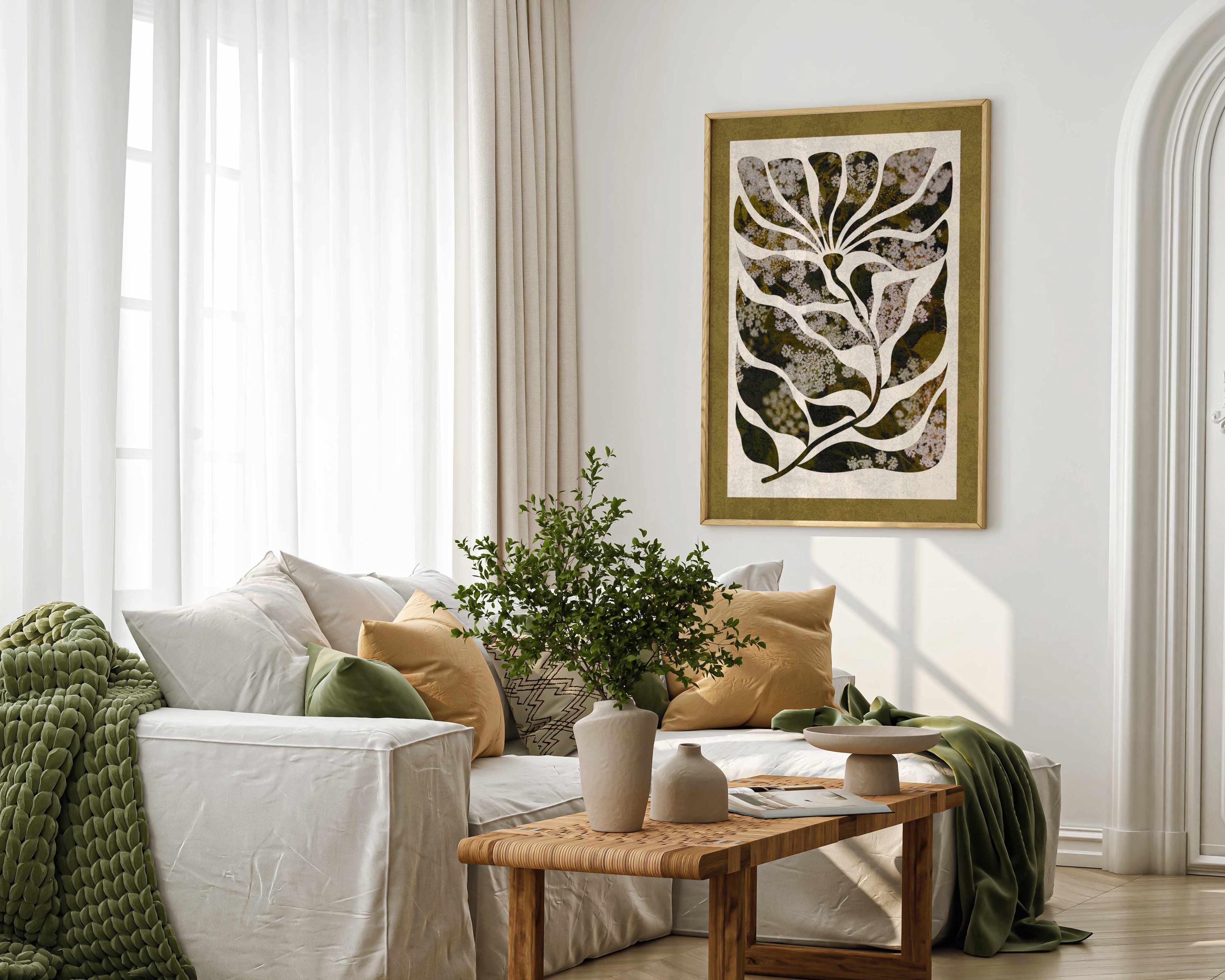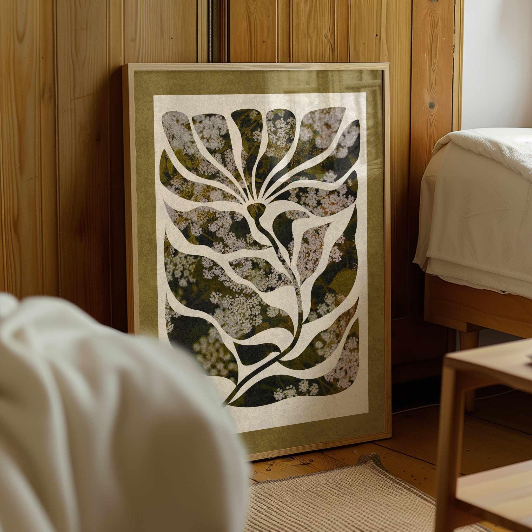 Abstract botanical print that captures the organic beauty of wildflowers through a unique, Matisse-inspired lens. The bold, cutout-style silhouette of the flower and leaves is filled with a delicate wildflower pattern, creating a contrast between graphic shapes and natural textures.