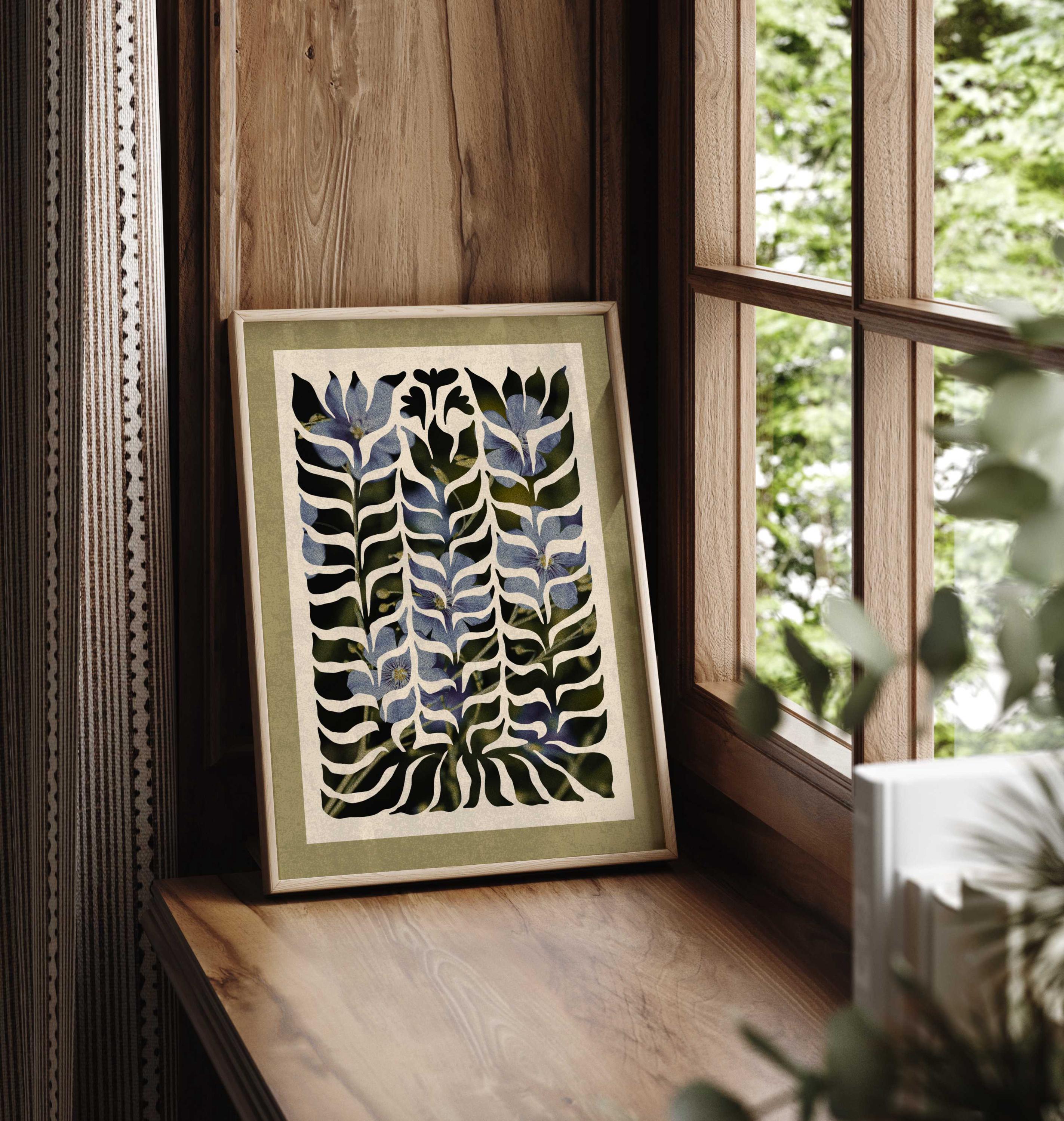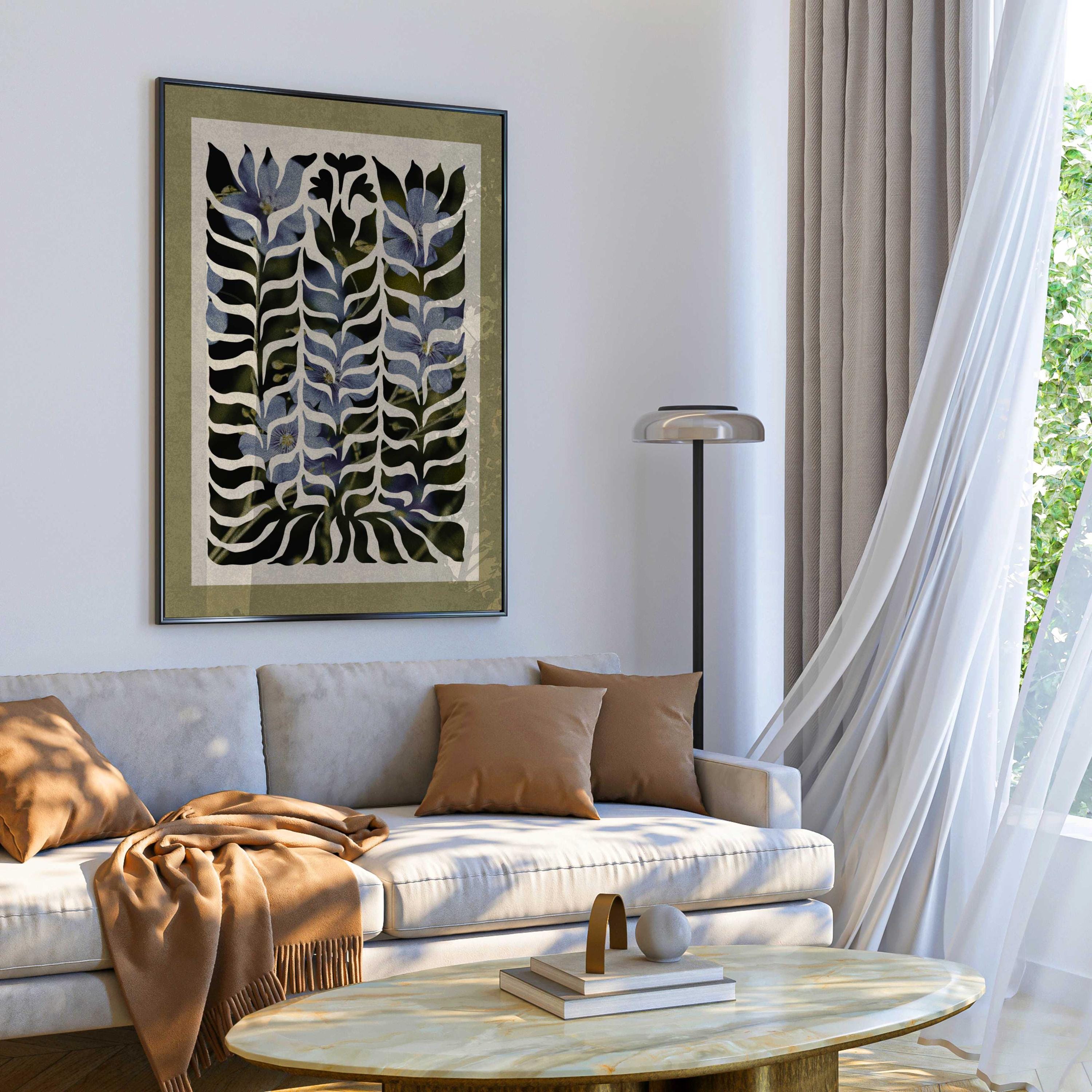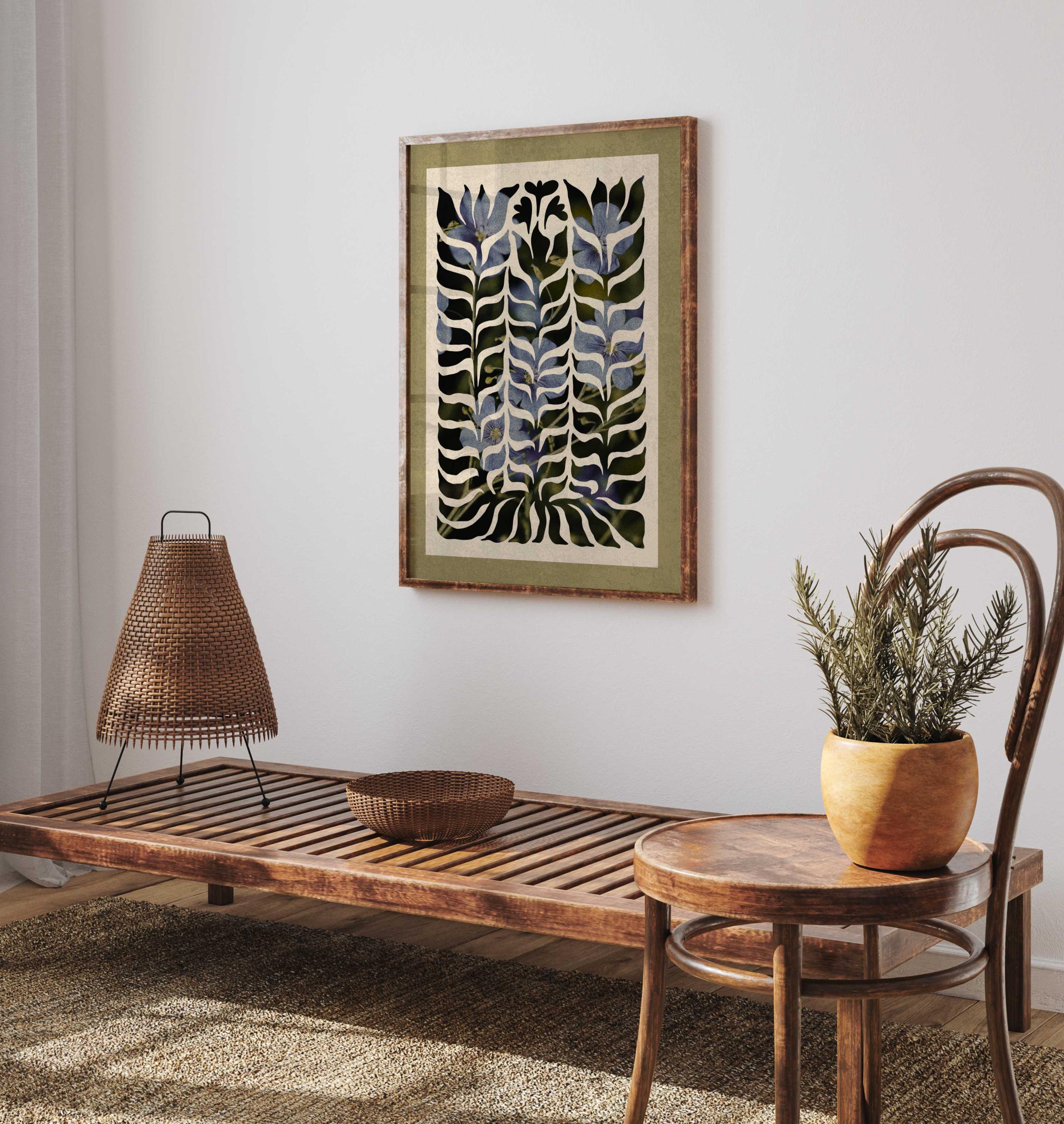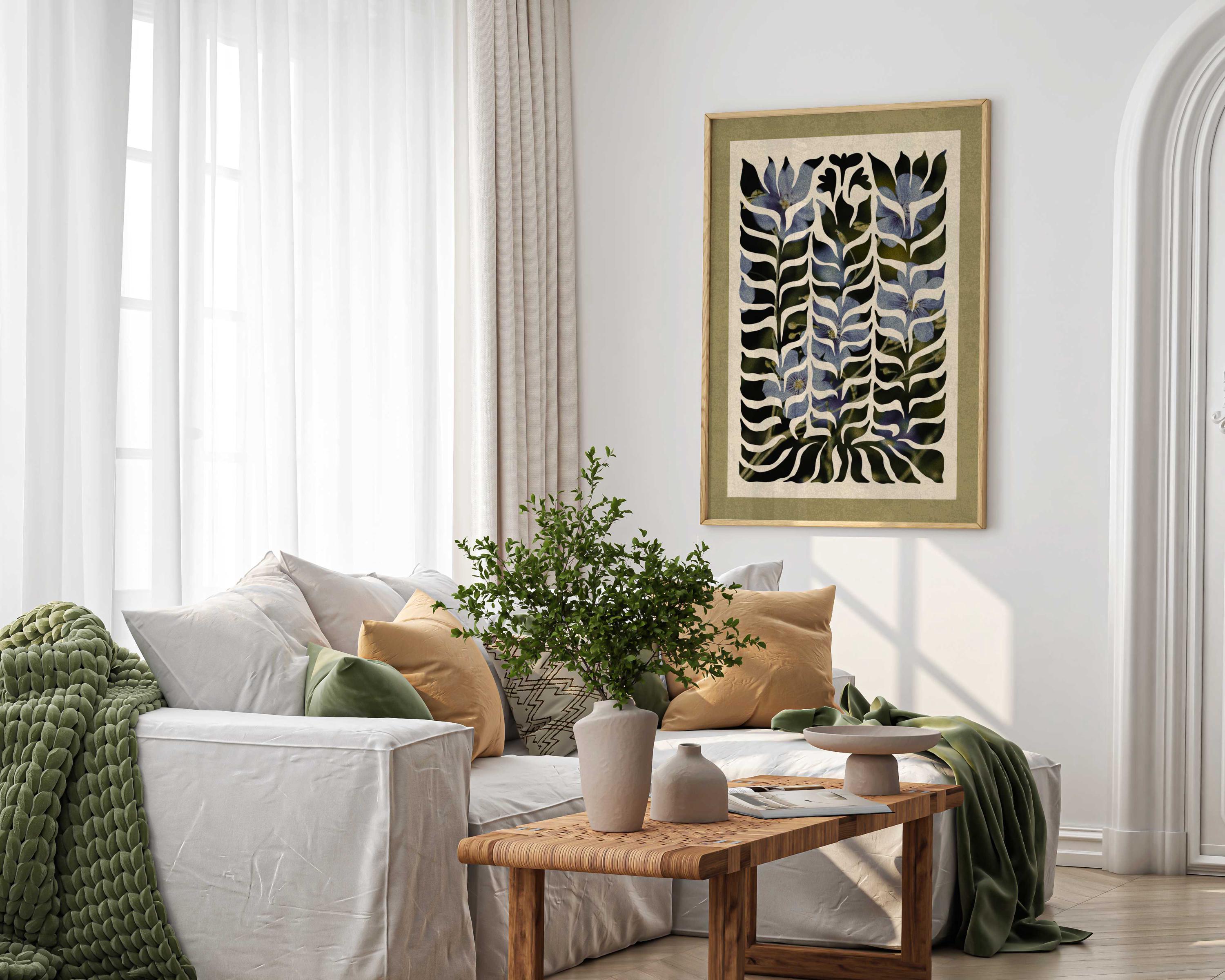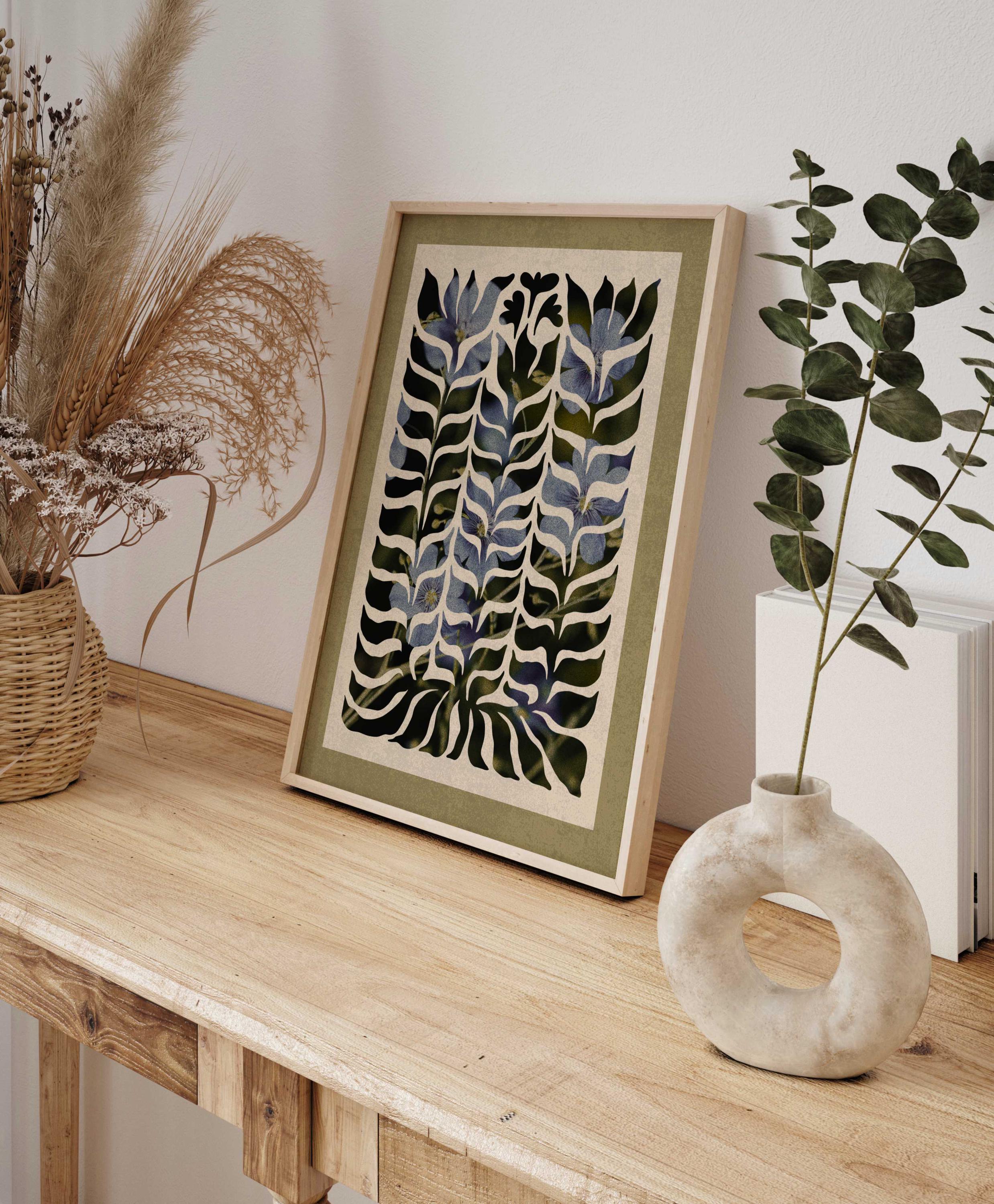 Abstract botanical wall art with soft blue florals beneath a flowing organic cutout, this artwork blends mid century shapes, retro design, and modern abstraction. Ideal for Scandinavian, mid century, or vintage-inspired interiors.