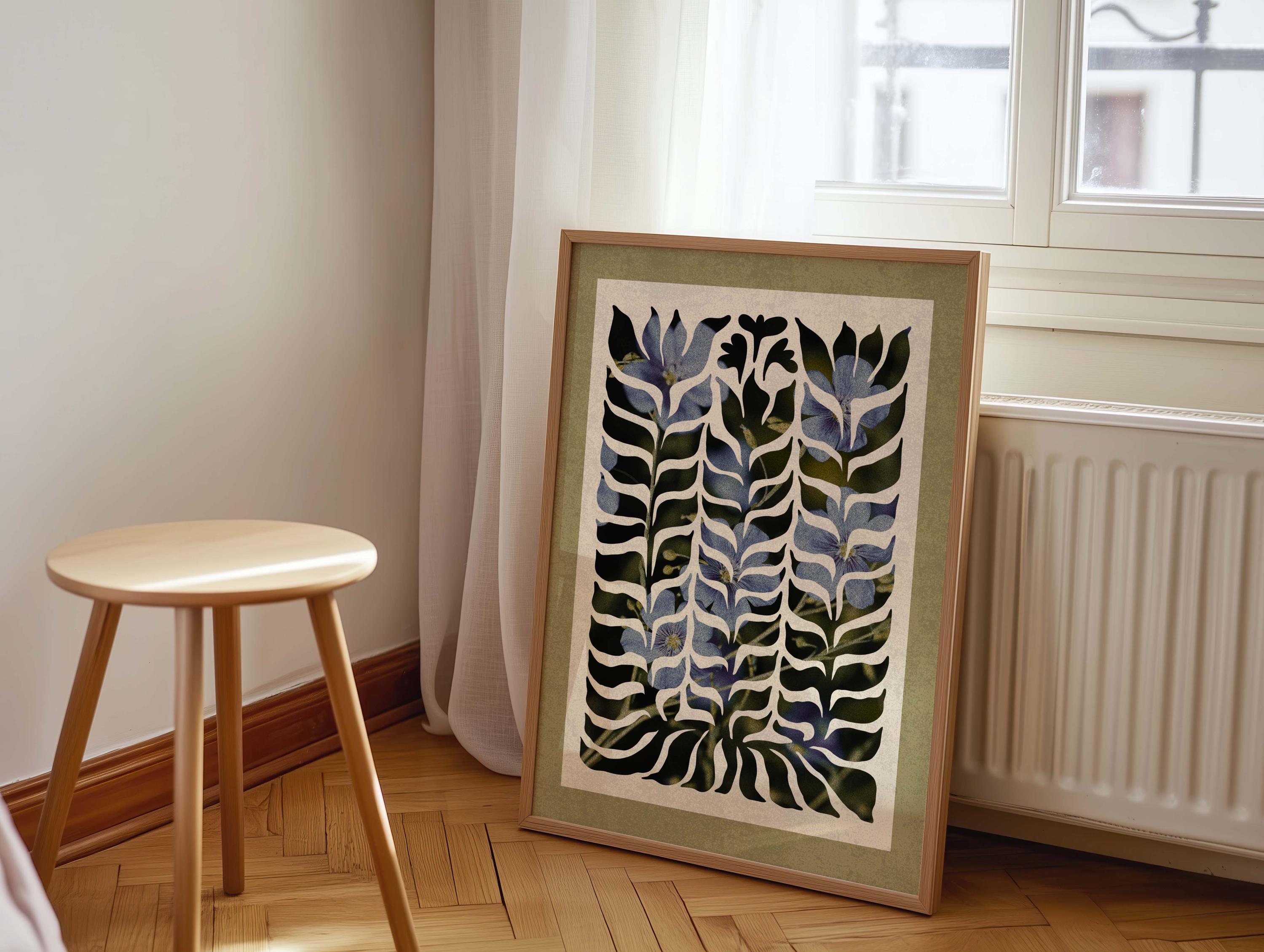 Abstract botanical wall art with soft blue florals beneath a flowing organic cutout, this artwork blends mid century shapes, retro design, and modern abstraction. Ideal for cozy, boho, vintage-inspired or nature-themed interiors.