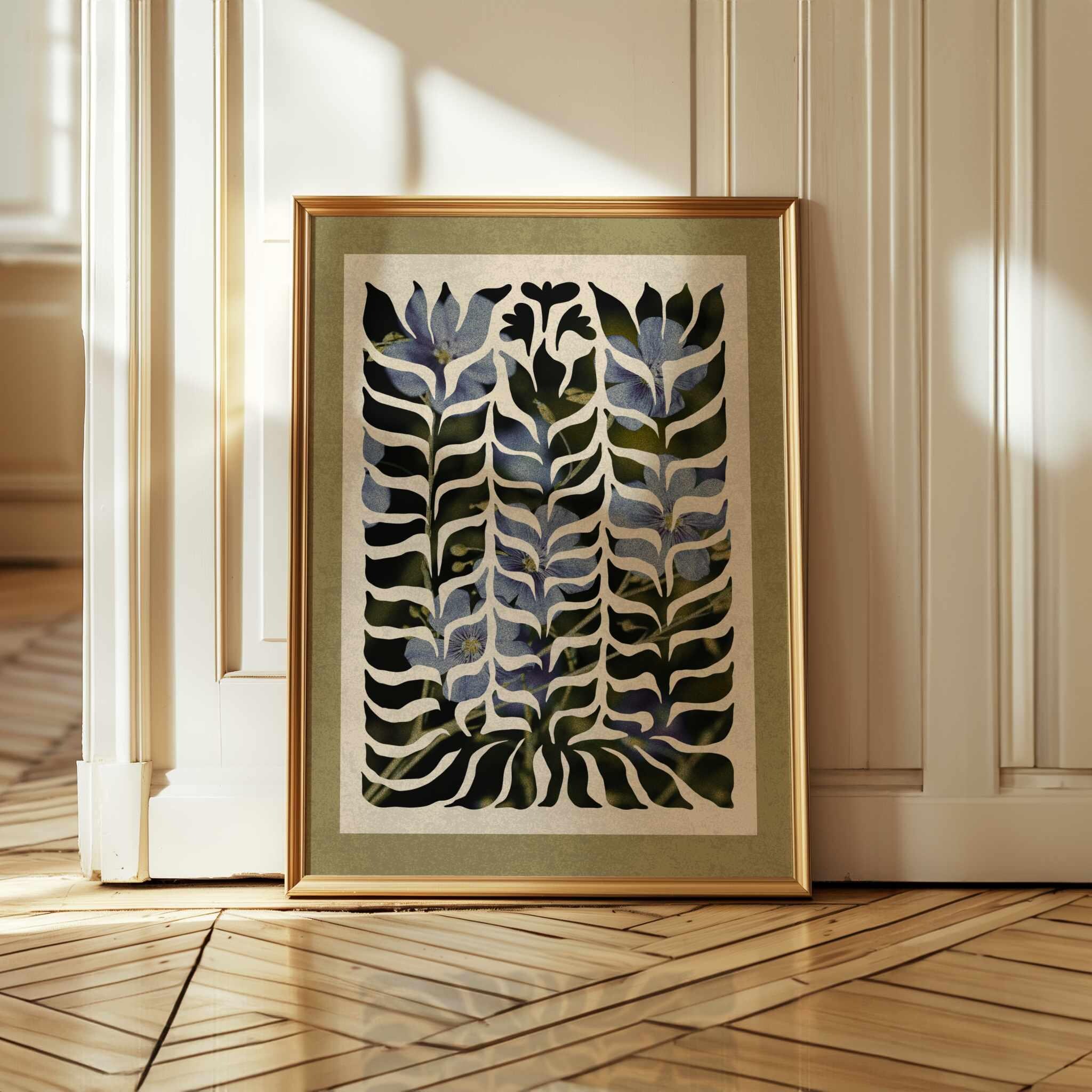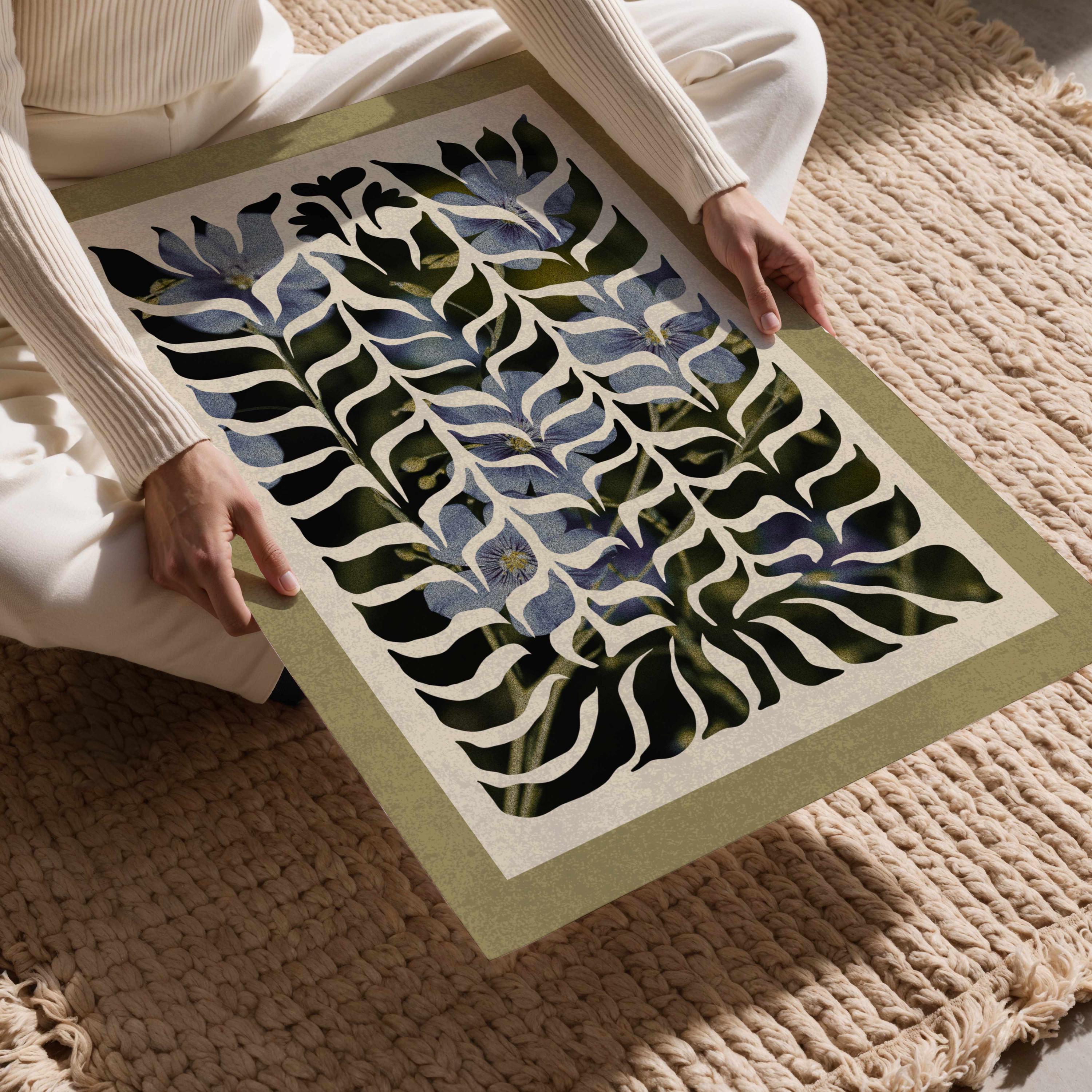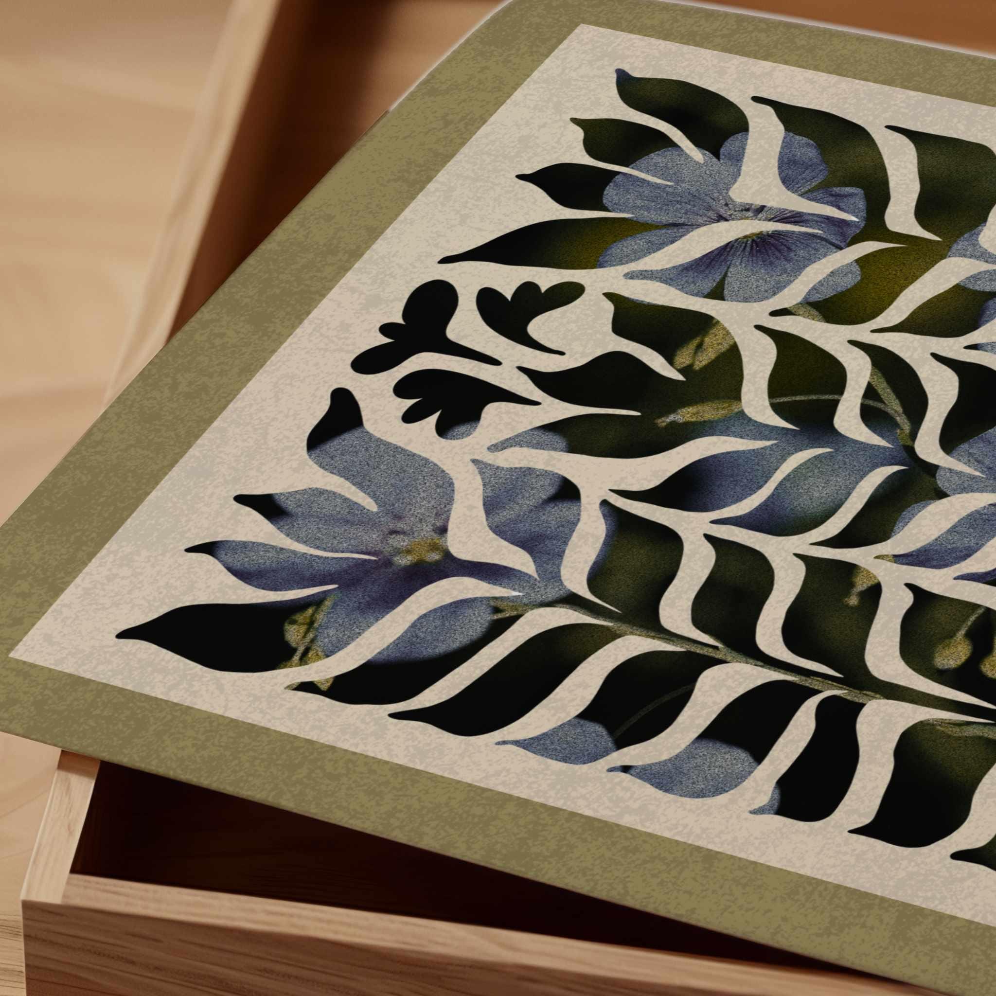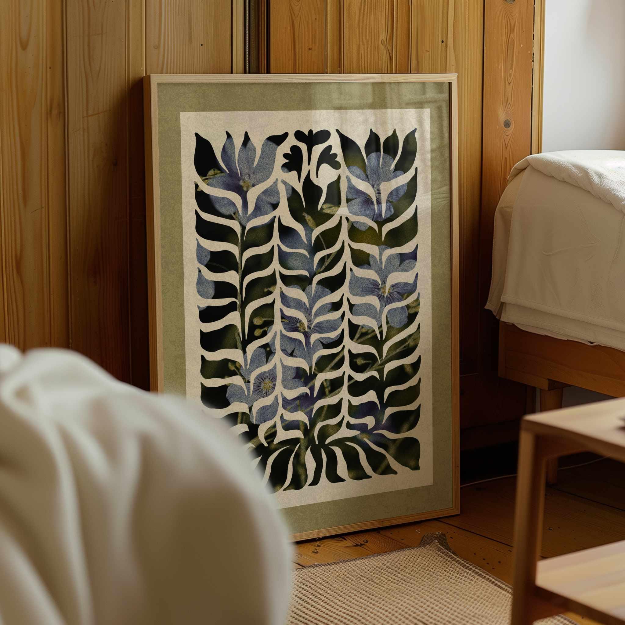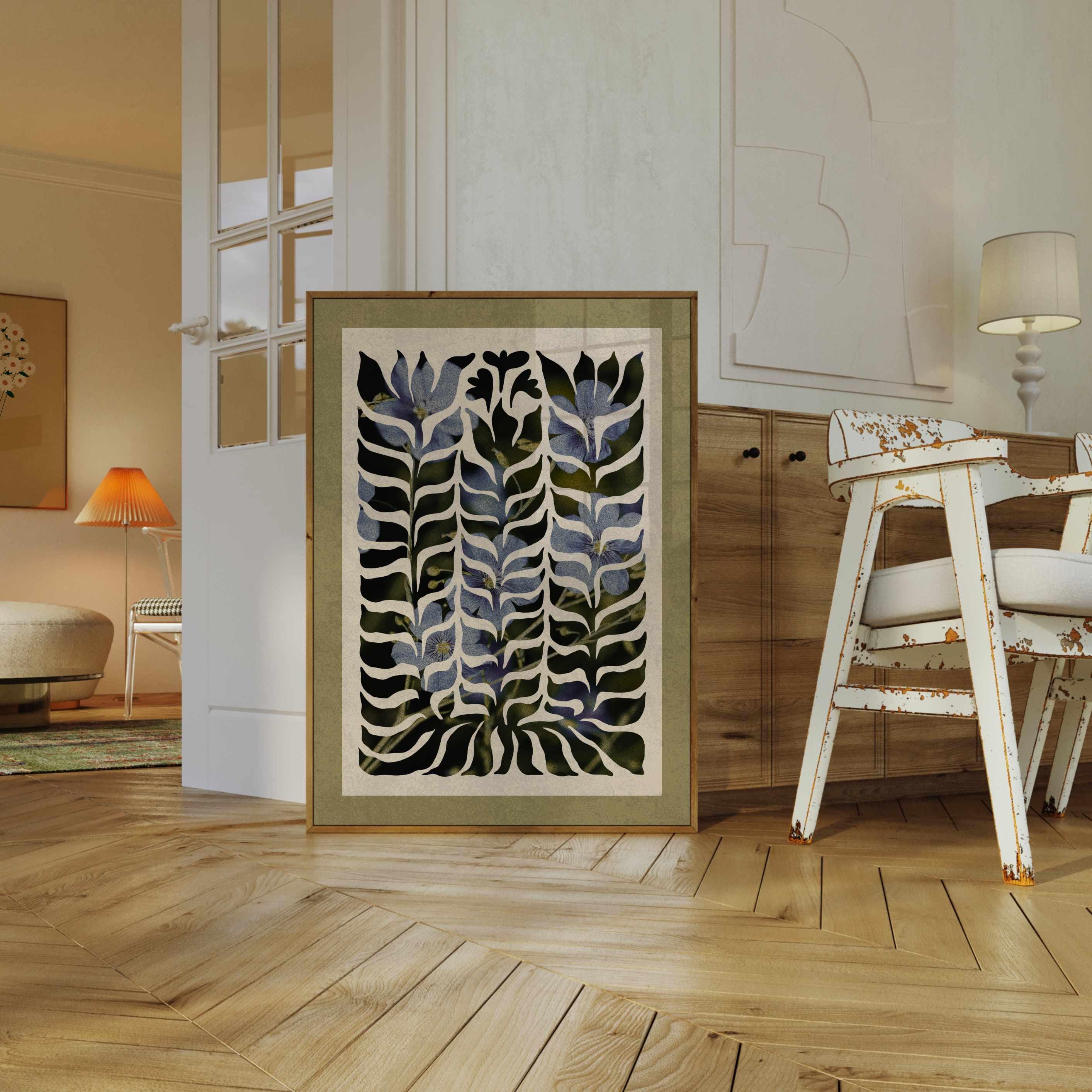 Abstract botanical wall art with soft blue florals beneath a flowing organic cutout, this artwork blends mid century shapes, retro design, and modern abstraction. Ideal for cozy, boho, vintage-inspired or nature-themed interiors.