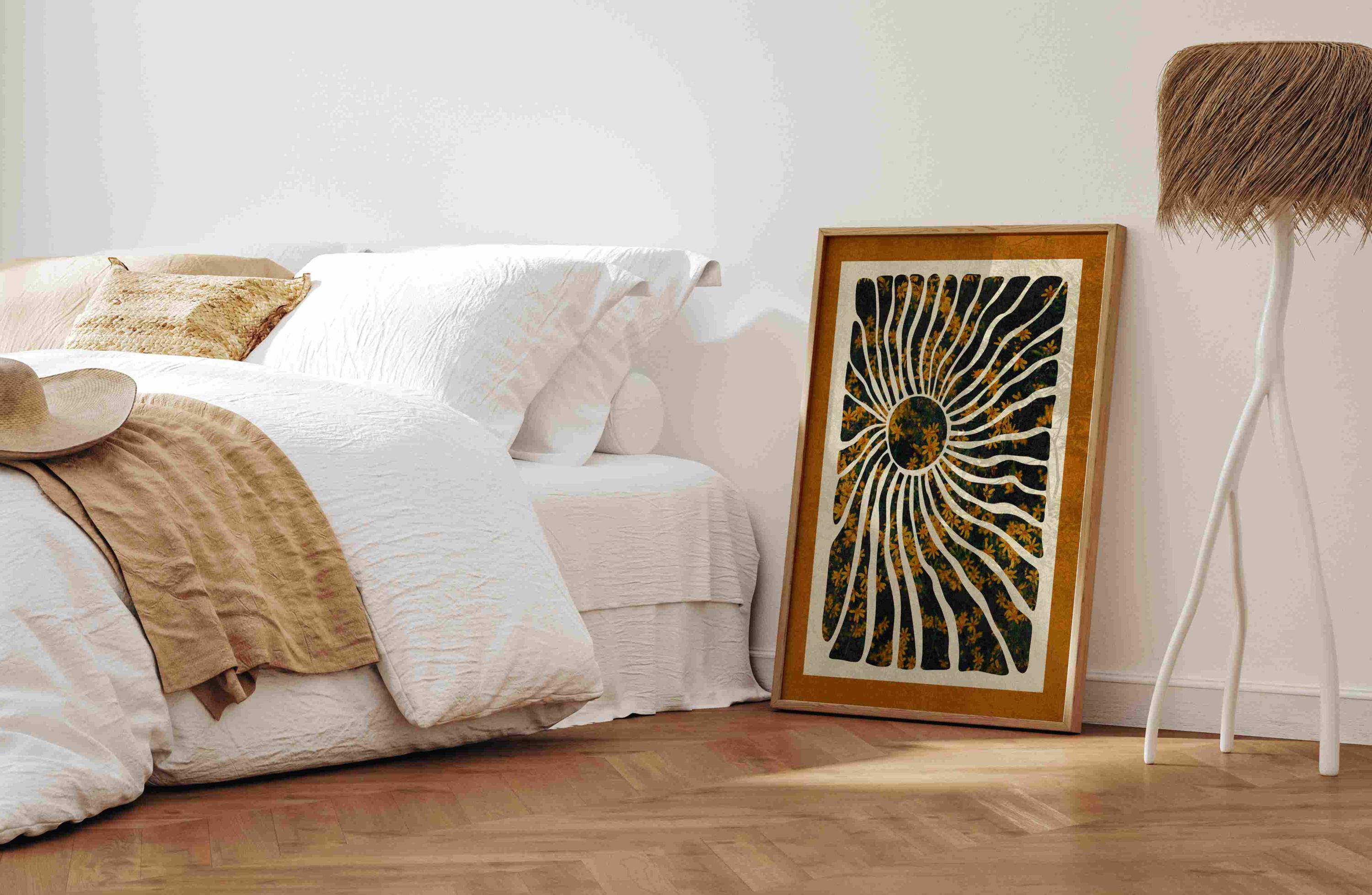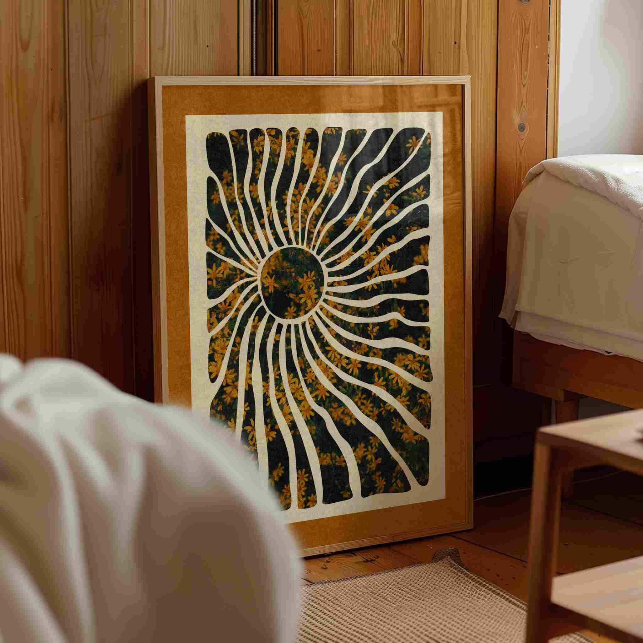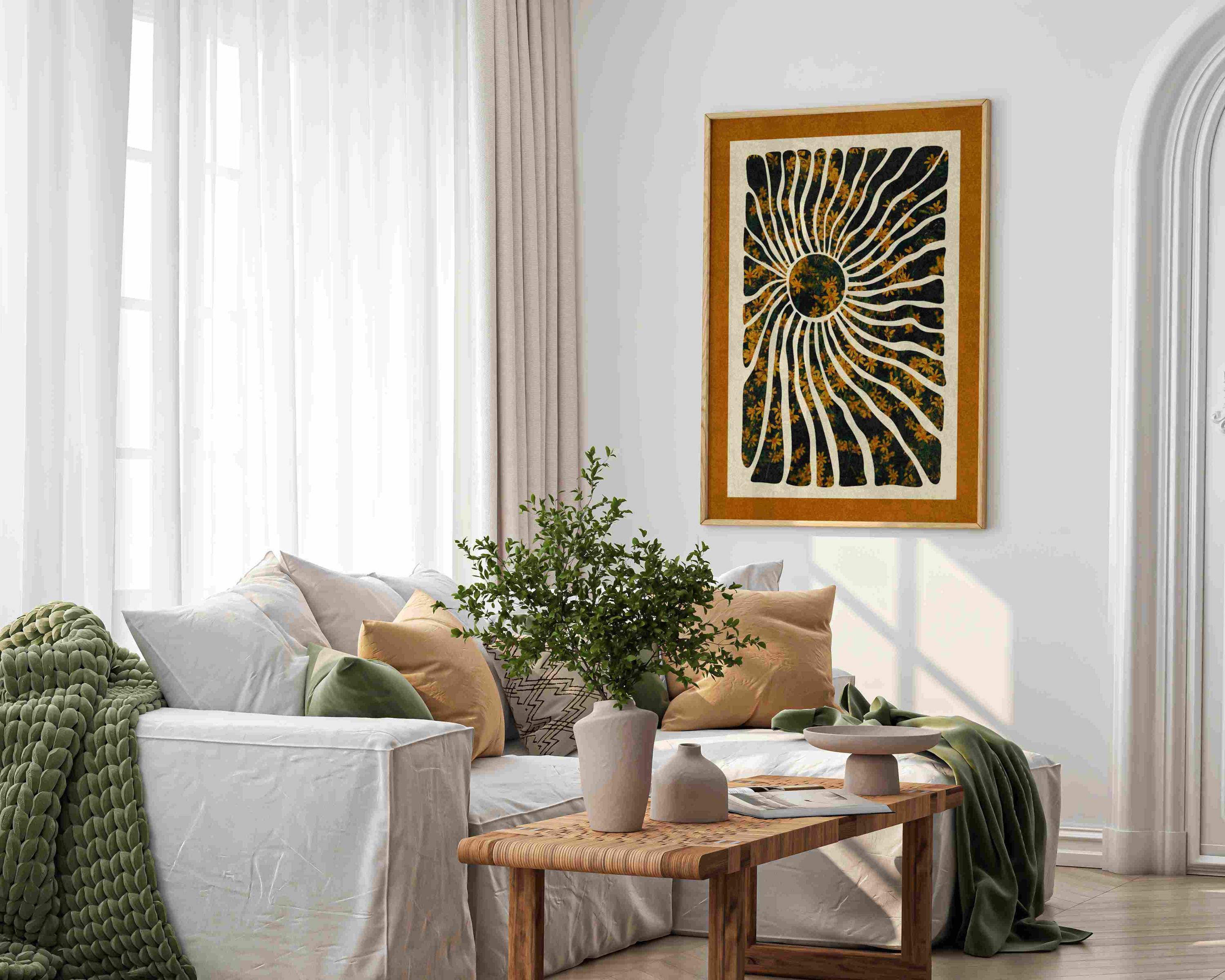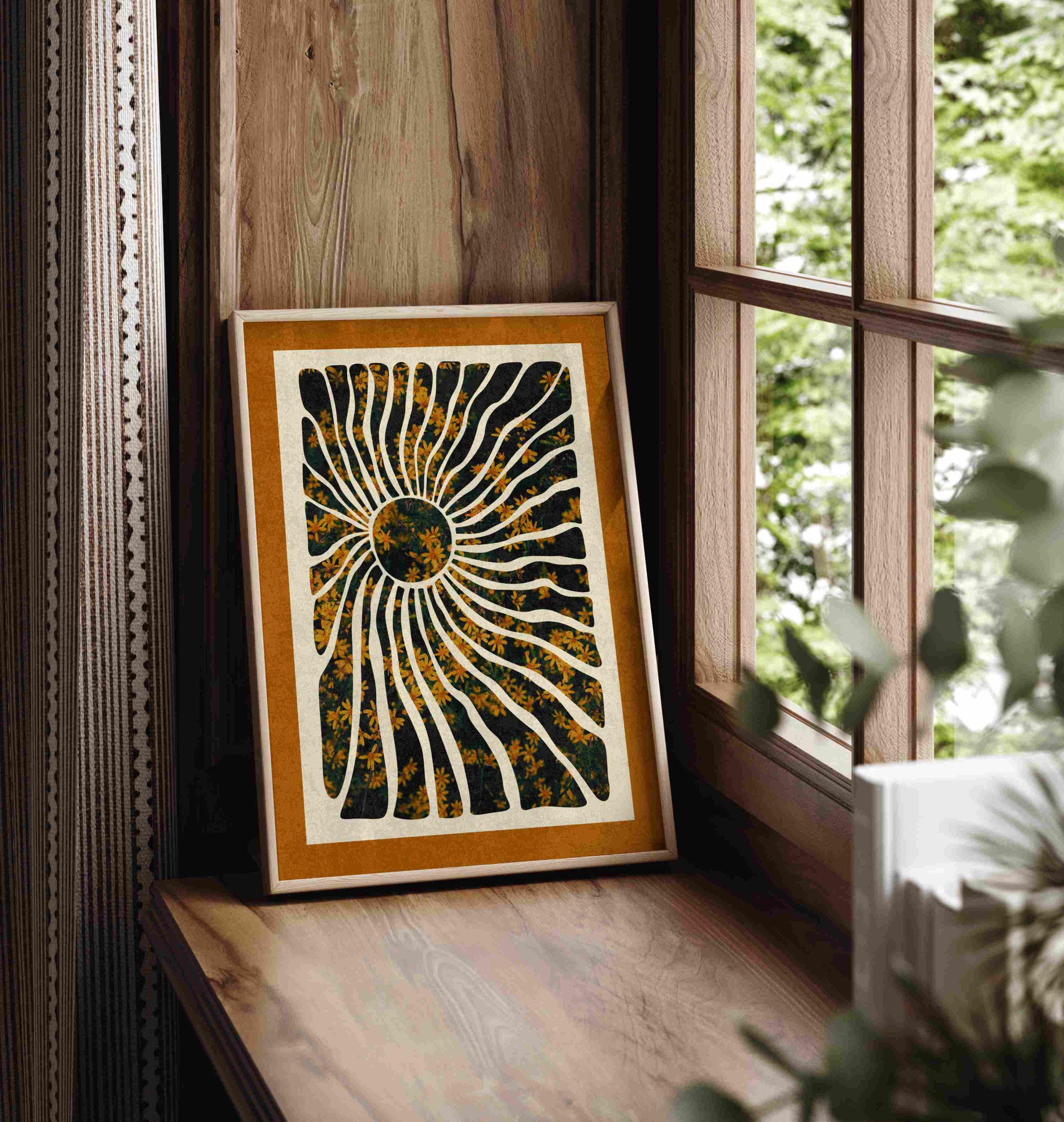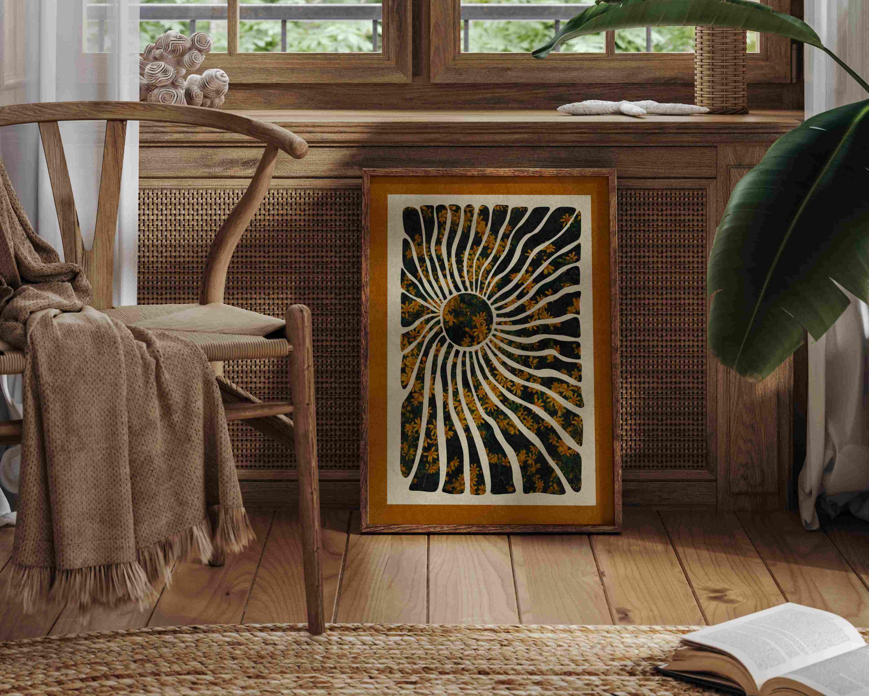 Abstract botanical print featuring soft organic plant shapes and a neutral retro floral design bordered with a warm orange mat. This artwork blends vintage-inspired aesthetics with a modern, boho home vibe, making it perfect for living rooms, bedrooms, offices, or gallery walls.