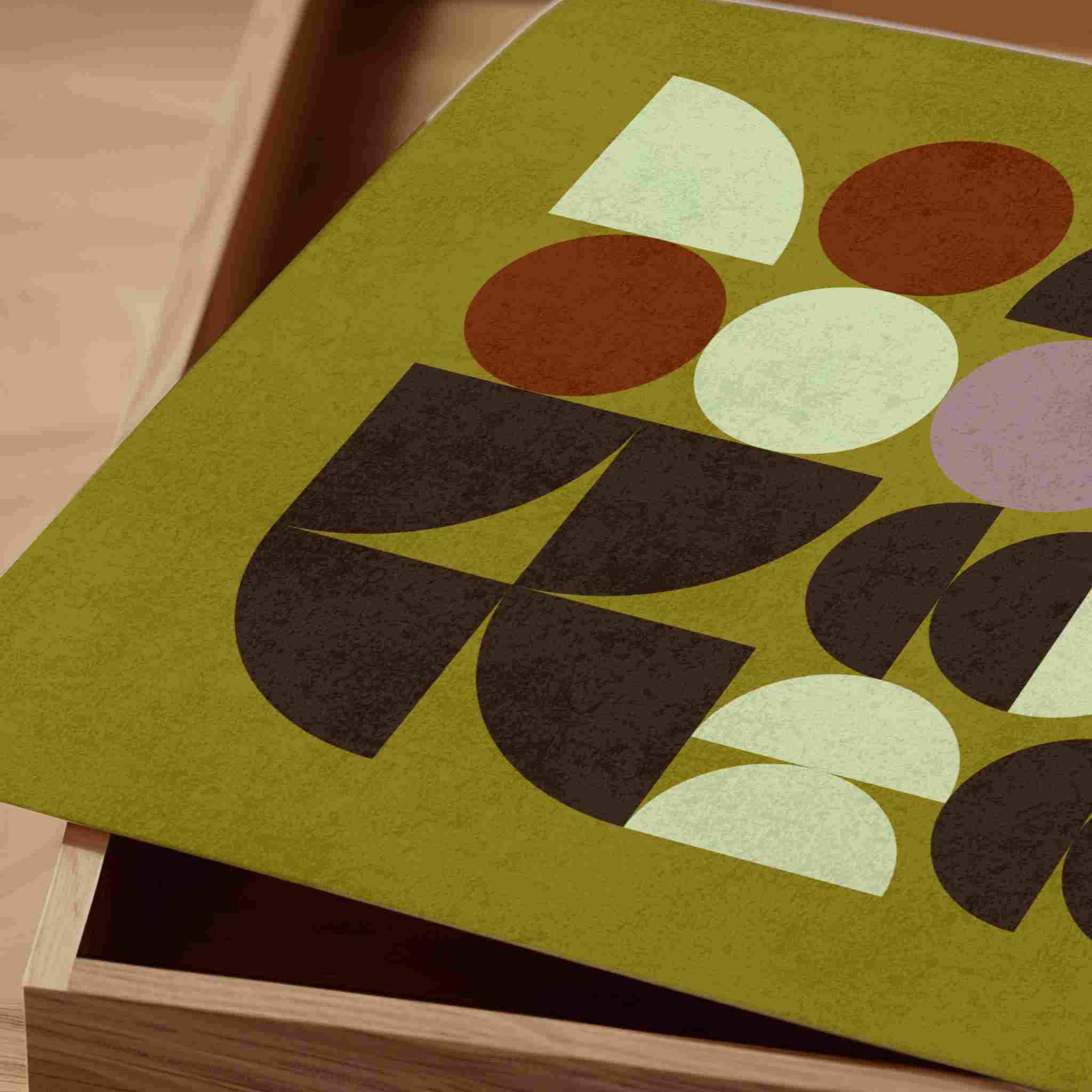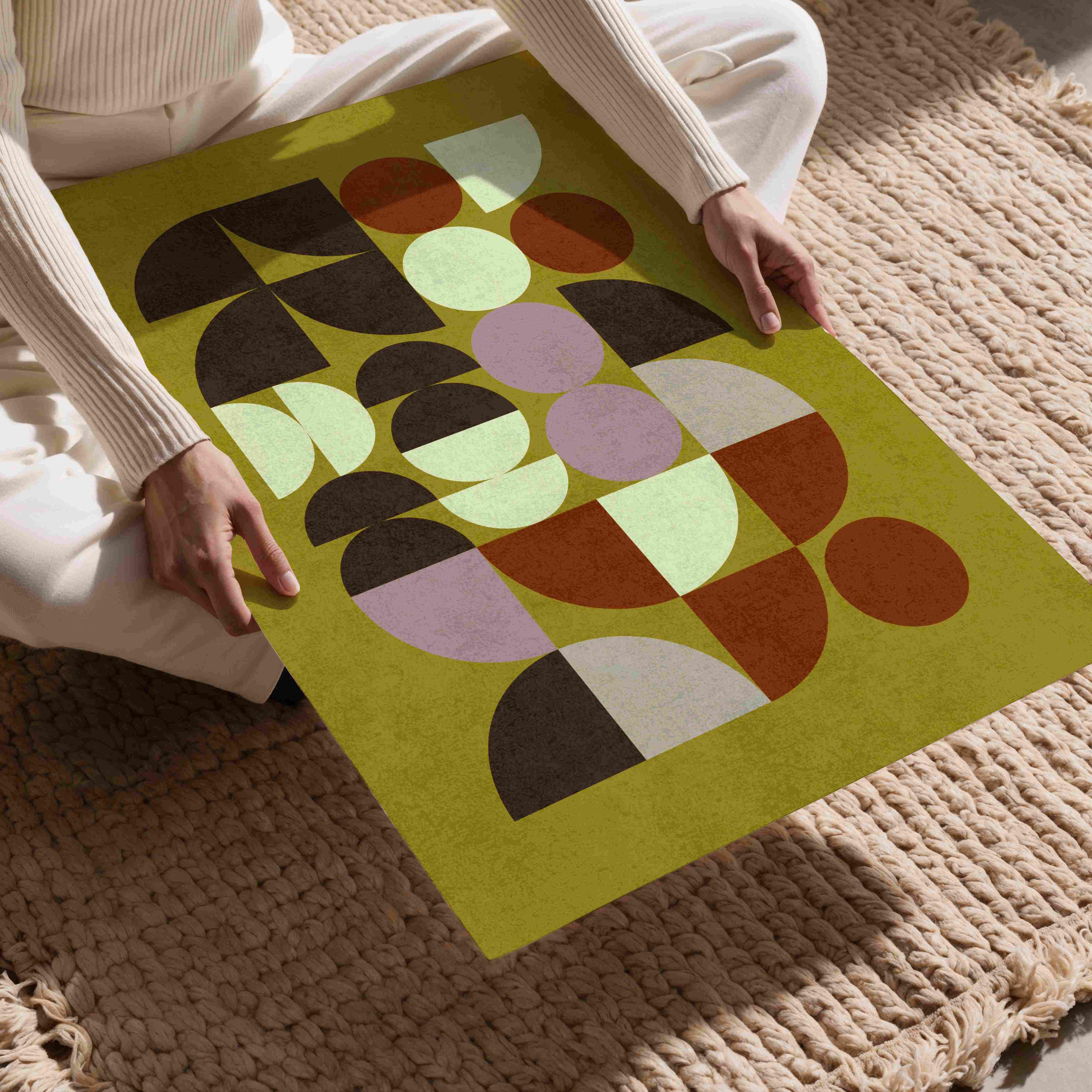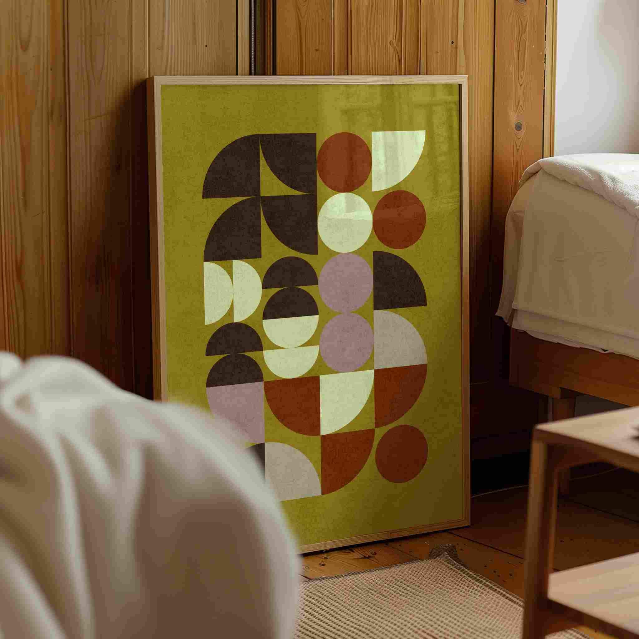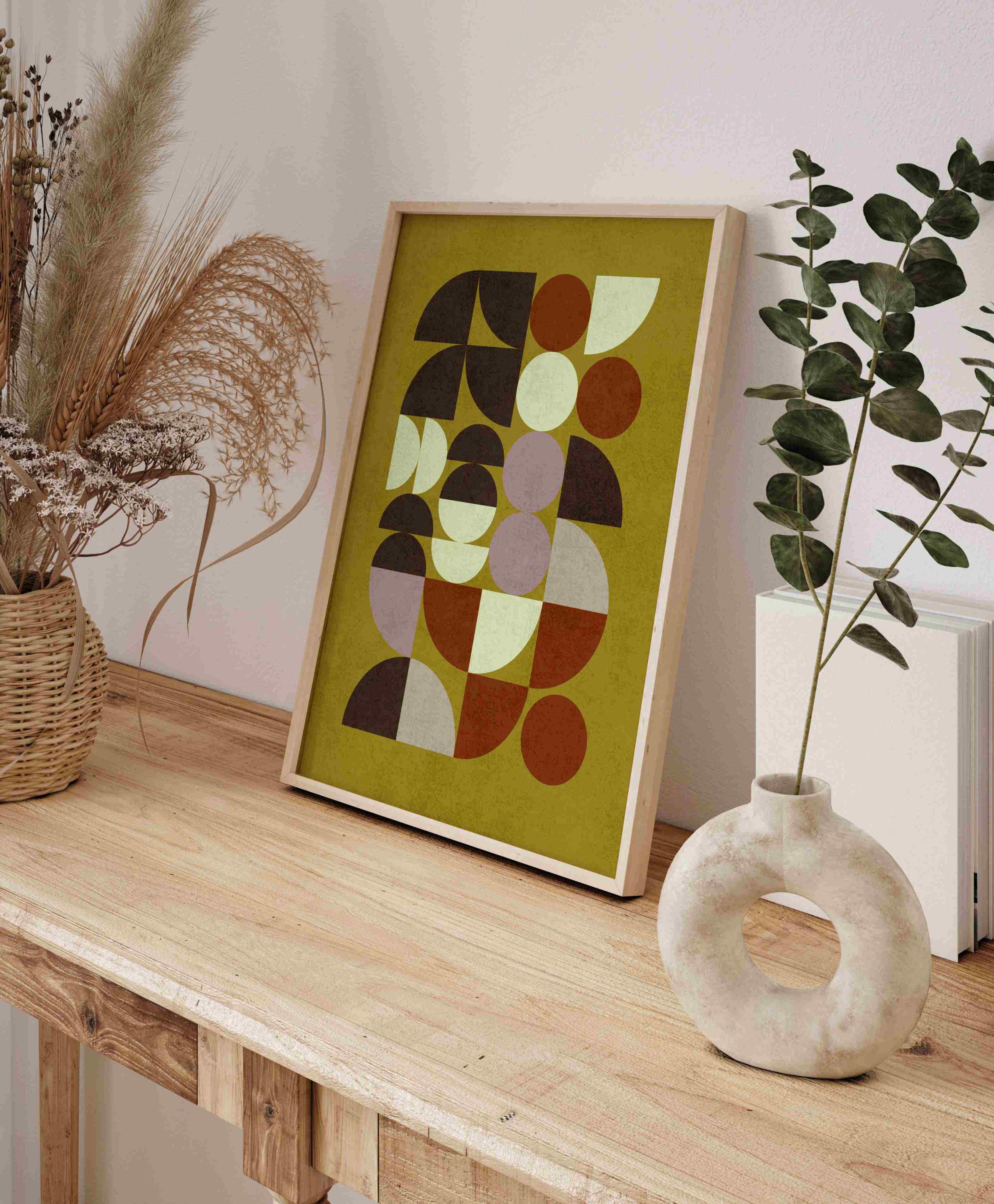 Abstract geometric art print featuring mid century modern shapes in funky colors. This bauhaus style print is perfect for enhancing any space, be it your living room, bedroom, office, dorm room, or anywhere else. It also makes a thoughtful and unique gift for your friend for a special event like Christmas, birthday, or housewarming.