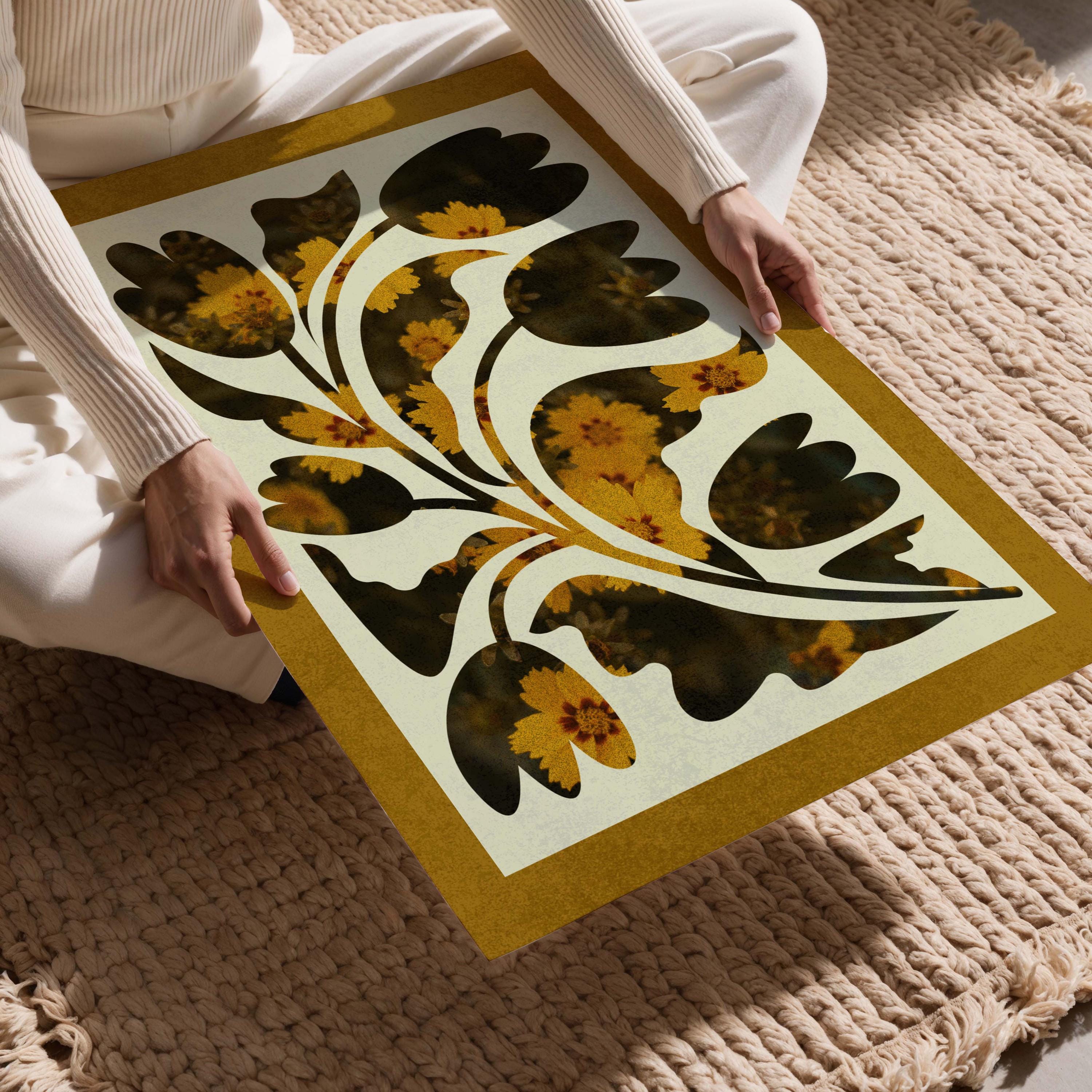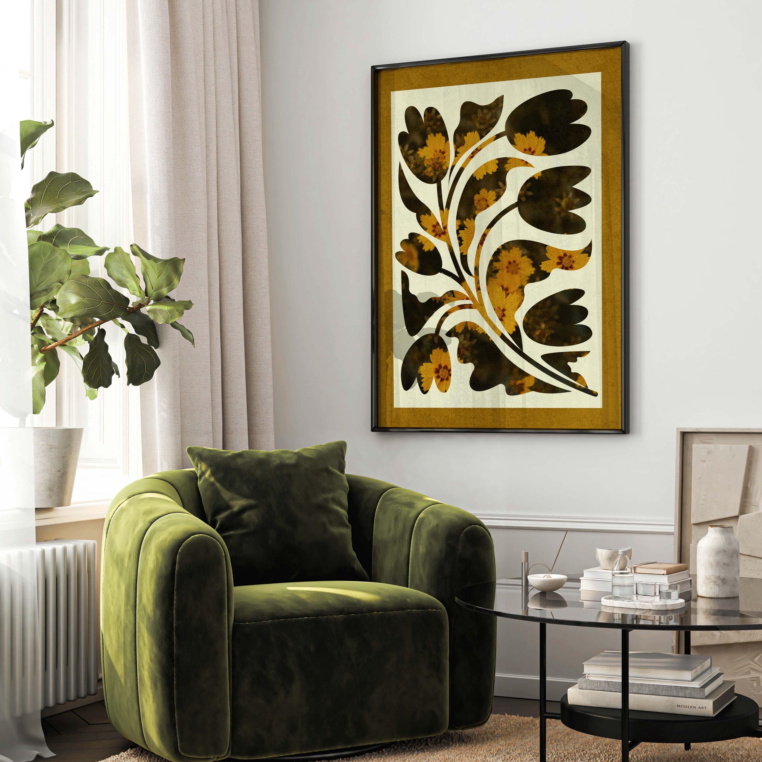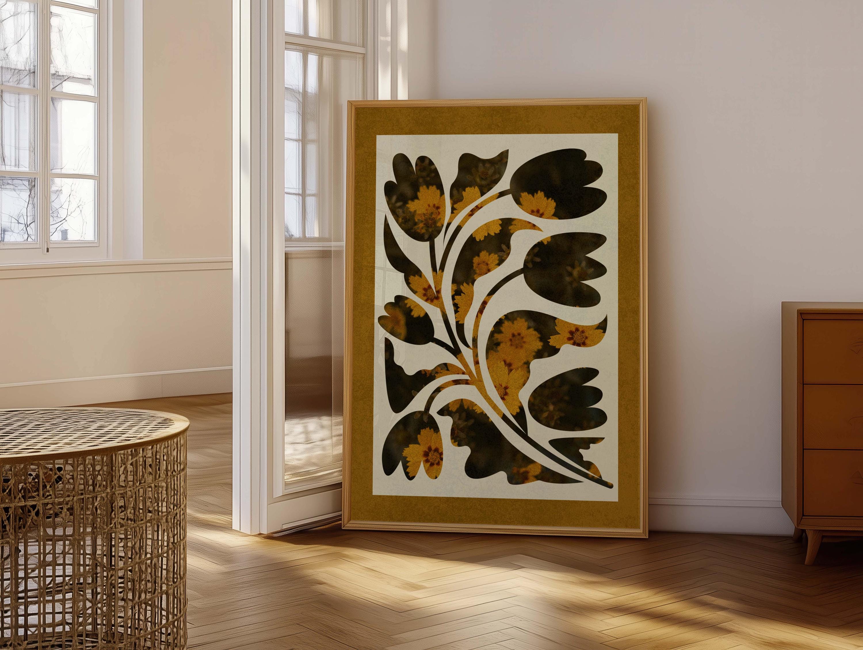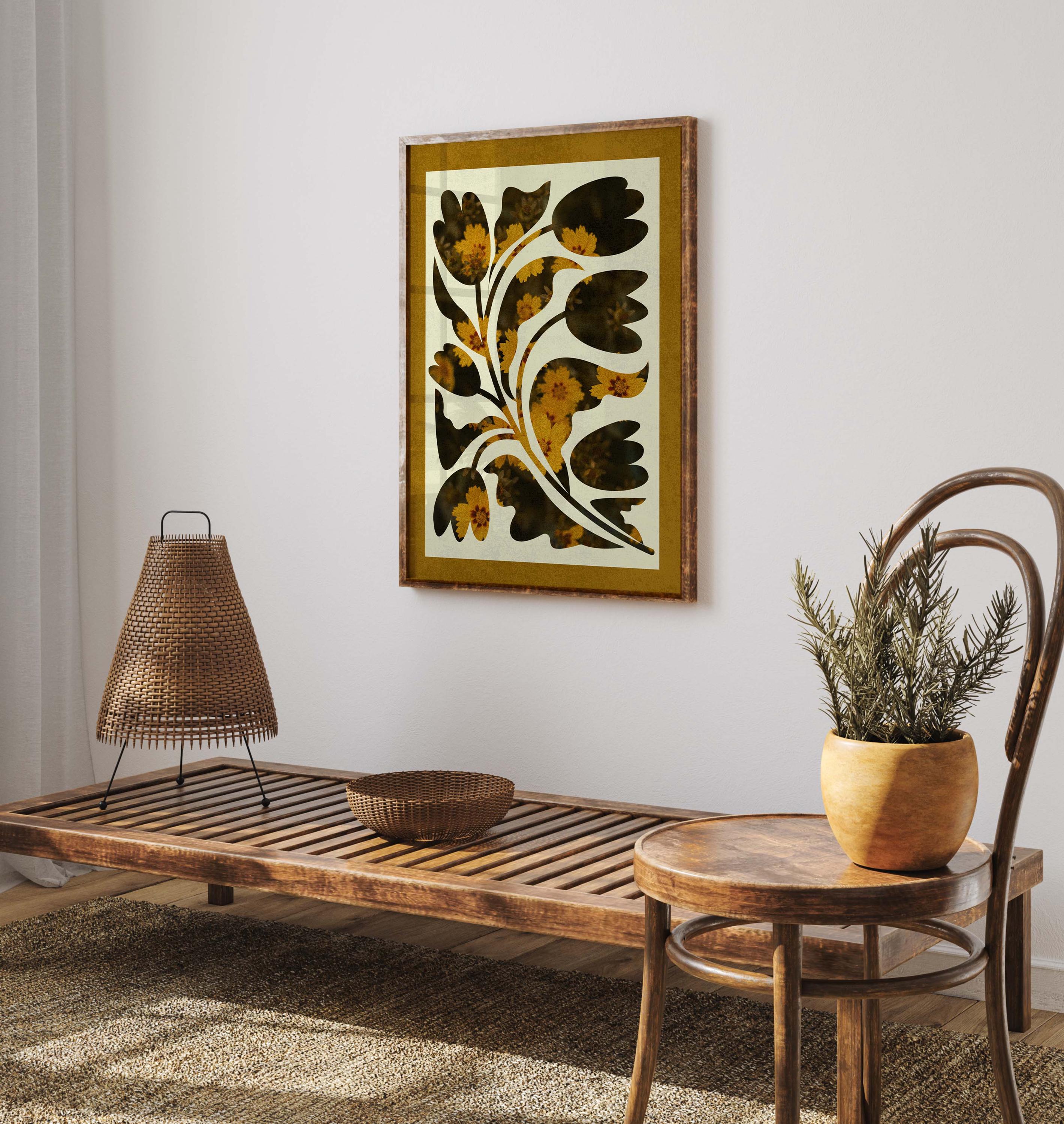 Abstract botanical print featuring soft organic plant shapes and a neutral retro floral design bordered with a mustard yellow mat. This artwork blends vintage-inspired aesthetics with a modern, boho home vibe, making it perfect for living rooms, bedrooms, offices, or gallery walls.