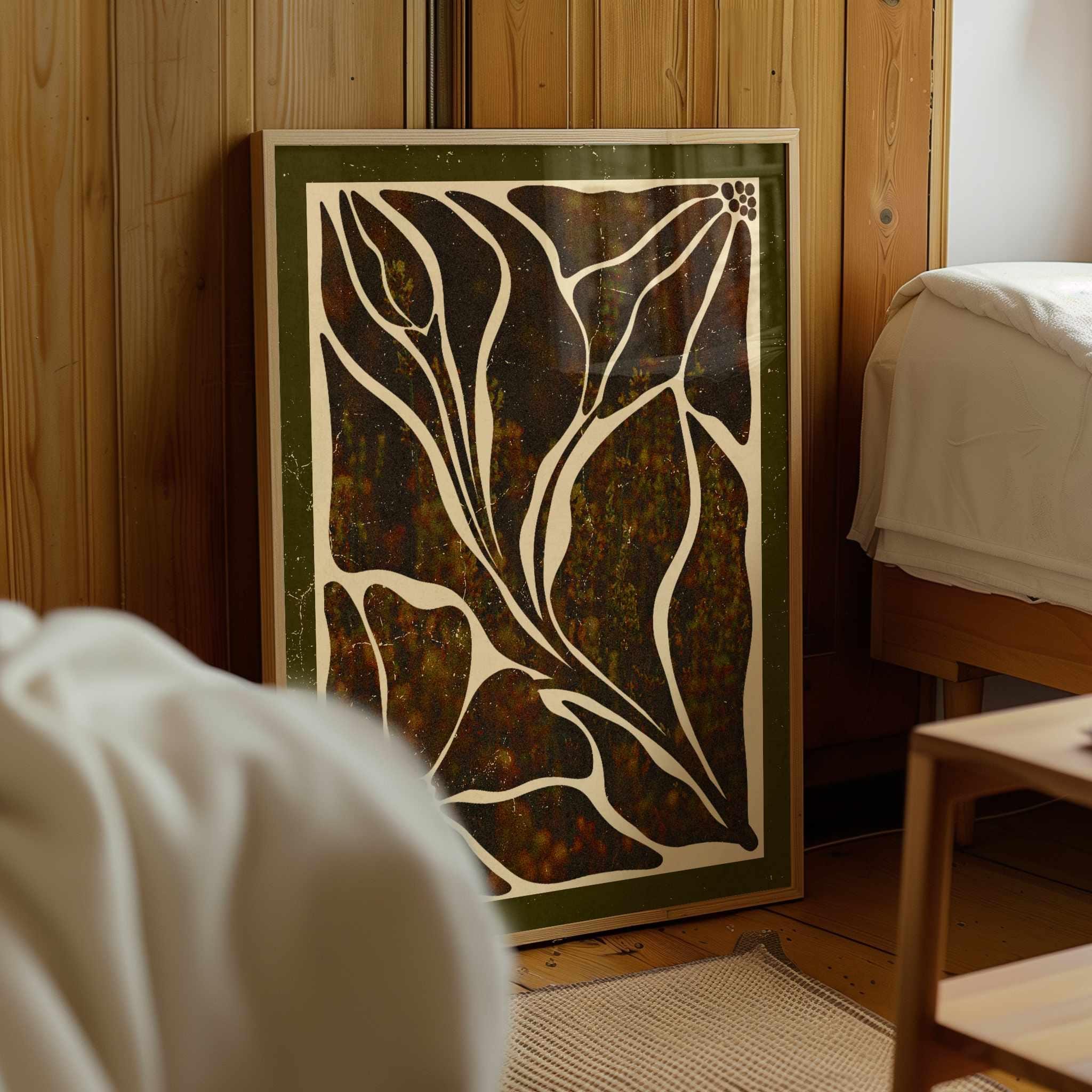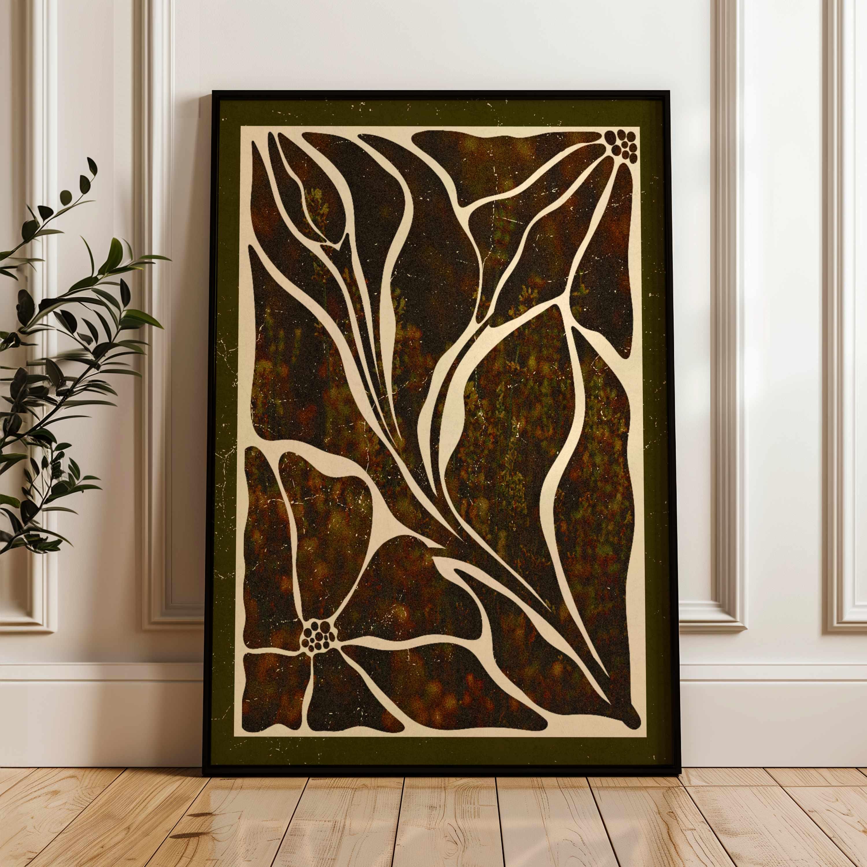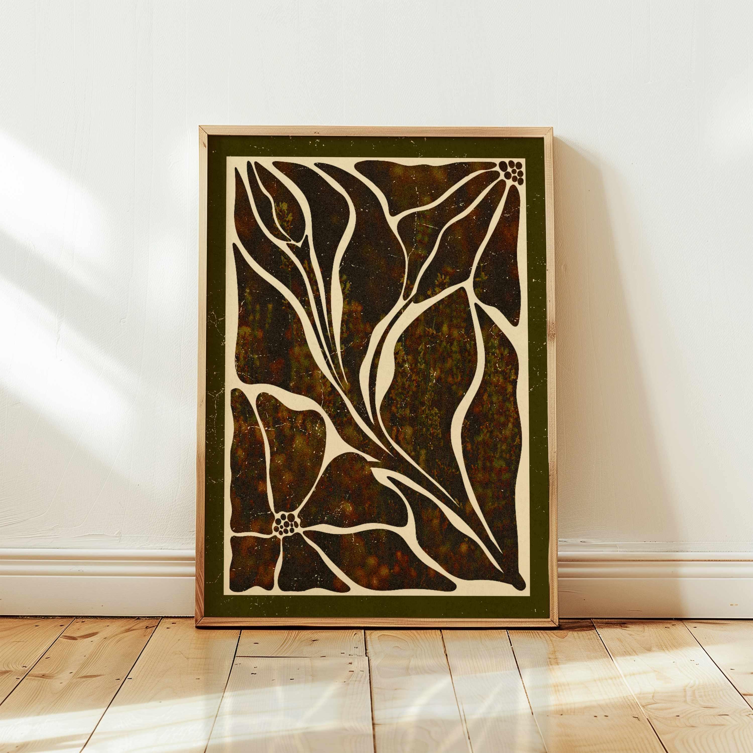 Abstract botanical art print featuring Matisse-inspired floral shapes in rich earthy tones and bordered with a dark olive mat. This piece blends vintage botanical design, mid-century organic shapes, and a warm, autumn palette. Ideal for bedrooms, living rooms, or gallery walls.