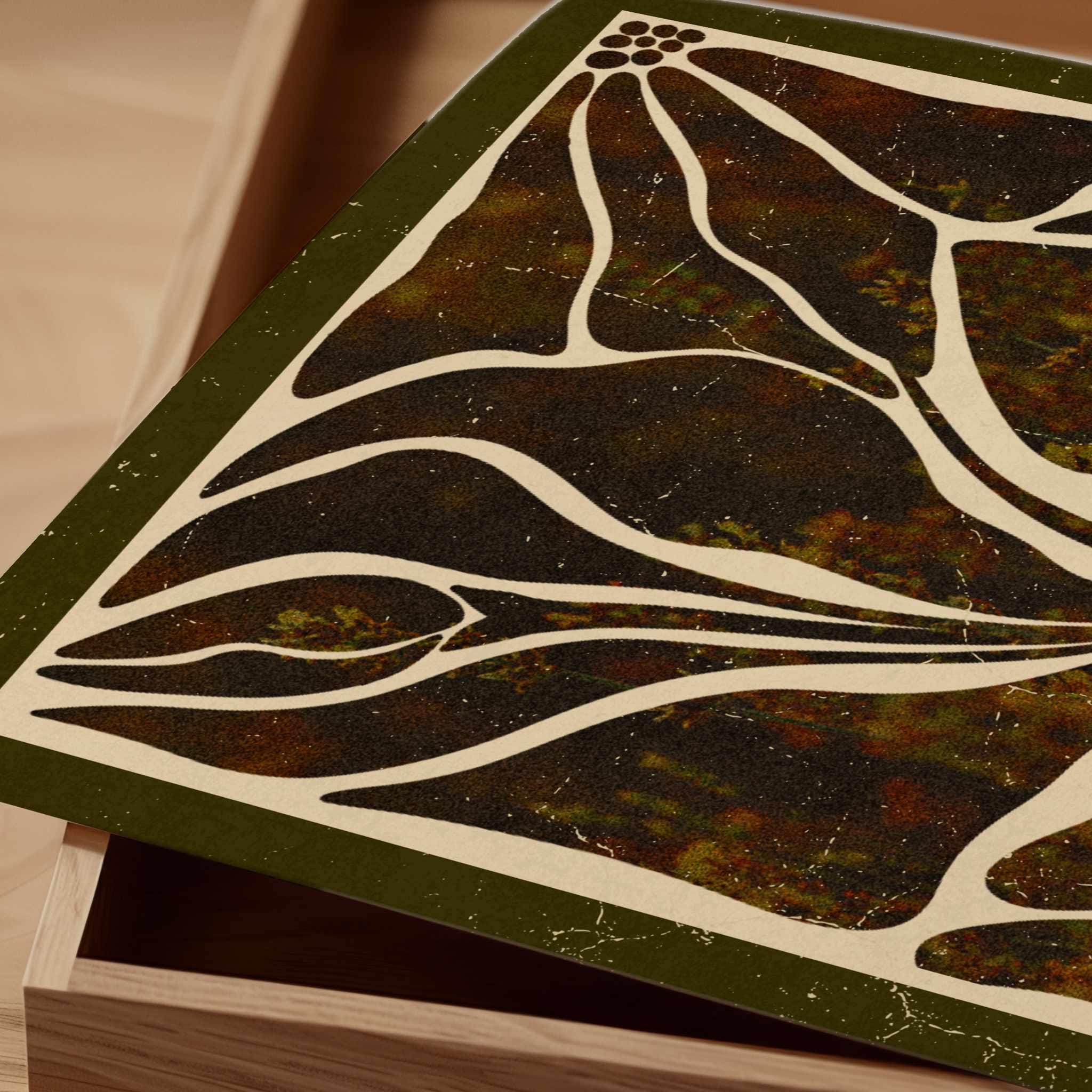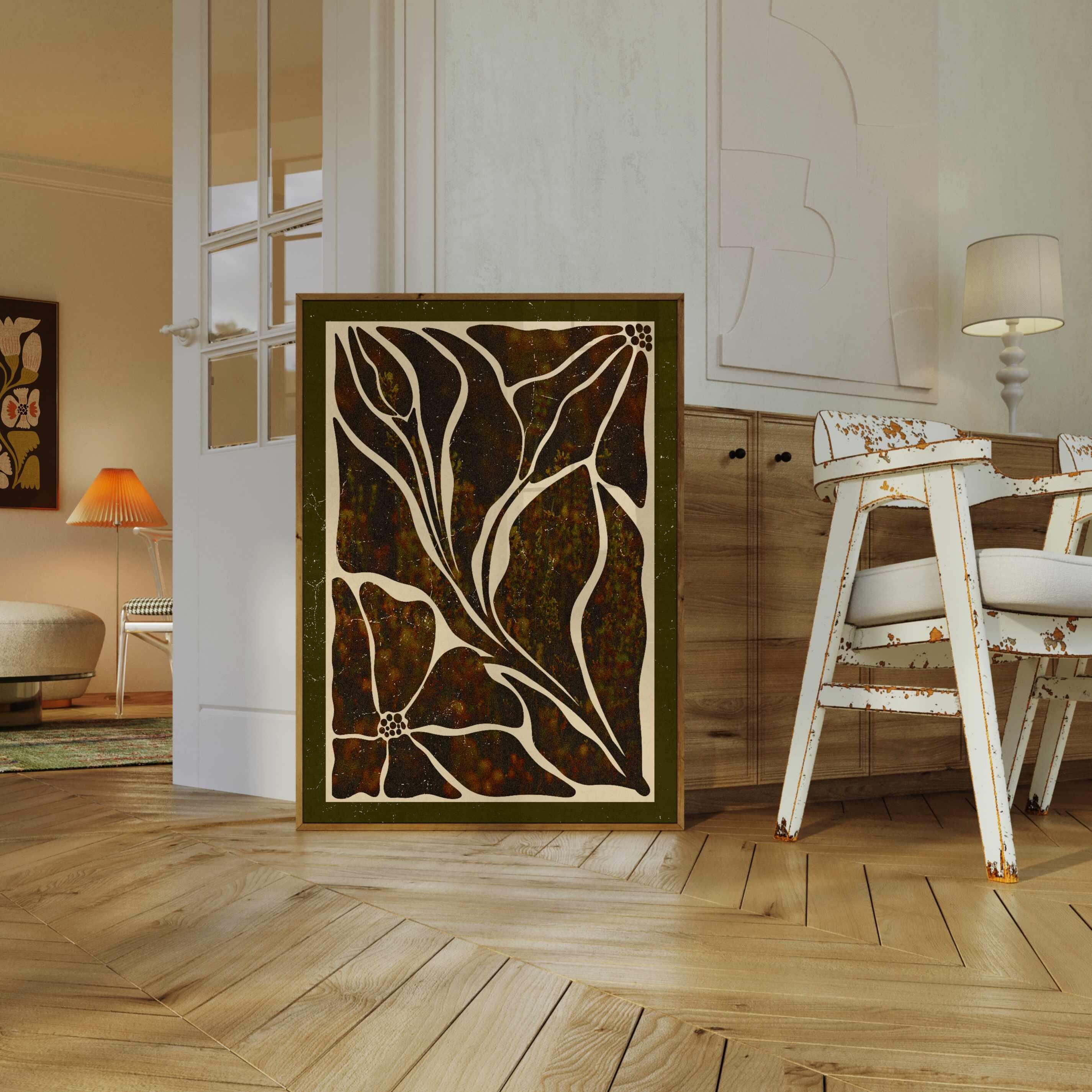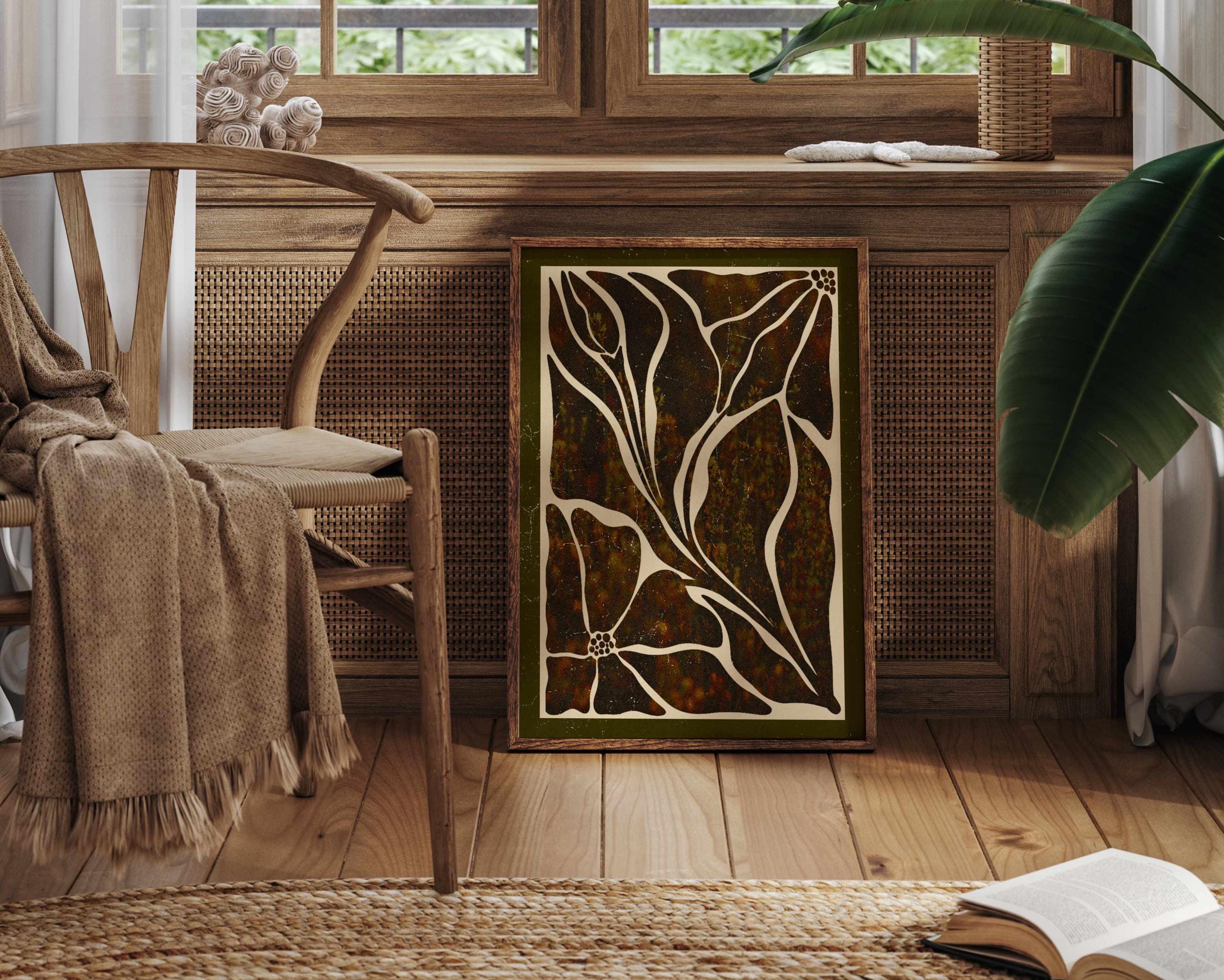 Abstract botanical art print featuring Matisse-inspired floral shapes in rich earthy tones and bordered with a dark olive mat. This piece blends vintage botanical design, mid-century organic shapes, and a warm, autumn palette. Ideal for bedrooms, living rooms, or gallery walls.