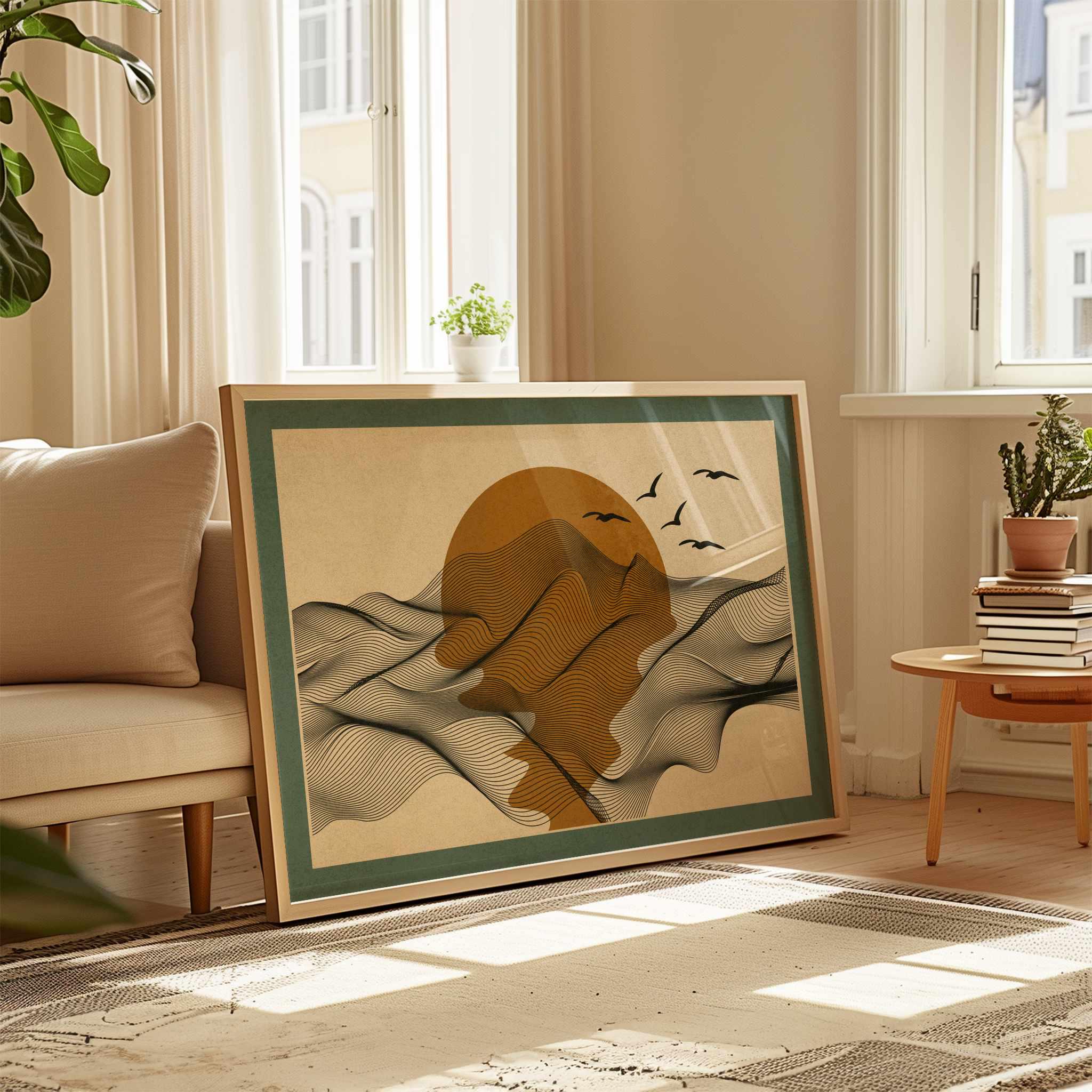 A minimalist sunset over gentle ocean waves - designed in abstract lines and calming tones. This piece blends Japandi simplicity with a warm, mid-century feel. It’s quiet and grounding, made for anywhere that could use a soft, peaceful view, be it your living room, bedroom, nursery, office, or anywhere else.