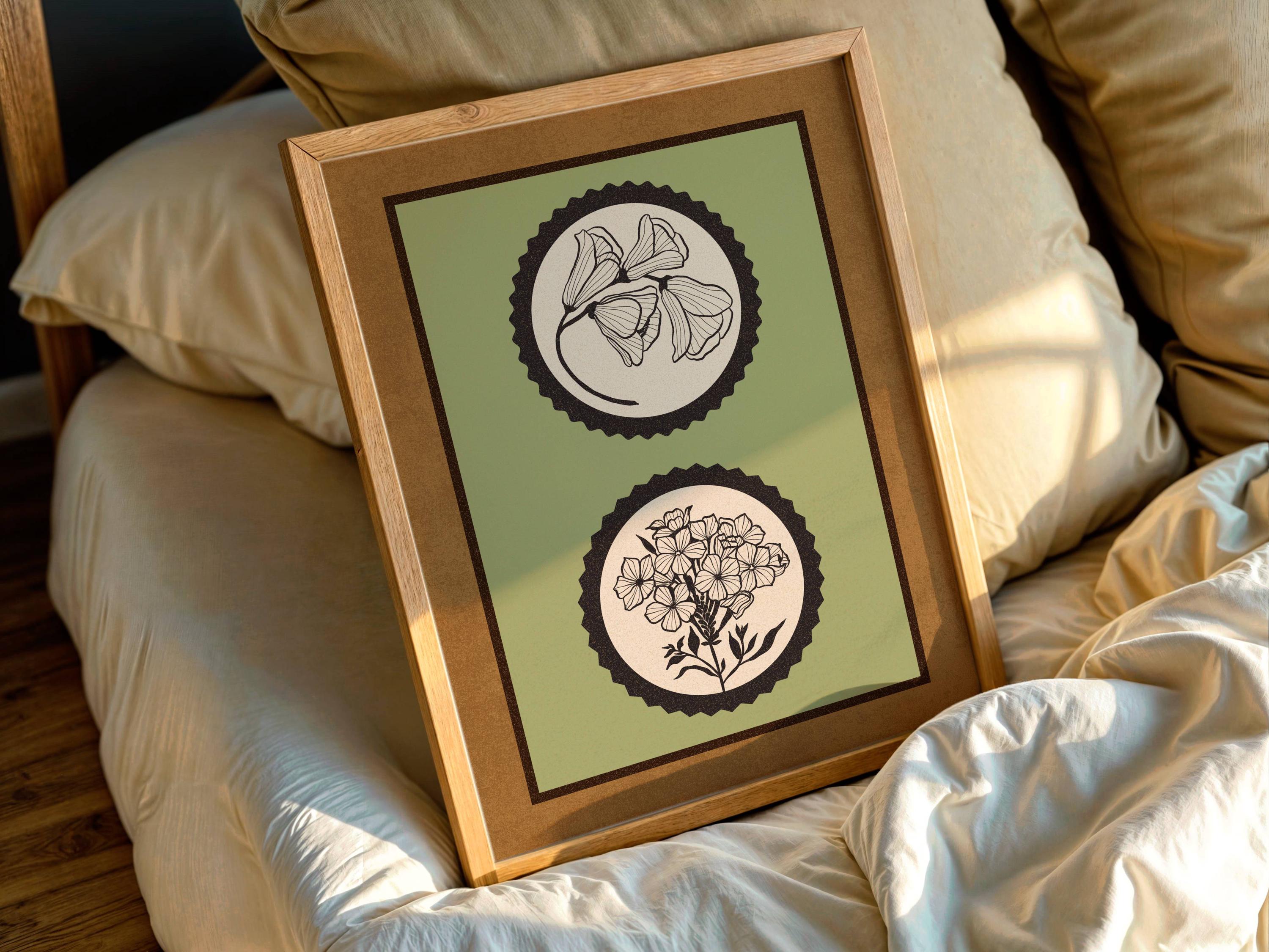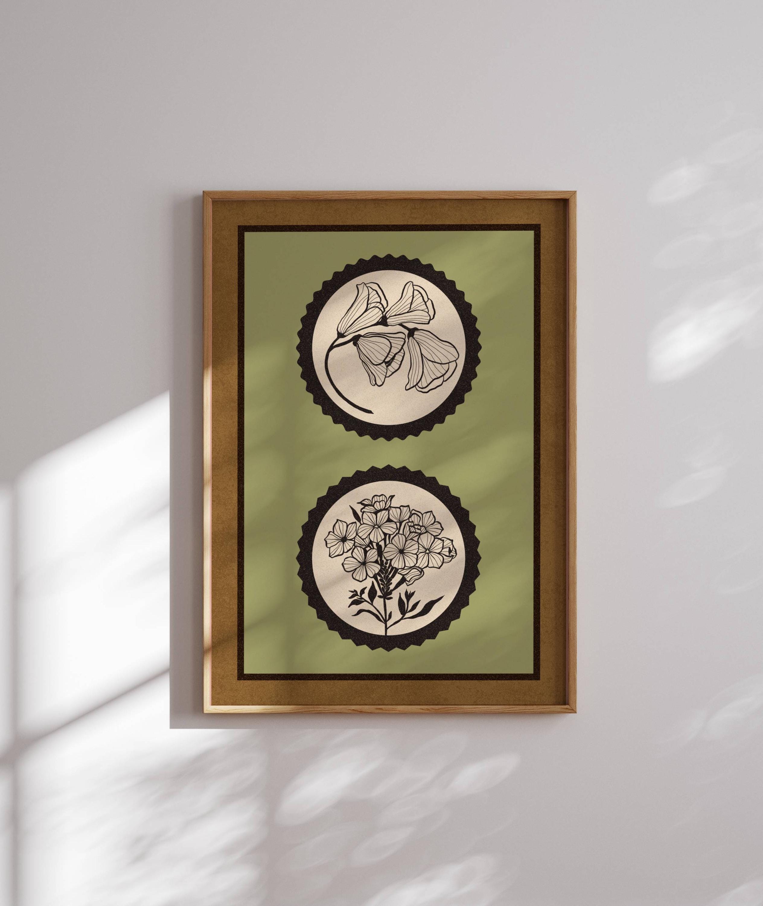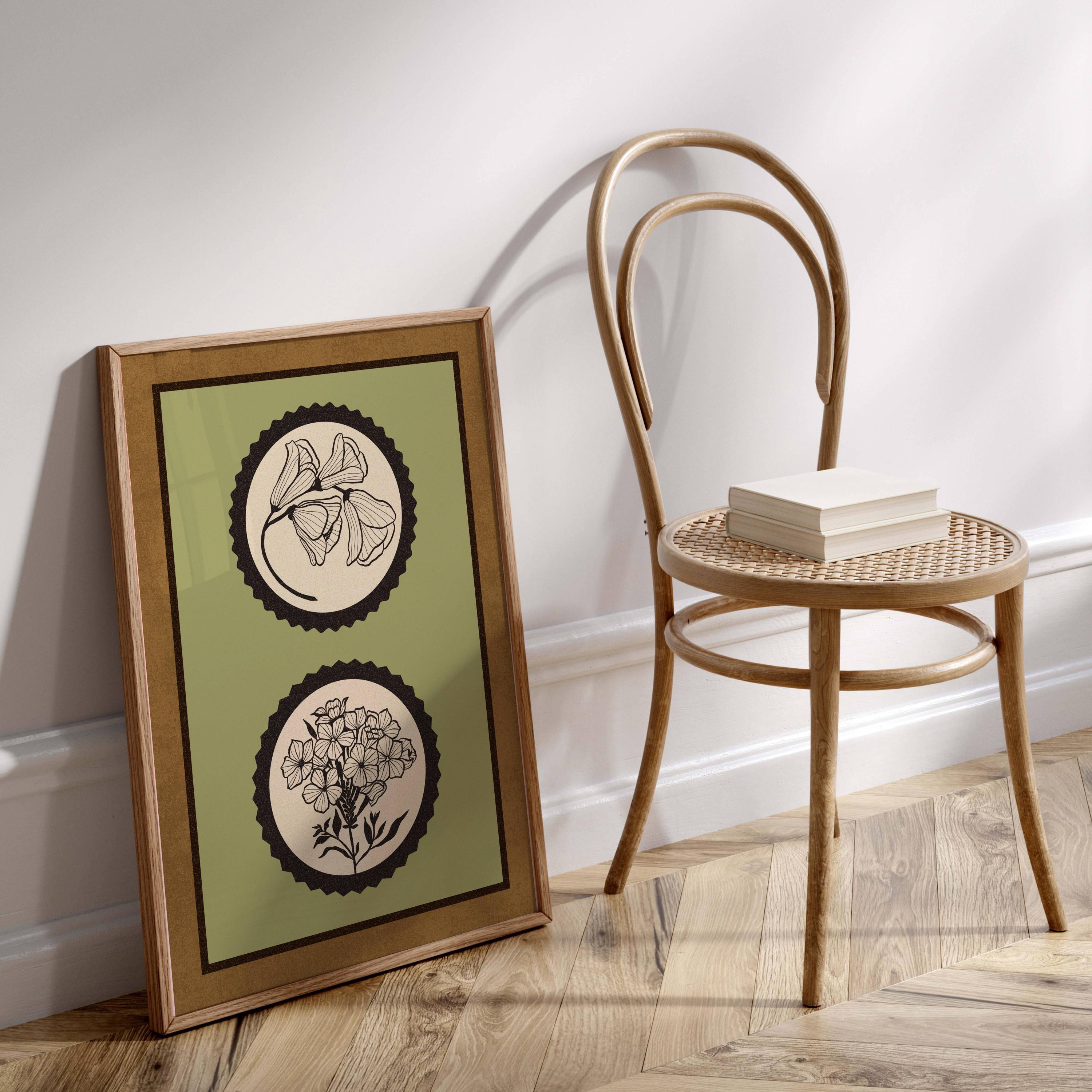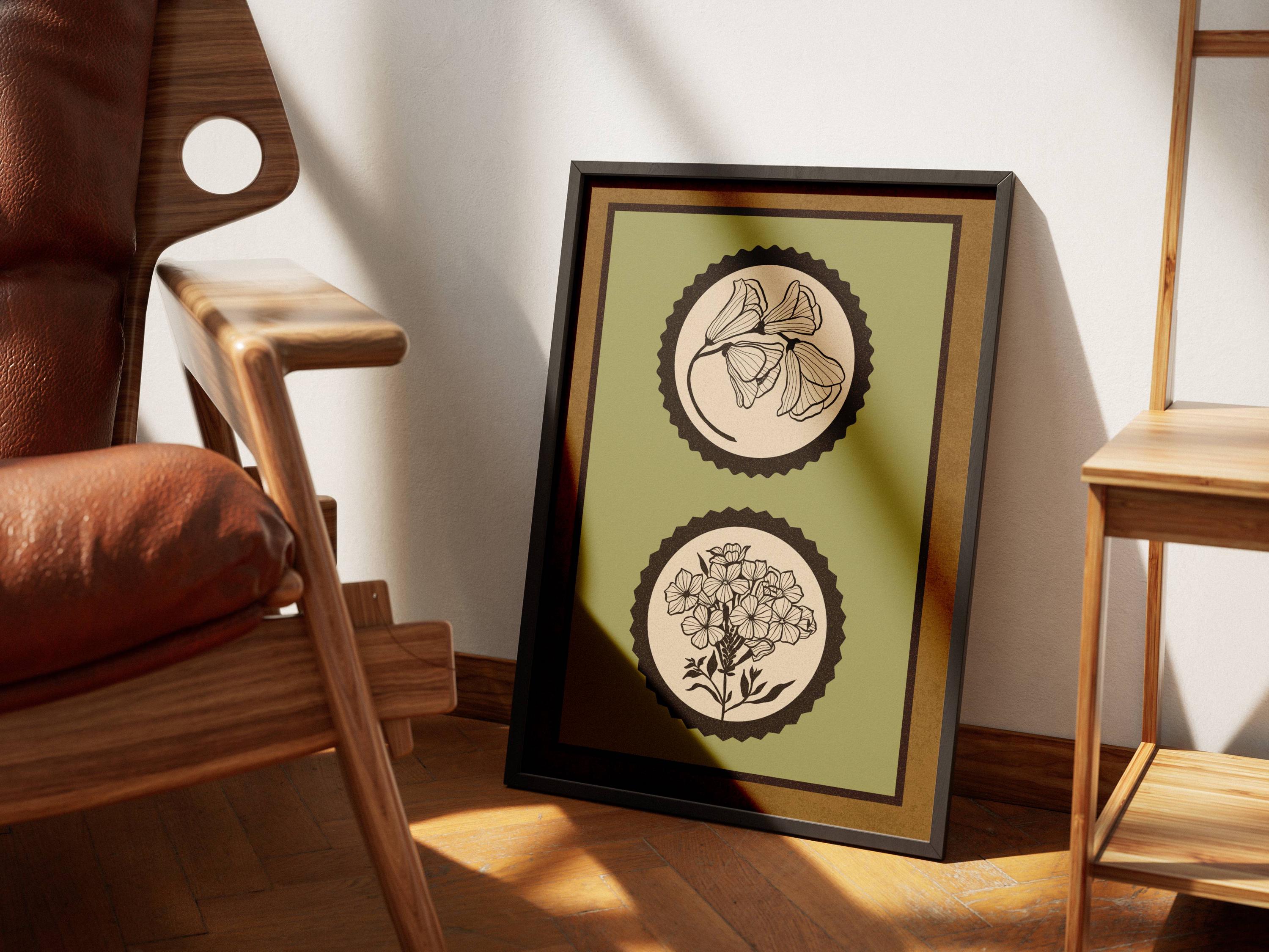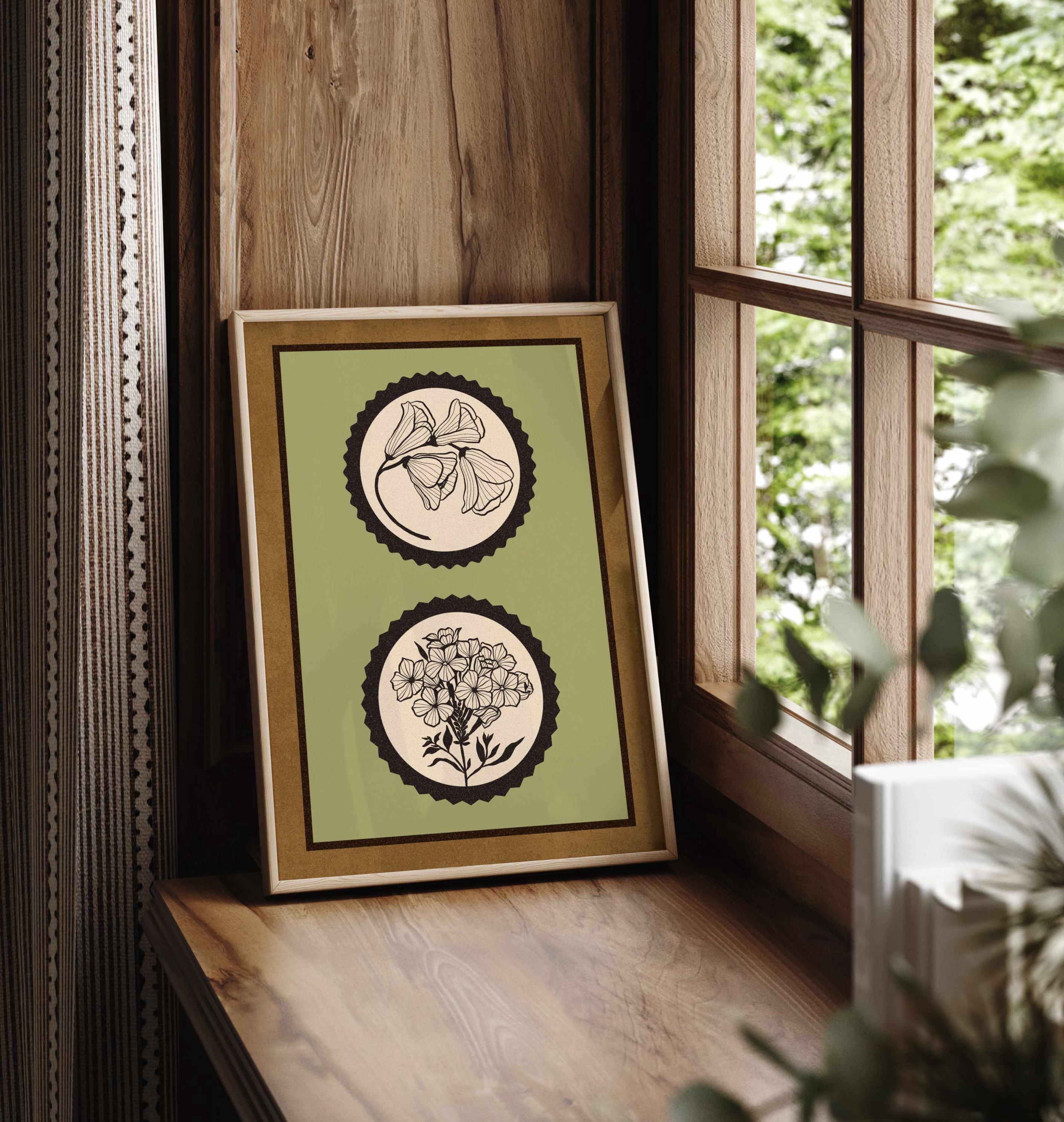 Vintage style floral print designed in a stamp-style layout with muted tones of light beige, warm browns, and soft olive, this print blends mid-century design, retro florals, and cottagecore aesthetics — making it the perfect addition to a gallery wall, reading nook, bedroom, or cozy kitchen.