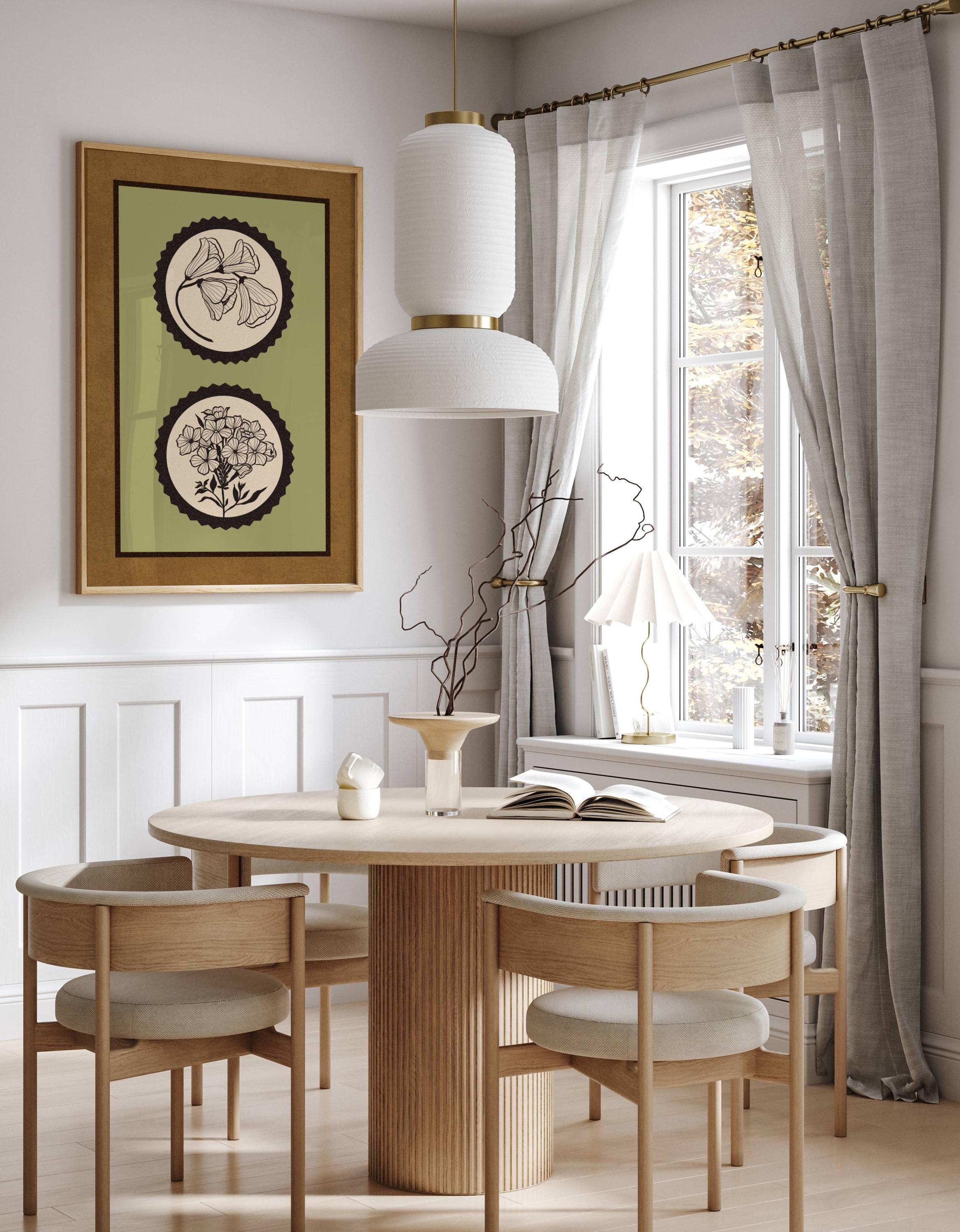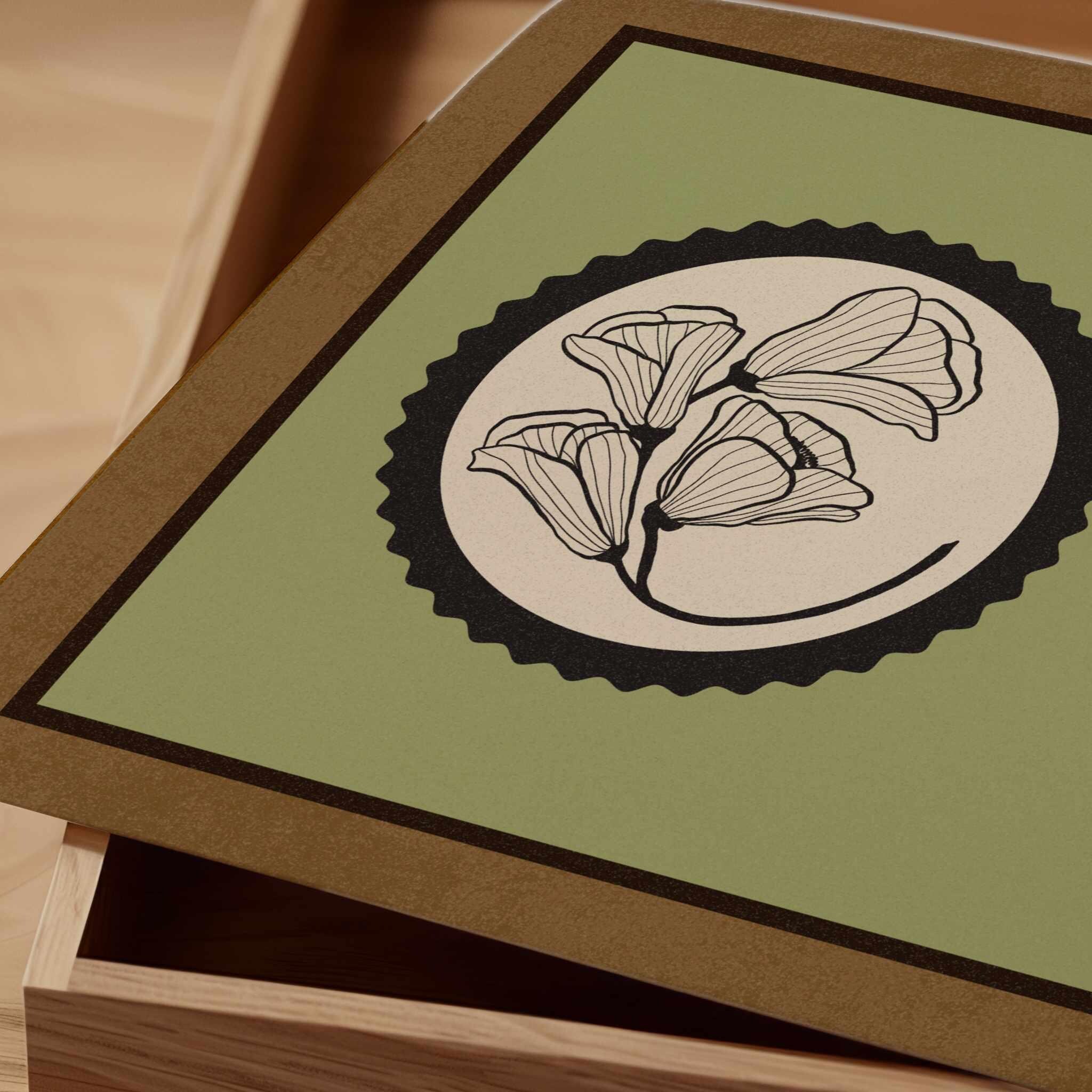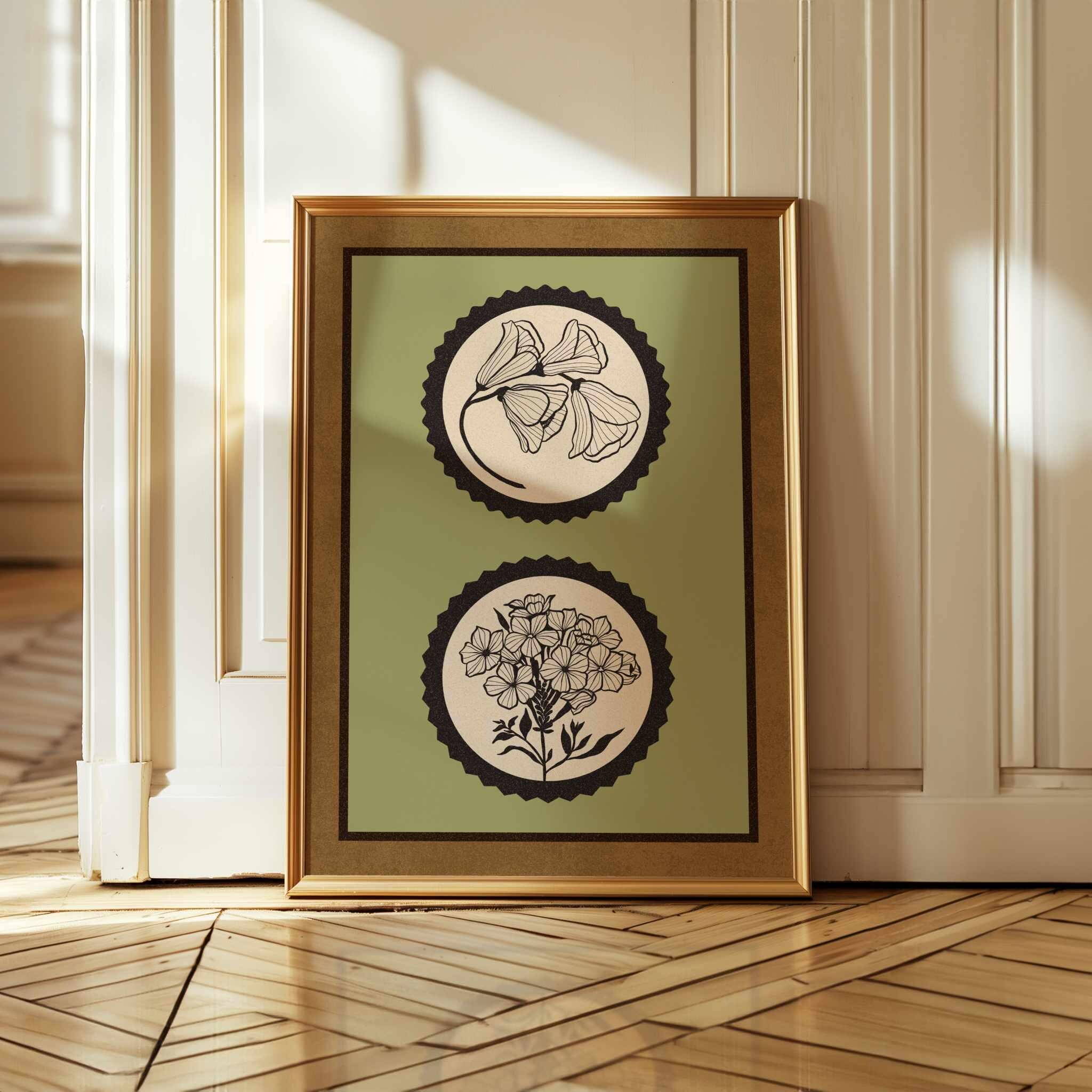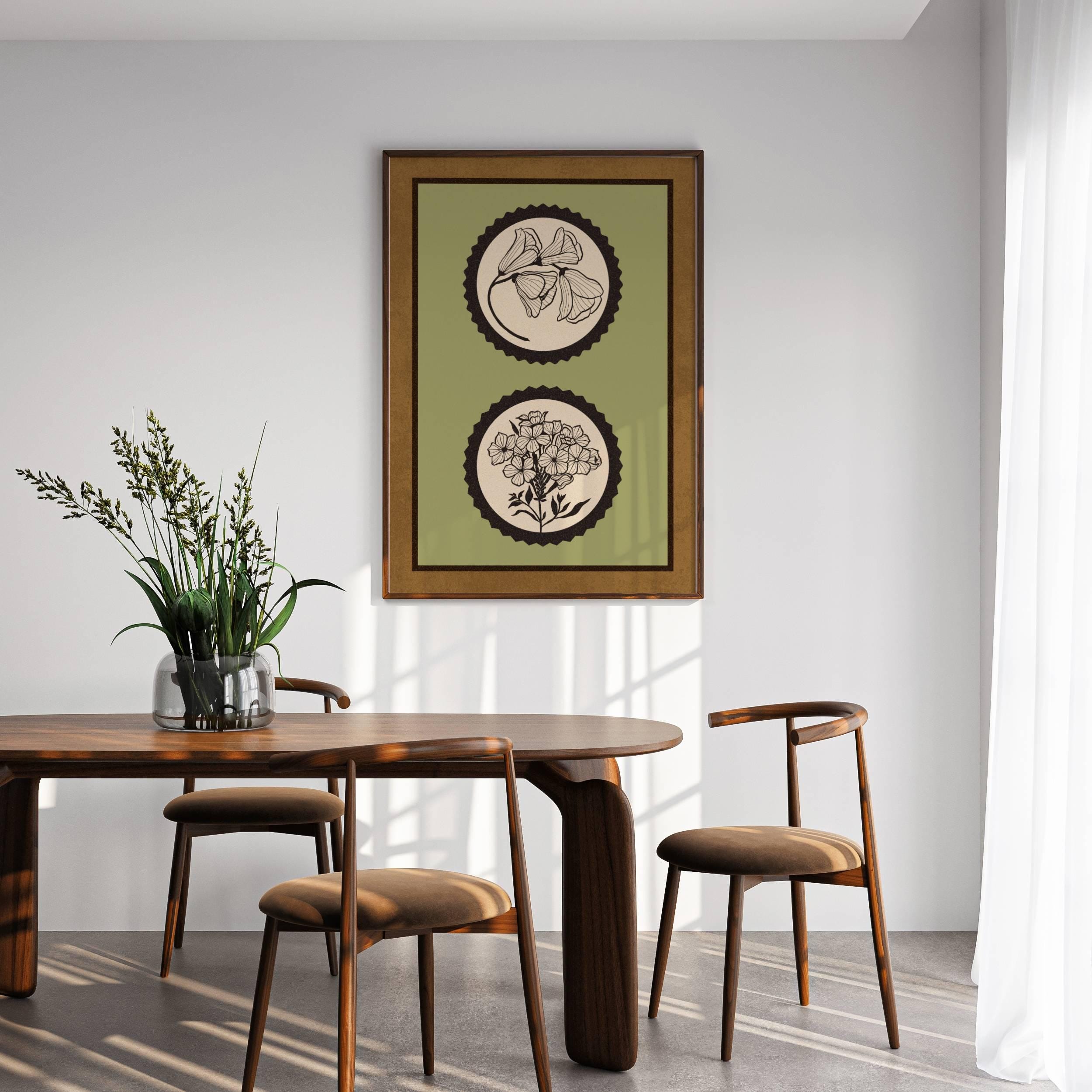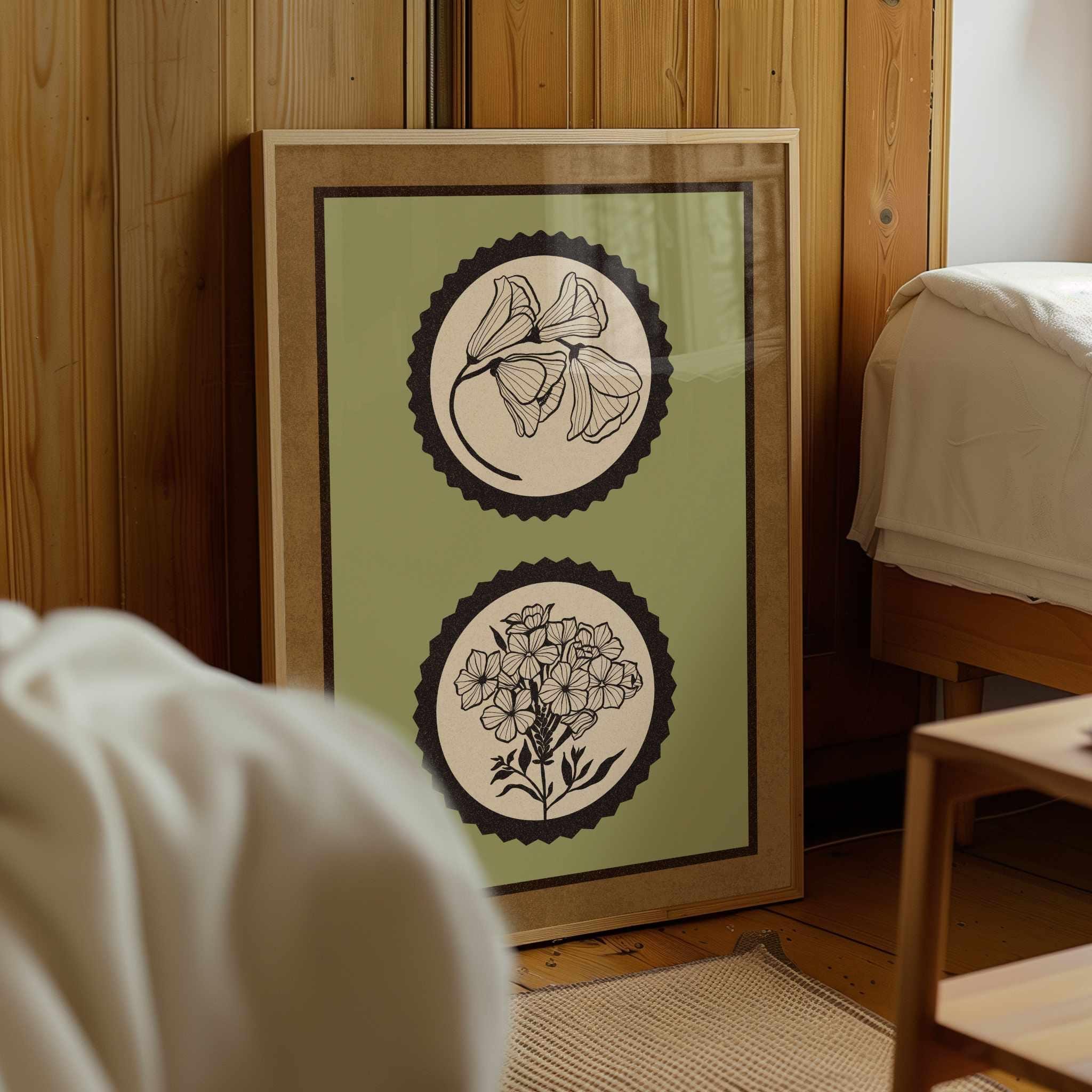 Vintage style floral print designed in a stamp-style layout with muted tones of light beige, warm browns, and soft olive, this print blends mid-century design, retro florals, and cottagecore aesthetics — making it the perfect addition to a gallery wall, reading nook, bedroom, or cozy kitchen.