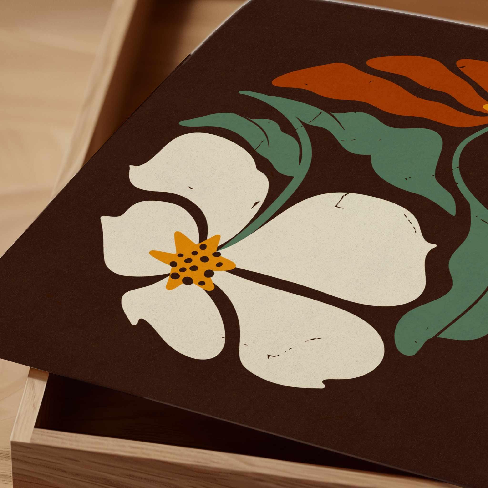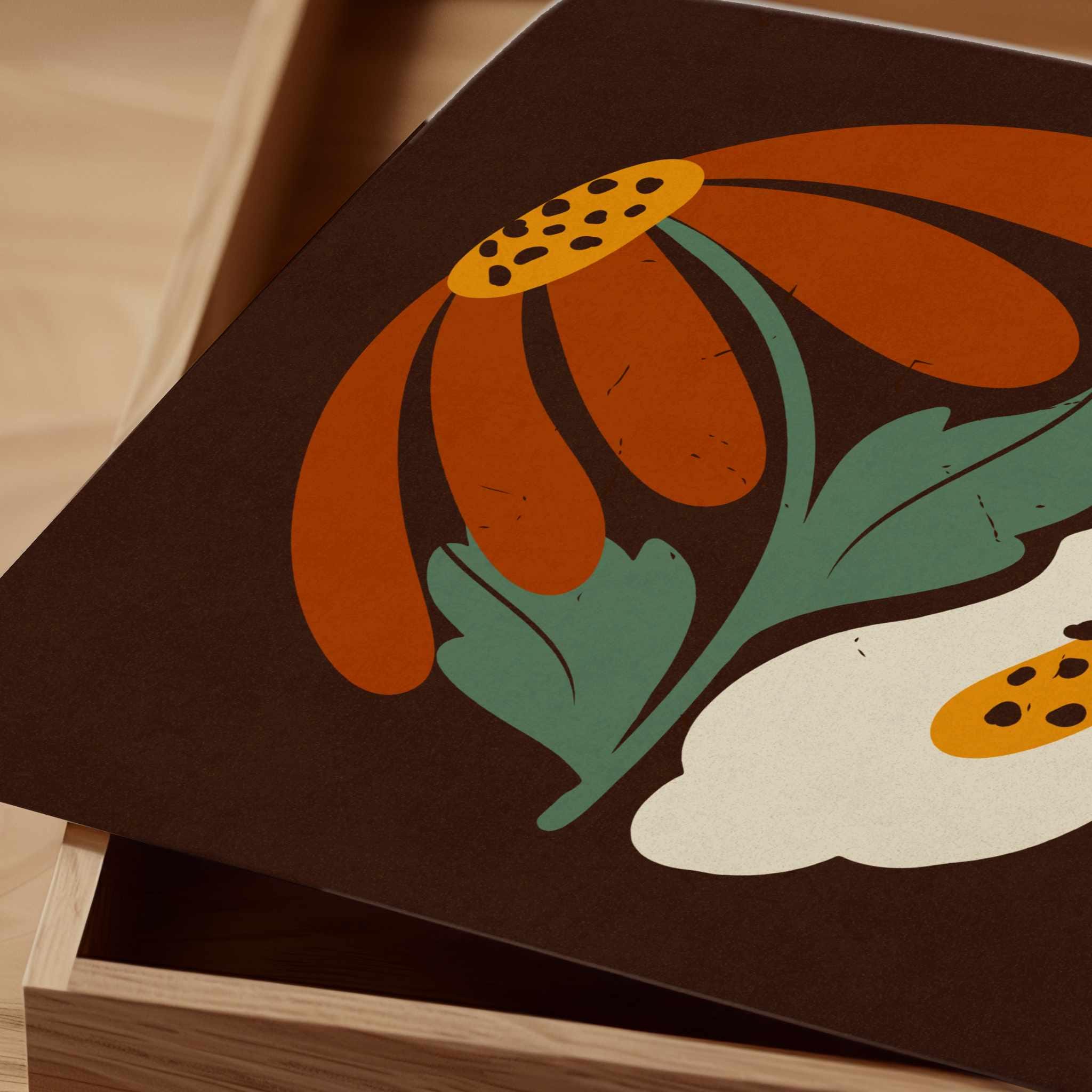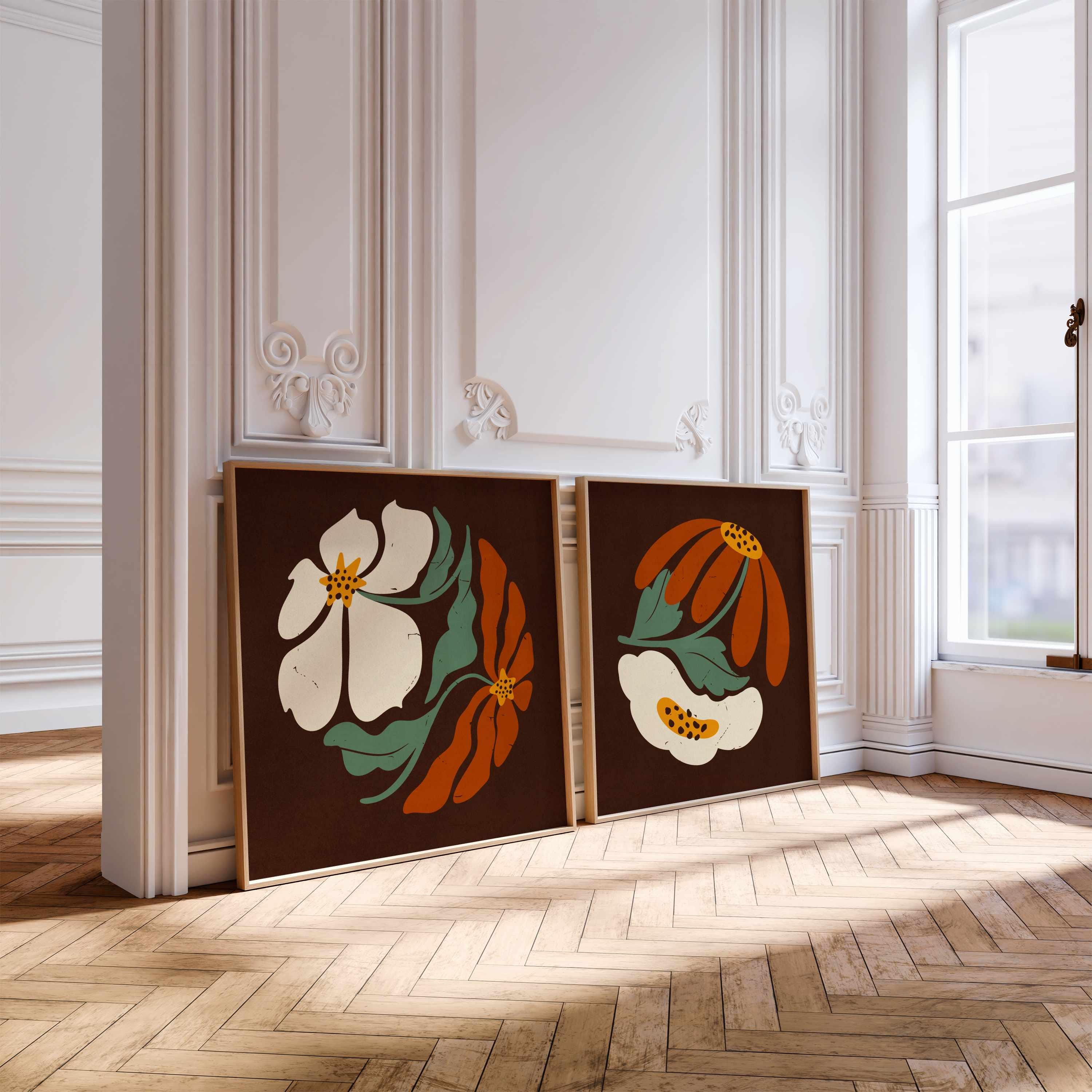 Retro floral wall art set of two prints featuring groovy, Matisse-inspired florals in rich, nostalgic tones: mustard yellow, rusty red, light teal, and cozy deep brown, this square trio adds a funky 60s-70s vibe to any room. Perfect for vintage-inspired homes, eclectic gallery walls, or boho interiors.