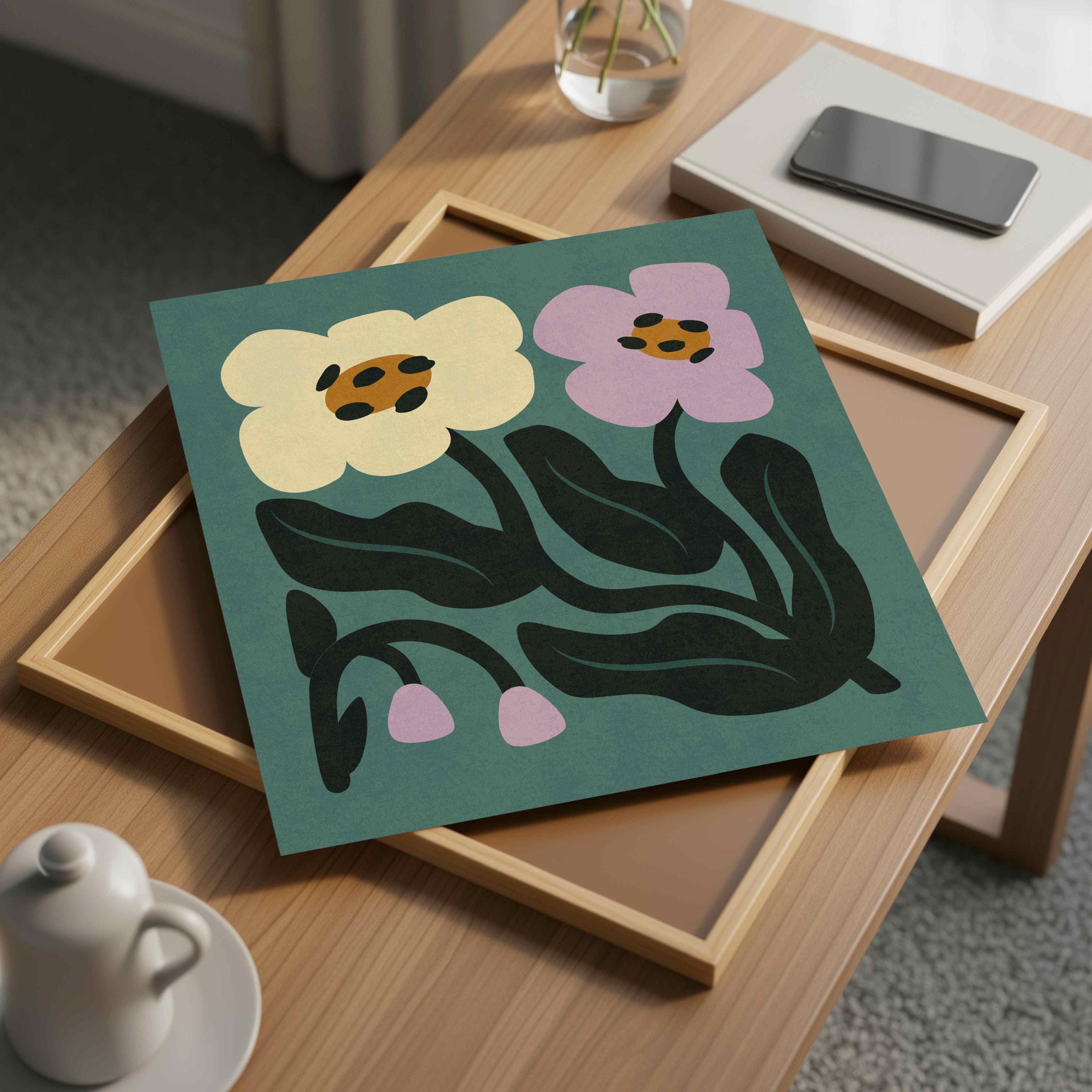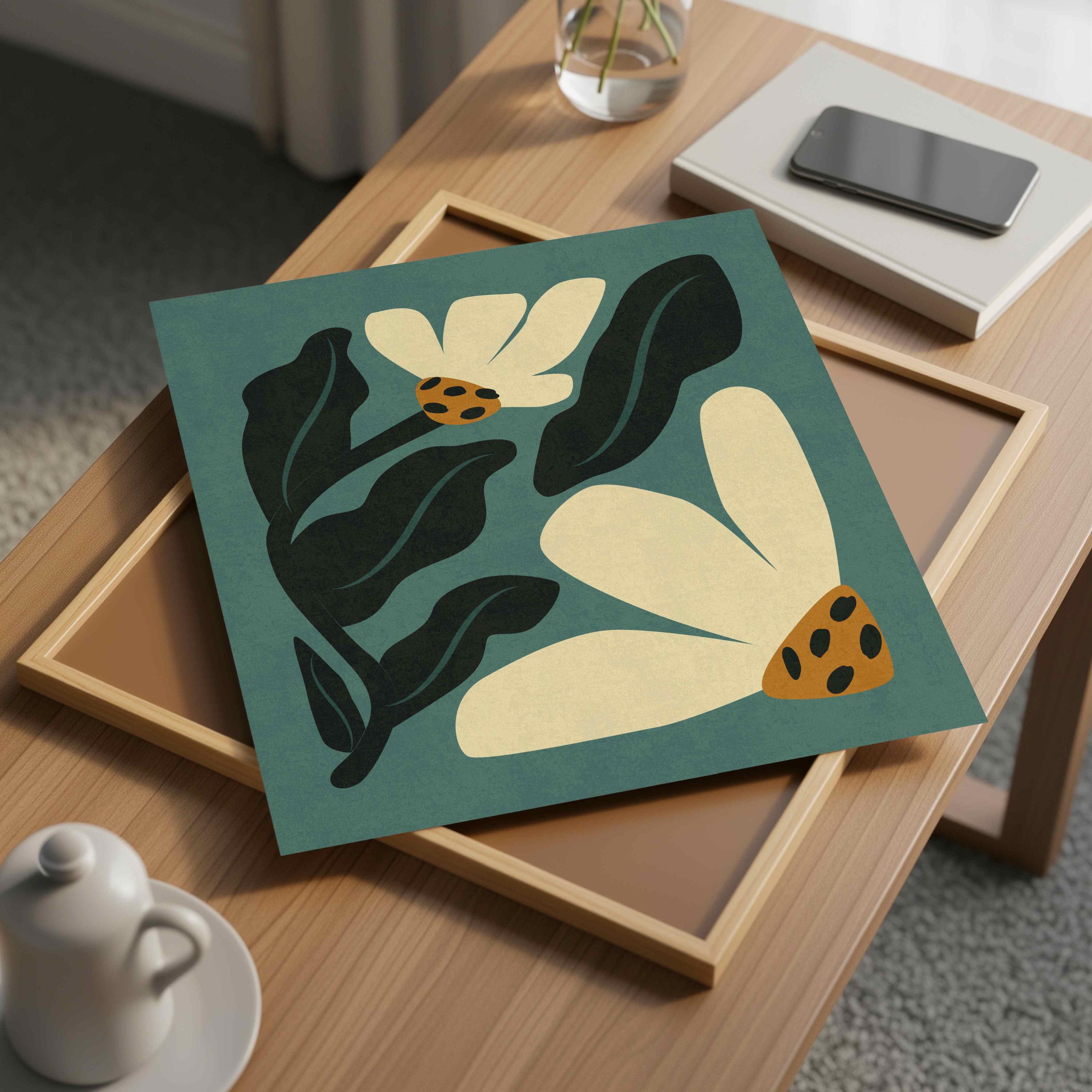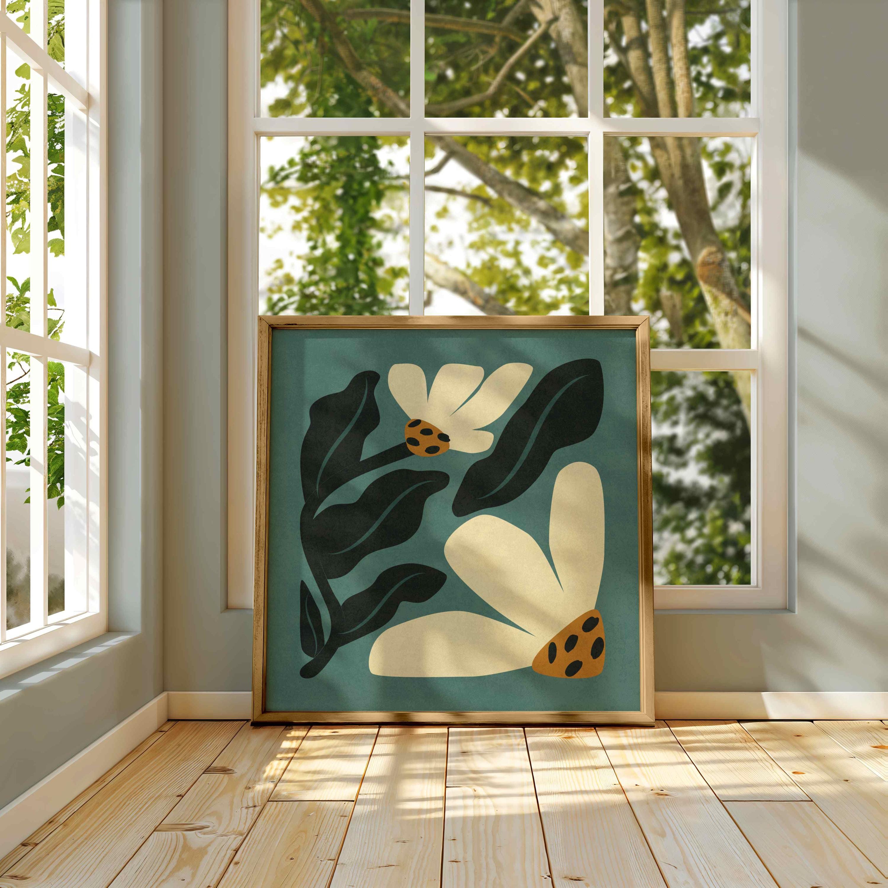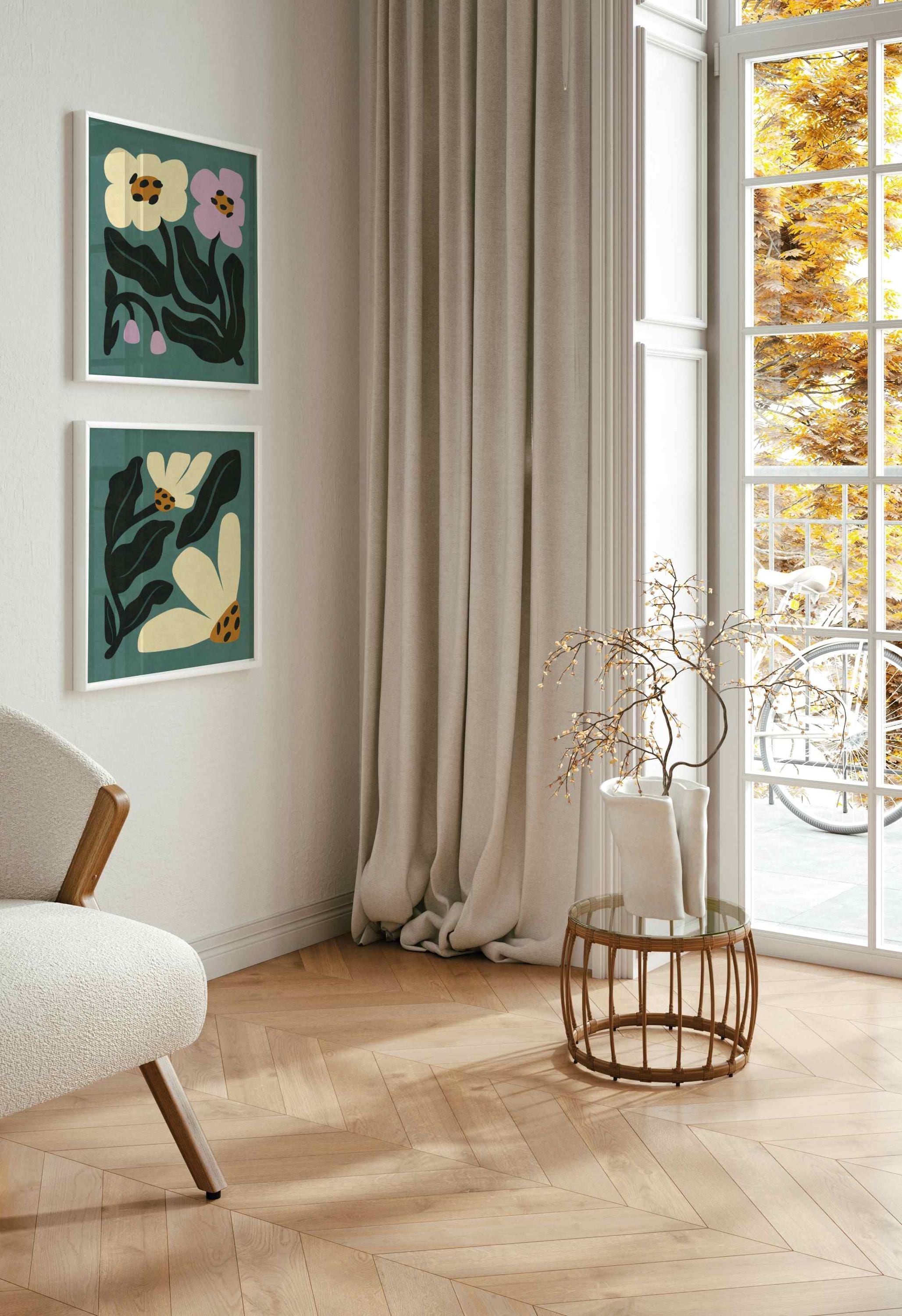 Retro floral wall art set of two prints featuring abstract botanical forms in vibrant colors. Inspired by Matisse cutouts and mid century design, this square set adds a funky 60s-70s vibe to any room. The square format makes them easy to pair or stack, and the joyful color palette works beautifully in vintage-inspired homes, eclectic gallery walls, or boho interiors.
