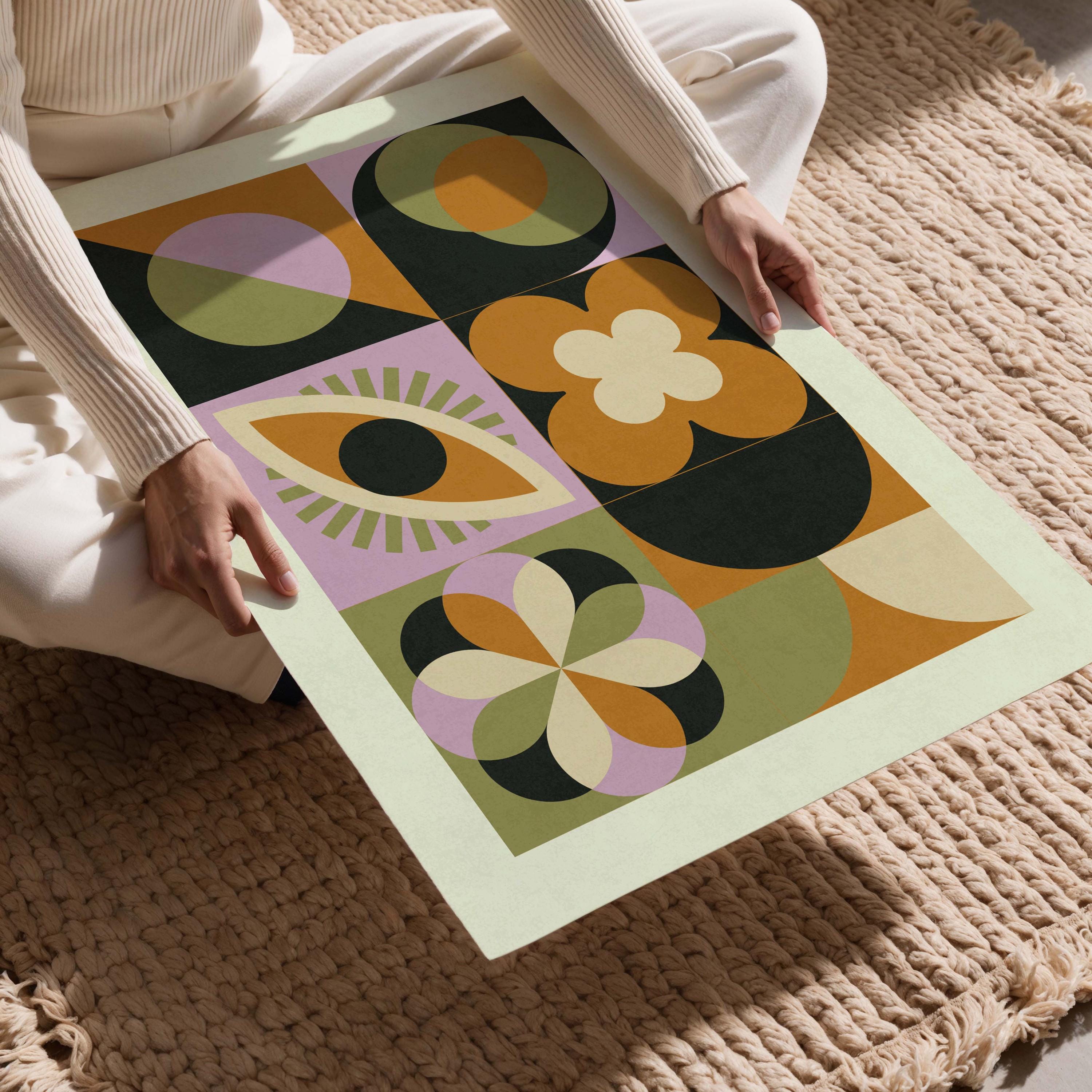 Mid century modern wall art with bauhaus-inspired geometric shapes and bold colors. A mix of retro and modern energy, these prints are perfect for boho, eclectic, or Scandinavian interiors. This abstract set is ideal for living rooms, bedrooms, offices, entryways, or any room that needs a pop of color.