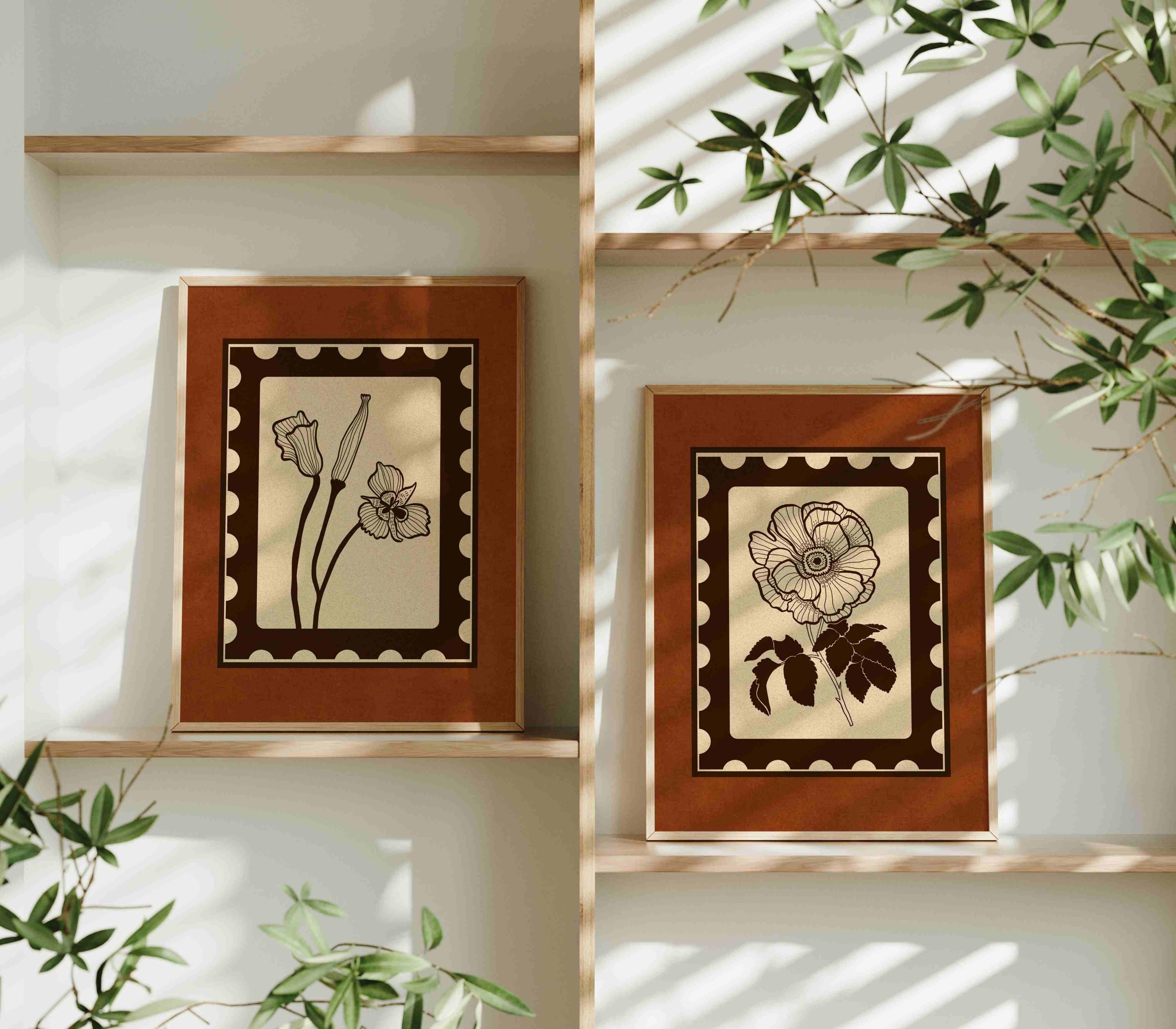Designed in a stamp-style layout with muted tones of light beige, rich brown, and warm rust red, this set blends mid-century design, retro florals, and cottagecore aesthetics — making it the perfect addition to a gallery wall, reading nook, bedroom, or cozy kitchen.