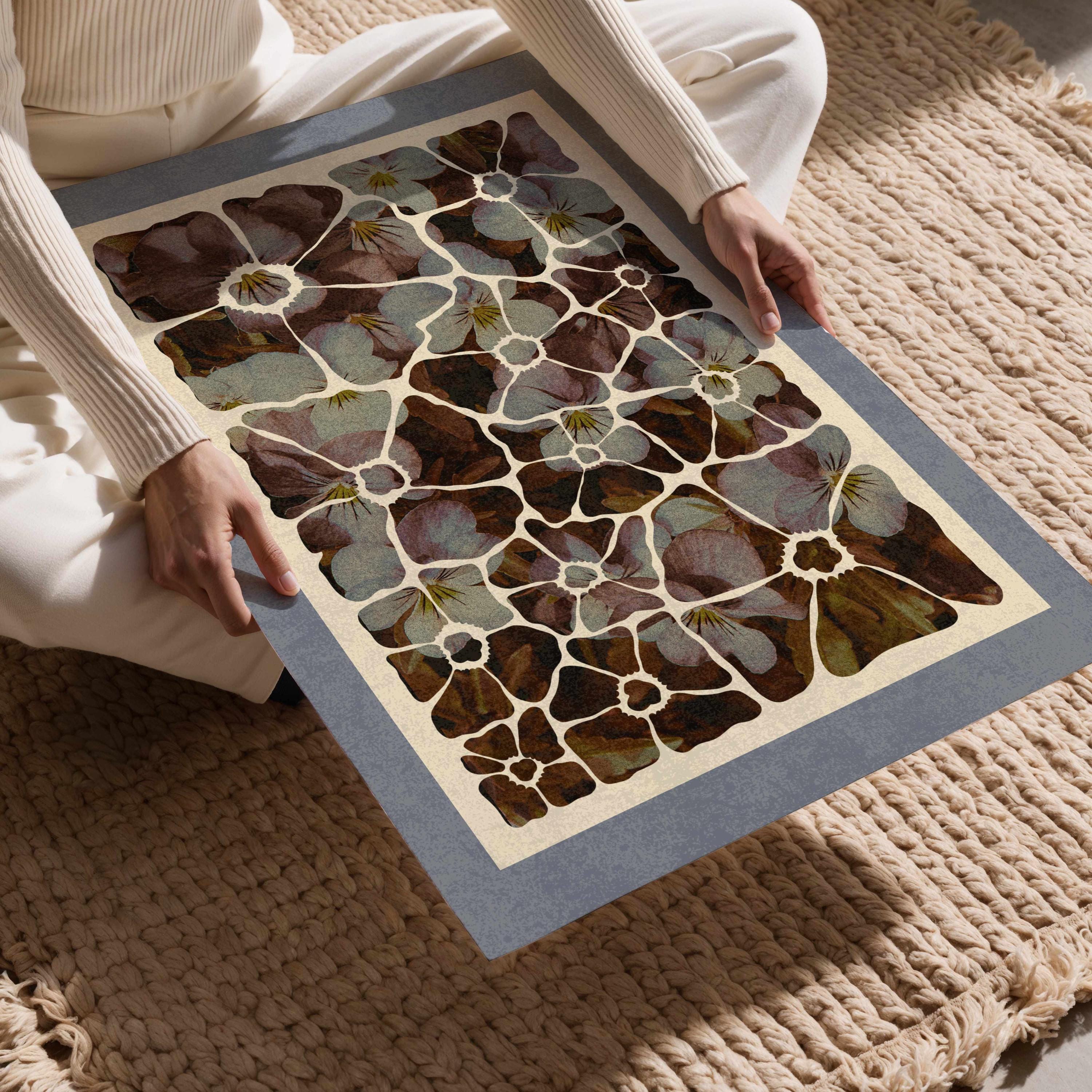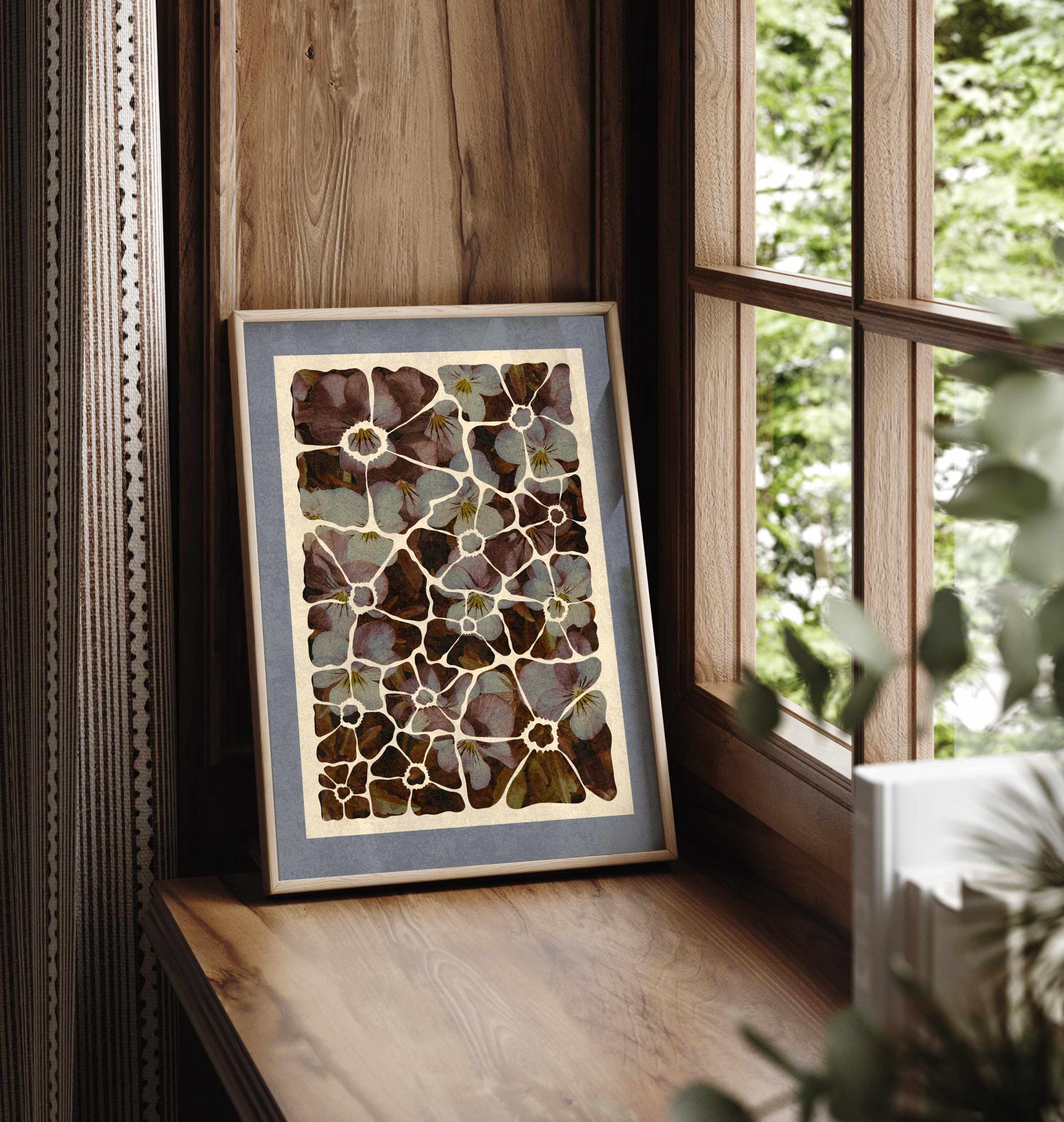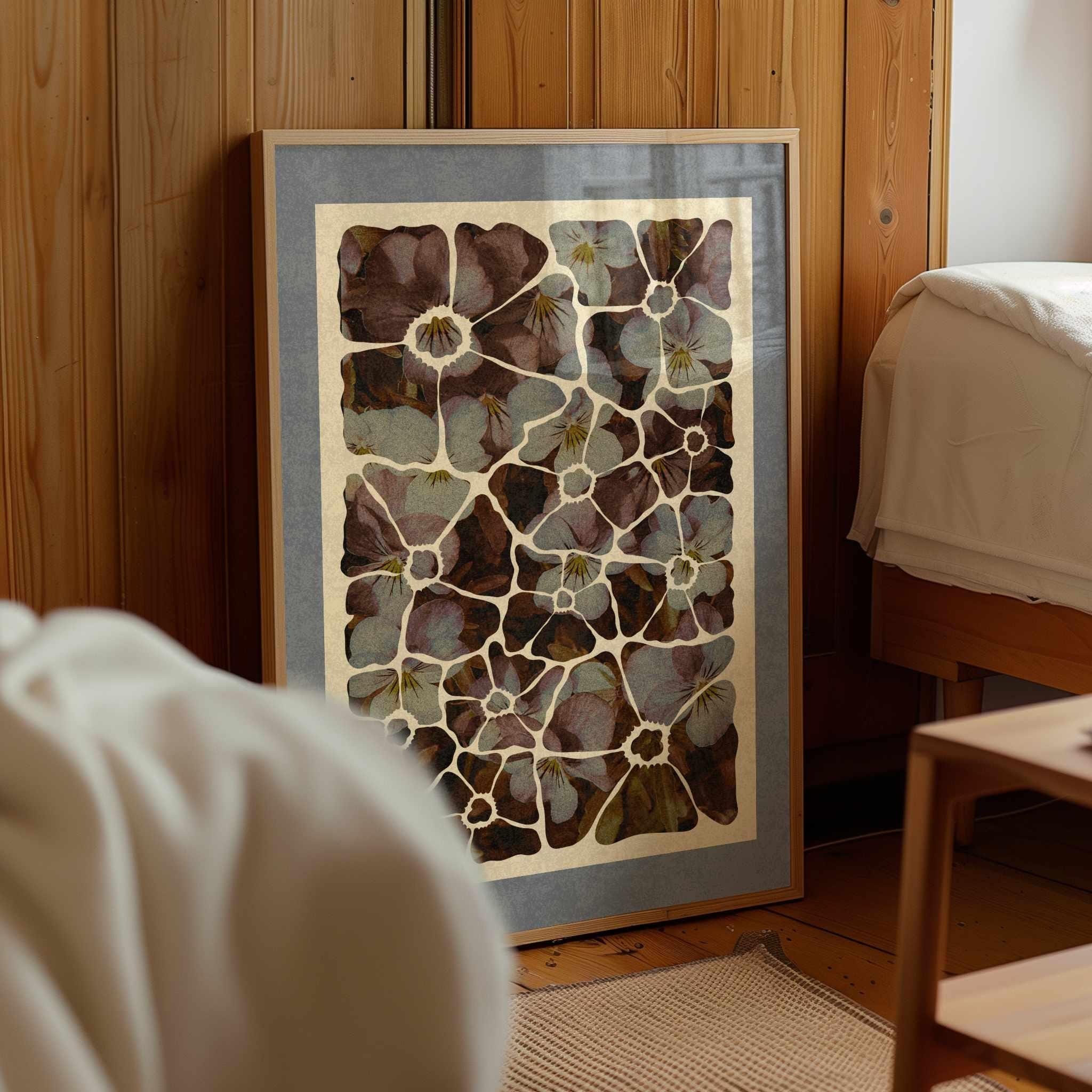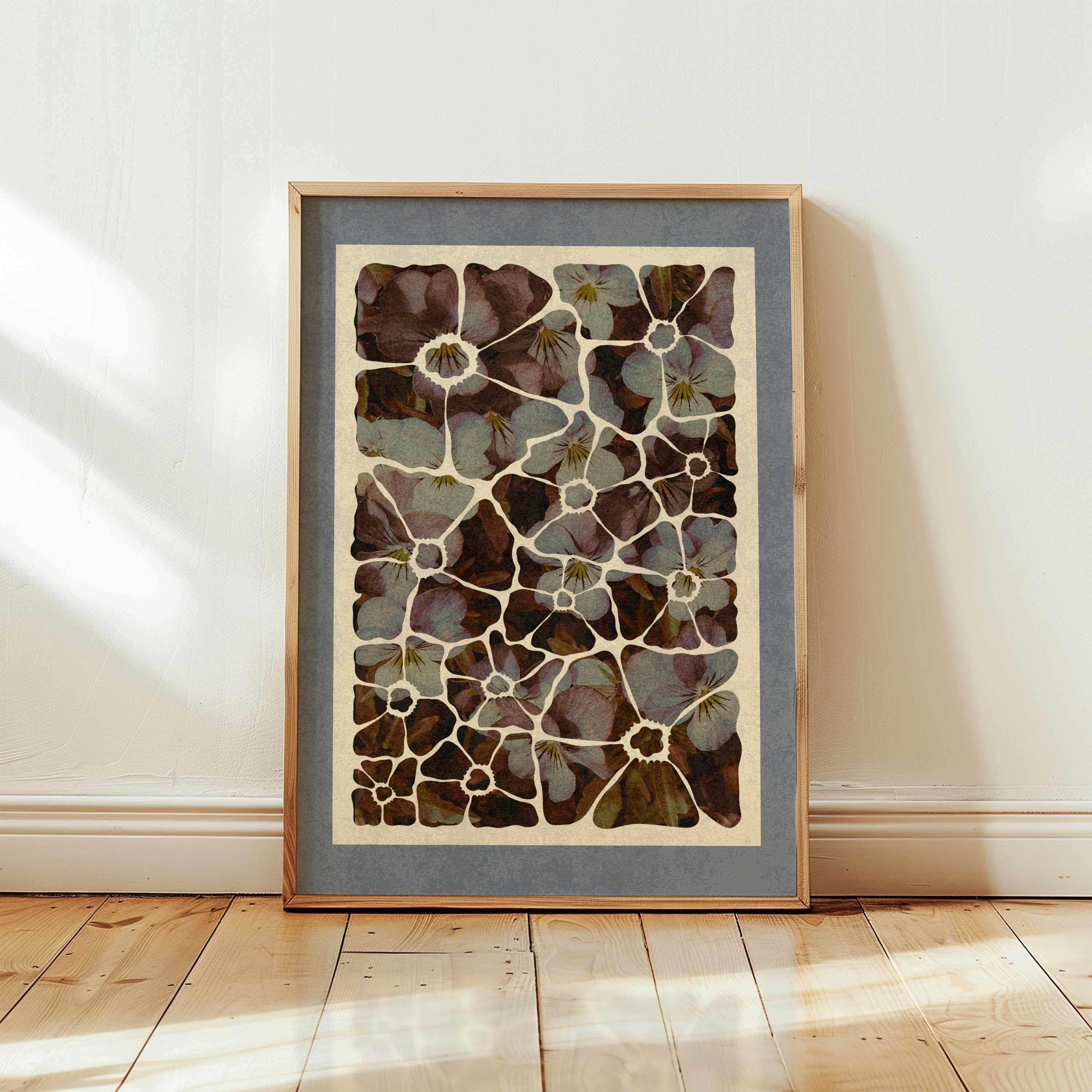 Abstract floral wall art featuring beautiful violets in soft purples, browns, and blues inside a modern cutout silhouette. Set in a muted blue-grey mat, this floral artwork blends modern design with vintage botanical style. Ideal for romantic, boho, cozy or vintage-inspired interiors.
