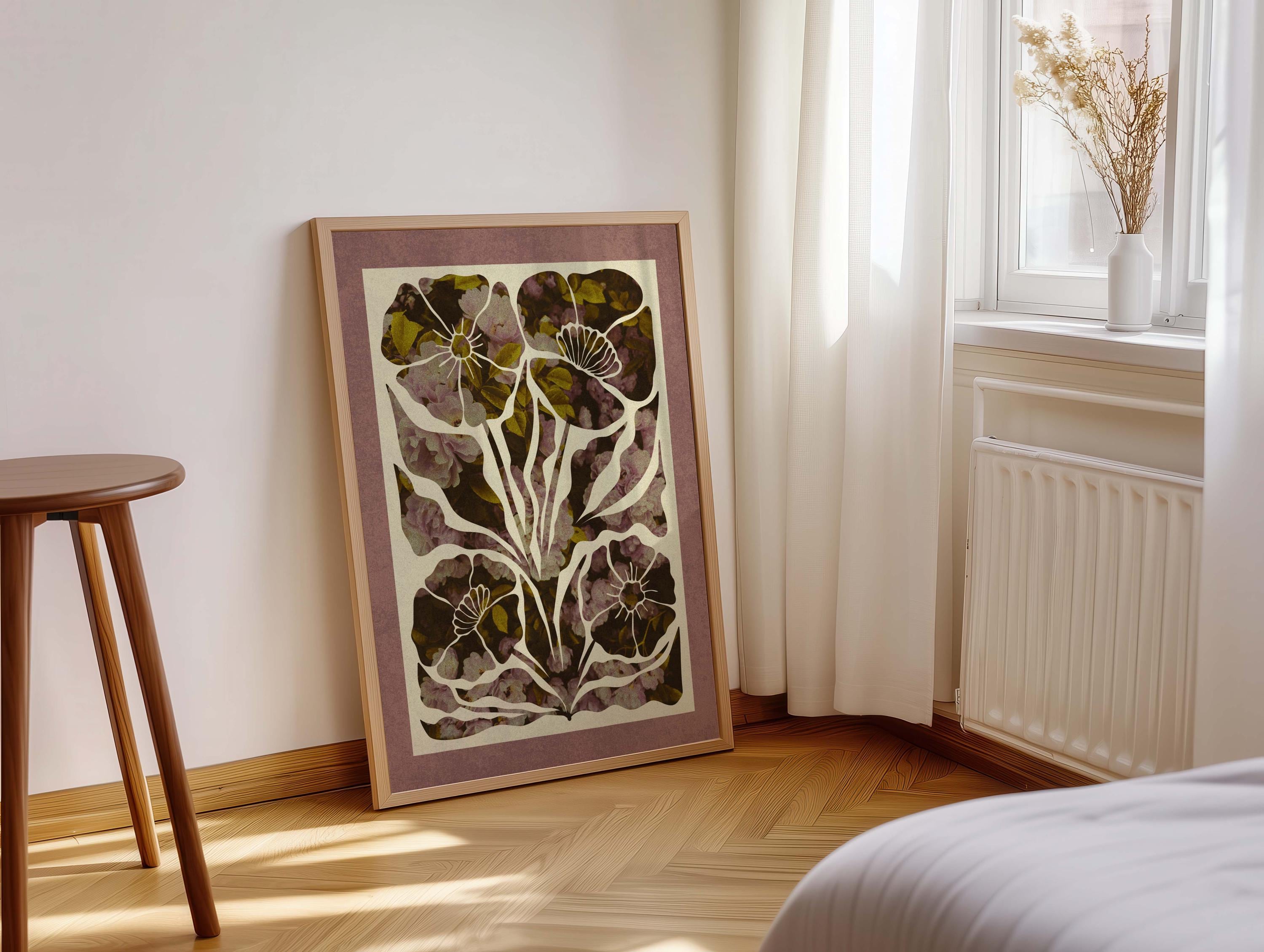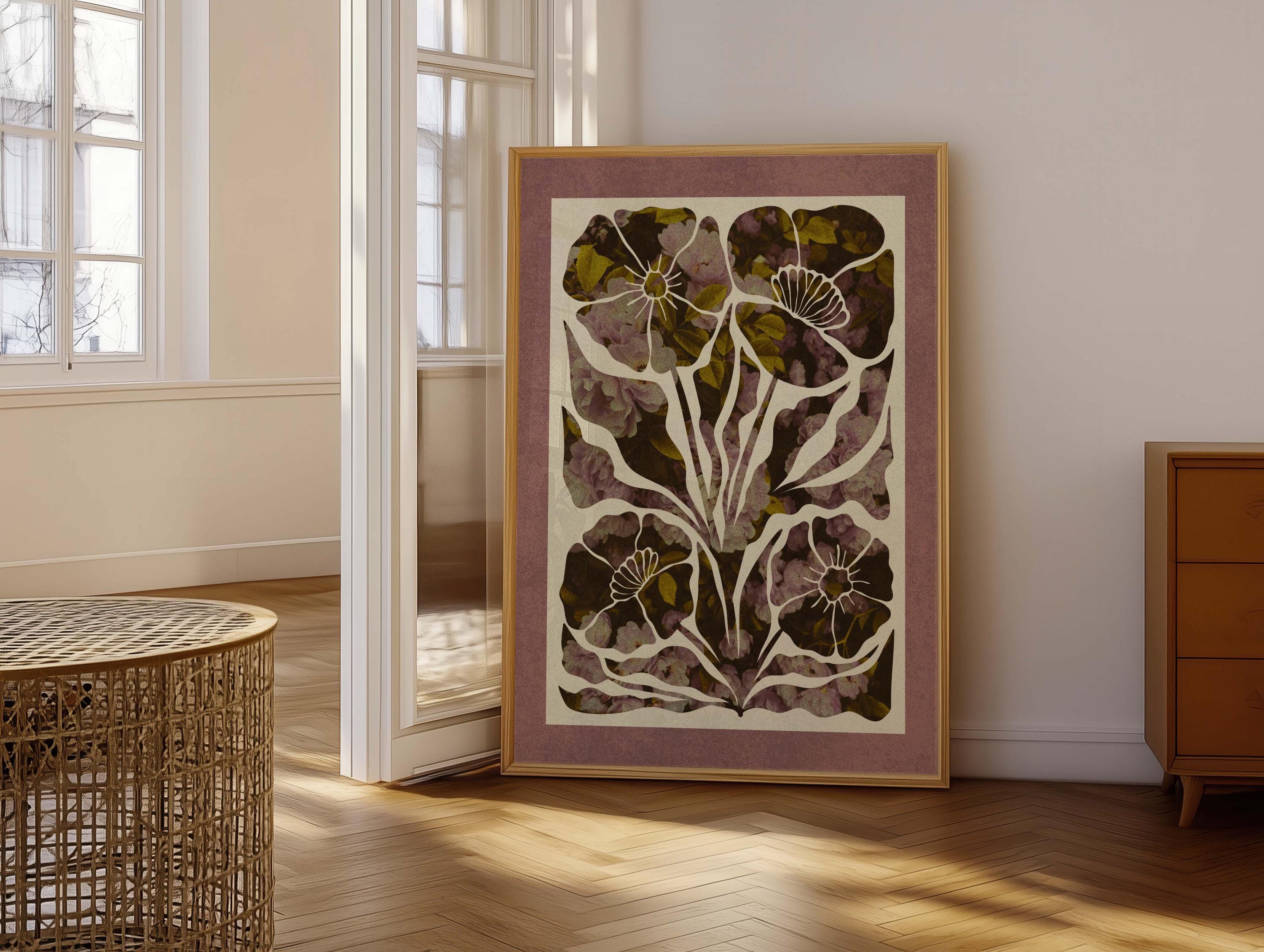 Abstract botanical wall art featuring bold retro floral shapes in rich earthy tones and bordered with a dusty mauve mat. Inspired by the warm layered petals of rose blooms, this piece blends vintage botanical design, mid-century organic shapes, and a soft palette. Ideal for bedrooms, living rooms, or gallery walls.
