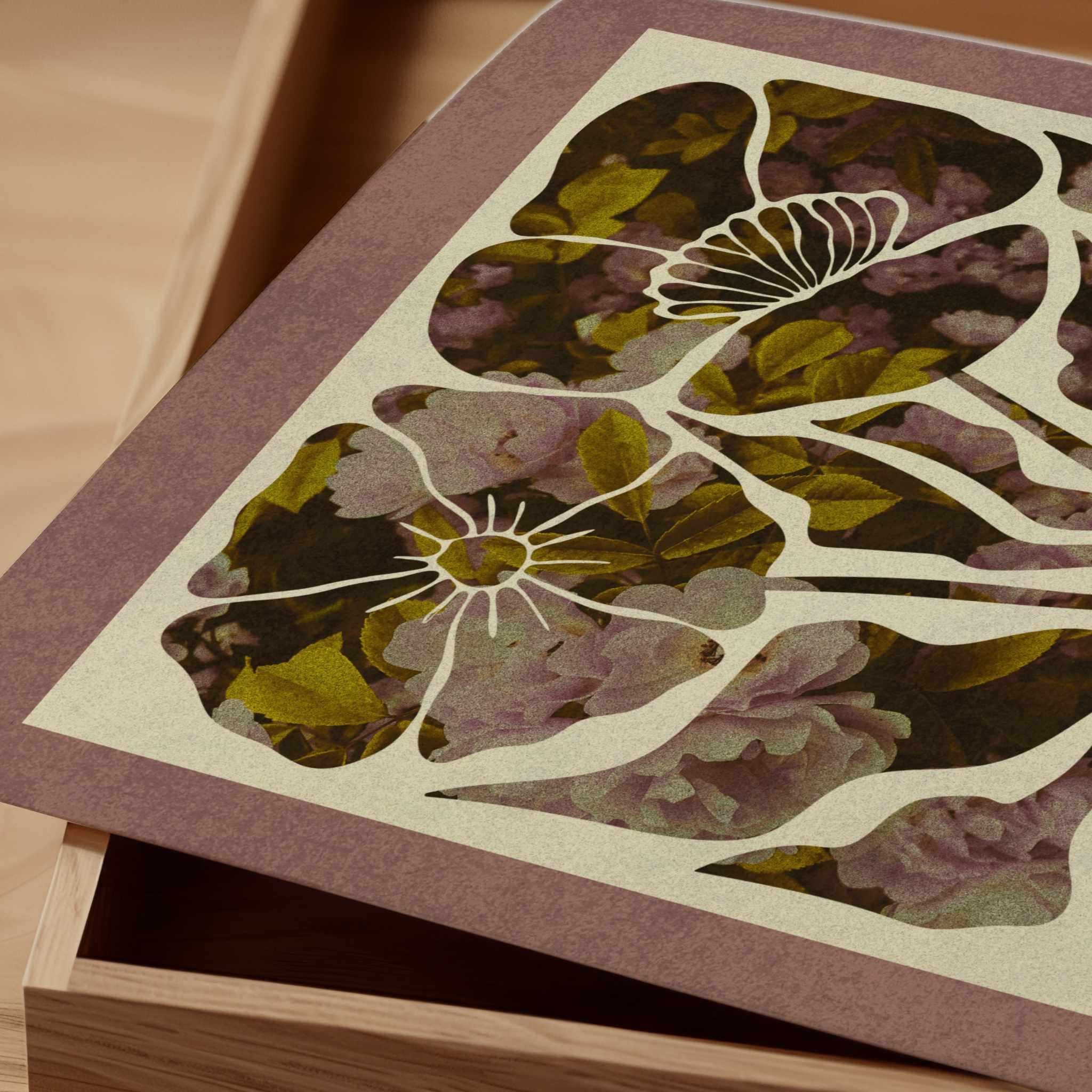 Abstract botanical wall art featuring bold retro floral shapes in rich earthy tones and bordered with a dusty mauve mat. Inspired by the warm layered petals of rose blooms, this piece blends vintage botanical design, mid-century organic shapes, and a soft, summer palette. Ideal for bedrooms, living rooms, or gallery walls.