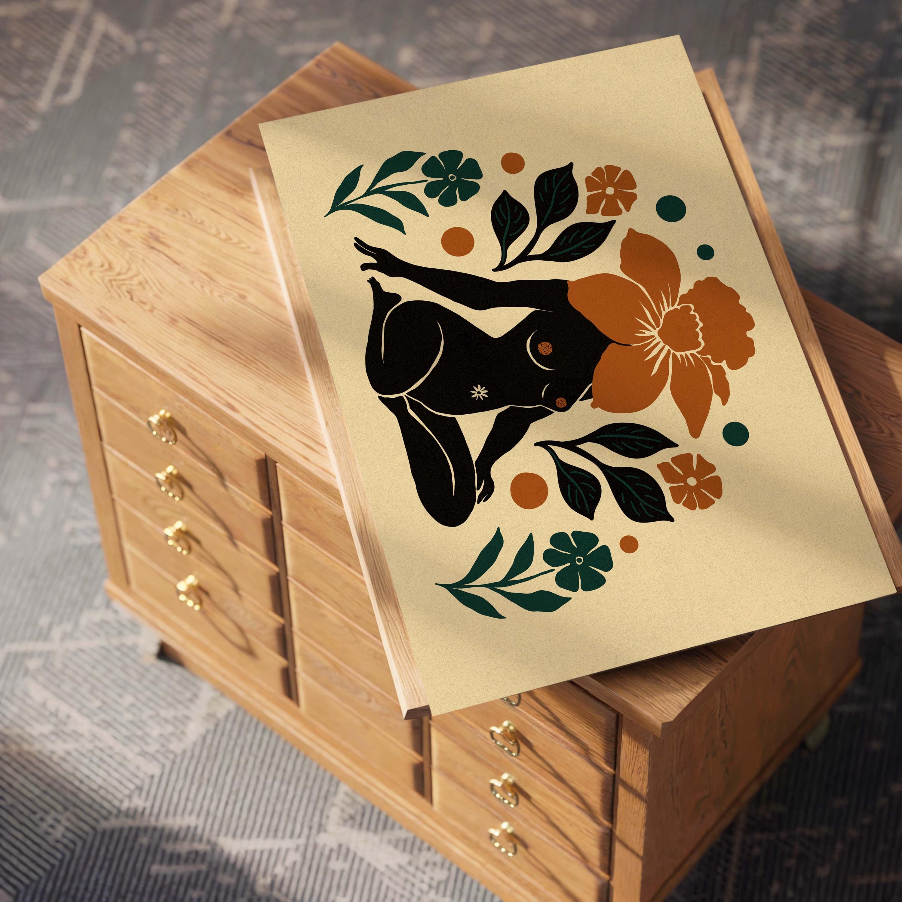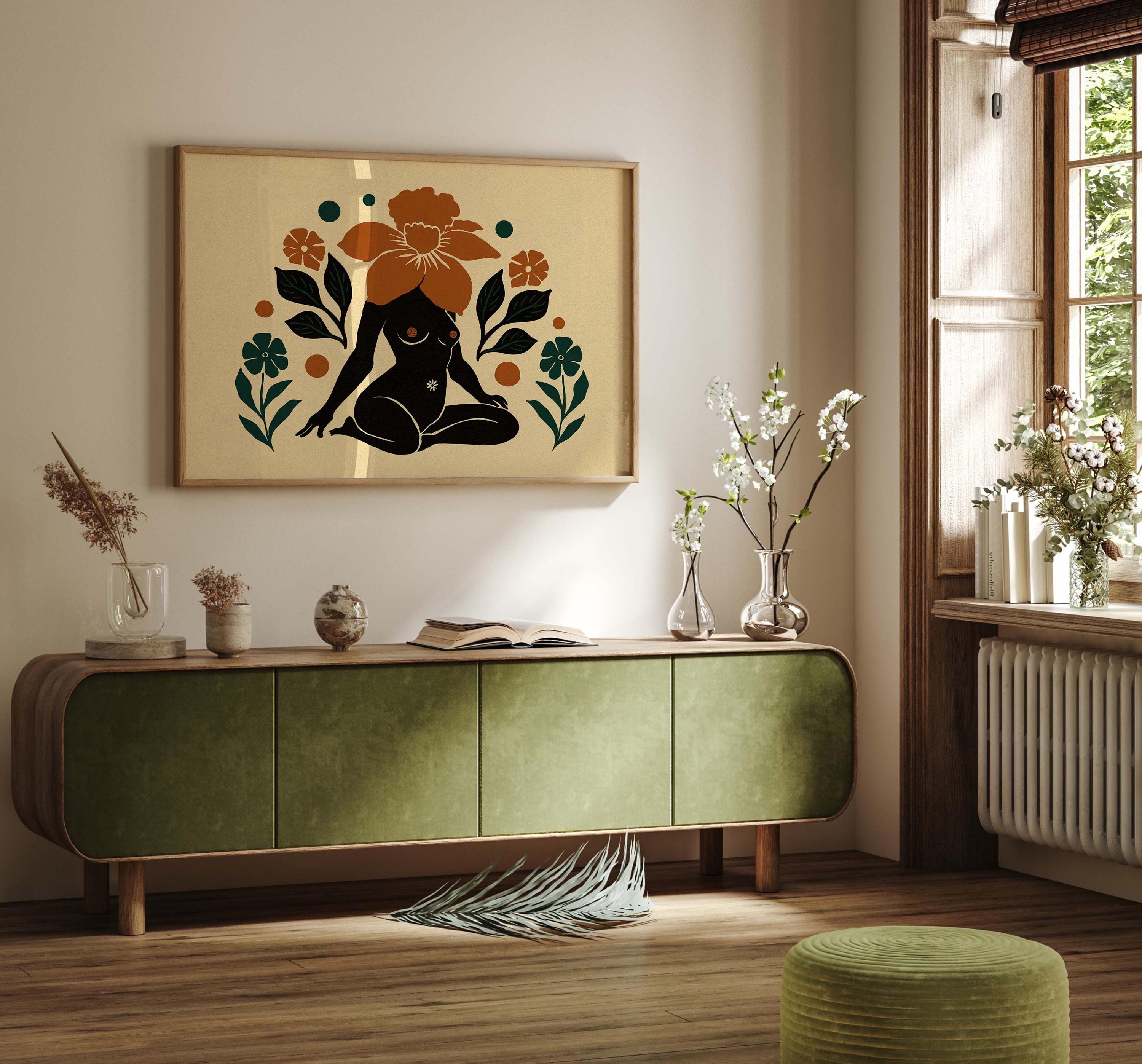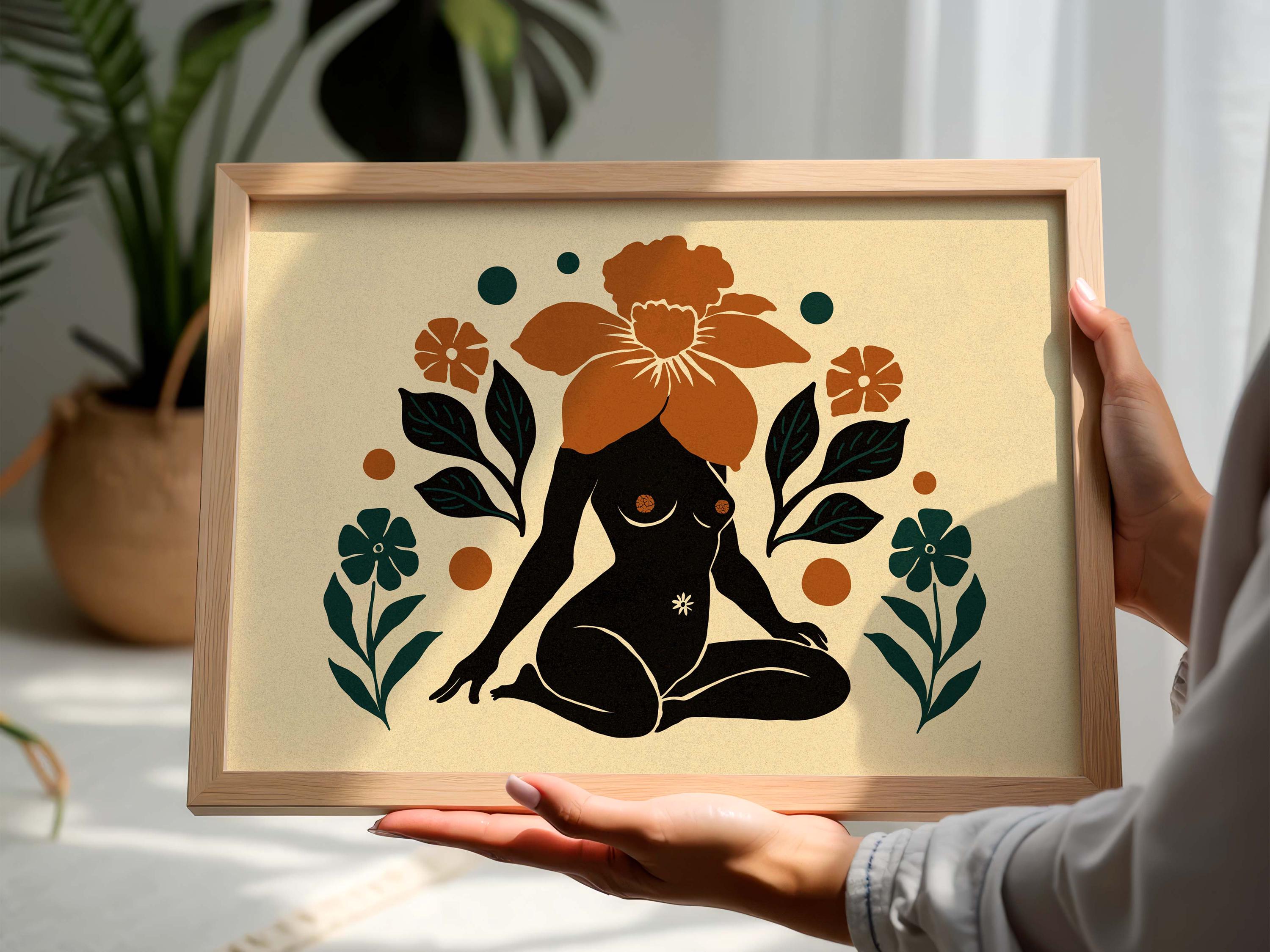 Mid century modern wall art featuring a beautiful female figure surrounded by bold, botanical shapes. The rich color palette of teal, burnt orange, and a soft, neutral beige background makes this print a versatile choice for any room. Perfect for hanging above a sofa in the living room, a bed in the bedroom, or as an inspiring piece in your home office.