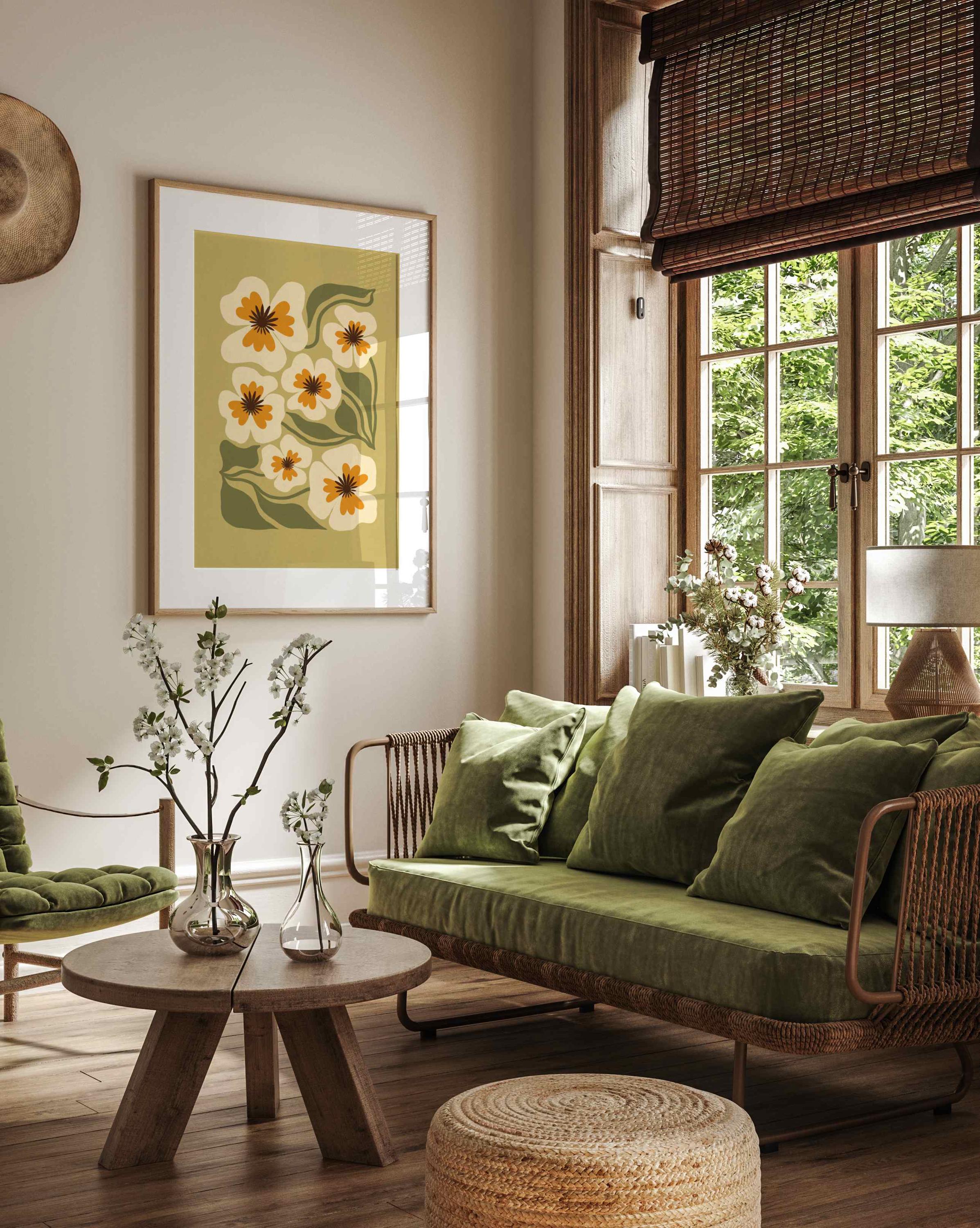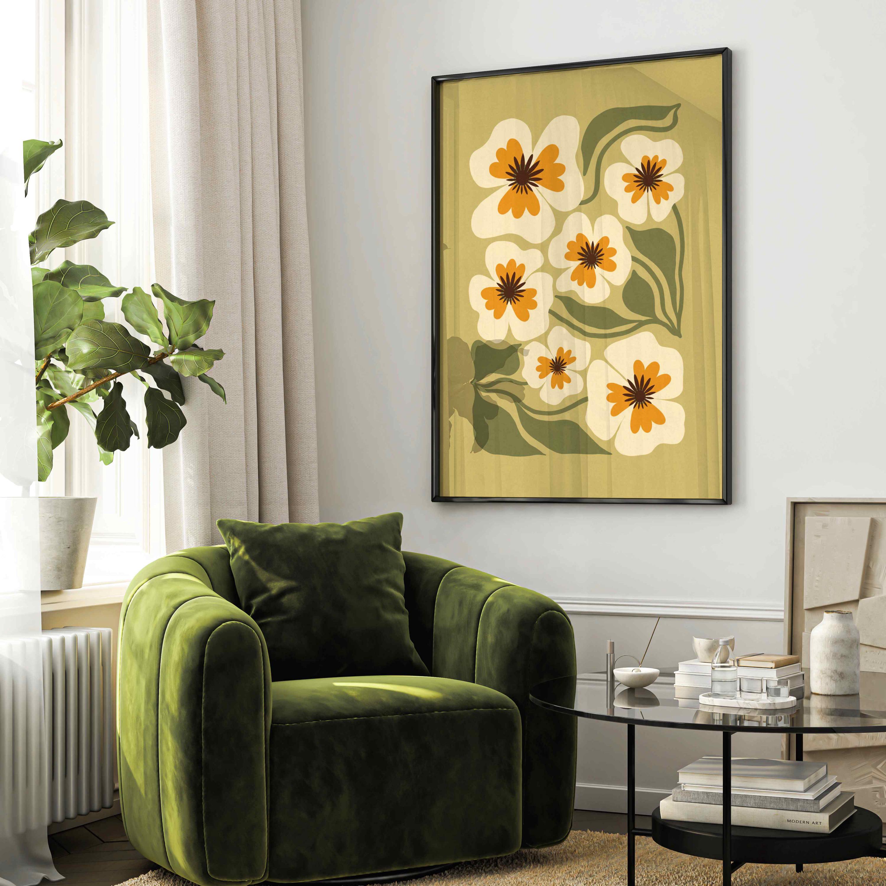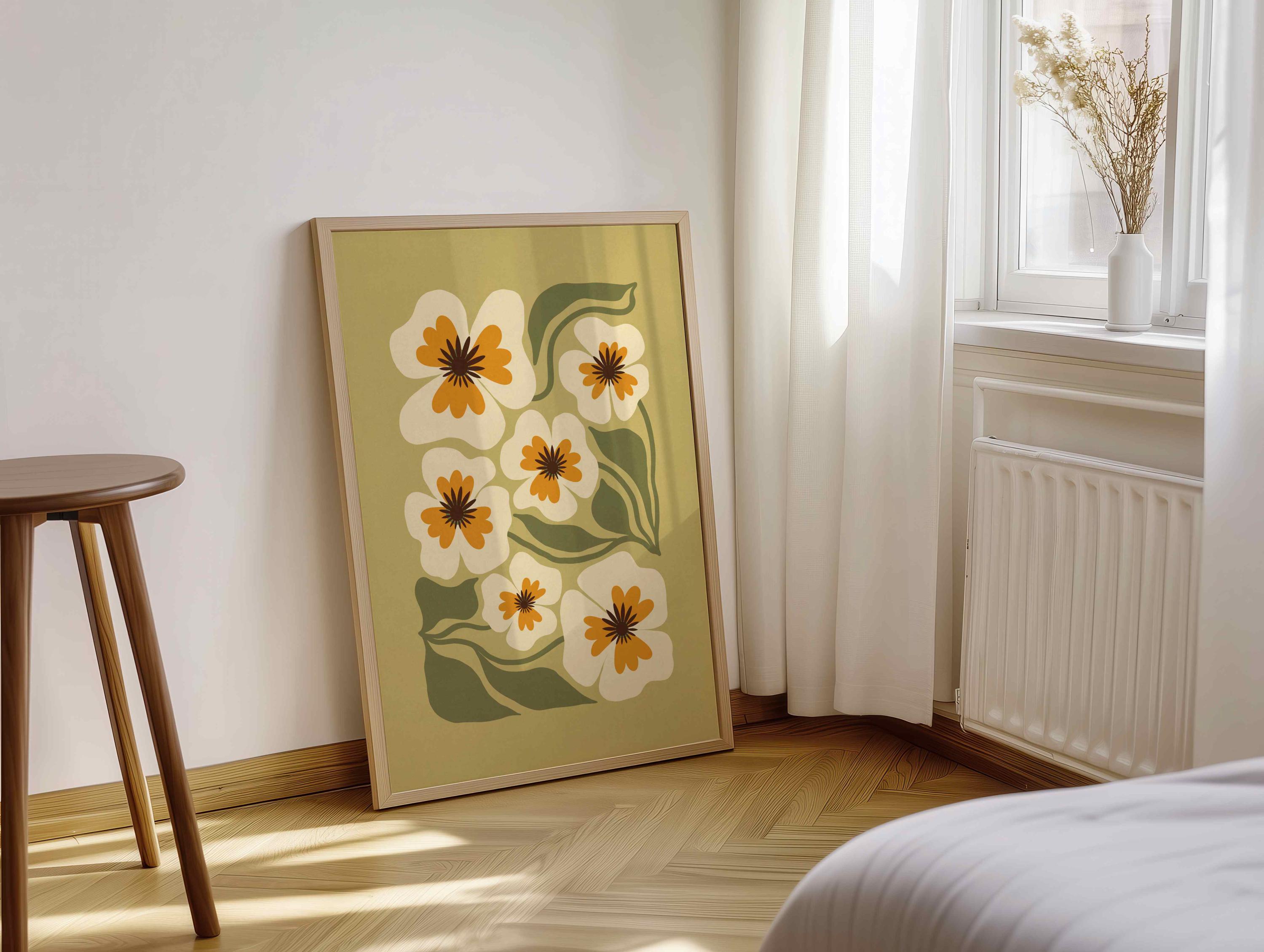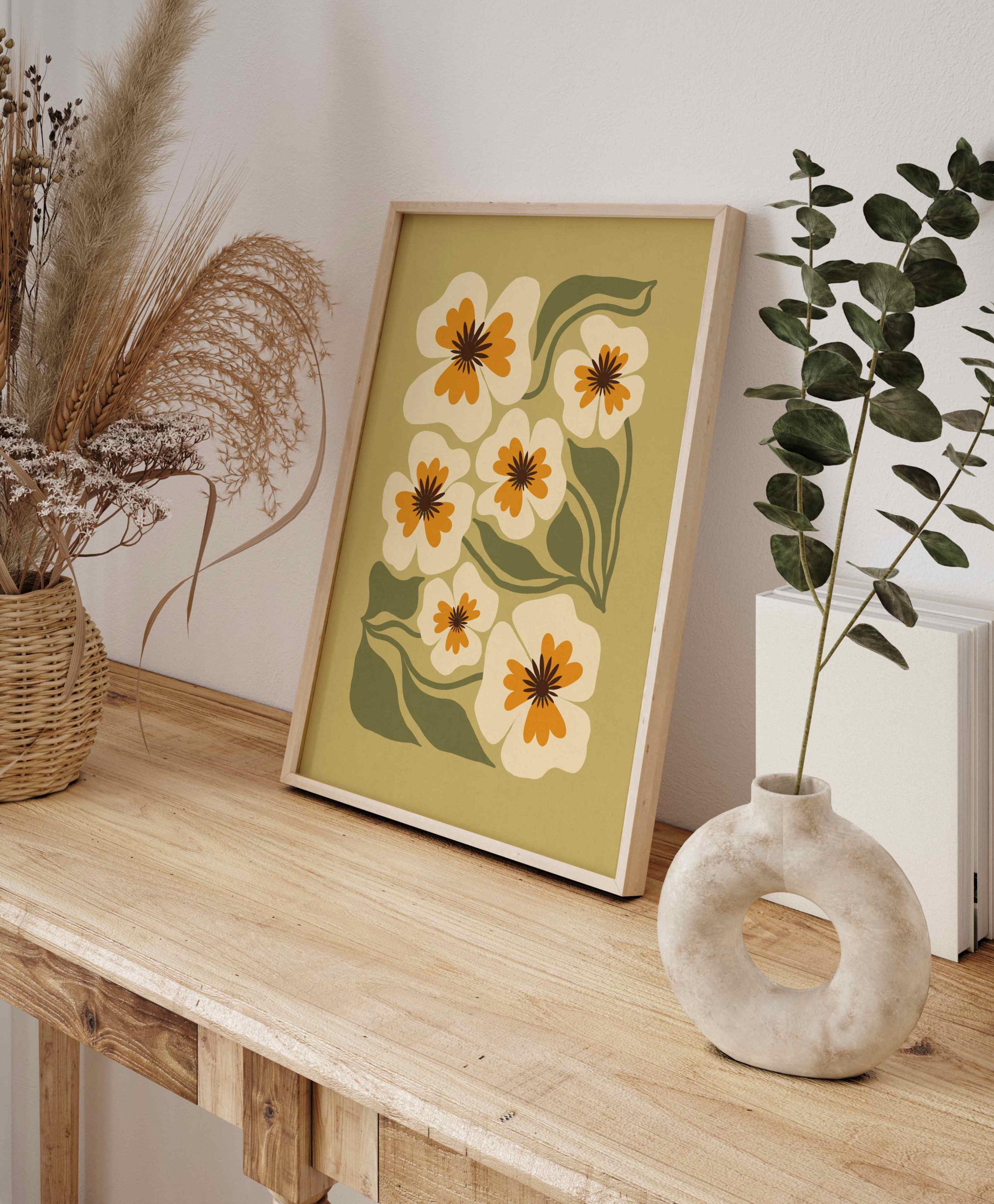 Retro floral wall art featuring an earthy palette of olive green, soft cream, and warm mustard. Inspired by Matisse-style cutouts, 70s groovy aesthetics, and mid century modern design, this botanical print is calm but graphic.