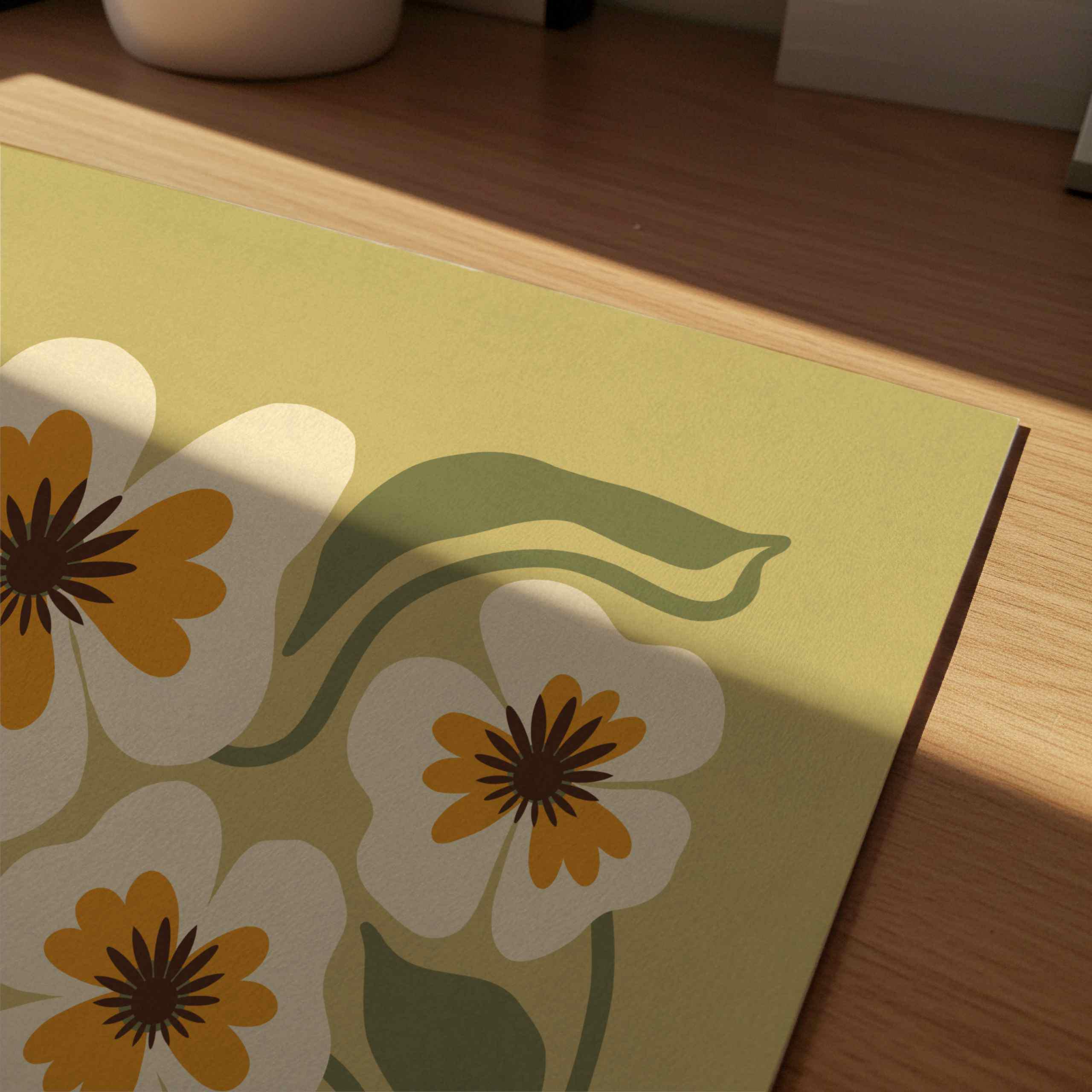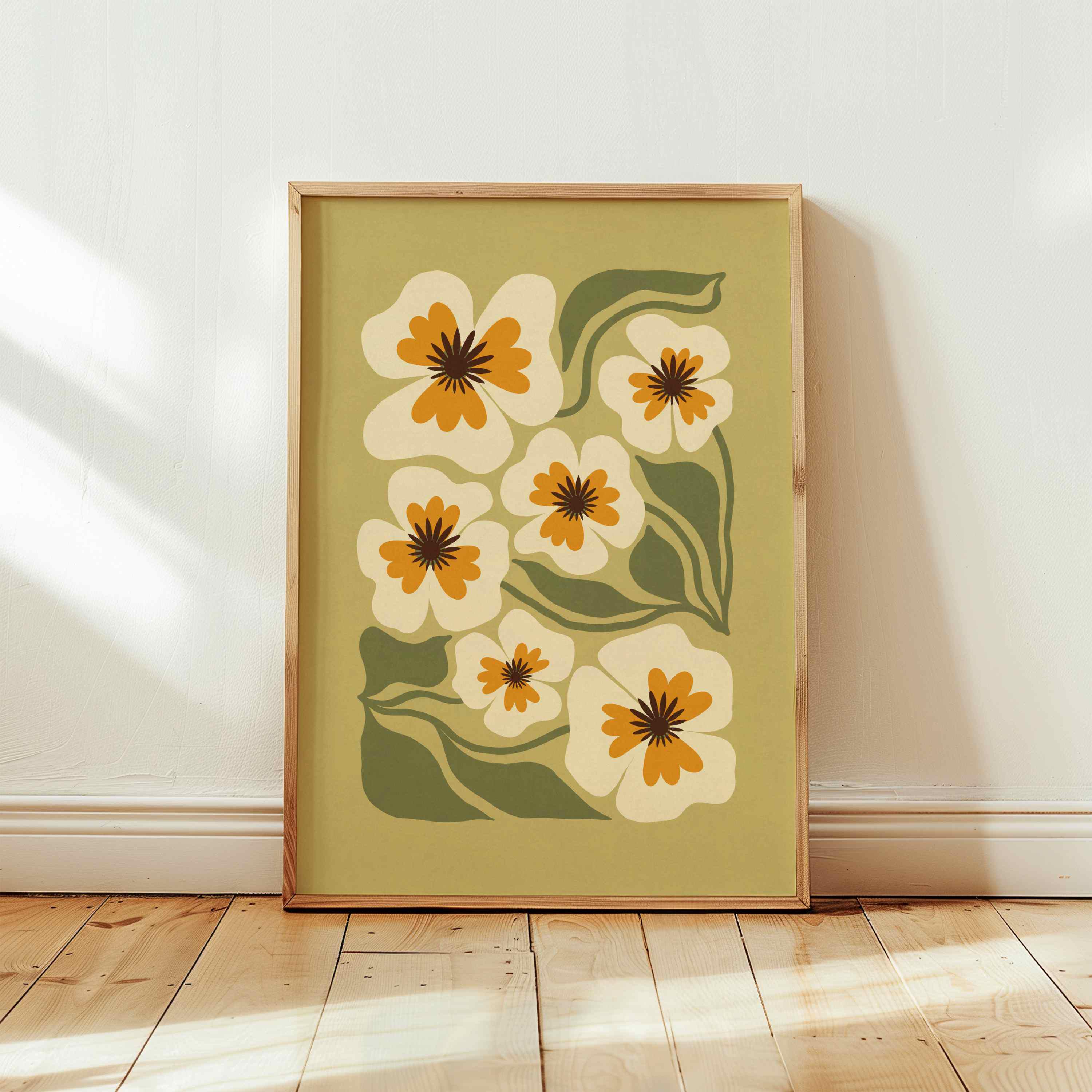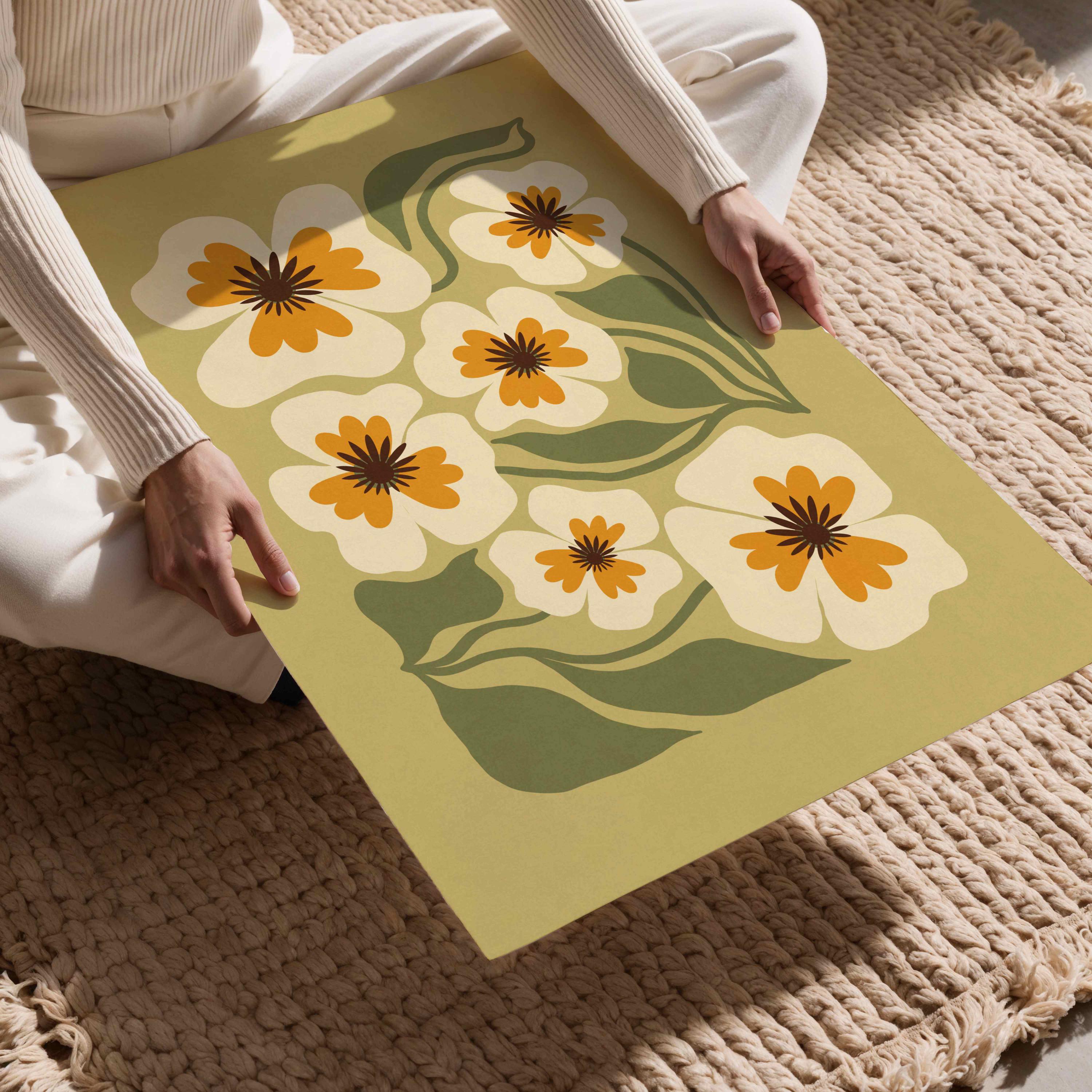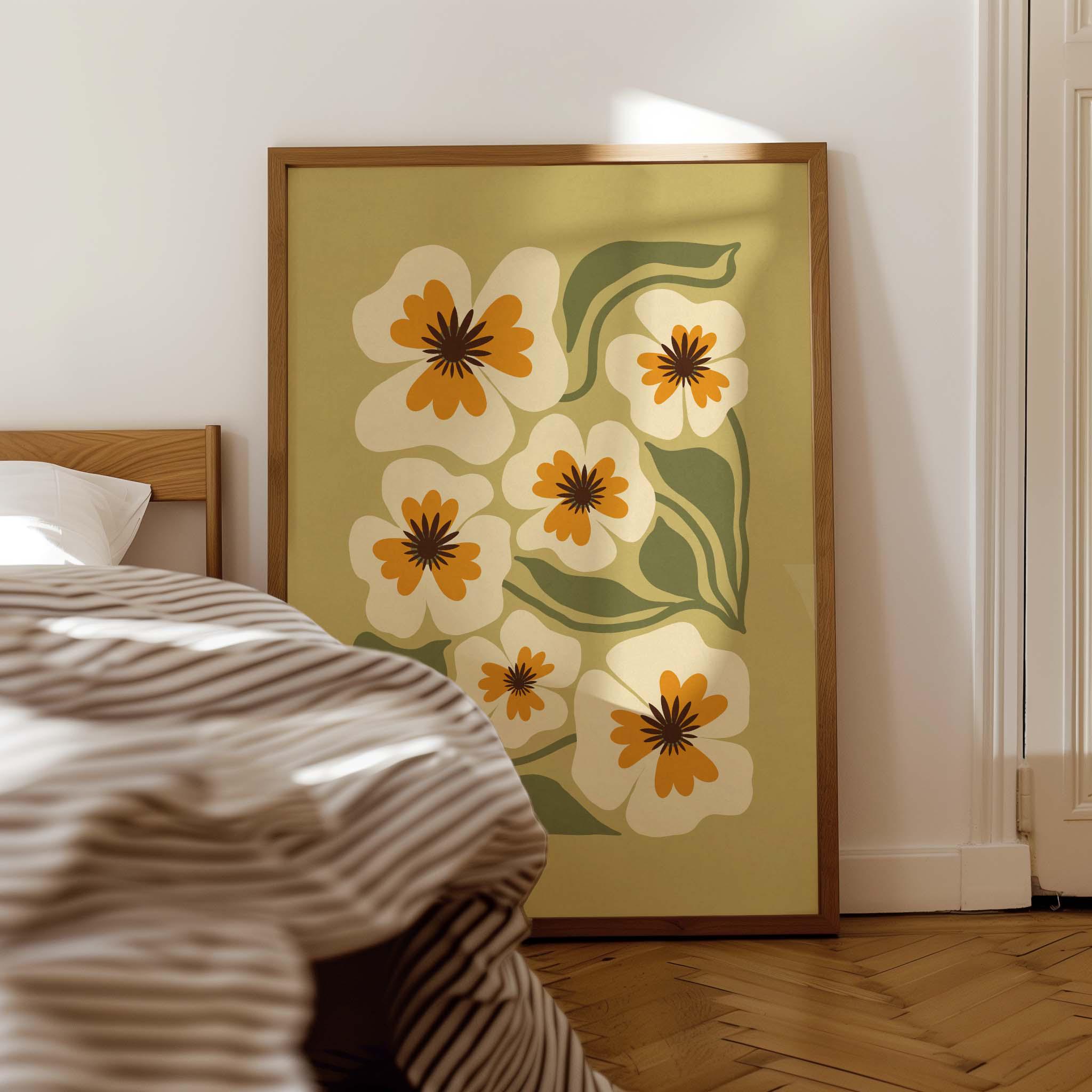 Retro floral wall art featuring an earthy palette of olive green, soft cream, and warm mustard. Inspired by Matisse-style cutouts, 70s groovy aesthetics, and mid century modern design, this botanical print is calm but graphic.