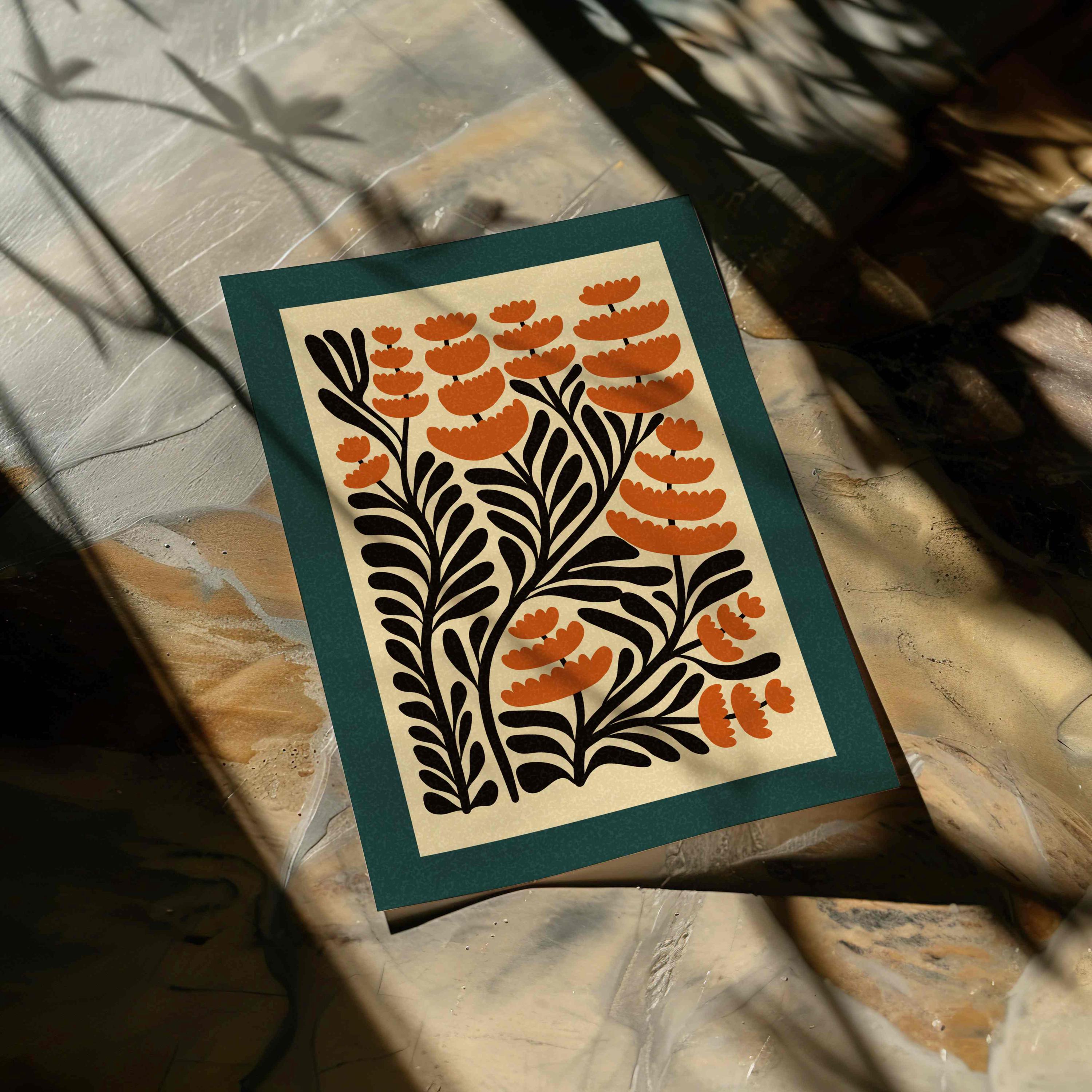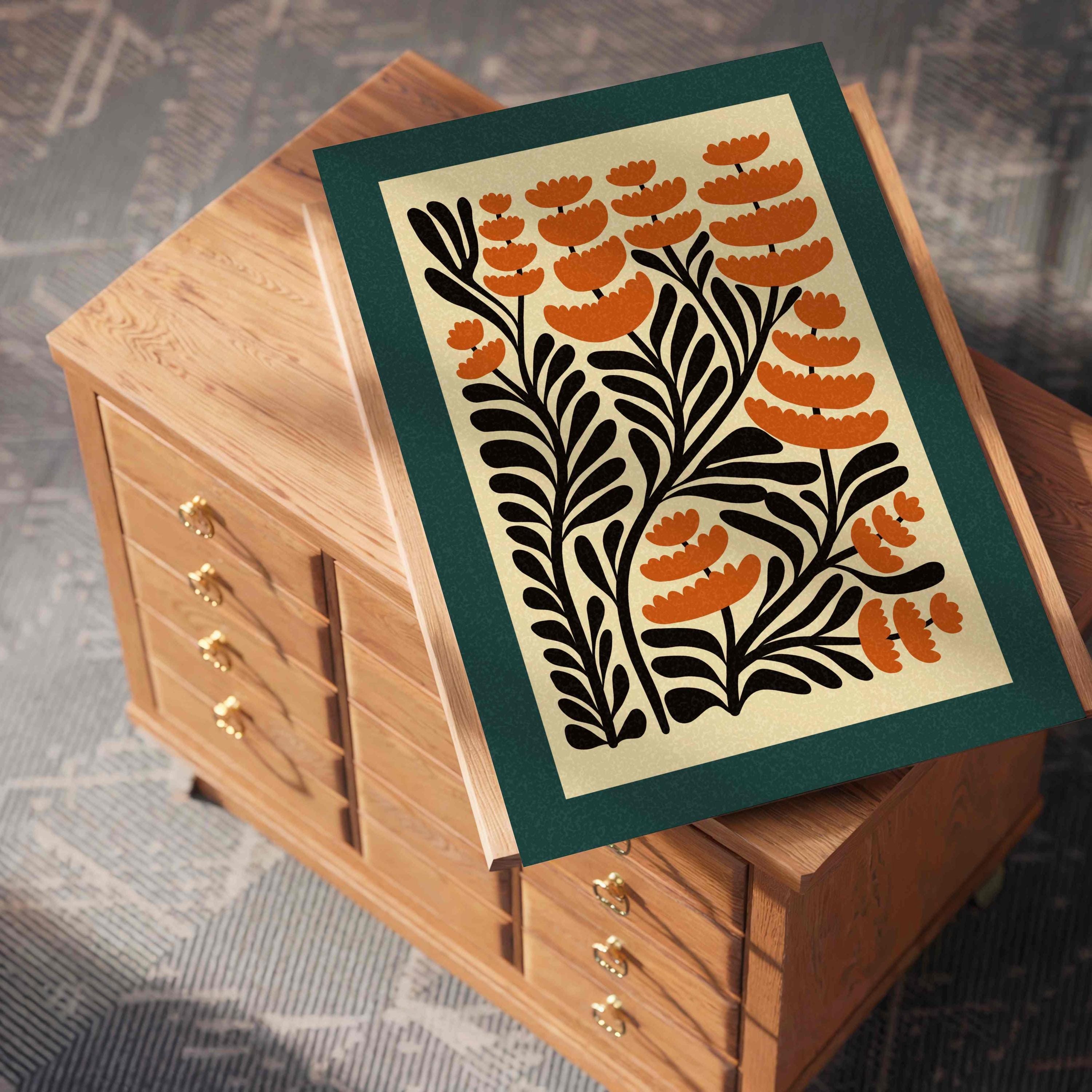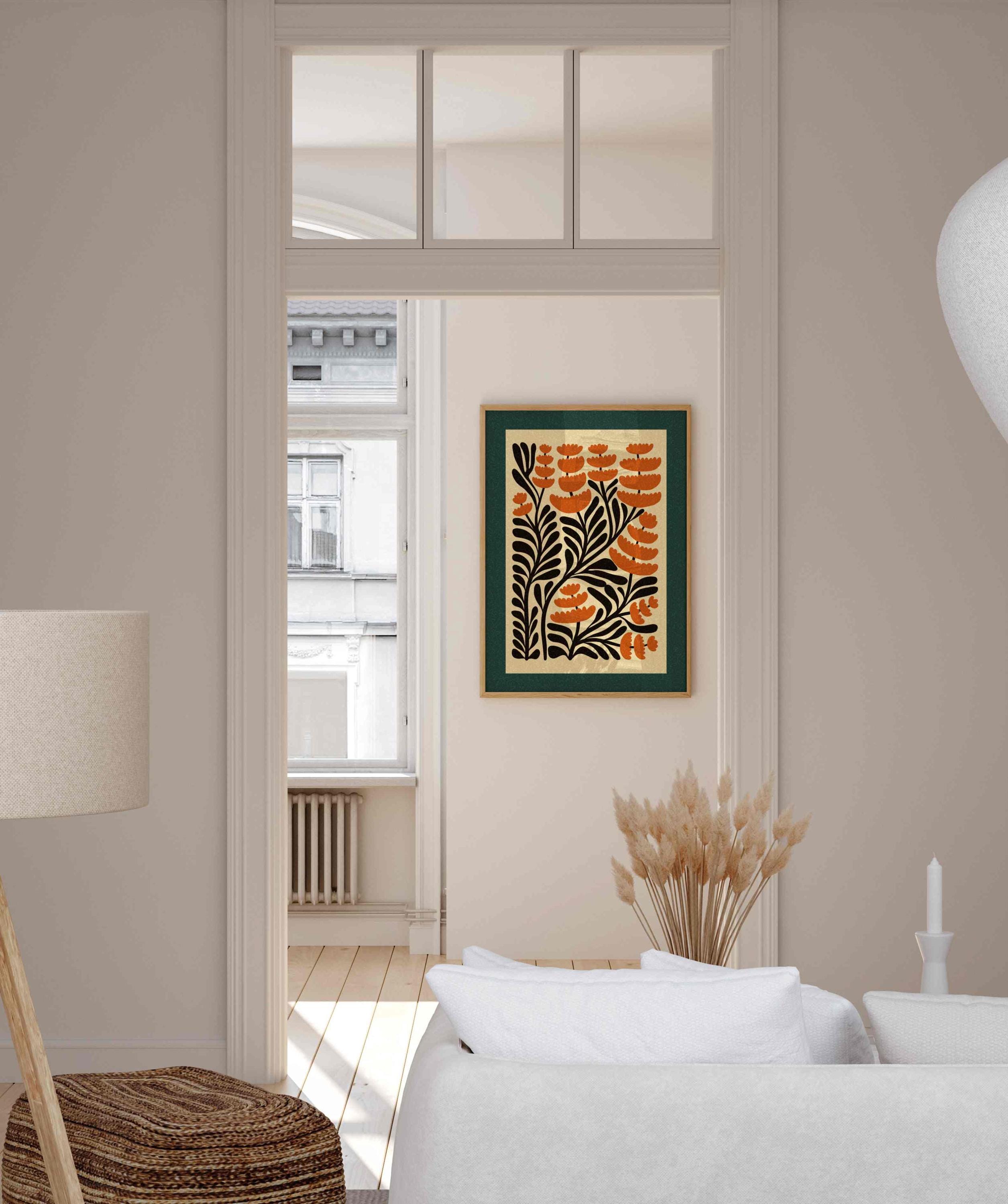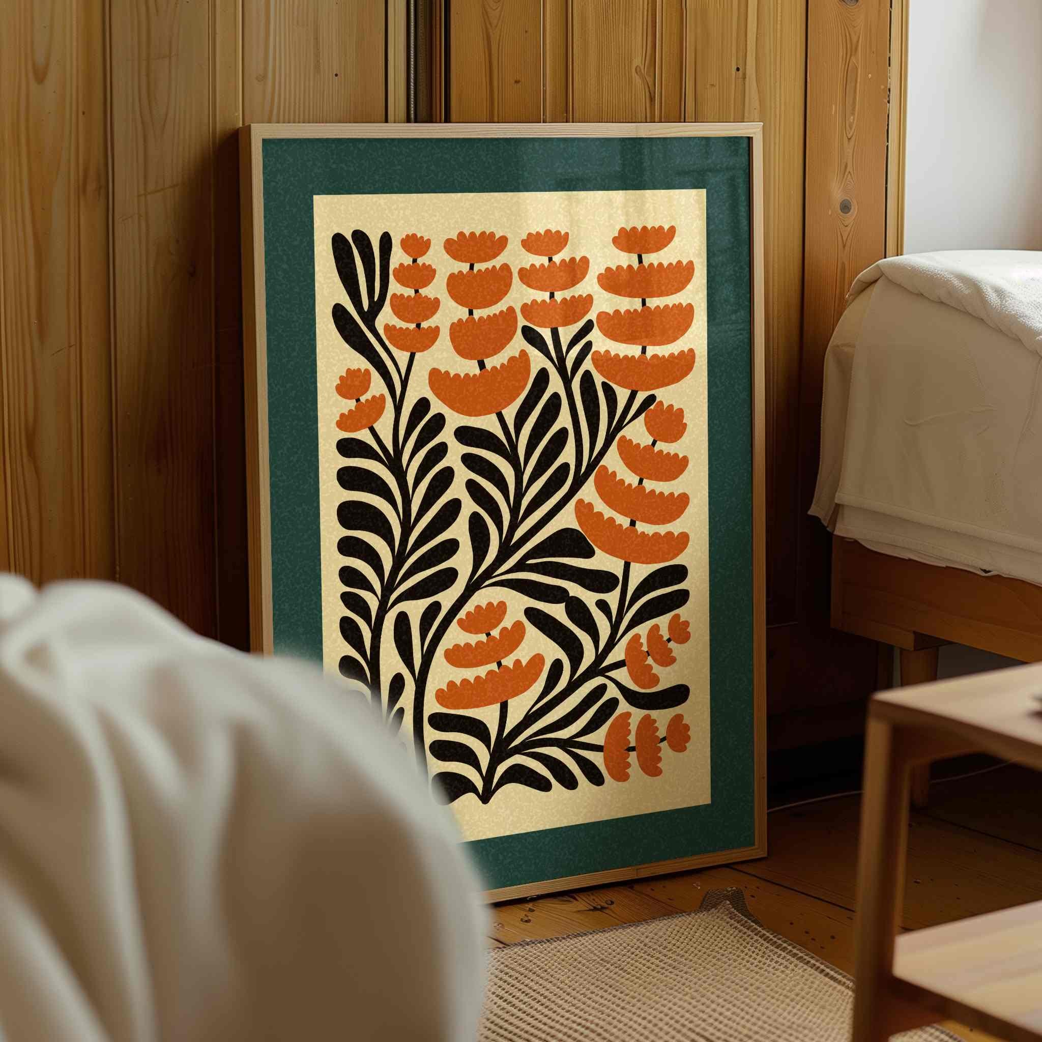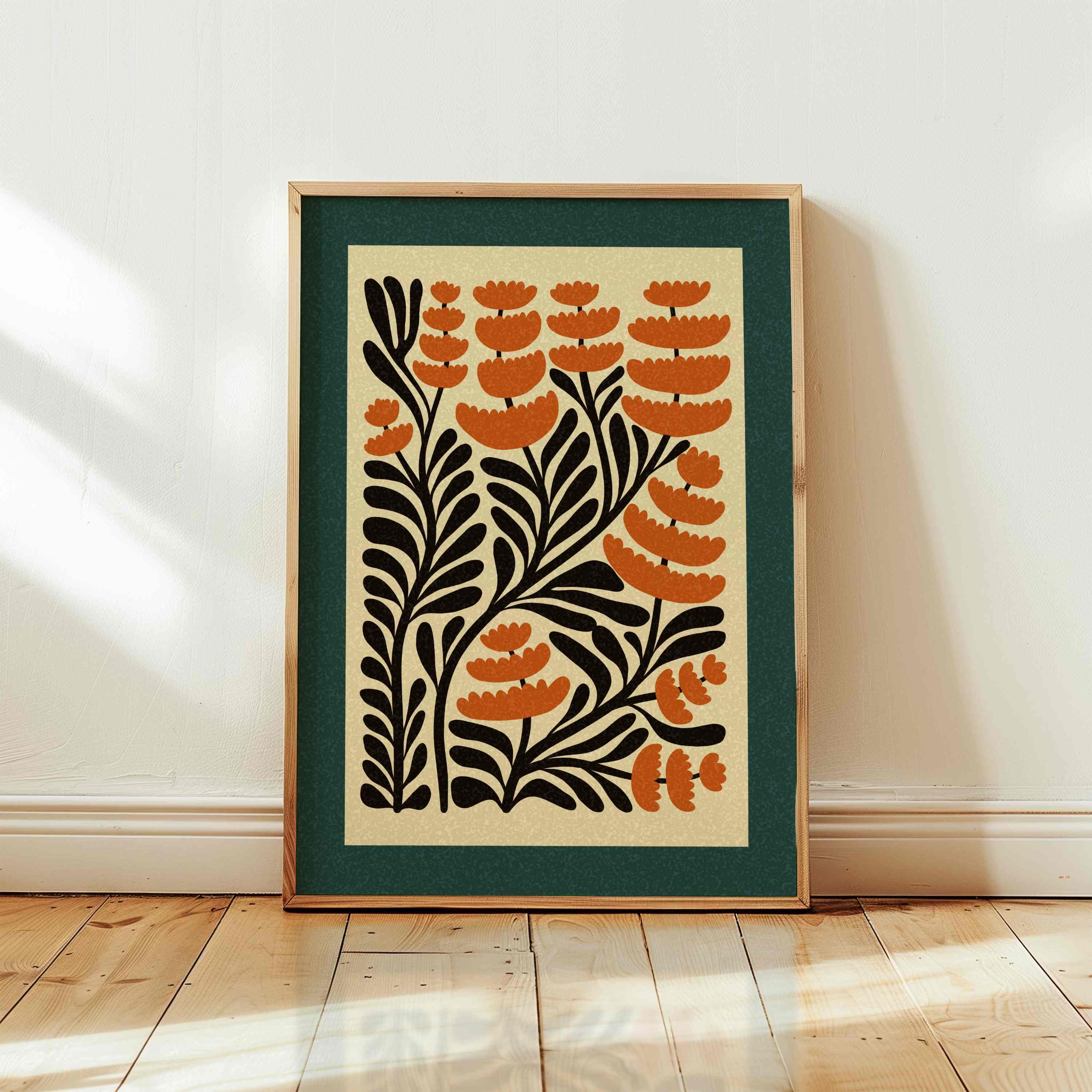 Unframed abstract retro floral print featuring stylized burnt orange flowers and black stems against a warm cream background and finished with a deep teal border. Perfect for living rooms, kitchens, bedrooms, or gallery walls, this botanical print brings a cozy, creative energy into any modern boho or vintage-inspired space.