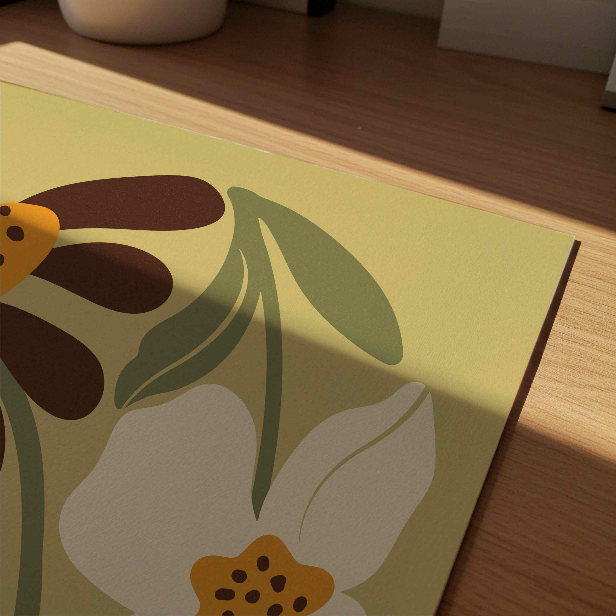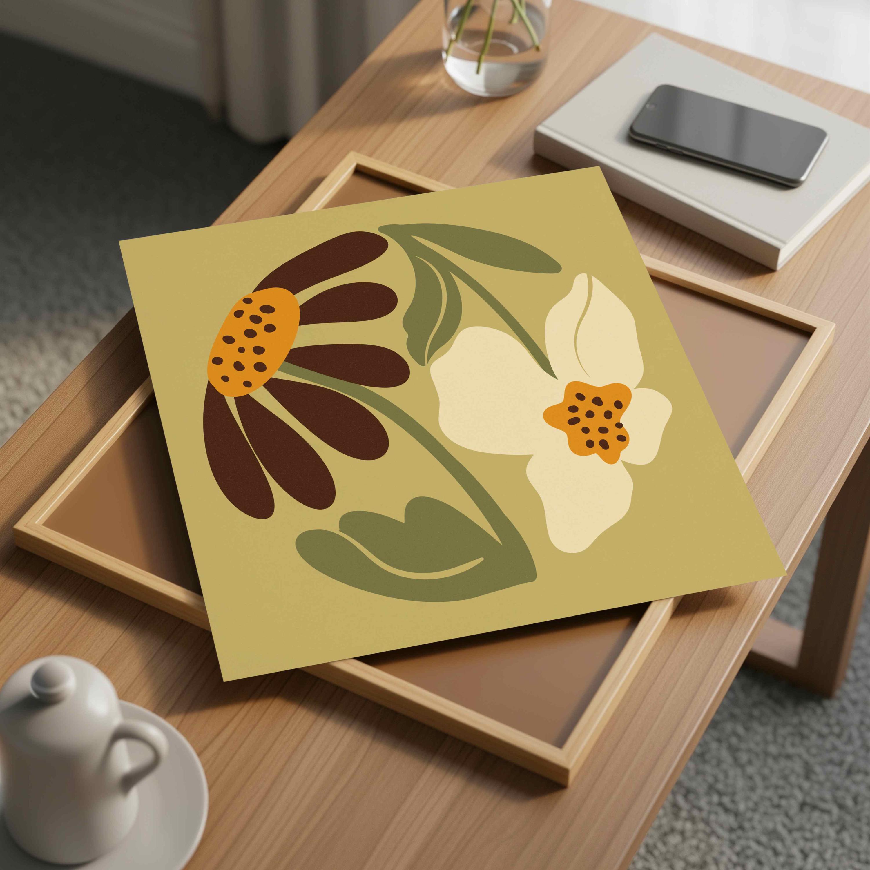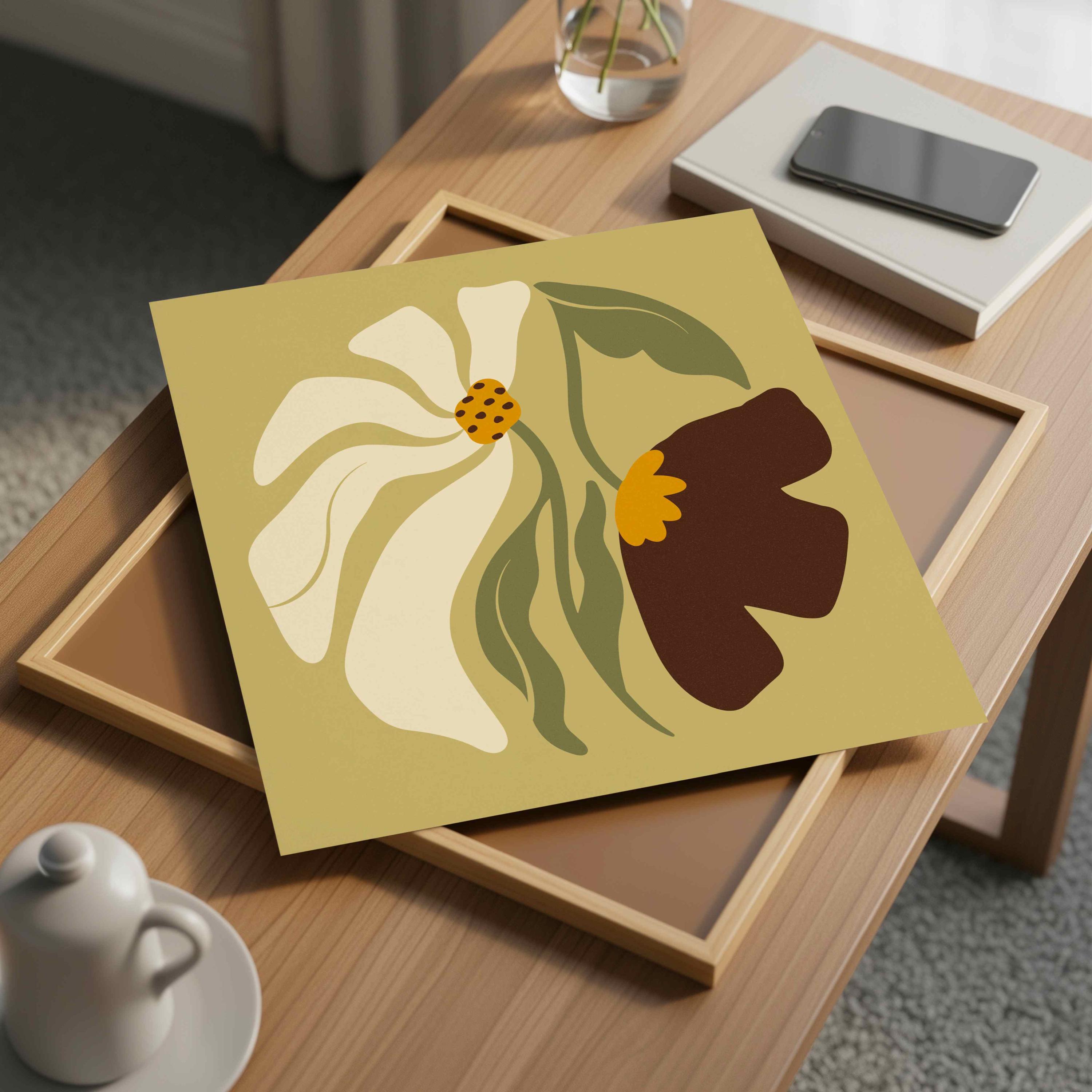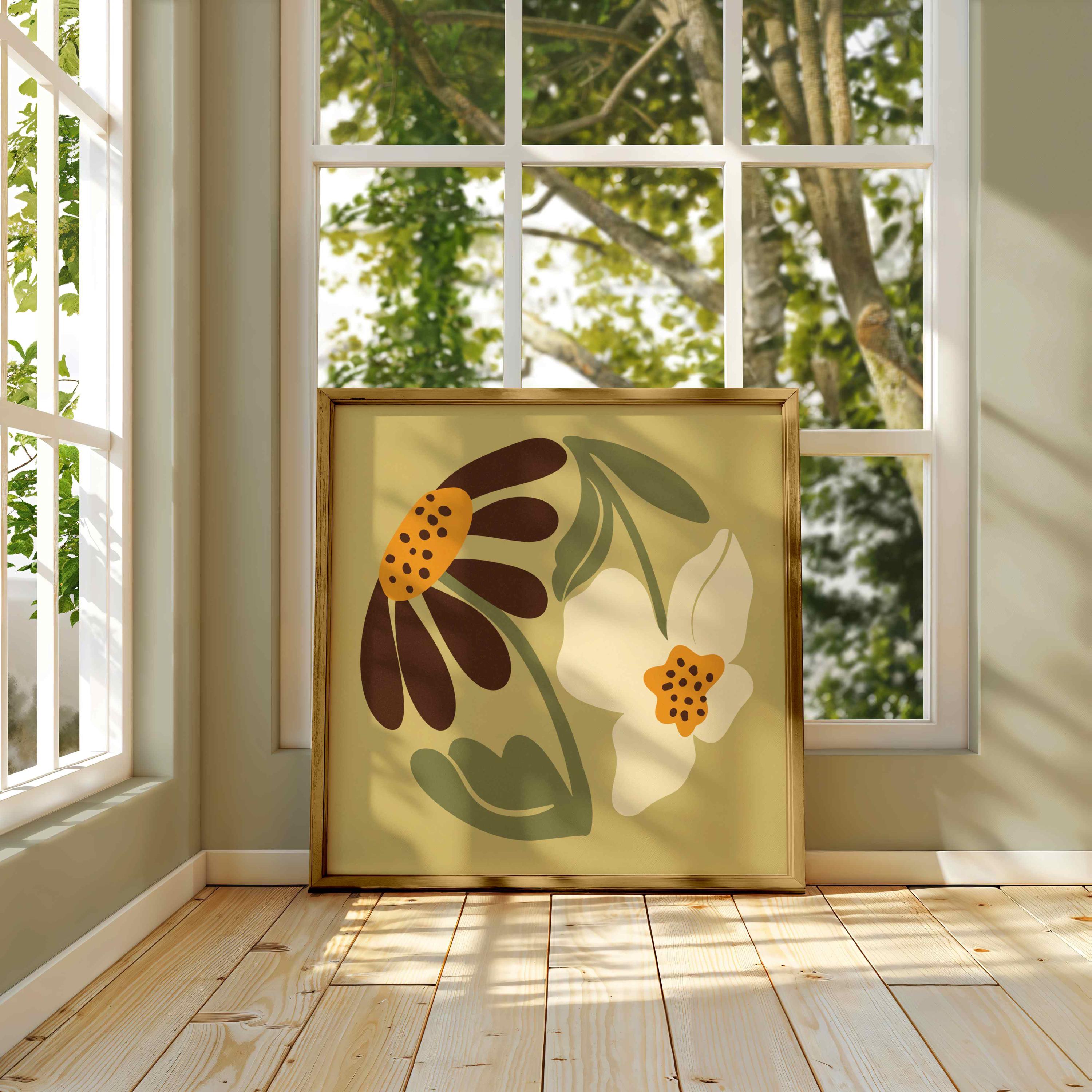 Groovy floral wall art set of two square prints featuring abstract botanical forms in soft olive, warm cream, ochre and rich brown tones. Inspired by Matisse cutouts and 70s floral motifs, this set blends vintage style with modern minimalism.
