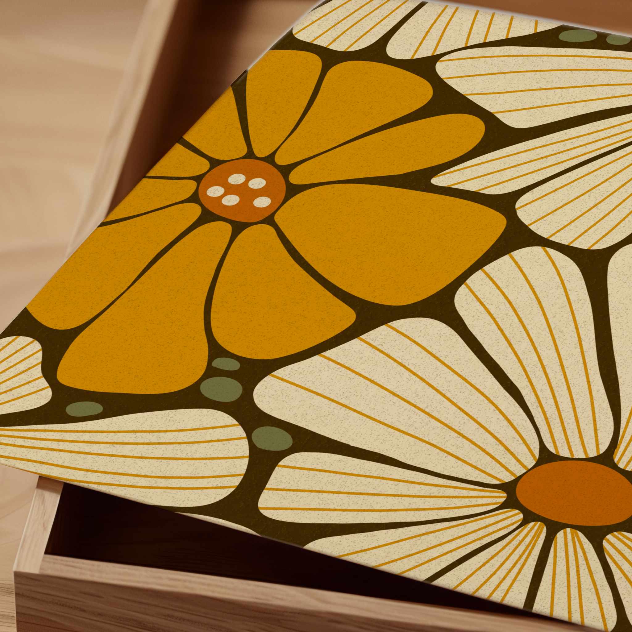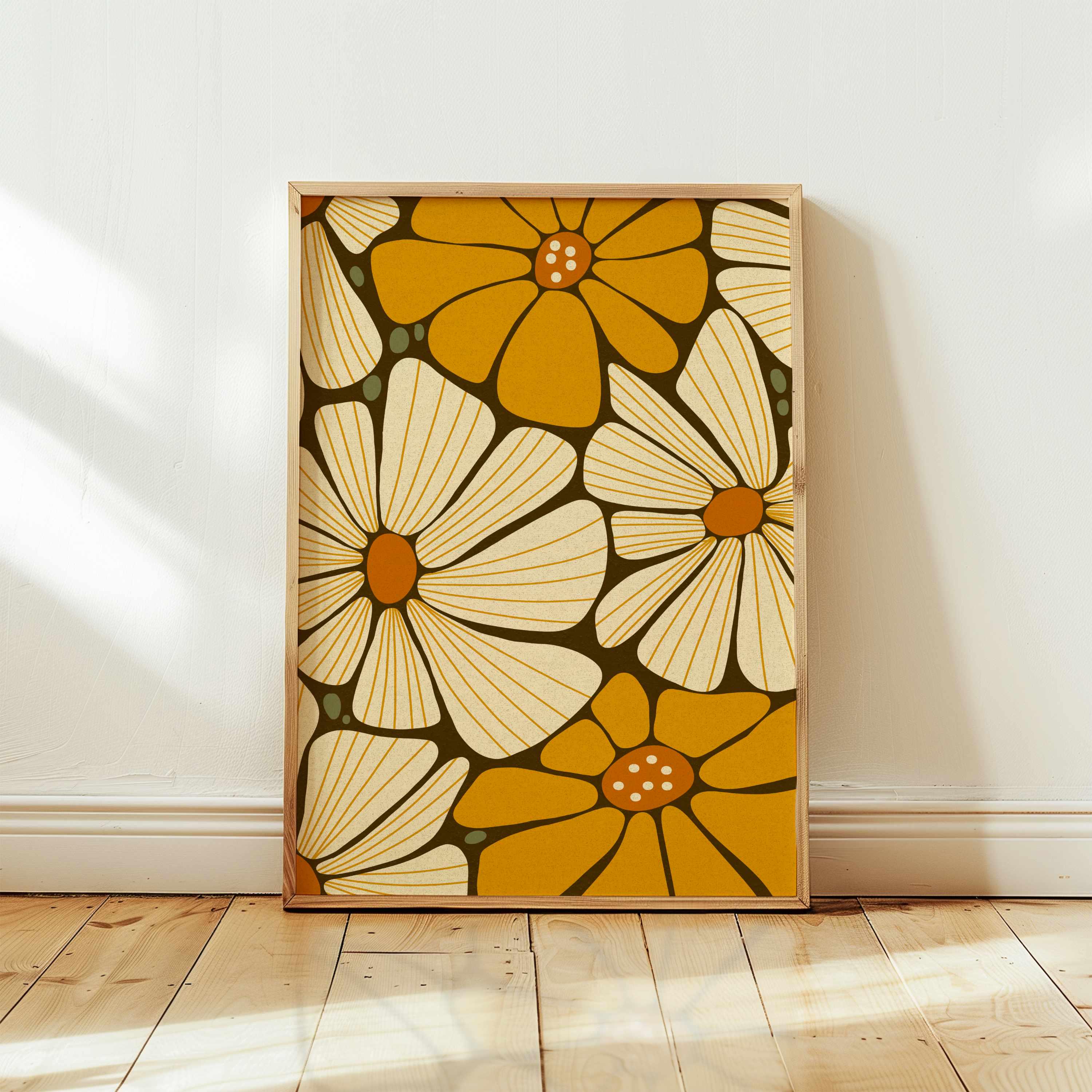 Retro floral wall art in mustard and cream that brings groovy 70s energy to your space. Featuring warm mustard blooms, cream petals, and soft olive green accents, it captures the bold charm of vintage florals with a modern boho twist.