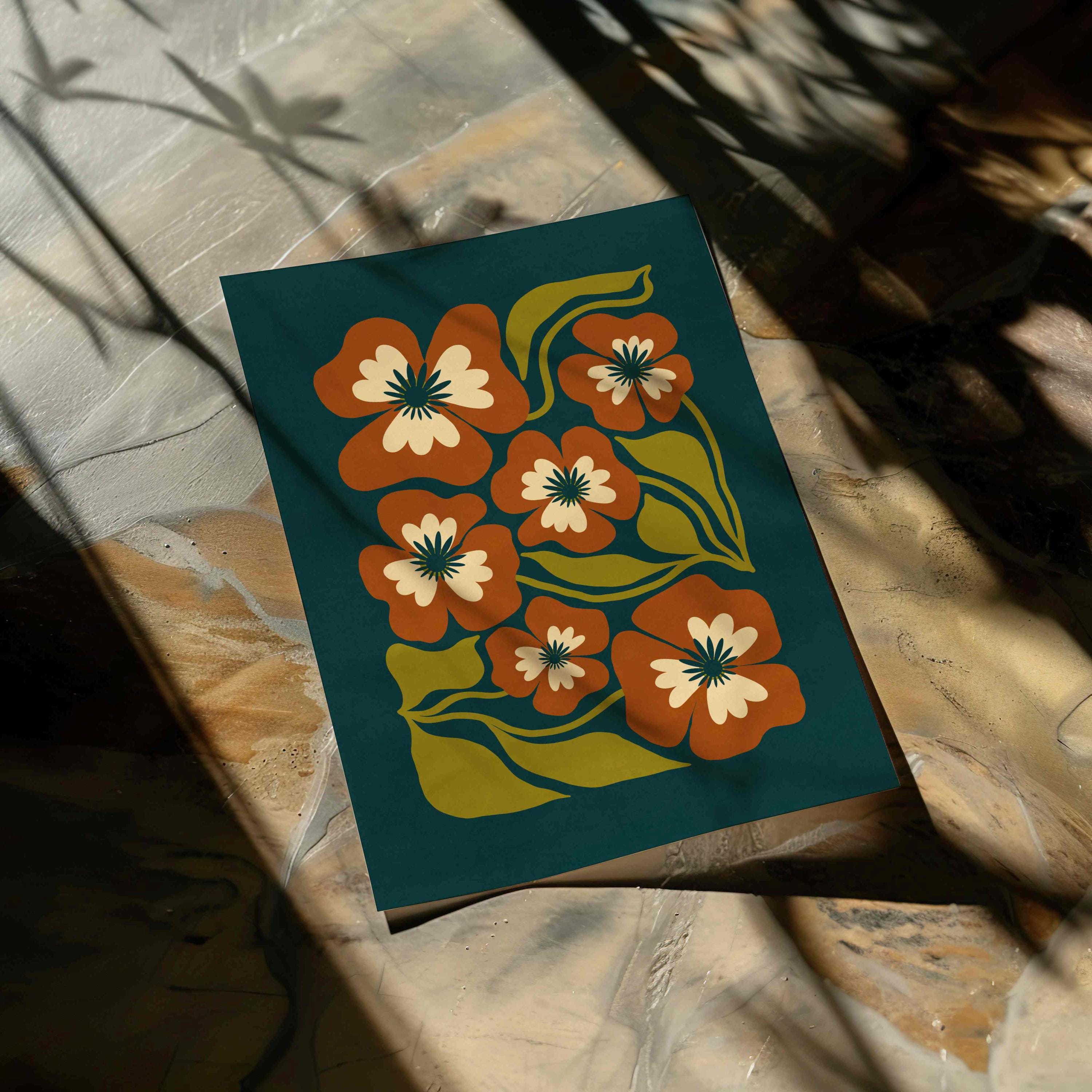Retro floral wall art inspired by 70s design, Matisse-style shapes, and mid century modern aesthetics. Featuring burnt orange flowers, olive green leaves, and soft cream details on a deep teal background, this print is perfect for boho, eclectic, and mid century spaces.