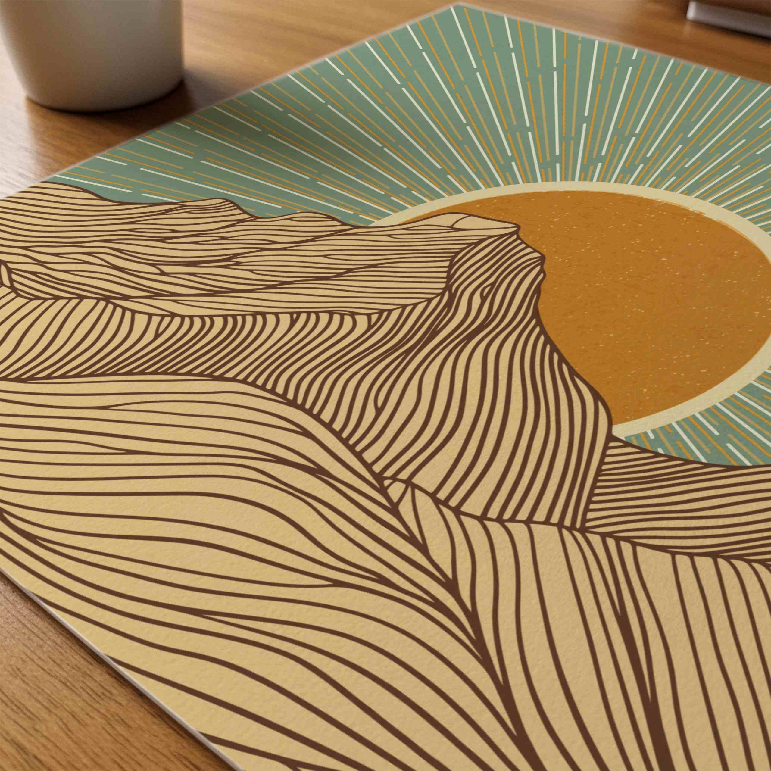 Retro-inspired mountain landscape print featuring bold, flowing linework, a glowing mustard sun, and radiant teal sky. The warm earth tone palette of beige, ochre, and muted teal gives this piece both boldness and calm.