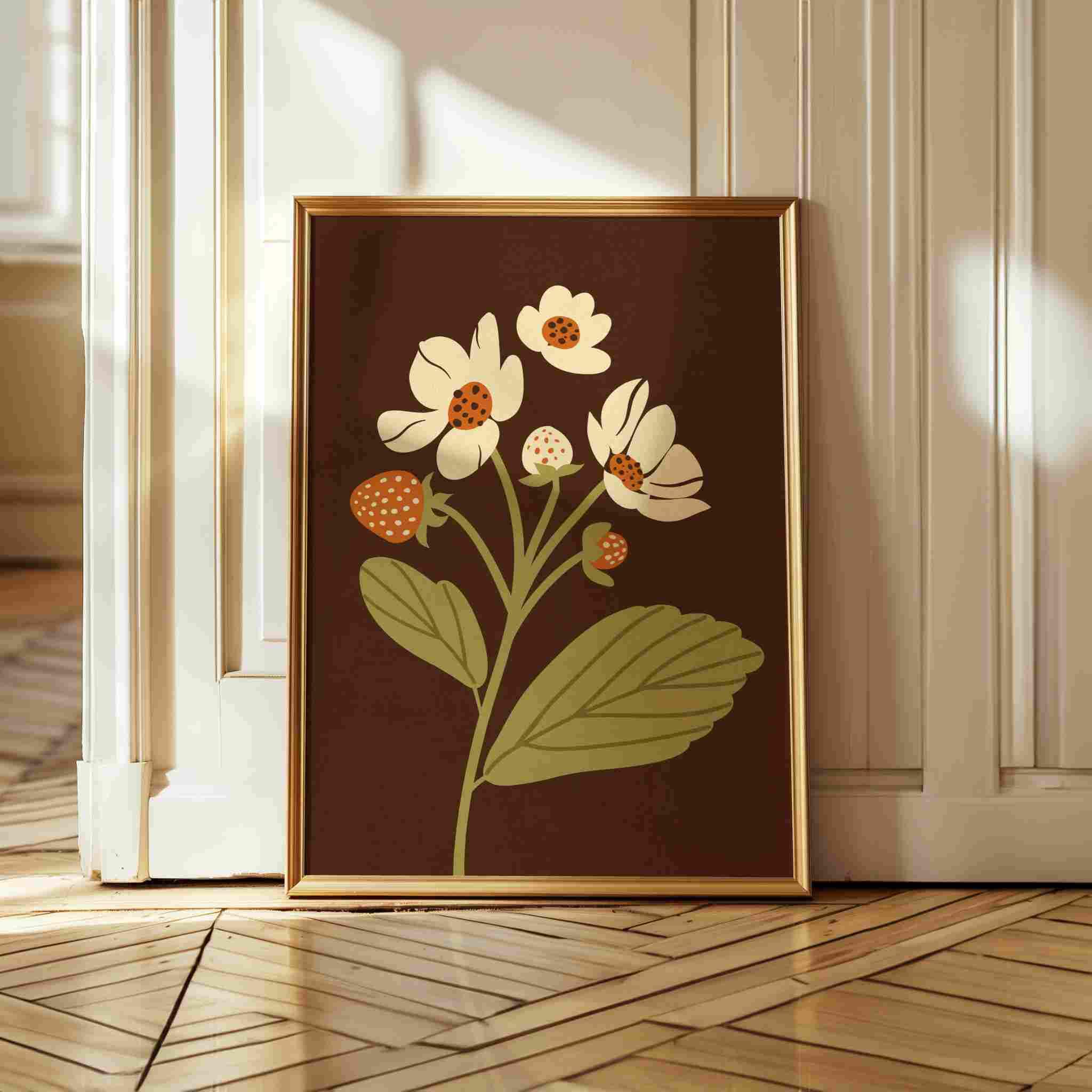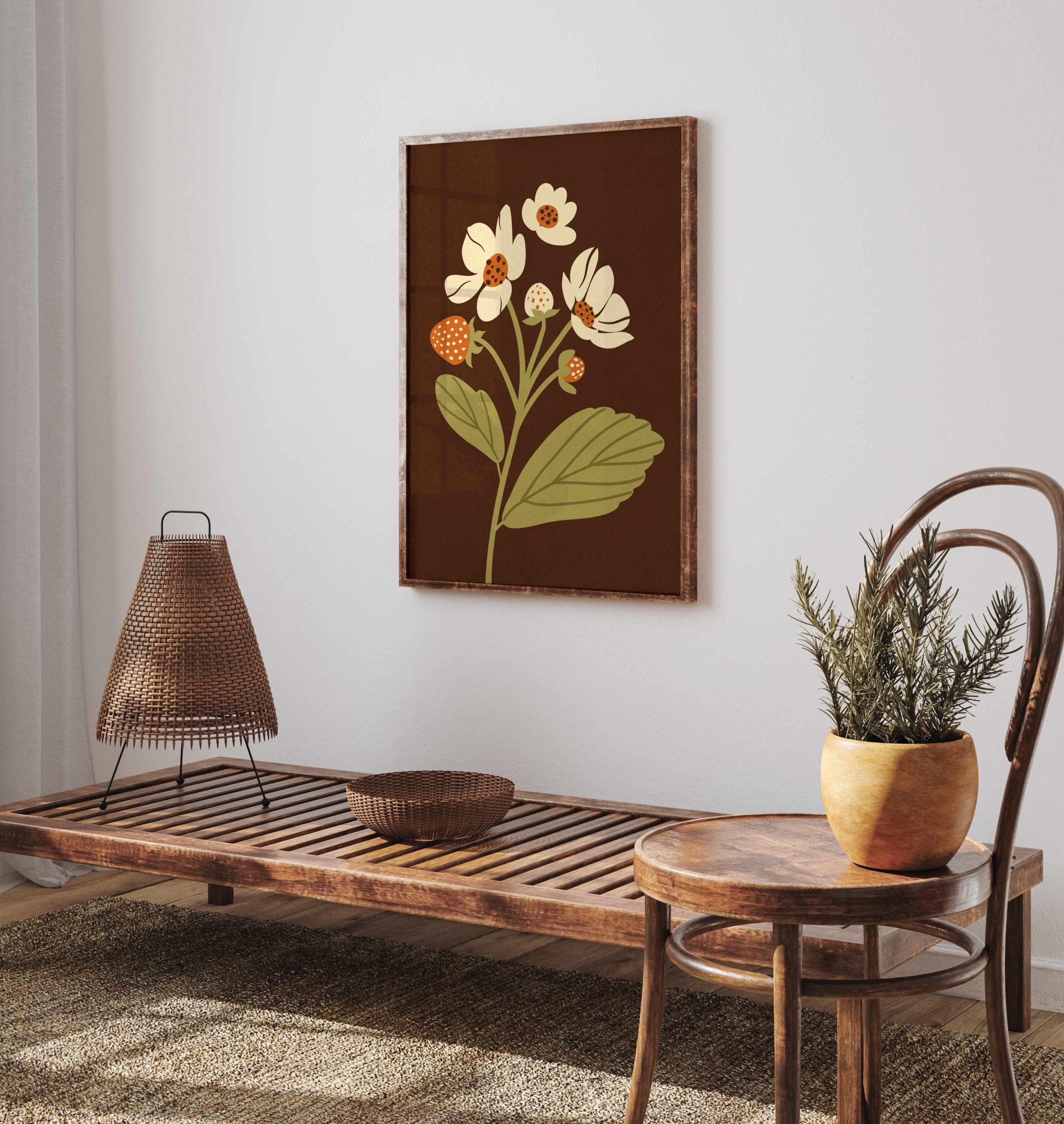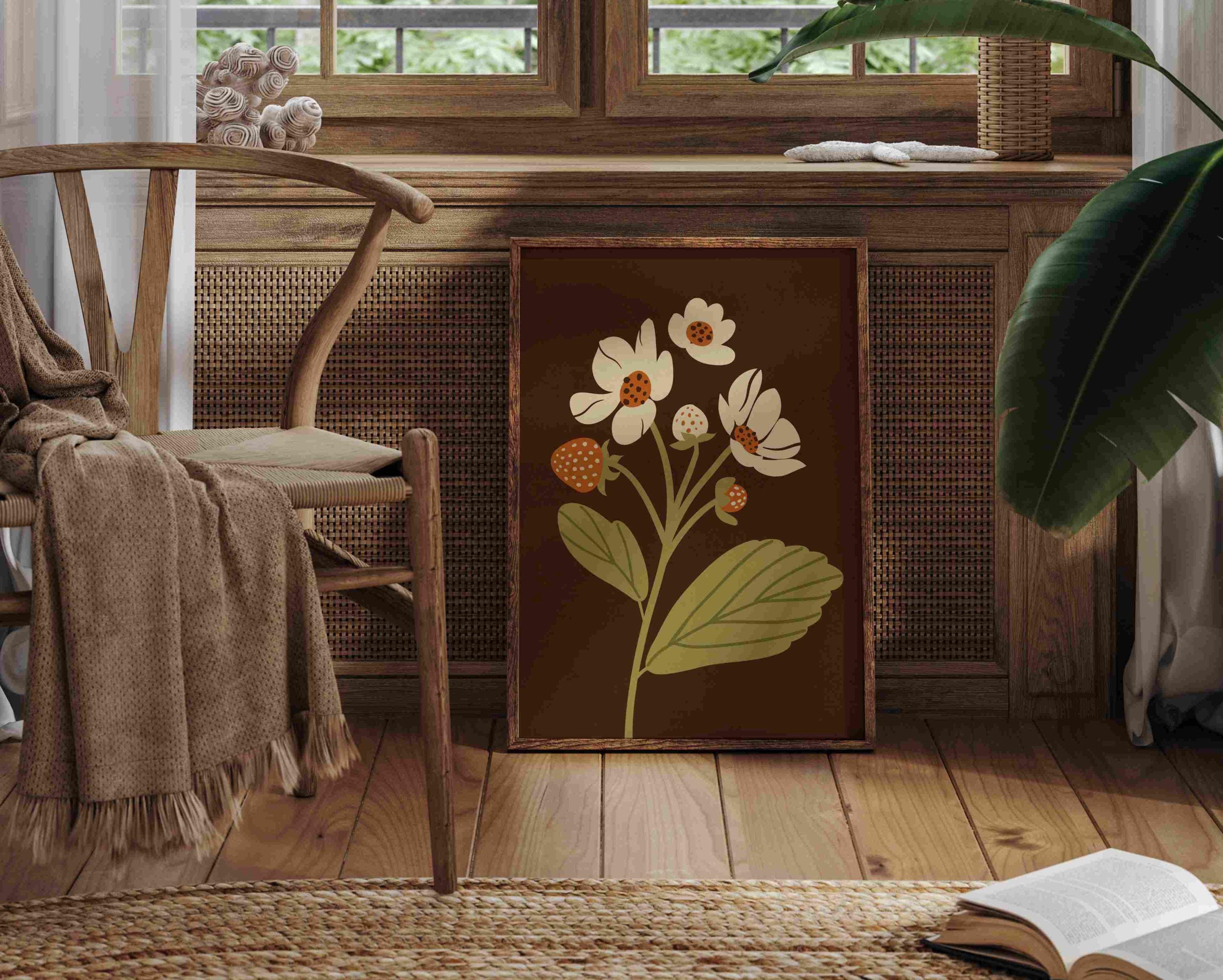Moody botanical print featuring a delicate wild strawberry plant set against a deep brown background. With soft cream blooms, olive green foliage, and muted rust-colored berries, this artwork captures vintage warmth with a slightly modern, earthy twist. It’s perfect for cozy corners, cottage-style kitchens, gallery walls, or nature-inspired spaces.