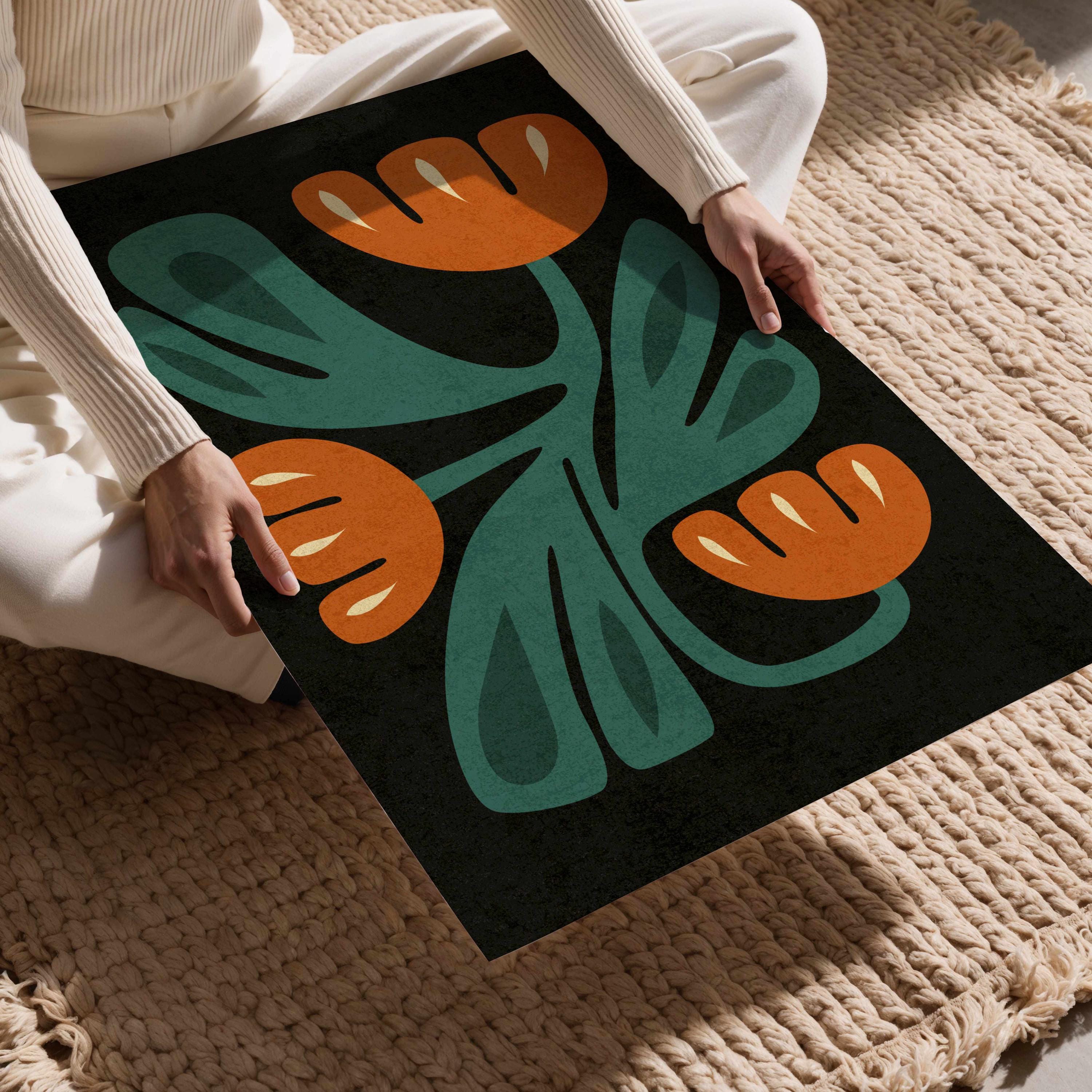 Abstract mid century floral print featuring stylized tulip flowers and leaves in black, burnt orange, teal and cream color palette. This piece blends retro botanical style with mid century modern design, creating a look that’s both earthy and bold.