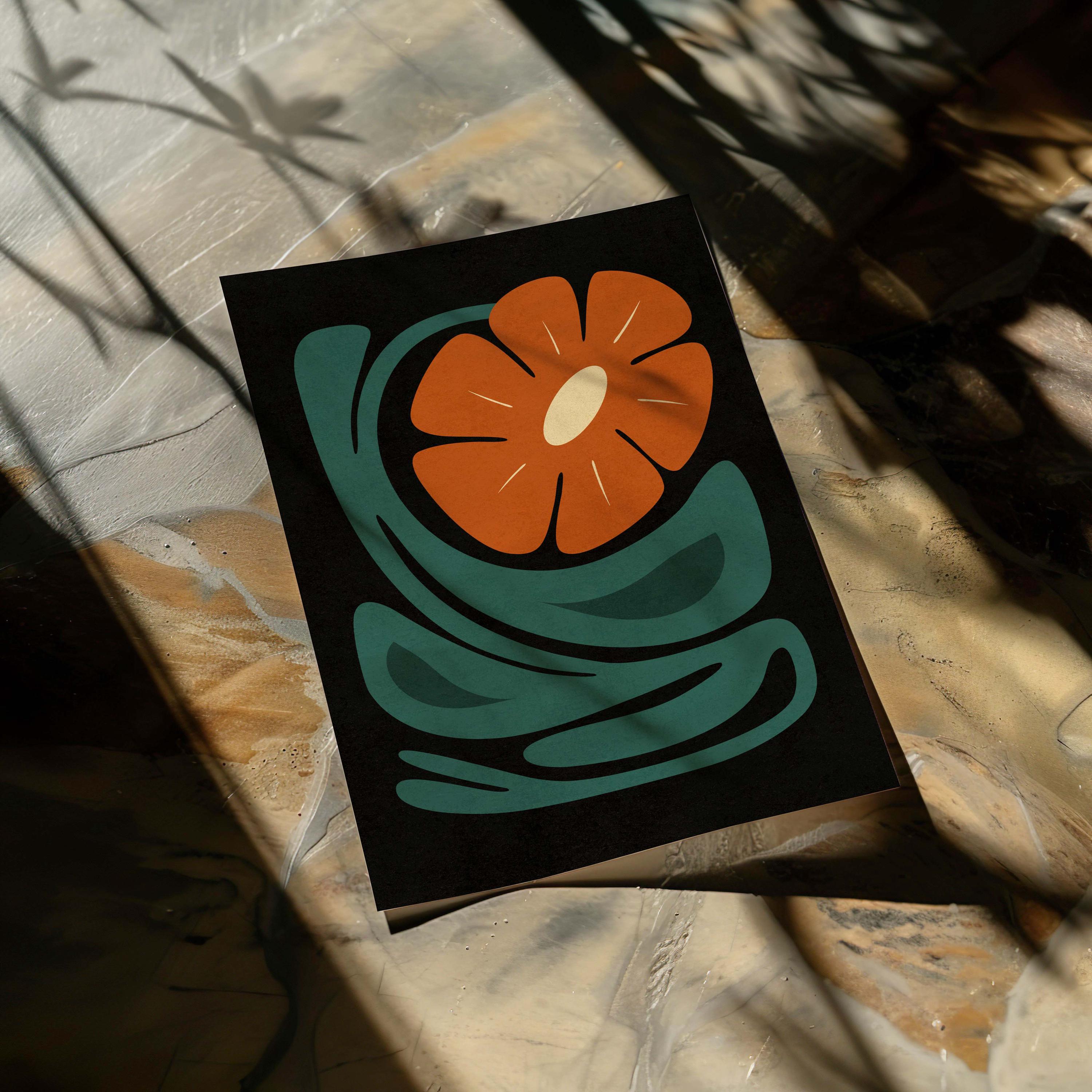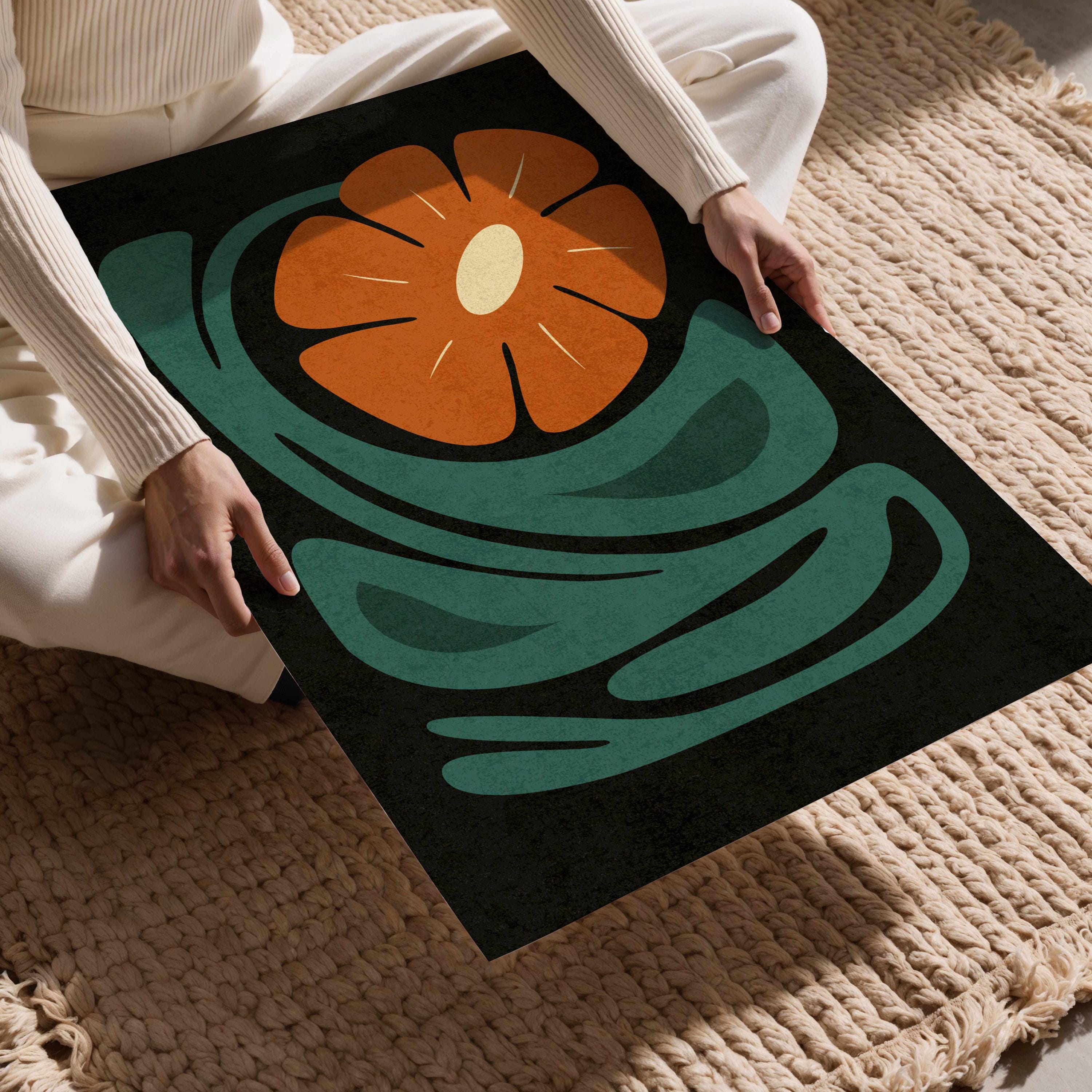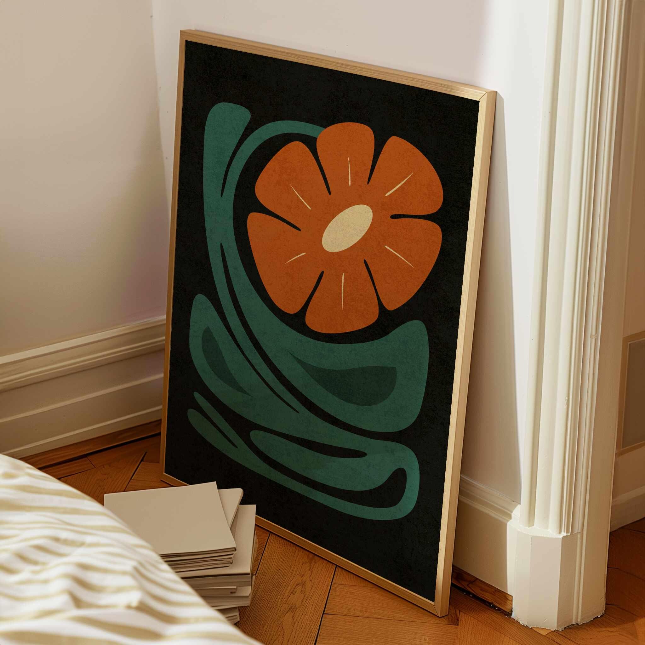 Abstract retro floral print featuring a stylized flower and leaves in a black, burnt orange, teal and cream color palette. This piece blends retro botanical style with mid century modern design, creating a look that’s both earthy and bold.