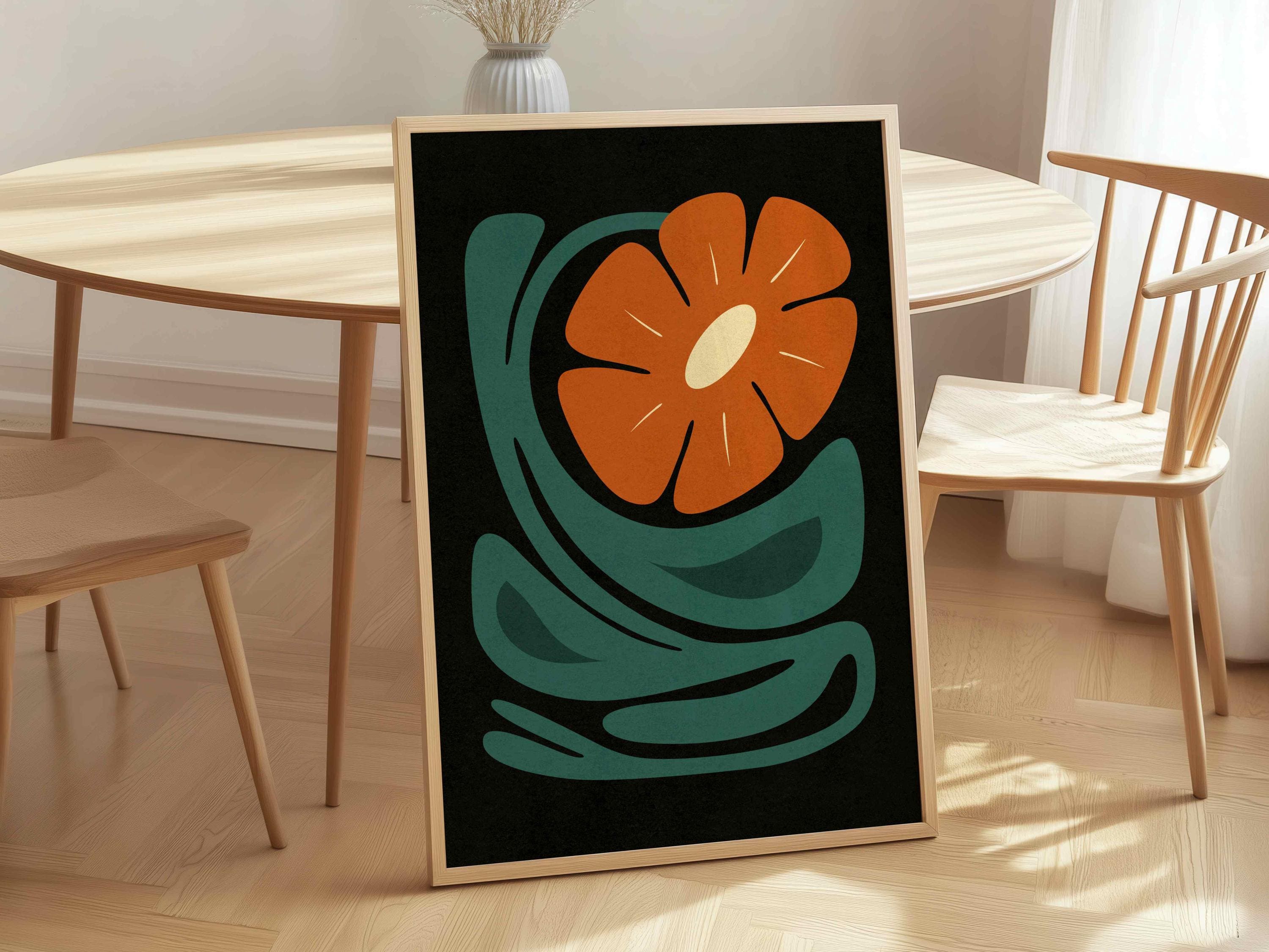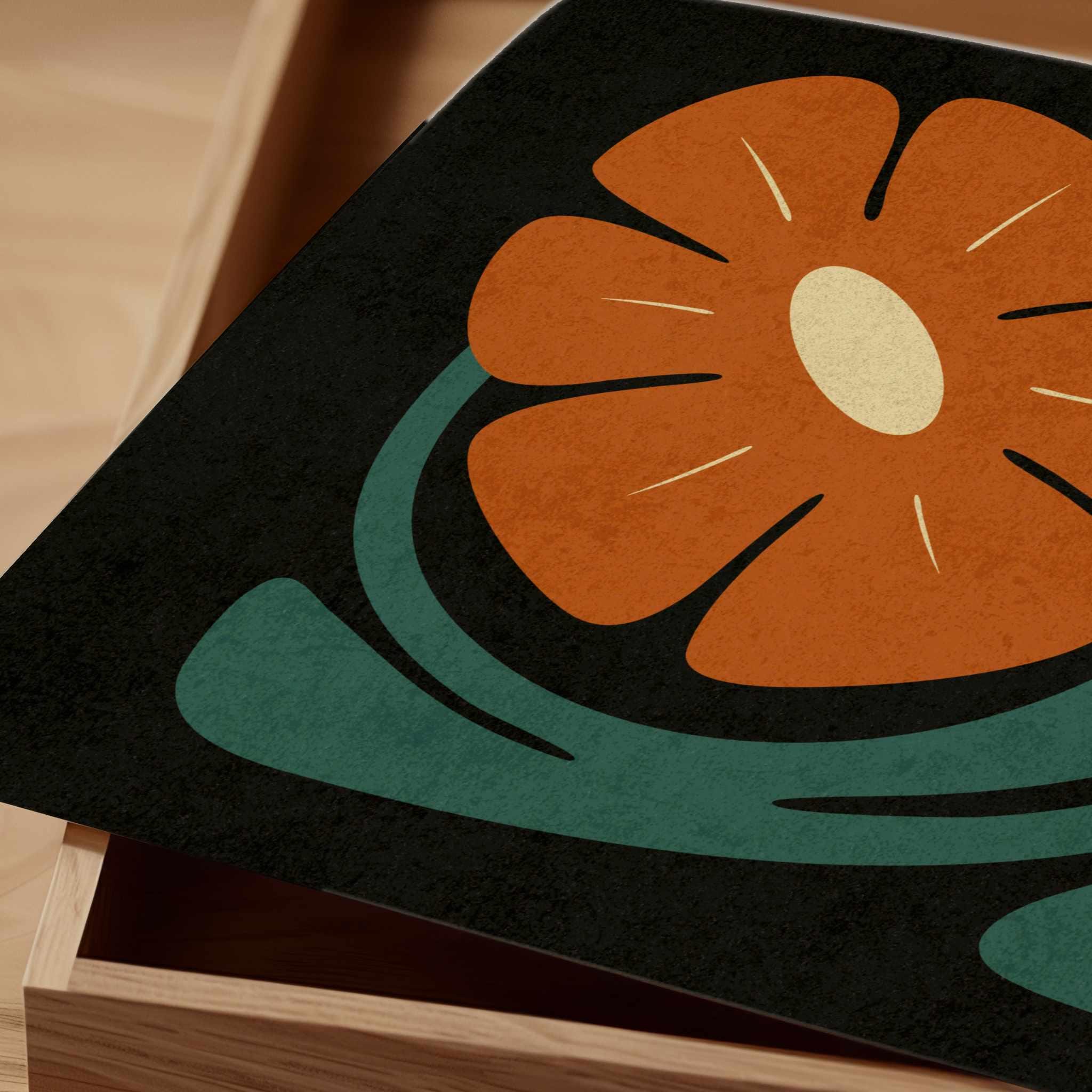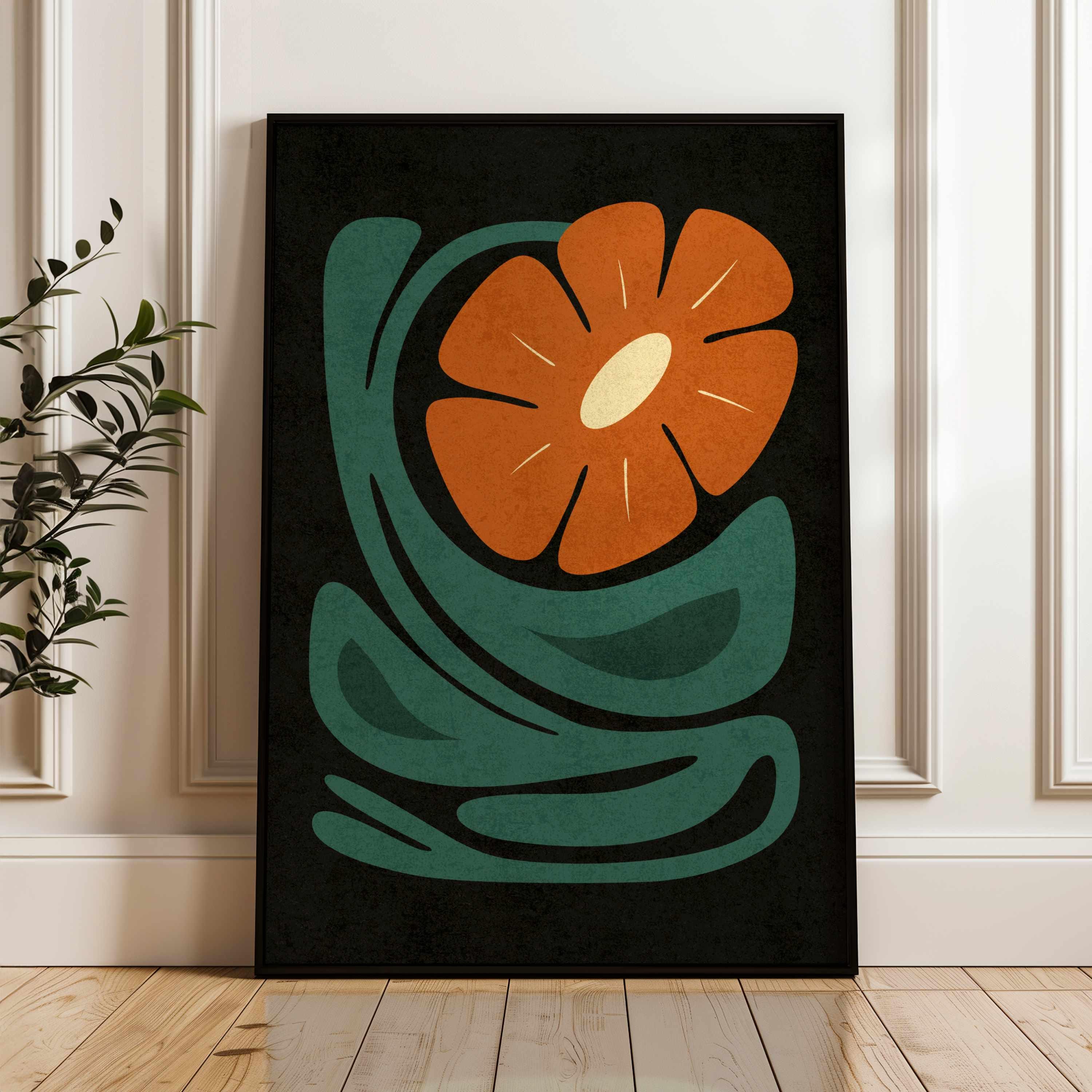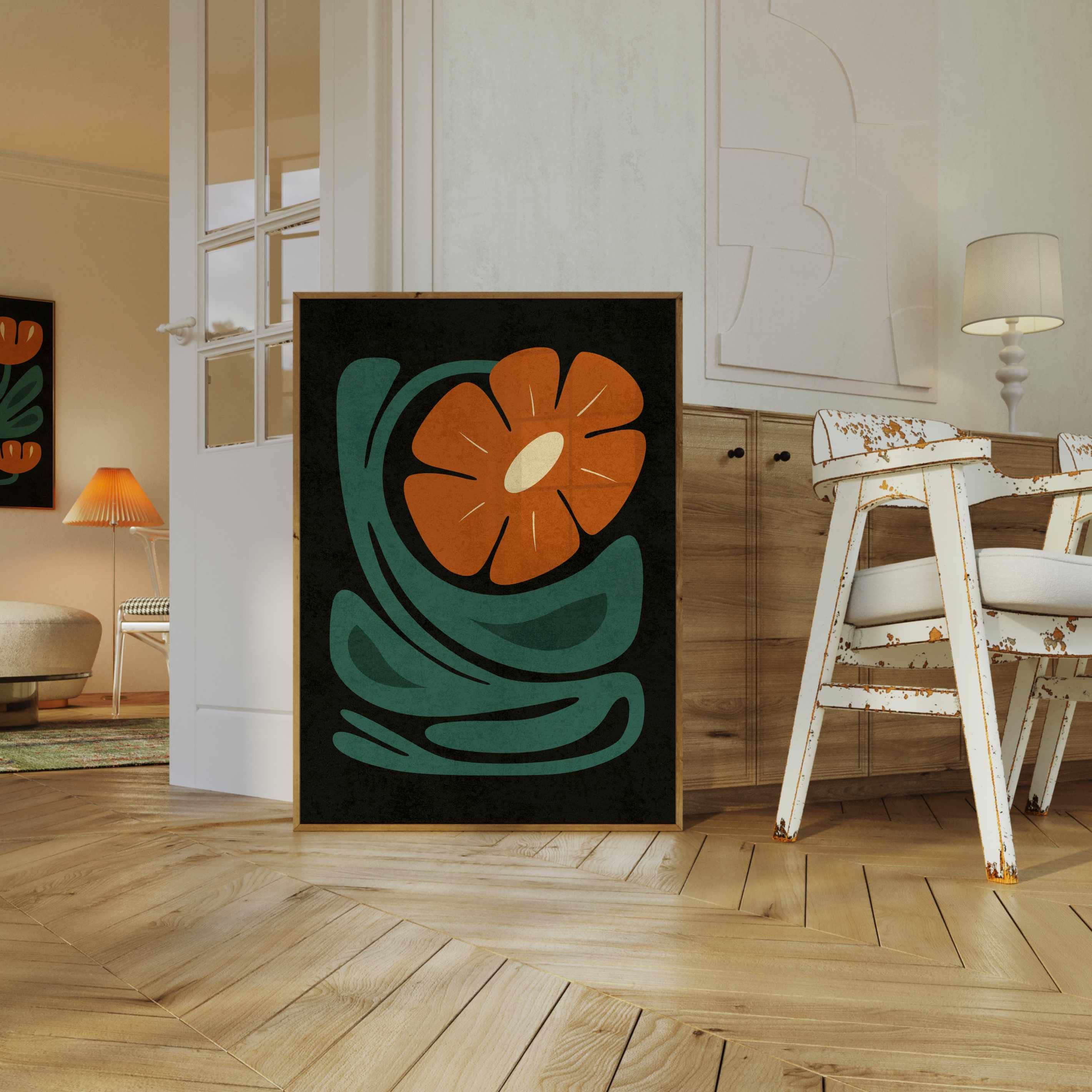 Abstract retro floral print featuring a stylized flower and leaves in a black, burnt orange, teal and cream color palette. This piece blends retro botanical style with mid century modern design, creating a look that’s both earthy and bold.